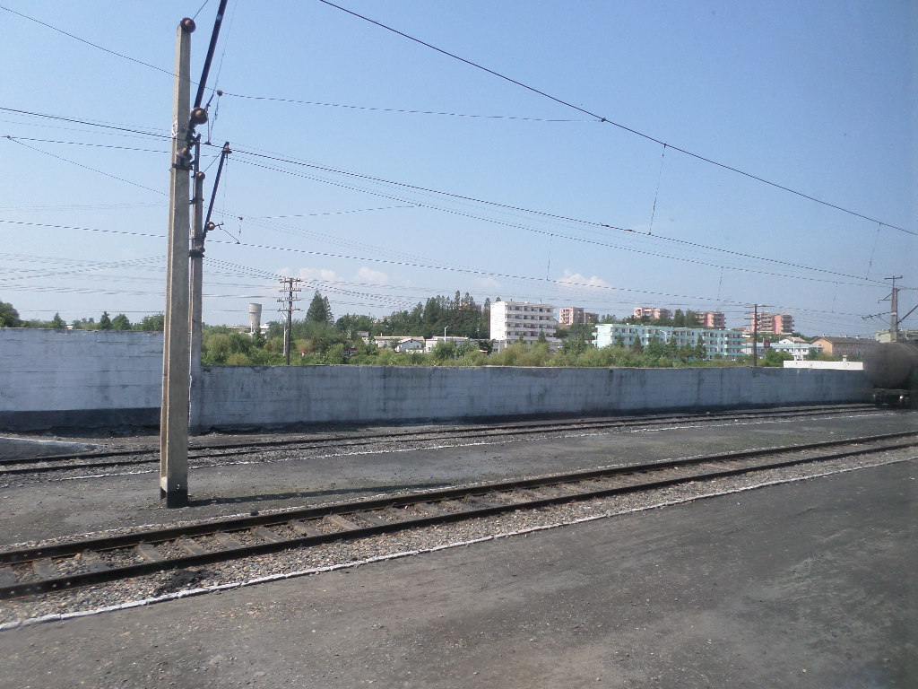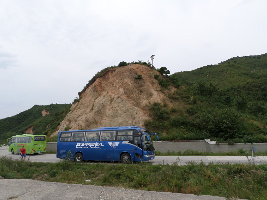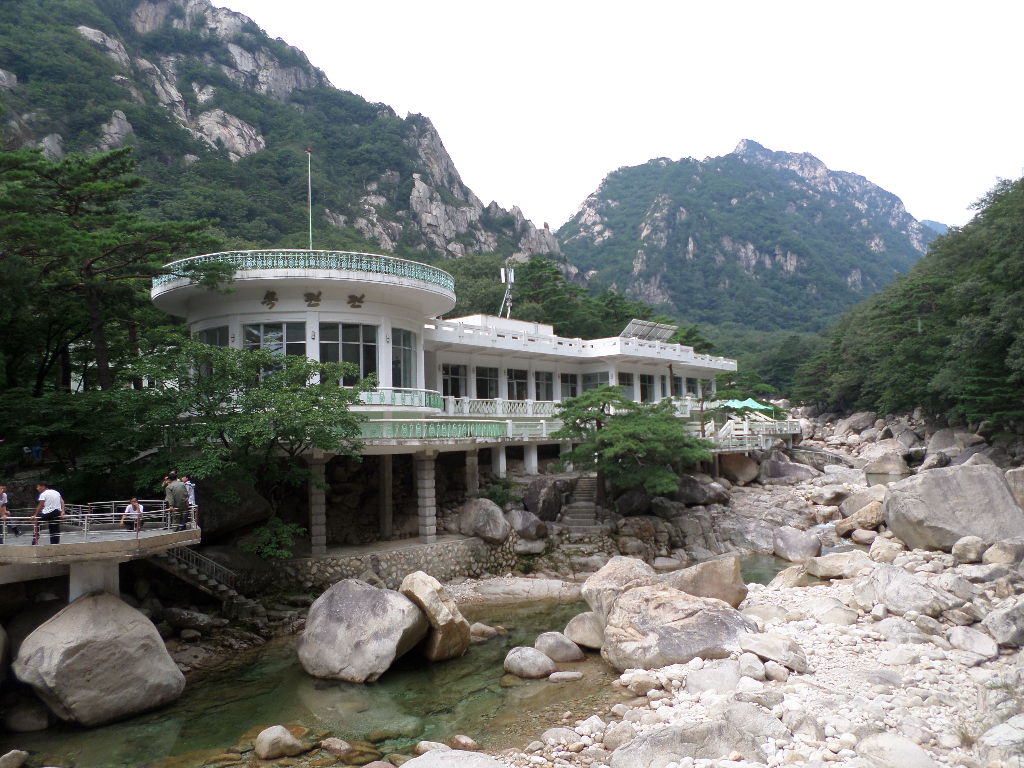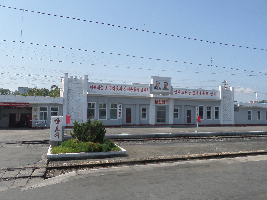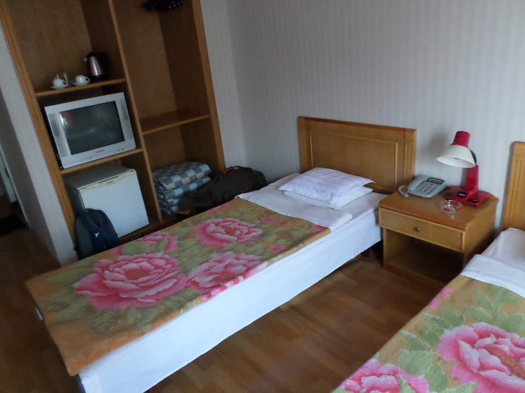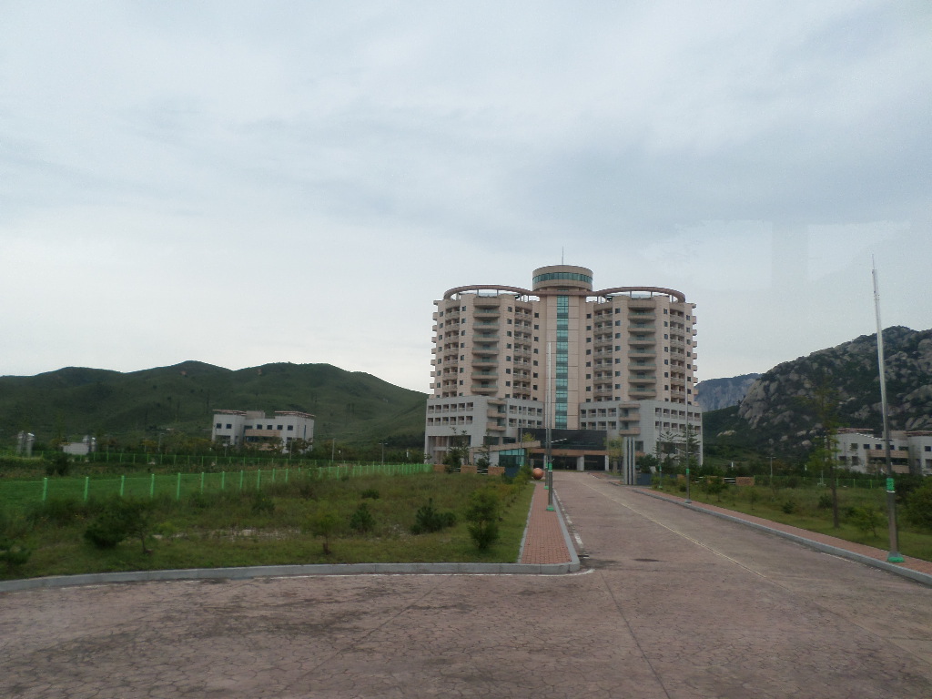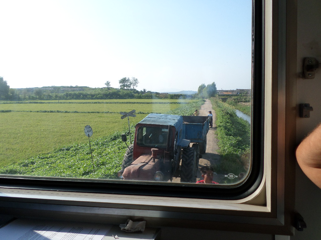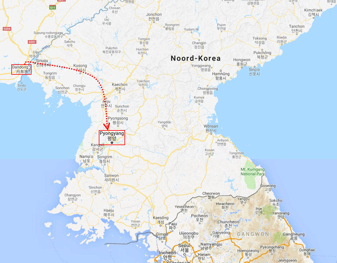 In Peking hebben we enkele uren tijd om ons voor te bereiden op de treinreis richting Noord-Korea. De trein vertrok rond 6u 's avonds. De volgende ochtend komen we aan in Dandong, een Chinese stad die grenst aan Noord-Korea.Het station van PekingDe slaapcabineHet restaurant op de trein. Een deel van het treinpersoneel was er al aan het eten. Ik besloot dan ook maar iets te eten. "Can I have a knife and fork?". "No sowwy". En de chinezen maar lachen.Op dag 3 arriveren we in Dandong, waar we een ontbijt krijgen. De rest van de treinreis wordt verdergezet op een andere trein richting de Noord-Koreaanse hoofdstad Pyongyang.Aankomst in DandongDandongIn de trein over de China-Noord-Korea Vriendschapsbrug. De Yalu rivier die we oversteken maakt een groot deel uit van de grens tussen China en Noord-Korea.Parallel loopt nog een brug, maar deze werd grotendeels vernield tijdens de Koreaanse oorlog.Links: Noord-Korea Rechts: ChinaAl snel verschijnen de portretten van de (overleden) grote leiders Kim Il Sung (links) en Kim Jong Il (rechts). Die zien we overal in Noord-Korea.Langs het platteland zien we vooral rijstvelden.Openbare werkenOnze Nederlandse reisbegeleider Jan is zeer fier op zijn Noord-Koreaanse badge. Deze badges worden door bijna alle Noord-Koreanen gedragen. Als buitenlander kan je deze badge enkel uitgereikt krijgen als je je loyaliteit bewezen hebt.In onze wagon zitten ook enkele Chinese toeristen. De meeste toeristen in Noord-Korea zijn Chinezen.Bij een tussenstop worden we gecontroleerd door Noord-Koreaanse militairen. Alle fototoestellen en telefoons worden geregistreerd, boeken en magazines worden nagekeken. Bagages worden slechts steekproefsgewijs doorgelicht. Onze paspoorten worden ook in beslag genomen. Die krijgen we pas terug op het einde van de reis.De rijstvelden zijn meestal in rechthoekige stukken ingedeeld, met bonenplanten om ze te scheiden.Tegen de avond rijden we Pyongyang binnen. Het volledige treintraject van Peking tot Pyongyang is 1371km lang en deden we ongeveer 24u over.Op dag 4 rijden we met de bus naar de industriestad Hamhung (함흥시). Hier bezoeken we oa. een fabriek van kunstmeststof.Het Yanggakdo International Hotel in Pyongyang waar we deze eerste nacht verbleven. Later keren we hier nog terug.Een tussenstop aan een meer langs het bergachtige landschap.Simon en ikDe bus waar we heel de reis mee rondtrokkenEen fotostop langs het bergachtige landschapDe gidsen vermelden dat zowat driekwart van het land bergen zijn. Omdat de Noord-Koreanen er naar streven om volledig zelfvoorzienend te zijn, wordt bijna alle vlakke grond gebruikt voor landbouw.Aan de linkerkant zie je onze Koreaanse gidsen. Meestal spreken Koreanen elkaar aan met hun volledige naam, maar gemakkelijkheidshalve mochten wij ze aanspreken als miss Kim (links) en miss Ha (rechts).Even dalen we af om een waterval te bezoeken. We picknicken hier in de buurt.De waterval zou in 2001 ontdekt zijn door Kim Jong Il, dankzij zijn fantastisch gehoor.BronwaterDit was een van de weinige maaltijden die ik volledig op kreeg. Op de bus krijgen we dan te horen dat de lunchschotels achtergelaten werden voor kinderen die de overschot zouden eten...De meeste wegen bestaan uit betonplaten.Een propagandabord langs de wegWe komen aan in Hamhung, de tweede grootste stad van Noord-Korea (~ 800.000 inwoners). We rijden hier voorbij een van de talrijke mozaïeken die we te zien zullen krijgen. Links: Kim Il Sung Midden: Kim Jong Il Rechts: Kim Jong Suk (de eerste vrouw van Kim Il Sung)Hamhung is nog maar enkele jaren "open" voor toeristen.Een fabriek van kunstmeststofBij elke bezienswaardigheid krijgen we te horen hoe vaak en wanneer juist de grote leiders die plaats bezocht hebben. Vaak zijn er mozaïeken die hun bezoek afbeelden.Binnen in de fabriekEr zijn maar weinig fabriekswerkers aanwezig, maar ze poseren wel graag voor een foto.'s avonds verblijven we in het Majon Tourist Resort aan de Oost-Koreaanse zee. Hier nemen we een frisse duik in het water.De huisjes waar we verblijven zijn vlak aan het strand.Onze zwembroeken buiten gehangen, maar echt droog werden ze niet door het vochtige klimaat.Het avondmaal. Zoals gewoonlijk werden er nog voortdurend bordjes bij gezet. Als je al vol zit krijg je dan nog een kom rijst en soep.'s middags en 's avonds was er als drank meestal plat water en bier, met de mogelijkheid om "juice" te drinken in plaats van bier. Dat was een soort appel/peren sap (niet op de foto).Onze kamerHier was geen stromend water, en diende het bad als waterreservoir. Wassen moest "op z'n Bangladesh" door een teiltje water over je gieten. In de rode emmer kon water elektrisch verwarmd worden.Op dag 5 bezoeken we nog enkele plaatsen in Hamhung, en vertrekken dan richting Mt. Kumgang. Onderweg bezoeken we oa. nog de kuststad Wonsan.Het huis van de voormalige koning Taejo van Joseon in Hamhung. Hij richtte de Koreaanse Joseondynastie op in 1392, die eindigde in 1897.Een zeer oude boomBuiten het huis stond een groep Koreaanse studenten te wachten.Een aangelegde (niet natuurlijke) heuvel met grote bronzen beelden van de leidersDe lokale gids die ons een woordje uitleg gaf. De plaatselijke gidsen spraken meestal Koreaans, dat dan naar Engels vertaald werd door onze gids miss Kim.Hamhung Grand TheatreWonsanDit verkeersbord leek met de hand geschilderd te zijn.Bezoek aan een de Chonsam coöperatieve boerderijEen persimmon boomOok de grote leiders zijn hier geweest.In het winkeltje van de boerderij kochten we enkele gedroogde persimmons.Naast de boerderij was er een kleuterschool. De kinderen zongen een liedje en wuifden ons dan uit.Iets verderop bezoeken we nog het huis van de boerin die ons begeleidde.Dit huis heeft een soort vloerverwarming die hier vaak toegepast zou worden. Op internet vond ik dit systeem terug als "Ondol".Wat voor een decoder is dat onder de TV? Telenet of Belgacom?Ten slotte bezochten we nog een boeddhistische tempel...Maar bij de tempel zelf mochten we niet komen, omdat er constructi