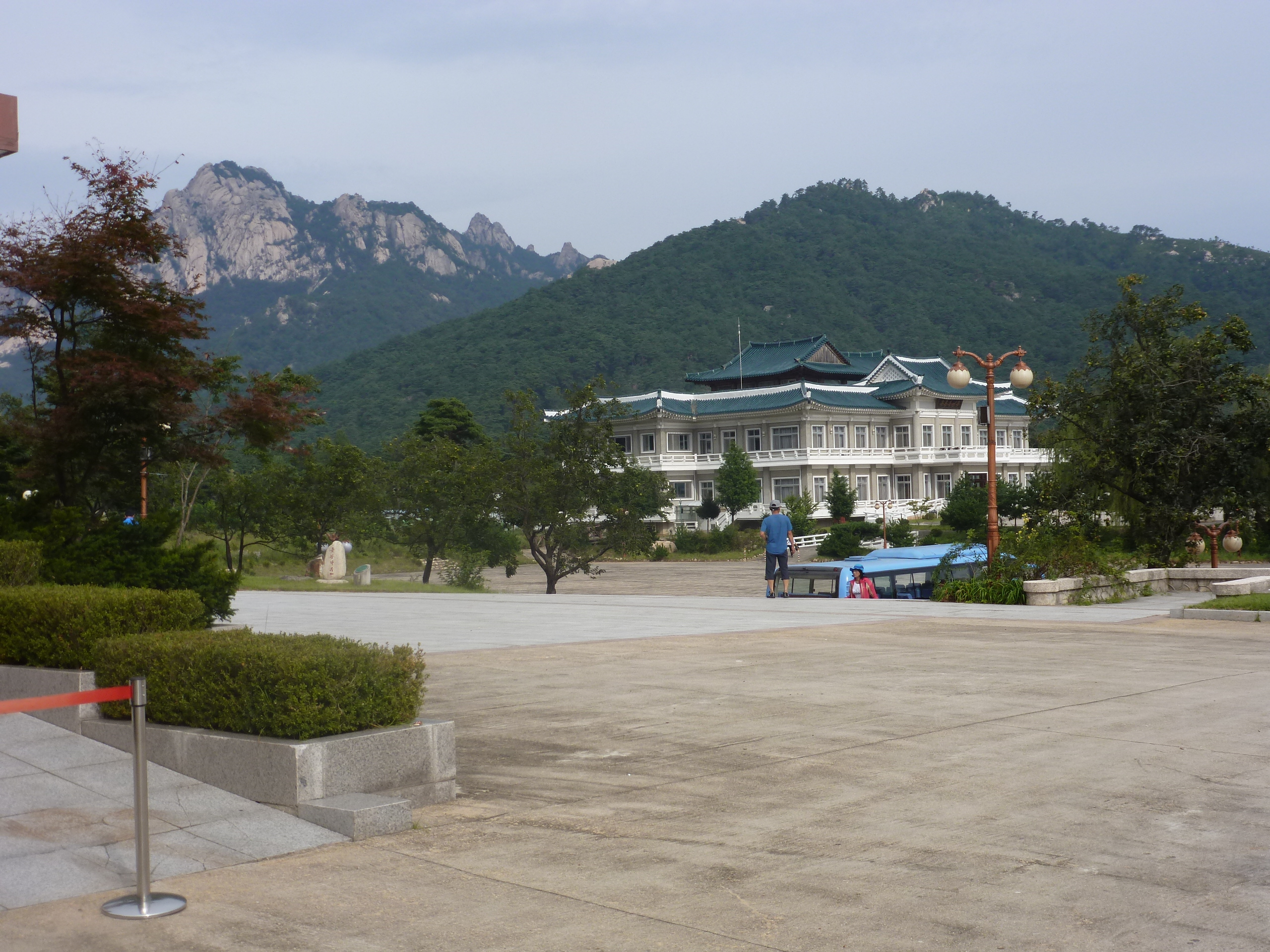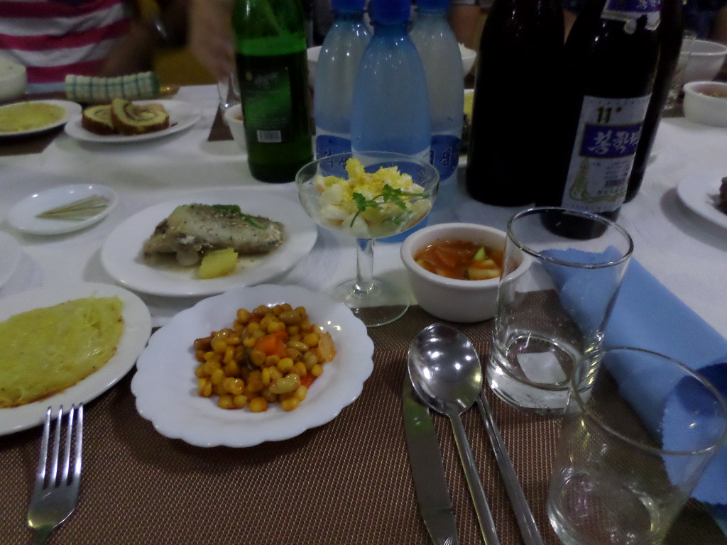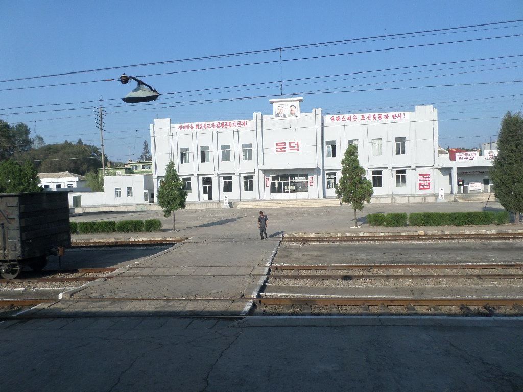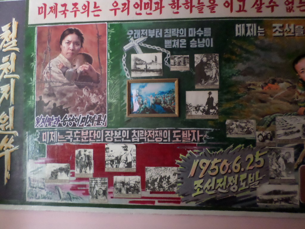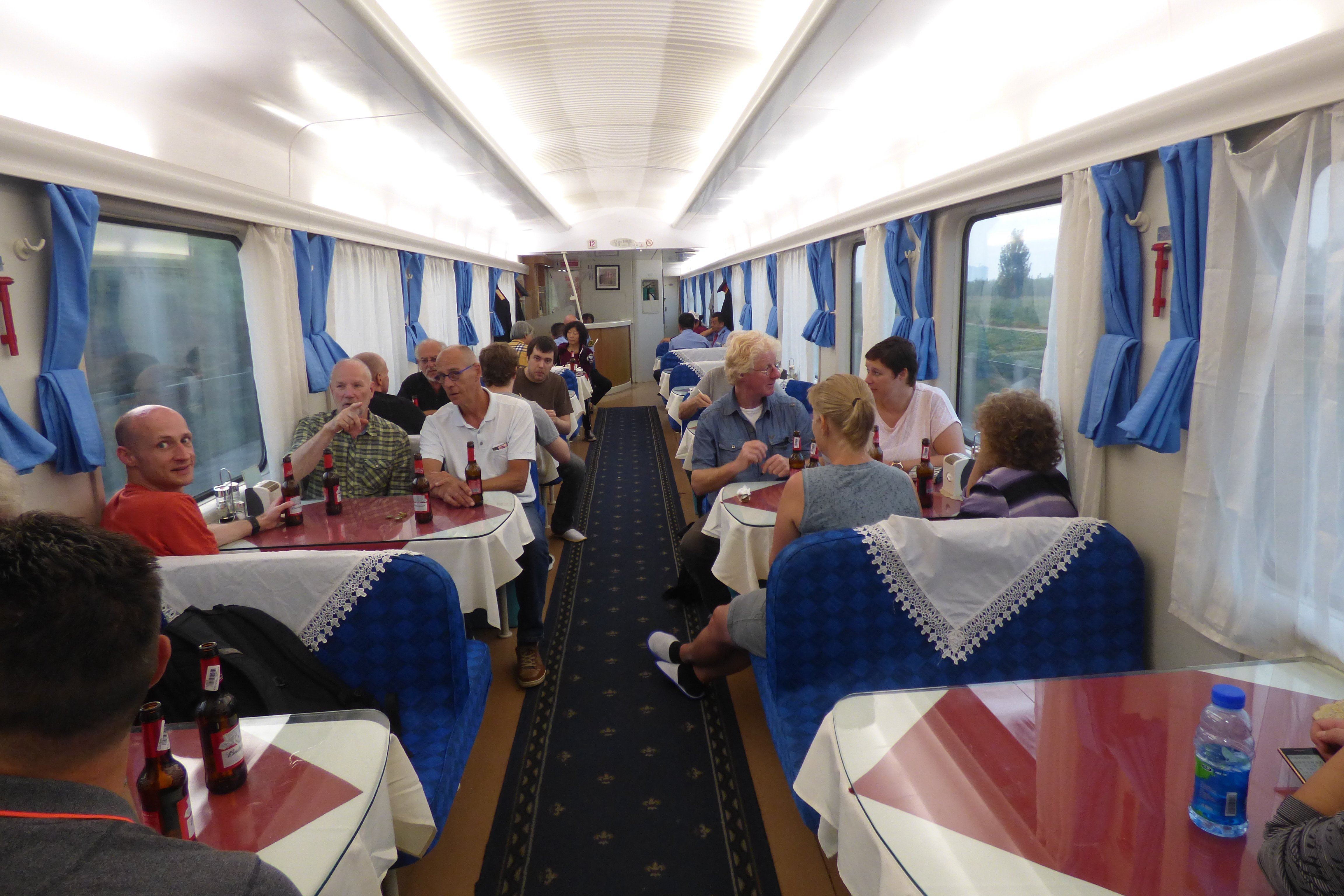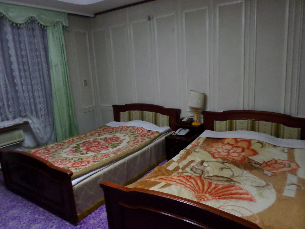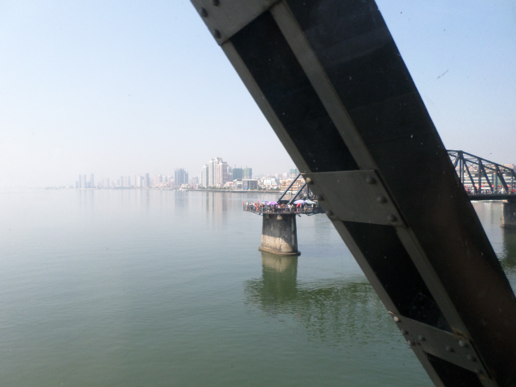 In Peking hebben we enkele uren tijd om ons voor te bereiden op de treinreis richting Noord-Korea. De trein vertrok rond 6u 's avonds. De volgende ochtend komen we aan in Dandong, een Chinese stad die grenst aan Noord-Korea.Het station van PekingDe slaapcabineHet restaurant op de trein. Een deel van het treinpersoneel was er al aan het eten. Ik besloot dan ook maar iets te eten. "Can I have a knife and fork?". "No sowwy". En de chinezen maar lachen.Op dag 3 arriveren we in Dandong, waar we een ontbijt krijgen. De rest van de treinreis wordt verdergezet op een andere trein richting de Noord-Koreaanse hoofdstad Pyongyang.Aankomst in DandongDandongIn de trein over de China-Noord-Korea Vriendschapsbrug. De Yalu rivier die we oversteken maakt een groot deel uit van de grens tussen China en Noord-Korea.Parallel loopt nog een brug, maar deze werd grotendeels vernield tijdens de Koreaanse oorlog.Links: Noord-Korea Rechts: ChinaAl snel verschijnen de portretten van de (overleden) grote leiders Kim Il Sung (links) en Kim Jong Il (rechts). Die zien we overal in Noord-Korea.Langs het platteland zien we vooral rijstvelden.Openbare werkenOnze Nederlandse reisbegeleider Jan is zeer fier op zijn Noord-Koreaanse badge. Deze badges worden door bijna alle Noord-Koreanen gedragen. Als buitenlander kan je deze badge enkel uitgereikt krijgen als je je loyaliteit bewezen hebt.In onze wagon zitten ook enkele Chinese toeristen. De meeste toeristen in Noord-Korea zijn Chinezen.Bij een tussenstop worden we gecontroleerd door Noord-Koreaanse militairen. Alle fototoestellen en telefoons worden geregistreerd, boeken en magazines worden nagekeken. Bagages worden slechts steekproefsgewijs doorgelicht. Onze paspoorten worden ook in beslag genomen. Die krijgen we pas terug op het einde van de reis.De rijstvelden zijn meestal in rechthoekige stukken ingedeeld, met bonenplanten om ze te scheiden.Tegen de avond rijden we Pyongyang binnen. Het volledige treintraject van Peking tot Pyongyang is 1371km lang en deden we ongeveer 24u over.Op dag 4 rijden we met de bus naar de industriestad Hamhung (함흥시). Hier bezoeken we oa. een fabriek van kunstmeststof.Het Yanggakdo International Hotel in Pyongyang waar we deze eerste nacht verbleven. Later keren we hier nog terug.Een tussenstop aan een meer langs het bergachtige landschap.Simon en ikDe bus waar we heel de reis mee rondtrokkenEen fotostop langs het bergachtige landschapDe gidsen vermelden dat zowat driekwart van het land bergen zijn. Omdat de Noord-Koreanen er naar streven om volledig zelfvoorzienend te zijn, wordt bijna alle vlakke grond gebruikt voor landbouw.Aan de linkerkant zie je onze Koreaanse gidsen. Meestal spreken Koreanen elkaar aan met hun volledige naam, maar gemakkelijkheidshalve mochten wij ze aanspreken als miss Kim (links) en miss Ha (rechts).Even dalen we af om een waterval te bezoeken. We picknicken hier in de buurt.De waterval zou in 2001 ontdekt zijn door Kim Jong Il, dankzij zijn fantastisch gehoor.BronwaterDit was een van de weinige maaltijden die ik volledig op kreeg. Op de bus krijgen we dan te horen dat de lunchschotels achtergelaten werden voor kinderen die de overschot zouden eten...De meeste wegen bestaan uit betonplaten.Een propagandabord langs de wegWe komen aan in Hamhung, de tweede grootste stad van Noord-Korea (~ 800.000 inwoners). We rijden hier voorbij een van de talrijke mozaïeken die we te zien zullen krijgen. Links: Kim Il Sung Midden: Kim Jong Il Rechts: Kim Jong Suk (de eerste vrouw van Kim Il Sung)Hamhung is nog maar enkele jaren "open" voor toeristen.Een fabriek van kunstmeststofBij elke bezienswaardigheid krijgen we te horen hoe vaak en wanneer juist de grote leiders die plaats bezocht hebben. Vaak zijn er mozaïeken die hun bezoek afbeelden.Binnen in de fabriekEr zijn maar weinig fabriekswerkers aanwezig, maar ze poseren wel graag voor een foto.'s avonds verblijven we in het Majon Tourist Resort aan de Oost-Koreaanse zee. Hier nemen we een frisse duik in het water.De huisjes waar we verblijven zijn vlak aan het strand.Onze zwembroeken buiten gehangen, maar echt droog werden ze niet door het vochtige klimaat.Het avondmaal. Zoals gewoonlijk werden er nog voortdurend bordjes bij gezet. Als je al vol zit krijg je dan nog een kom rijst en soep.'s middags en 's avonds was er als drank meestal plat water en bier, met de mogelijkheid om "juice" te drinken in plaats van bier. Dat was een soort appel/peren sap (niet op de foto).Onze kamerHier was geen stromend water, en diende het bad als waterreservoir. Wassen moest "op z'n Bangladesh" door een teiltje water over je gieten. In de rode emmer kon water elektrisch verwarmd worden.Op dag 5 bezoeken we nog enkele plaatsen in Hamhung, en vertrekken dan richting Mt. Kumgang. Onderweg bezoeken we oa. nog de kuststad Wonsan.Het huis van de voormalige koning Taejo van Joseon in Hamhung. Hij richtte de Koreaanse Joseondynastie op in 1392, die eindigde in 1897.Een zeer oude boomBuiten het huis stond een groep Koreaanse studenten te wachten.Een aangelegde (niet natuurlijke) heuvel met grote bronzen beelden van de leidersDe lokale gids die ons een woordje uitleg gaf. De plaatselijke gidsen spraken meestal Koreaans, dat dan naar Engels vertaald werd door onze gids miss Kim.Hamhung Grand TheatreWonsanDit verkeersbord leek met de hand geschilderd te zijn.Bezoek aan een de Chonsam coöperatieve boerderijEen persimmon boomOok de grote leiders zijn hier geweest.In het winkeltje van de boerderij kochten we enkele gedroogde persimmons.Naast de boerderij was er een kleuterschool. De kinderen zongen een liedje en wuifden ons dan uit.Iets verderop bezoeken we nog het huis van de boerin die ons begeleidde.Dit huis heeft een soort vloerverwarming die hier vaak toegepast zou worden. Op internet vond ik dit systeem terug als "Ondol".Wat voor een decoder is dat onder de TV? Telenet of Belgacom?Ten slotte bezochten we nog een boeddhistische tempel...Maar bij de tempel zelf mochten we niet komen, omdat er constructi