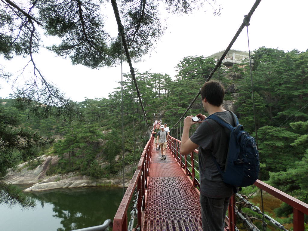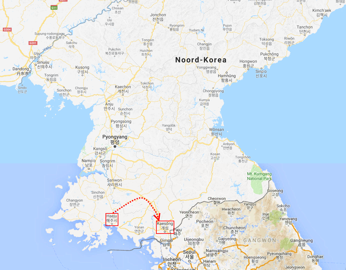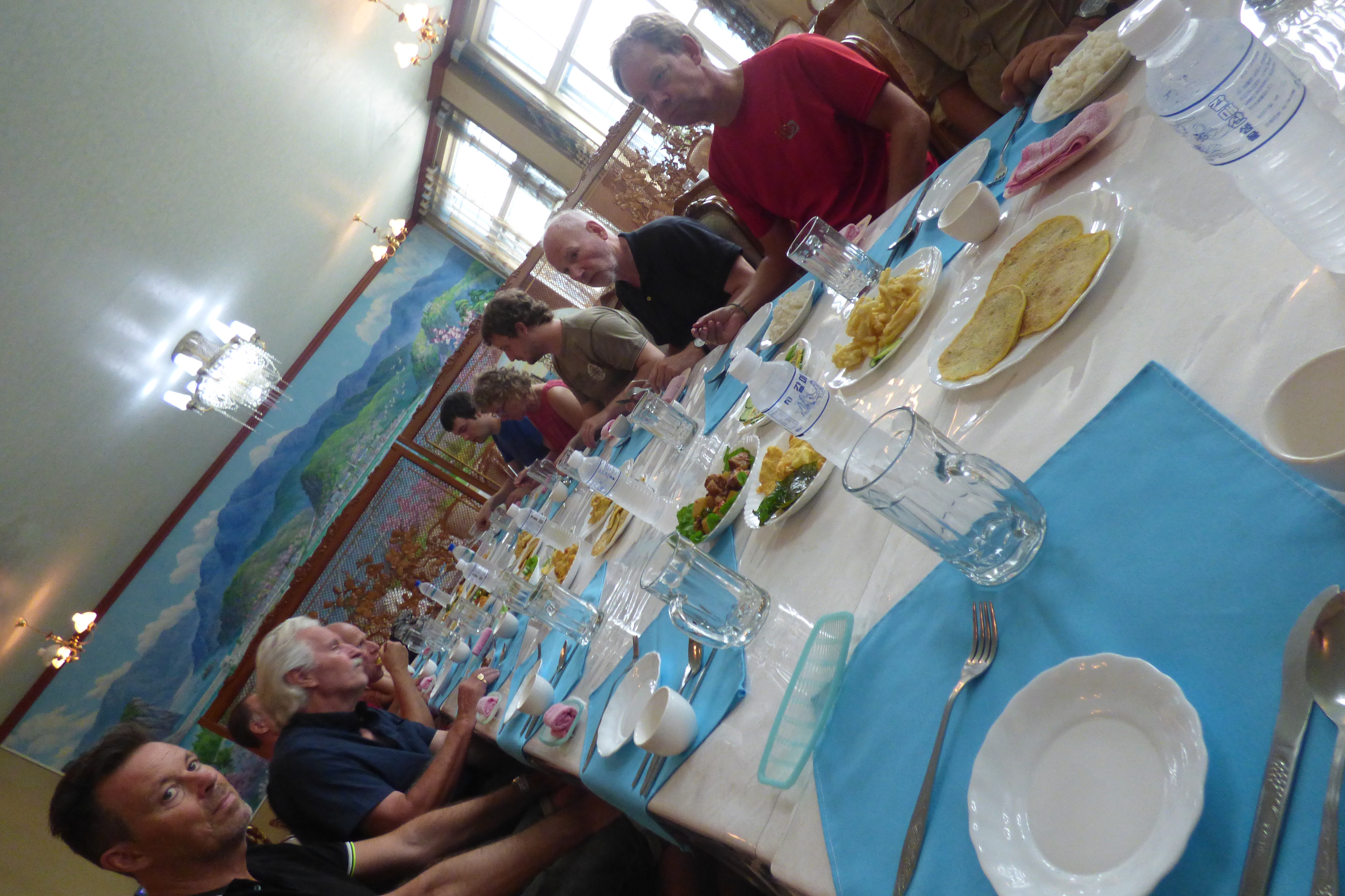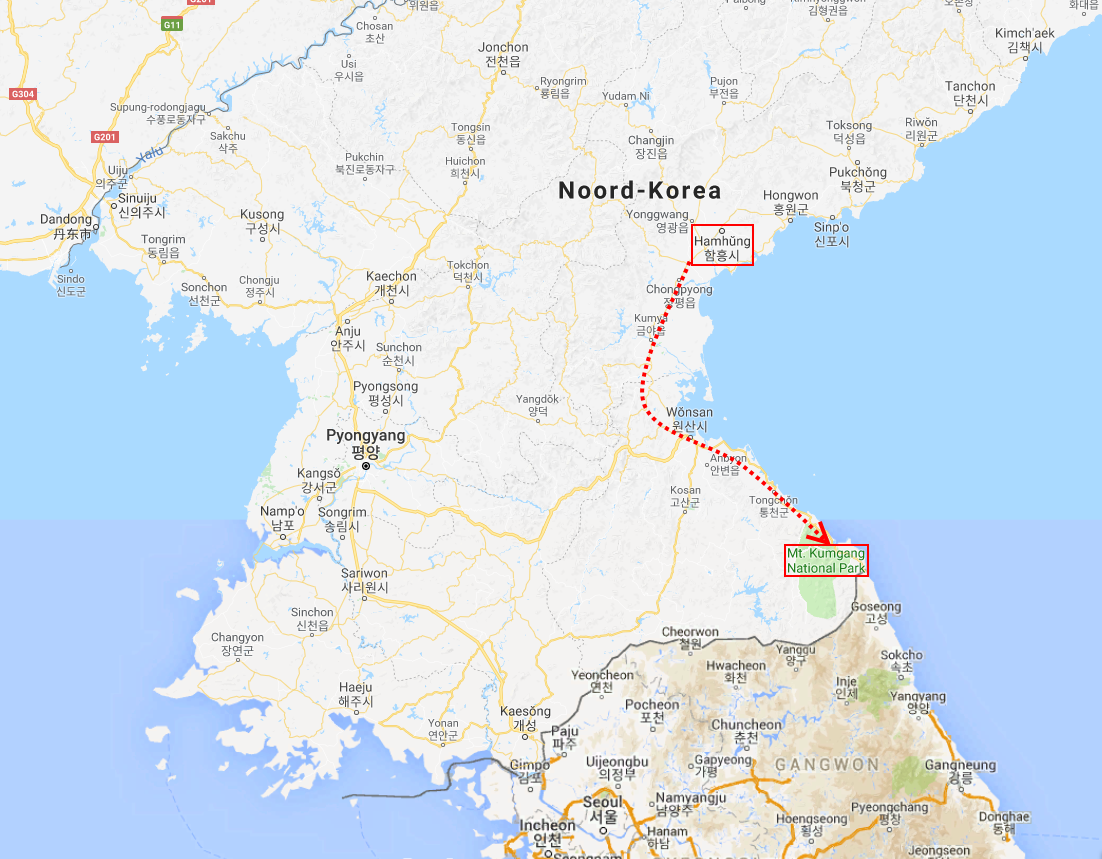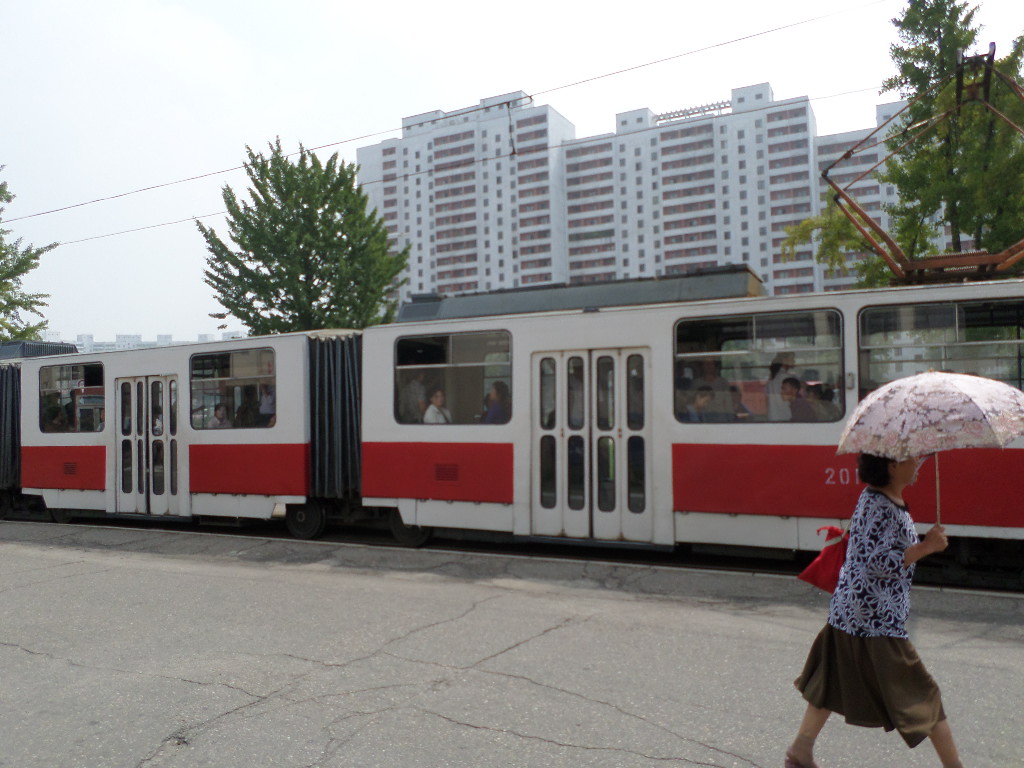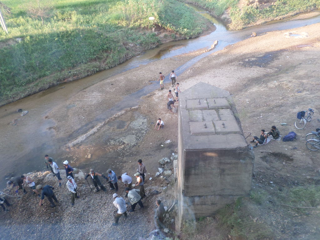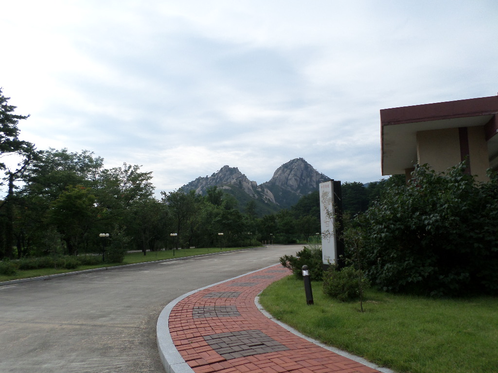 In Peking hebben we enkele uren tijd om ons voor te bereiden op de treinreis richting Noord-Korea. De trein vertrok rond 6u 's avonds. De volgende ochtend komen we aan in Dandong, een Chinese stad die grenst aan Noord-Korea.Het station van PekingDe slaapcabineHet restaurant op de trein. Een deel van het treinpersoneel was er al aan het eten. Ik besloot dan ook maar iets te eten. "Can I have a knife and fork?". "No sowwy". En de chinezen maar lachen.Op dag 3 arriveren we in Dandong, waar we een ontbijt krijgen. De rest van de treinreis wordt verdergezet op een andere trein richting de Noord-Koreaanse hoofdstad Pyongyang.Aankomst in DandongDandongIn de trein over de China-Noord-Korea Vriendschapsbrug. De Yalu rivier die we oversteken maakt een groot deel uit van de grens tussen China en Noord-Korea.Parallel loopt nog een brug, maar deze werd grotendeels vernield tijdens de Koreaanse oorlog.Links: Noord-Korea Rechts: ChinaAl snel verschijnen de portretten van de (overleden) grote leiders Kim Il Sung (links) en Kim Jong Il (rechts). Die zien we overal in Noord-Korea.Langs het platteland zien we vooral rijstvelden.Openbare werkenOnze Nederlandse reisbegeleider Jan is zeer fier op zijn Noord-Koreaanse badge. Deze badges worden door bijna alle Noord-Koreanen gedragen. Als buitenlander kan je deze badge enkel uitgereikt krijgen als je je loyaliteit bewezen hebt.In onze wagon zitten ook enkele Chinese toeristen. De meeste toeristen in Noord-Korea zijn Chinezen.Bij een tussenstop worden we gecontroleerd door Noord-Koreaanse militairen. Alle fototoestellen en telefoons worden geregistreerd, boeken en magazines worden nagekeken. Bagages worden slechts steekproefsgewijs doorgelicht. Onze paspoorten worden ook in beslag genomen. Die krijgen we pas terug op het einde van de reis.De rijstvelden zijn meestal in rechthoekige stukken ingedeeld, met bonenplanten om ze te scheiden.Tegen de avond rijden we Pyongyang binnen. Het volledige treintraject van Peking tot Pyongyang is 1371km lang en deden we ongeveer 24u over.Op dag 4 rijden we met de bus naar de industriestad Hamhung (함흥시). Hier bezoeken we oa. een fabriek van kunstmeststof.Het Yanggakdo International Hotel in Pyongyang waar we deze eerste nacht verbleven. Later keren we hier nog terug.Een tussenstop aan een meer langs het bergachtige landschap.Simon en ikDe bus waar we heel de reis mee rondtrokkenEen fotostop langs het bergachtige landschapDe gidsen vermelden dat zowat driekwart van het land bergen zijn. Omdat de Noord-Koreanen er naar streven om volledig zelfvoorzienend te zijn, wordt bijna alle vlakke grond gebruikt voor landbouw.Aan de linkerkant zie je onze Koreaanse gidsen. Meestal spreken Koreanen elkaar aan met hun volledige naam, maar gemakkelijkheidshalve mochten wij ze aanspreken als miss Kim (links) en miss Ha (rechts).Even dalen we af om een waterval te bezoeken. We picknicken hier in de buurt.De waterval zou in 2001 ontdekt zijn door Kim Jong Il, dankzij zijn fantastisch gehoor.BronwaterDit was een van de weinige maaltijden die ik volledig op kreeg. Op de bus krijgen we dan te horen dat de lunchschotels achtergelaten werden voor kinderen die de overschot zouden eten...De meeste wegen bestaan uit betonplaten.Een propagandabord langs de wegWe komen aan in Hamhung, de tweede grootste stad van Noord-Korea (~ 800.000 inwoners). We rijden hier voorbij een van de talrijke mozaïeken die we te zien zullen krijgen. Links: Kim Il Sung Midden: Kim Jong Il Rechts: Kim Jong Suk (de eerste vrouw van Kim Il Sung)Hamhung is nog maar enkele jaren "open" voor toeristen.Een fabriek van kunstmeststofBij elke bezienswaardigheid krijgen we te horen hoe vaak en wanneer juist de grote leiders die plaats bezocht hebben. Vaak zijn er mozaïeken die hun bezoek afbeelden.Binnen in de fabriekEr zijn maar weinig fabriekswerkers aanwezig, maar ze poseren wel graag voor een foto.'s avonds verblijven we in het Majon Tourist Resort aan de Oost-Koreaanse zee. Hier nemen we een frisse duik in het water.De huisjes waar we verblijven zijn vlak aan het strand.Onze zwembroeken buiten gehangen, maar echt droog werden ze niet door het vochtige klimaat.Het avondmaal. Zoals gewoonlijk werden er nog voortdurend bordjes bij gezet. Als je al vol zit krijg je dan nog een kom rijst en soep.'s middags en 's avonds was er als drank meestal plat water en bier, met de mogelijkheid om "juice" te drinken in plaats van bier. Dat was een soort appel/peren sap (niet op de foto).Onze kamerHier was geen stromend water, en diende het bad als waterreservoir. Wassen moest "op z'n Bangladesh" door een teiltje water over je gieten. In de rode emmer kon water elektrisch verwarmd worden.Op dag 5 bezoeken we nog enkele plaatsen in Hamhung, en vertrekken dan richting Mt. Kumgang. Onderweg bezoeken we oa. nog de kuststad Wonsan.Het huis van de voormalige koning Taejo van Joseon in Hamhung. Hij richtte de Koreaanse Joseondynastie op in 1392, die eindigde in 1897.Een zeer oude boomBuiten het huis stond een groep Koreaanse studenten te wachten.Een aangelegde (niet natuurlijke) heuvel met grote bronzen beelden van de leidersDe lokale gids die ons een woordje uitleg gaf. De plaatselijke gidsen spraken meestal Koreaans, dat dan naar Engels vertaald werd door onze gids miss Kim.Hamhung Grand TheatreWonsanDit verkeersbord leek met de hand geschilderd te zijn.Bezoek aan een de Chonsam coöperatieve boerderijEen persimmon boomOok de grote leiders zijn hier geweest.In het winkeltje van de boerderij kochten we enkele gedroogde persimmons.Naast de boerderij was er een kleuterschool. De kinderen zongen een liedje en wuifden ons dan uit.Iets verderop bezoeken we nog het huis van de boerin die ons begeleidde.Dit huis heeft een soort vloerverwarming die hier vaak toegepast zou worden. Op internet vond ik dit systeem terug als "Ondol".Wat voor een decoder is dat onder de TV? Telenet of Belgacom?Ten slotte bezochten we nog een boeddhistische tempel...Maar bij de tempel zelf mochten we niet komen, omdat er constructi