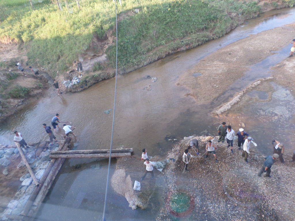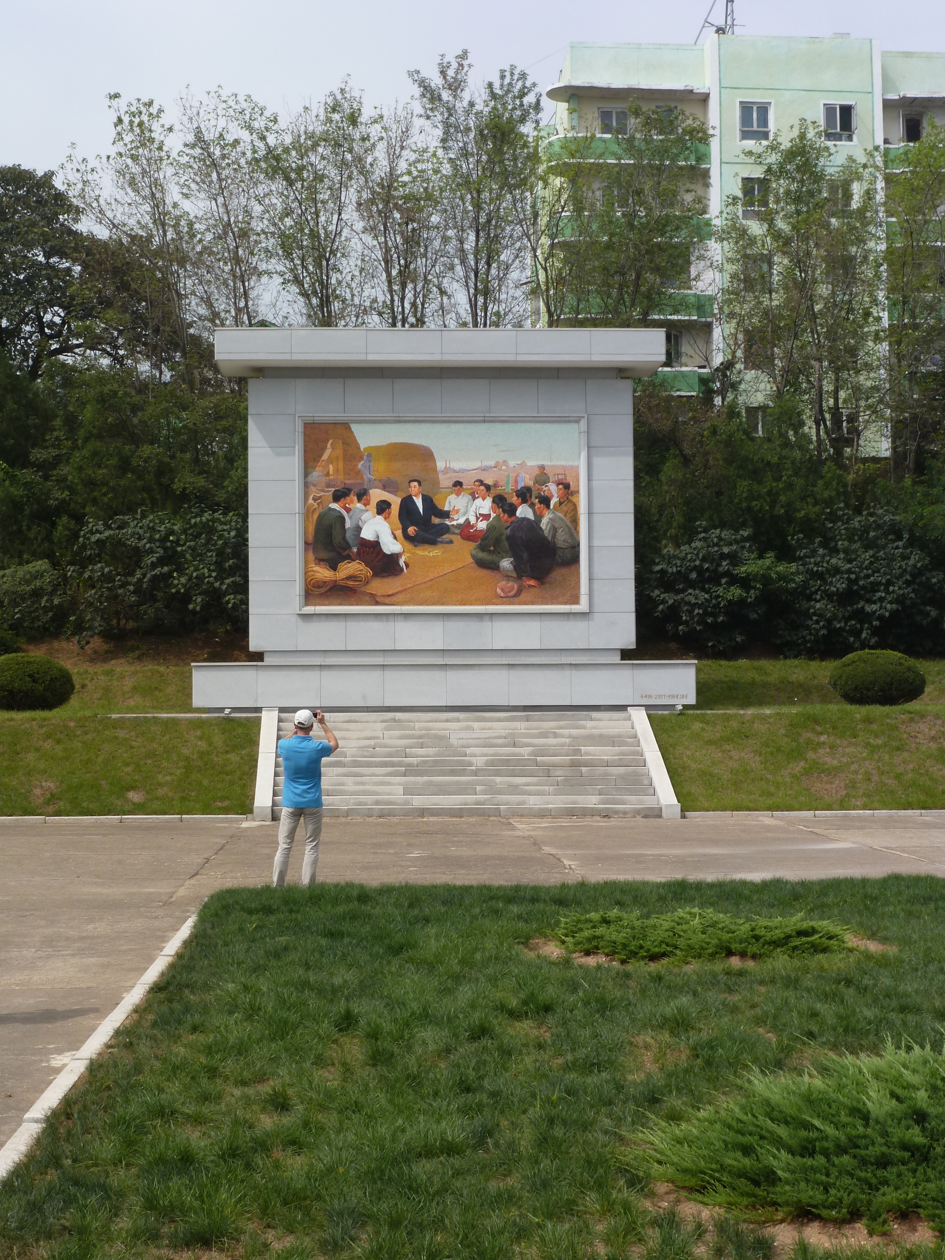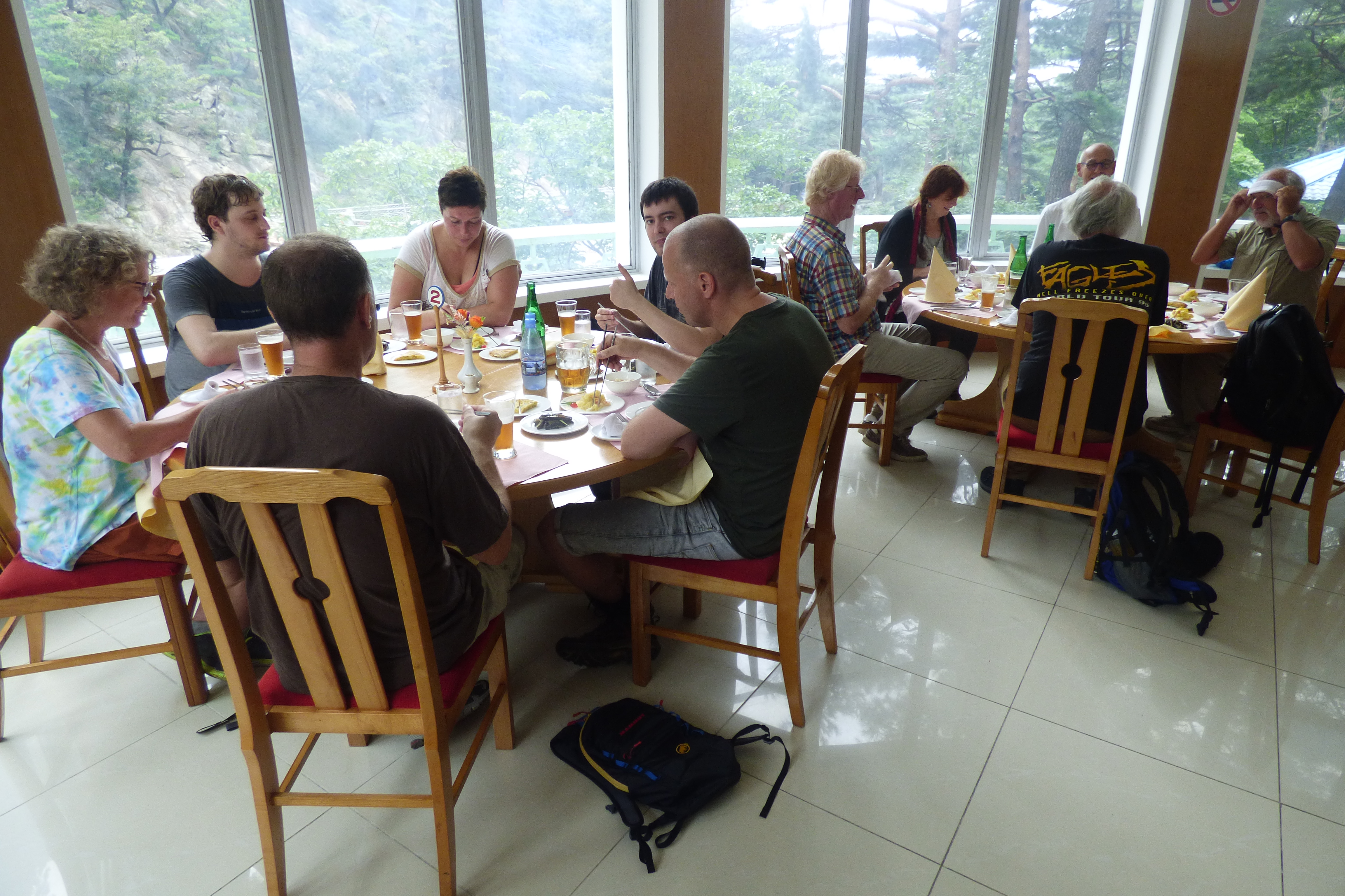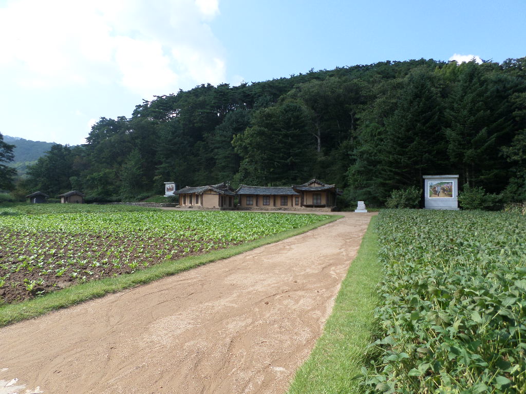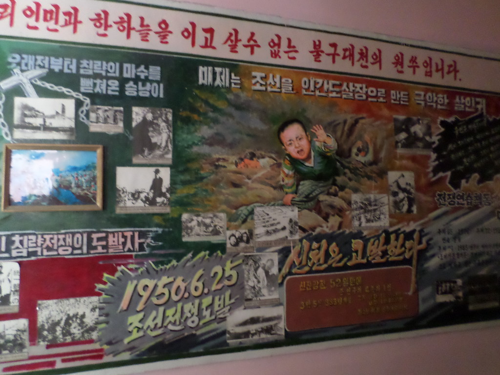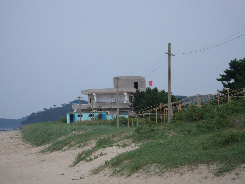 In Peking hebben we enkele uren tijd om ons voor te bereiden op de treinreis richting Noord-Korea. De trein vertrok rond 6u 's avonds. De volgende ochtend komen we aan in Dandong, een Chinese stad die grenst aan Noord-Korea.Het station van PekingDe slaapcabineHet restaurant op de trein. Een deel van het treinpersoneel was er al aan het eten. Ik besloot dan ook maar iets te eten. "Can I have a knife and fork?". "No sowwy". En de chinezen maar lachen.Op dag 3 arriveren we in Dandong, waar we een ontbijt krijgen. De rest van de treinreis wordt verdergezet op een andere trein richting de Noord-Koreaanse hoofdstad Pyongyang.Aankomst in DandongDandongIn de trein over de China-Noord-Korea Vriendschapsbrug. De Yalu rivier die we oversteken maakt een groot deel uit van de grens tussen China en Noord-Korea.Parallel loopt nog een brug, maar deze werd grotendeels vernield tijdens de Koreaanse oorlog.Links: Noord-Korea Rechts: ChinaAl snel verschijnen de portretten van de (overleden) grote leiders Kim Il Sung (links) en Kim Jong Il (rechts). Die zien we overal in Noord-Korea.Langs het platteland zien we vooral rijstvelden.Openbare werkenOnze Nederlandse reisbegeleider Jan is zeer fier op zijn Noord-Koreaanse badge. Deze badges worden door bijna alle Noord-Koreanen gedragen. Als buitenlander kan je deze badge enkel uitgereikt krijgen als je je loyaliteit bewezen hebt.In onze wagon zitten ook enkele Chinese toeristen. De meeste toeristen in Noord-Korea zijn Chinezen.Bij een tussenstop worden we gecontroleerd door Noord-Koreaanse militairen. Alle fototoestellen en telefoons worden geregistreerd, boeken en magazines worden nagekeken. Bagages worden slechts steekproefsgewijs doorgelicht. Onze paspoorten worden ook in beslag genomen. Die krijgen we pas terug op het einde van de reis.De rijstvelden zijn meestal in rechthoekige stukken ingedeeld, met bonenplanten om ze te scheiden.Tegen de avond rijden we Pyongyang binnen. Het volledige treintraject van Peking tot Pyongyang is 1371km lang en deden we ongeveer 24u over.Op dag 4 rijden we met de bus naar de industriestad Hamhung (함흥시). Hier bezoeken we oa. een fabriek van kunstmeststof.Het Yanggakdo International Hotel in Pyongyang waar we deze eerste nacht verbleven. Later keren we hier nog terug.Een tussenstop aan een meer langs het bergachtige landschap.Simon en ikDe bus waar we heel de reis mee rondtrokkenEen fotostop langs het bergachtige landschapDe gidsen vermelden dat zowat driekwart van het land bergen zijn. Omdat de Noord-Koreanen er naar streven om volledig zelfvoorzienend te zijn, wordt bijna alle vlakke grond gebruikt voor landbouw.Aan de linkerkant zie je onze Koreaanse gidsen. Meestal spreken Koreanen elkaar aan met hun volledige naam, maar gemakkelijkheidshalve mochten wij ze aanspreken als miss Kim (links) en miss Ha (rechts).Even dalen we af om een waterval te bezoeken. We picknicken hier in de buurt.De waterval zou in 2001 ontdekt zijn door Kim Jong Il, dankzij zijn fantastisch gehoor.BronwaterDit was een van de weinige maaltijden die ik volledig op kreeg. Op de bus krijgen we dan te horen dat de lunchschotels achtergelaten werden voor kinderen die de overschot zouden eten...De meeste wegen bestaan uit betonplaten.Een propagandabord langs de wegWe komen aan in Hamhung, de tweede grootste stad van Noord-Korea (~ 800.000 inwoners). We rijden hier voorbij een van de talrijke mozaïeken die we te zien zullen krijgen. Links: Kim Il Sung Midden: Kim Jong Il Rechts: Kim Jong Suk (de eerste vrouw van Kim Il Sung)Hamhung is nog maar enkele jaren "open" voor toeristen.Een fabriek van kunstmeststofBij elke bezienswaardigheid krijgen we te horen hoe vaak en wanneer juist de grote leiders die plaats bezocht hebben. Vaak zijn er mozaïeken die hun bezoek afbeelden.Binnen in de fabriekEr zijn maar weinig fabriekswerkers aanwezig, maar ze poseren wel graag voor een foto.'s avonds verblijven we in het Majon Tourist Resort aan de Oost-Koreaanse zee. Hier nemen we een frisse duik in het water.De huisjes waar we verblijven zijn vlak aan het strand.Onze zwembroeken buiten gehangen, maar echt droog werden ze niet door het vochtige klimaat.Het avondmaal. Zoals gewoonlijk werden er nog voortdurend bordjes bij gezet. Als je al vol zit krijg je dan nog een kom rijst en soep.'s middags en 's avonds was er als drank meestal plat water en bier, met de mogelijkheid om "juice" te drinken in plaats van bier. Dat was een soort appel/peren sap (niet op de foto).Onze kamerHier was geen stromend water, en diende het bad als waterreservoir. Wassen moest "op z'n Bangladesh" door een teiltje water over je gieten. In de rode emmer kon water elektrisch verwarmd worden.Op dag 5 bezoeken we nog enkele plaatsen in Hamhung, en vertrekken dan richting Mt. Kumgang. Onderweg bezoeken we oa. nog de kuststad Wonsan.Het huis van de voormalige koning Taejo van Joseon in Hamhung. Hij richtte de Koreaanse Joseondynastie op in 1392, die eindigde in 1897.Een zeer oude boomBuiten het huis stond een groep Koreaanse studenten te wachten.Een aangelegde (niet natuurlijke) heuvel met grote bronzen beelden van de leidersDe lokale gids die ons een woordje uitleg gaf. De plaatselijke gidsen spraken meestal Koreaans, dat dan naar Engels vertaald werd door onze gids miss Kim.Hamhung Grand TheatreWonsanDit verkeersbord leek met de hand geschilderd te zijn.Bezoek aan een de Chonsam coöperatieve boerderijEen persimmon boomOok de grote leiders zijn hier geweest.In het winkeltje van de boerderij kochten we enkele gedroogde persimmons.Naast de boerderij was er een kleuterschool. De kinderen zongen een liedje en wuifden ons dan uit.Iets verderop bezoeken we nog het huis van de boerin die ons begeleidde.Dit huis heeft een soort vloerverwarming die hier vaak toegepast zou worden. Op internet vond ik dit systeem terug als "Ondol".Wat voor een decoder is dat onder de TV? Telenet of Belgacom?Ten slotte bezochten we nog een boeddhistische tempel...Maar bij de tempel zelf mochten we niet komen, omdat er constructi