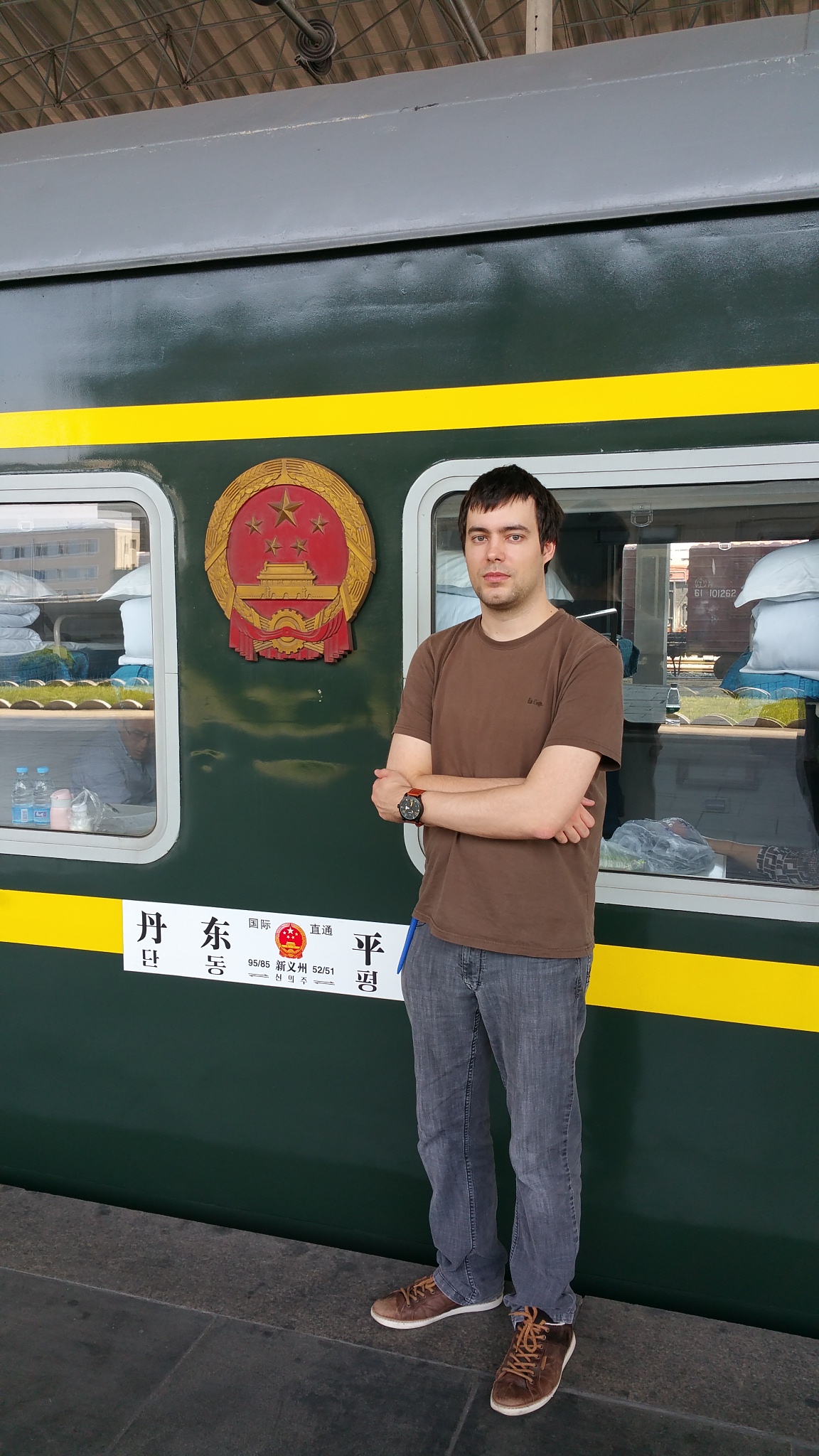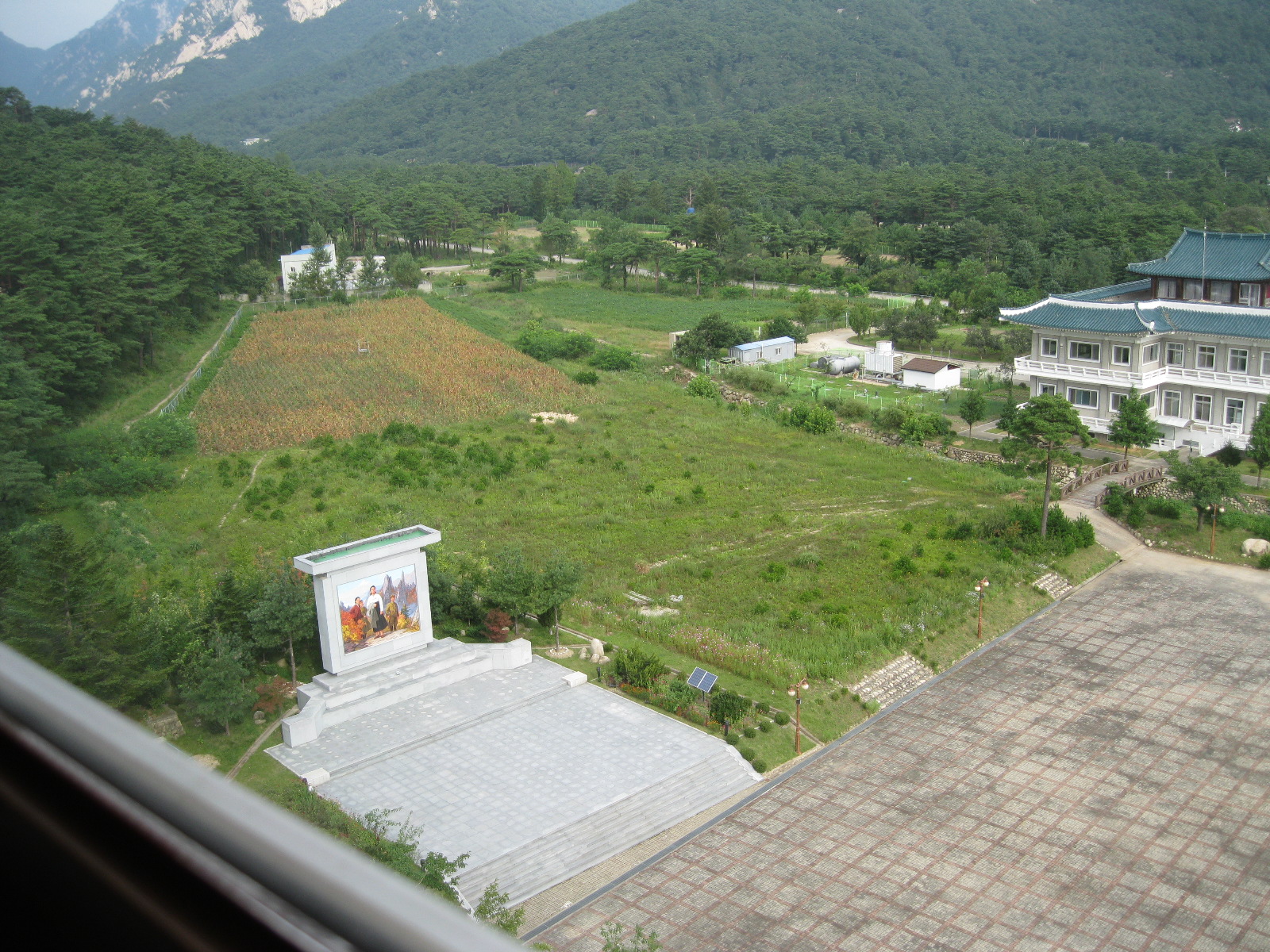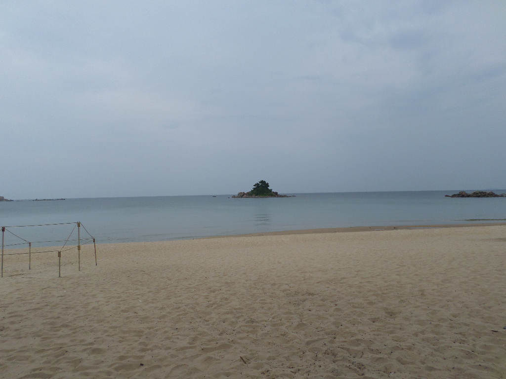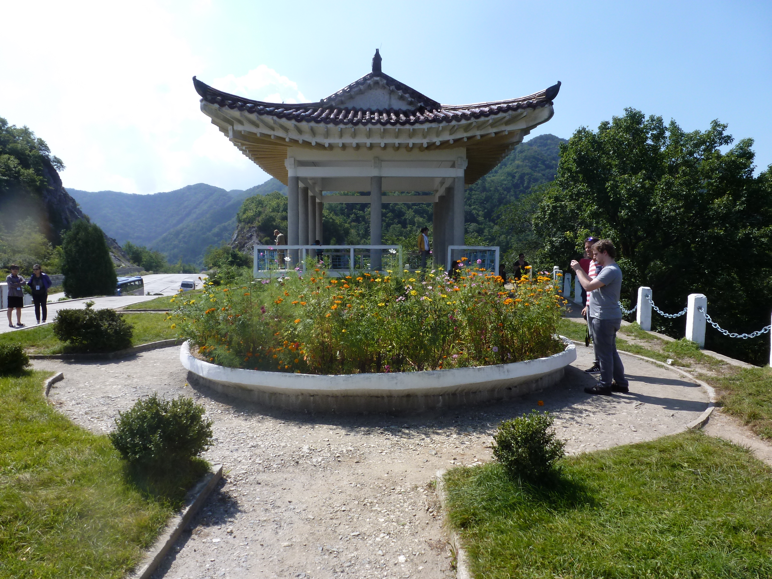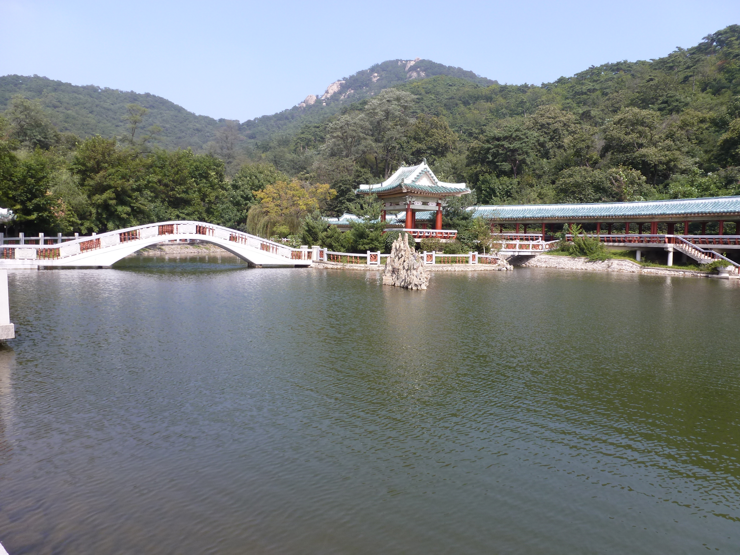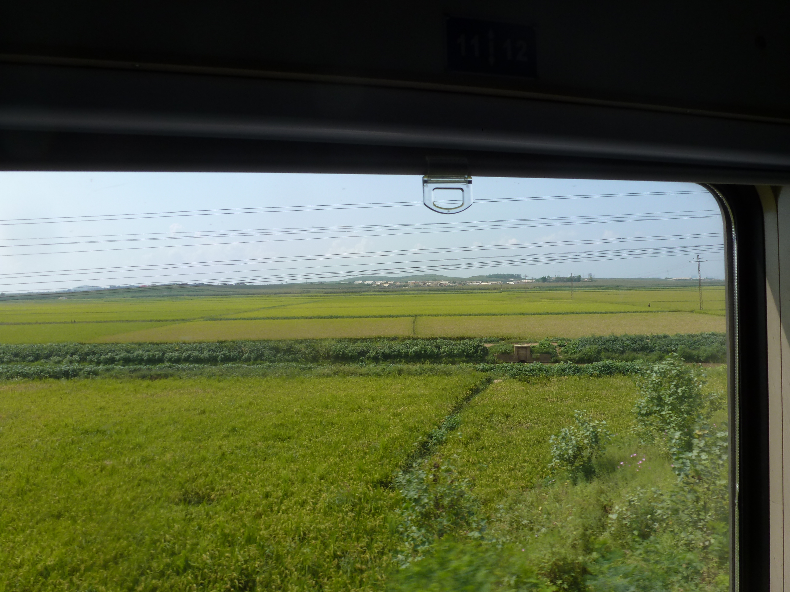 In Peking hebben we enkele uren tijd om ons voor te bereiden op de treinreis richting Noord-Korea. De trein vertrok rond 6u 's avonds. De volgende ochtend komen we aan in Dandong, een Chinese stad die grenst aan Noord-Korea.Het station van PekingDe slaapcabineHet restaurant op de trein. Een deel van het treinpersoneel was er al aan het eten. Ik besloot dan ook maar iets te eten. "Can I have a knife and fork?". "No sowwy". En de chinezen maar lachen.Op dag 3 arriveren we in Dandong, waar we een ontbijt krijgen. De rest van de treinreis wordt verdergezet op een andere trein richting de Noord-Koreaanse hoofdstad Pyongyang.Aankomst in DandongDandongIn de trein over de China-Noord-Korea Vriendschapsbrug. De Yalu rivier die we oversteken maakt een groot deel uit van de grens tussen China en Noord-Korea.Parallel loopt nog een brug, maar deze werd grotendeels vernield tijdens de Koreaanse oorlog.Links: Noord-Korea Rechts: ChinaAl snel verschijnen de portretten van de (overleden) grote leiders Kim Il Sung (links) en Kim Jong Il (rechts). Die zien we overal in Noord-Korea.Langs het platteland zien we vooral rijstvelden.Openbare werkenOnze Nederlandse reisbegeleider Jan is zeer fier op zijn Noord-Koreaanse badge. Deze badges worden door bijna alle Noord-Koreanen gedragen. Als buitenlander kan je deze badge enkel uitgereikt krijgen als je je loyaliteit bewezen hebt.In onze wagon zitten ook enkele Chinese toeristen. De meeste toeristen in Noord-Korea zijn Chinezen.Bij een tussenstop worden we gecontroleerd door Noord-Koreaanse militairen. Alle fototoestellen en telefoons worden geregistreerd, boeken en magazines worden nagekeken. Bagages worden slechts steekproefsgewijs doorgelicht. Onze paspoorten worden ook in beslag genomen. Die krijgen we pas terug op het einde van de reis.De rijstvelden zijn meestal in rechthoekige stukken ingedeeld, met bonenplanten om ze te scheiden.Tegen de avond rijden we Pyongyang binnen. Het volledige treintraject van Peking tot Pyongyang is 1371km lang en deden we ongeveer 24u over.Op dag 4 rijden we met de bus naar de industriestad Hamhung (함흥시). Hier bezoeken we oa. een fabriek van kunstmeststof.Het Yanggakdo International Hotel in Pyongyang waar we deze eerste nacht verbleven. Later keren we hier nog terug.Een tussenstop aan een meer langs het bergachtige landschap.Simon en ikDe bus waar we heel de reis mee rondtrokkenEen fotostop langs het bergachtige landschapDe gidsen vermelden dat zowat driekwart van het land bergen zijn. Omdat de Noord-Koreanen er naar streven om volledig zelfvoorzienend te zijn, wordt bijna alle vlakke grond gebruikt voor landbouw.Aan de linkerkant zie je onze Koreaanse gidsen. Meestal spreken Koreanen elkaar aan met hun volledige naam, maar gemakkelijkheidshalve mochten wij ze aanspreken als miss Kim (links) en miss Ha (rechts).Even dalen we af om een waterval te bezoeken. We picknicken hier in de buurt.De waterval zou in 2001 ontdekt zijn door Kim Jong Il, dankzij zijn fantastisch gehoor.BronwaterDit was een van de weinige maaltijden die ik volledig op kreeg. Op de bus krijgen we dan te horen dat de lunchschotels achtergelaten werden voor kinderen die de overschot zouden eten...De meeste wegen bestaan uit betonplaten.Een propagandabord langs de wegWe komen aan in Hamhung, de tweede grootste stad van Noord-Korea (~ 800.000 inwoners). We rijden hier voorbij een van de talrijke mozaïeken die we te zien zullen krijgen. Links: Kim Il Sung Midden: Kim Jong Il Rechts: Kim Jong Suk (de eerste vrouw van Kim Il Sung)Hamhung is nog maar enkele jaren "open" voor toeristen.Een fabriek van kunstmeststofBij elke bezienswaardigheid krijgen we te horen hoe vaak en wanneer juist de grote leiders die plaats bezocht hebben. Vaak zijn er mozaïeken die hun bezoek afbeelden.Binnen in de fabriekEr zijn maar weinig fabriekswerkers aanwezig, maar ze poseren wel graag voor een foto.'s avonds verblijven we in het Majon Tourist Resort aan de Oost-Koreaanse zee. Hier nemen we een frisse duik in het water.De huisjes waar we verblijven zijn vlak aan het strand.Onze zwembroeken buiten gehangen, maar echt droog werden ze niet door het vochtige klimaat.Het avondmaal. Zoals gewoonlijk werden er nog voortdurend bordjes bij gezet. Als je al vol zit krijg je dan nog een kom rijst en soep.'s middags en 's avonds was er als drank meestal plat water en bier, met de mogelijkheid om "juice" te drinken in plaats van bier. Dat was een soort appel/peren sap (niet op de foto).Onze kamerHier was geen stromend water, en diende het bad als waterreservoir. Wassen moest "op z'n Bangladesh" door een teiltje water over je gieten. In de rode emmer kon water elektrisch verwarmd worden.Op dag 5 bezoeken we nog enkele plaatsen in Hamhung, en vertrekken dan richting Mt. Kumgang. Onderweg bezoeken we oa. nog de kuststad Wonsan.Het huis van de voormalige koning Taejo van Joseon in Hamhung. Hij richtte de Koreaanse Joseondynastie op in 1392, die eindigde in 1897.Een zeer oude boomBuiten het huis stond een groep Koreaanse studenten te wachten.Een aangelegde (niet natuurlijke) heuvel met grote bronzen beelden van de leidersDe lokale gids die ons een woordje uitleg gaf. De plaatselijke gidsen spraken meestal Koreaans, dat dan naar Engels vertaald werd door onze gids miss Kim.Hamhung Grand TheatreWonsanDit verkeersbord leek met de hand geschilderd te zijn.Bezoek aan een de Chonsam coöperatieve boerderijEen persimmon boomOok de grote leiders zijn hier geweest.In het winkeltje van de boerderij kochten we enkele gedroogde persimmons.Naast de boerderij was er een kleuterschool. De kinderen zongen een liedje en wuifden ons dan uit.Iets verderop bezoeken we nog het huis van de boerin die ons begeleidde.Dit huis heeft een soort vloerverwarming die hier vaak toegepast zou worden. Op internet vond ik dit systeem terug als "Ondol".Wat voor een decoder is dat onder de TV? Telenet of Belgacom?Ten slotte bezochten we nog een boeddhistische tempel...Maar bij de tempel zelf mochten we niet komen, omdat er constructi