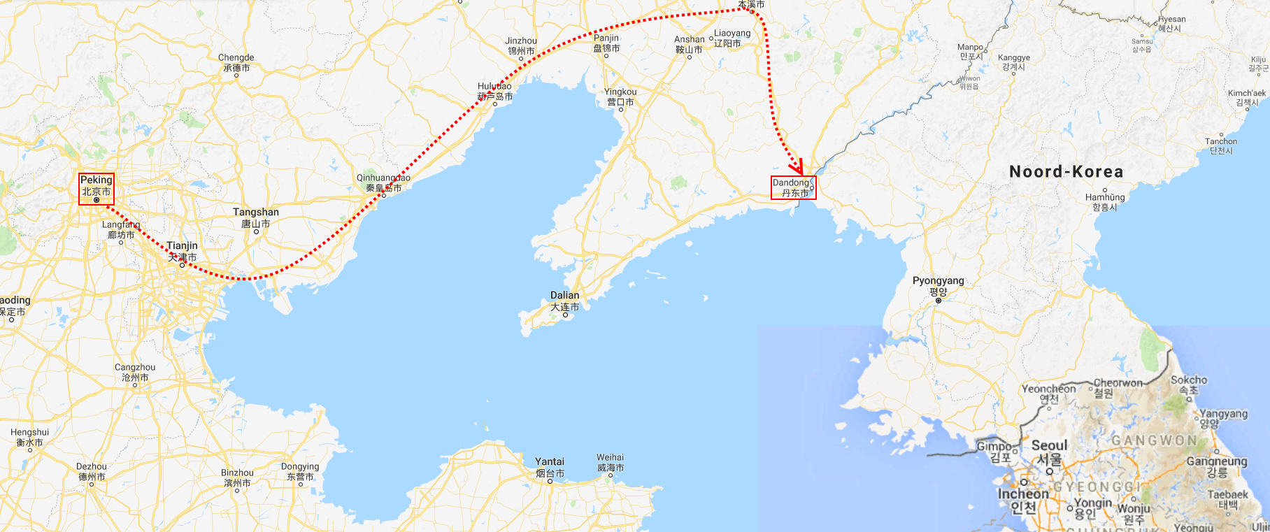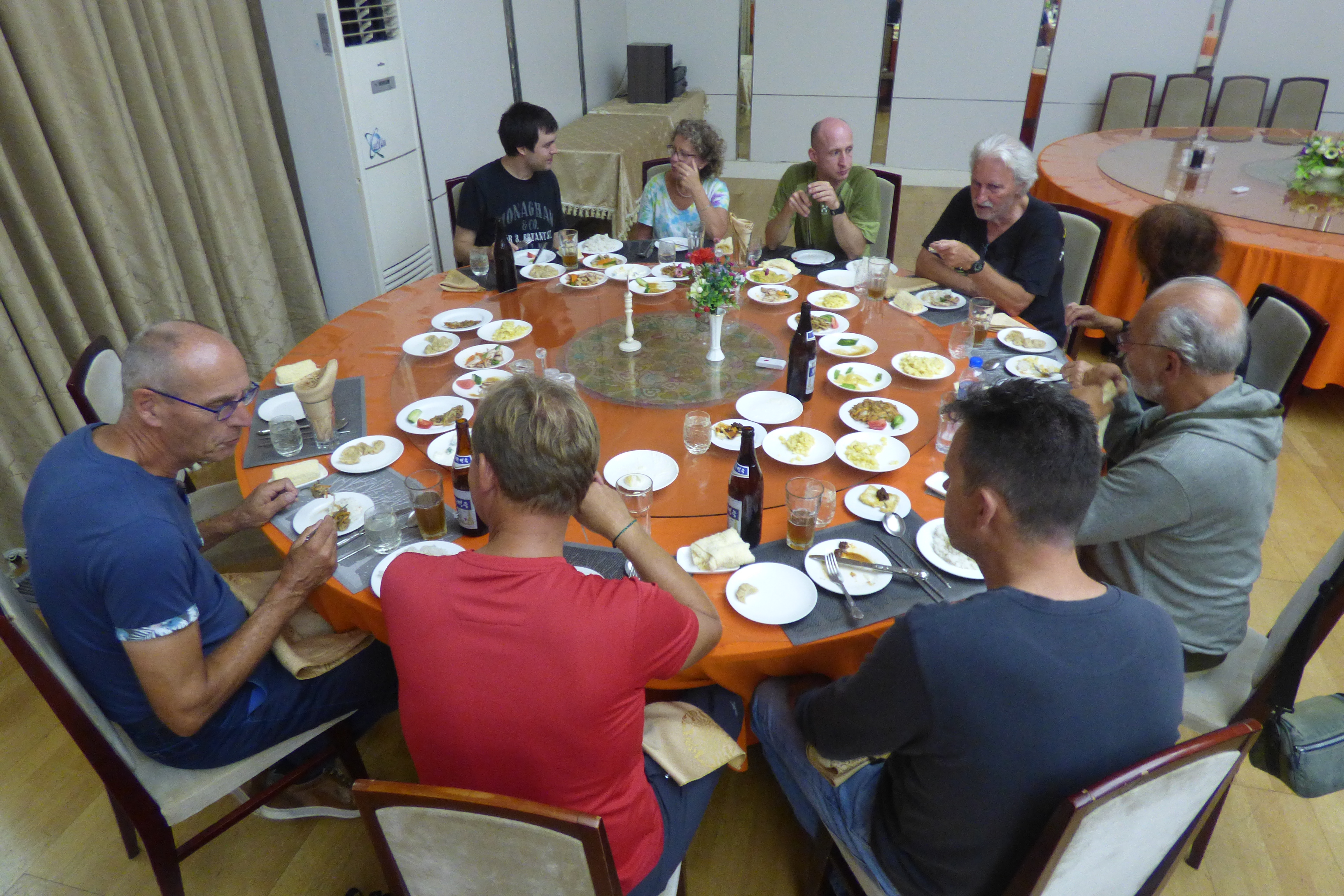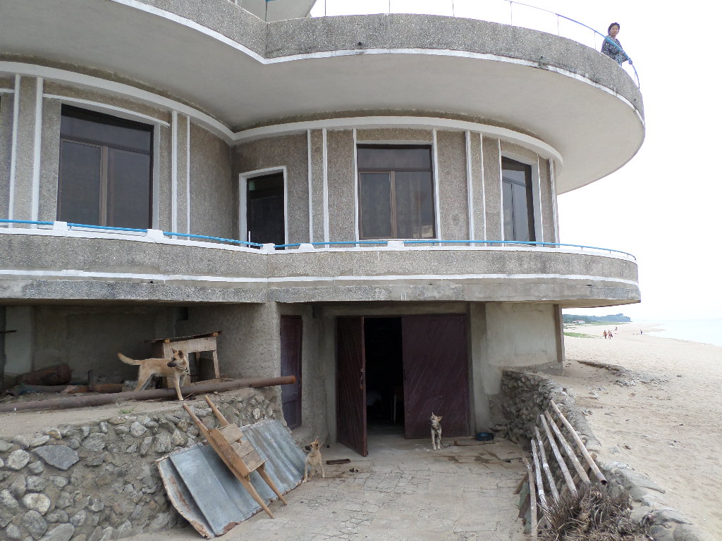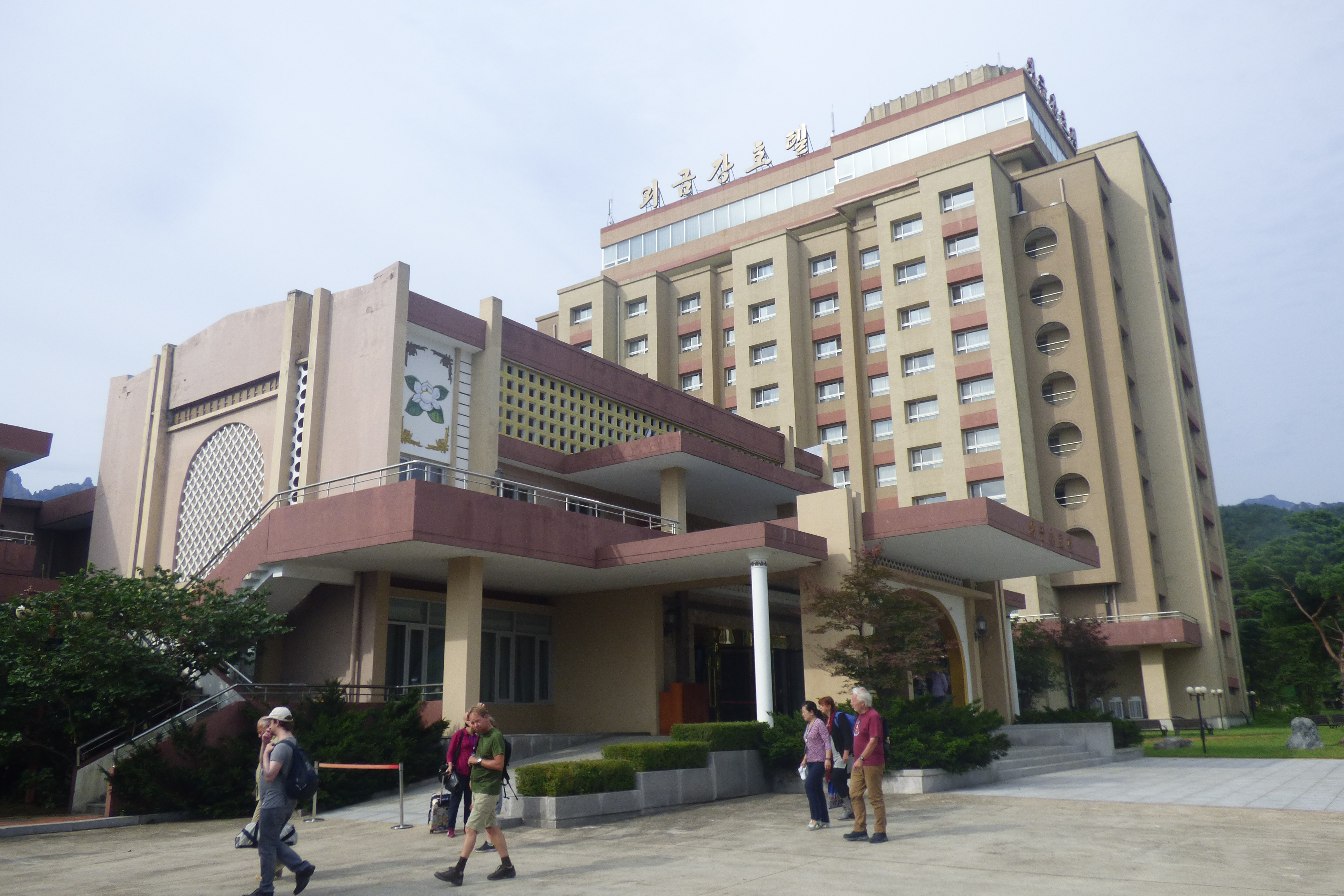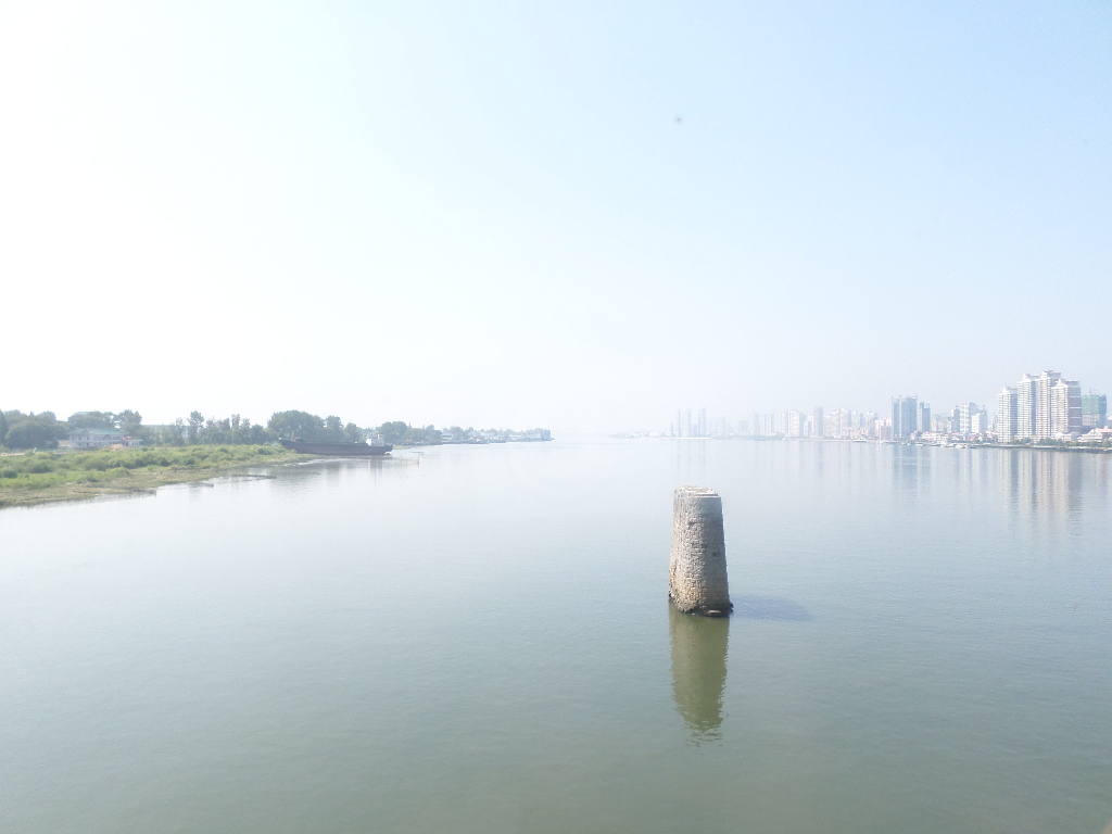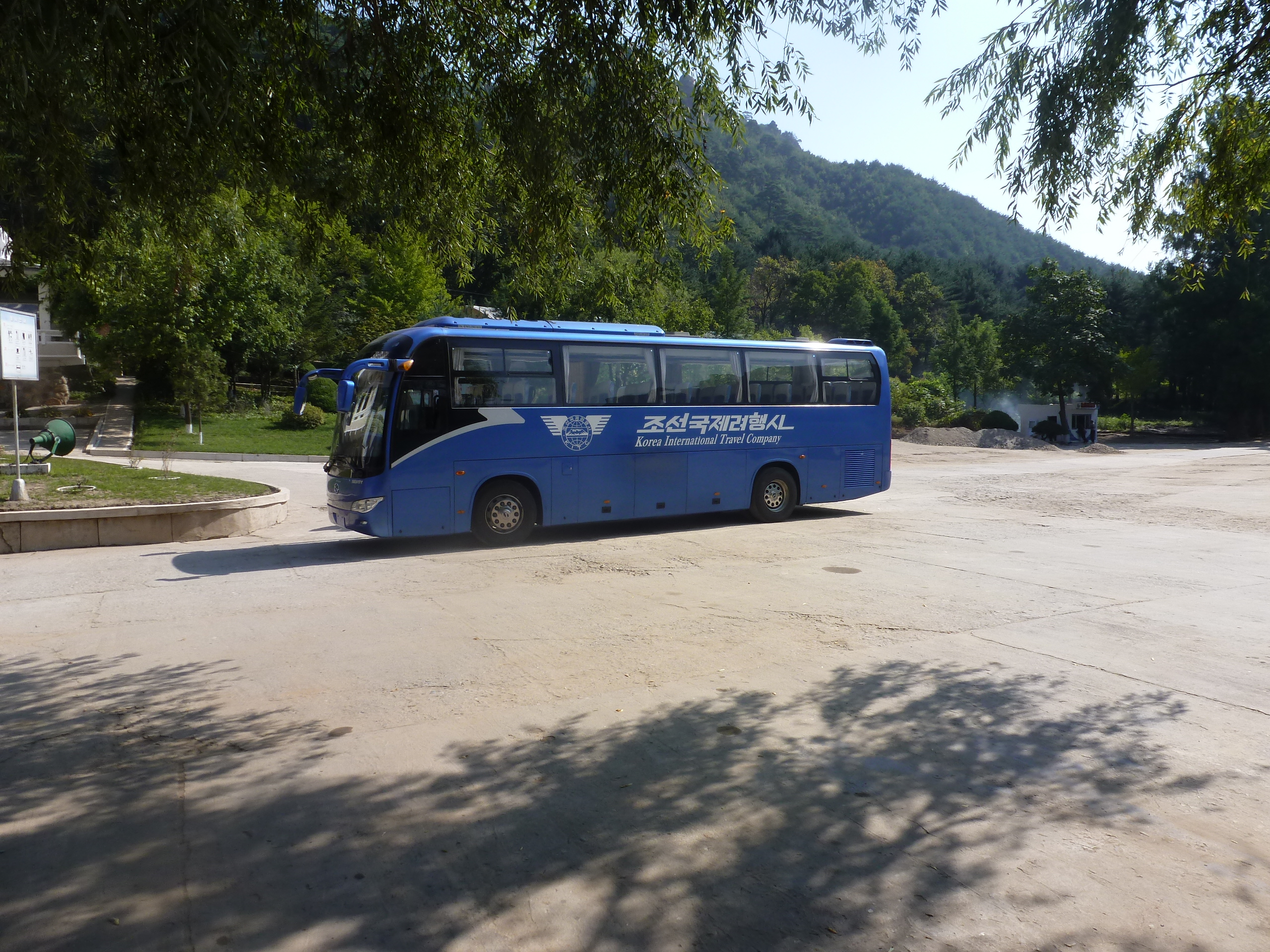 In Peking hebben we enkele uren tijd om ons voor te bereiden op de treinreis richting Noord-Korea. De trein vertrok rond 6u 's avonds. De volgende ochtend komen we aan in Dandong, een Chinese stad die grenst aan Noord-Korea.Het station van PekingDe slaapcabineHet restaurant op de trein. Een deel van het treinpersoneel was er al aan het eten. Ik besloot dan ook maar iets te eten. "Can I have a knife and fork?". "No sowwy". En de chinezen maar lachen.Op dag 3 arriveren we in Dandong, waar we een ontbijt krijgen. De rest van de treinreis wordt verdergezet op een andere trein richting de Noord-Koreaanse hoofdstad Pyongyang.Aankomst in DandongDandongIn de trein over de China-Noord-Korea Vriendschapsbrug. De Yalu rivier die we oversteken maakt een groot deel uit van de grens tussen China en Noord-Korea.Parallel loopt nog een brug, maar deze werd grotendeels vernield tijdens de Koreaanse oorlog.Links: Noord-Korea Rechts: ChinaAl snel verschijnen de portretten van de (overleden) grote leiders Kim Il Sung (links) en Kim Jong Il (rechts). Die zien we overal in Noord-Korea.Langs het platteland zien we vooral rijstvelden.Openbare werkenOnze Nederlandse reisbegeleider Jan is zeer fier op zijn Noord-Koreaanse badge. Deze badges worden door bijna alle Noord-Koreanen gedragen. Als buitenlander kan je deze badge enkel uitgereikt krijgen als je je loyaliteit bewezen hebt.In onze wagon zitten ook enkele Chinese toeristen. De meeste toeristen in Noord-Korea zijn Chinezen.Bij een tussenstop worden we gecontroleerd door Noord-Koreaanse militairen. Alle fototoestellen en telefoons worden geregistreerd, boeken en magazines worden nagekeken. Bagages worden slechts steekproefsgewijs doorgelicht. Onze paspoorten worden ook in beslag genomen. Die krijgen we pas terug op het einde van de reis.De rijstvelden zijn meestal in rechthoekige stukken ingedeeld, met bonenplanten om ze te scheiden.Tegen de avond rijden we Pyongyang binnen. Het volledige treintraject van Peking tot Pyongyang is 1371km lang en deden we ongeveer 24u over.Op dag 4 rijden we met de bus naar de industriestad Hamhung (함흥시). Hier bezoeken we oa. een fabriek van kunstmeststof.Het Yanggakdo International Hotel in Pyongyang waar we deze eerste nacht verbleven. Later keren we hier nog terug.Een tussenstop aan een meer langs het bergachtige landschap.Simon en ikDe bus waar we heel de reis mee rondtrokkenEen fotostop langs het bergachtige landschapDe gidsen vermelden dat zowat driekwart van het land bergen zijn. Omdat de Noord-Koreanen er naar streven om volledig zelfvoorzienend te zijn, wordt bijna alle vlakke grond gebruikt voor landbouw.Aan de linkerkant zie je onze Koreaanse gidsen. Meestal spreken Koreanen elkaar aan met hun volledige naam, maar gemakkelijkheidshalve mochten wij ze aanspreken als miss Kim (links) en miss Ha (rechts).Even dalen we af om een waterval te bezoeken. We picknicken hier in de buurt.De waterval zou in 2001 ontdekt zijn door Kim Jong Il, dankzij zijn fantastisch gehoor.BronwaterDit was een van de weinige maaltijden die ik volledig op kreeg. Op de bus krijgen we dan te horen dat de lunchschotels achtergelaten werden voor kinderen die de overschot zouden eten...De meeste wegen bestaan uit betonplaten.Een propagandabord langs de wegWe komen aan in Hamhung, de tweede grootste stad van Noord-Korea (~ 800.000 inwoners). We rijden hier voorbij een van de talrijke mozaïeken die we te zien zullen krijgen. Links: Kim Il Sung Midden: Kim Jong Il Rechts: Kim Jong Suk (de eerste vrouw van Kim Il Sung)Hamhung is nog maar enkele jaren "open" voor toeristen.Een fabriek van kunstmeststofBij elke bezienswaardigheid krijgen we te horen hoe vaak en wanneer juist de grote leiders die plaats bezocht hebben. Vaak zijn er mozaïeken die hun bezoek afbeelden.Binnen in de fabriekEr zijn maar weinig fabriekswerkers aanwezig, maar ze poseren wel graag voor een foto.'s avonds verblijven we in het Majon Tourist Resort aan de Oost-Koreaanse zee. Hier nemen we een frisse duik in het water.De huisjes waar we verblijven zijn vlak aan het strand.Onze zwembroeken buiten gehangen, maar echt droog werden ze niet door het vochtige klimaat.Het avondmaal. Zoals gewoonlijk werden er nog voortdurend bordjes bij gezet. Als je al vol zit krijg je dan nog een kom rijst en soep.'s middags en 's avonds was er als drank meestal plat water en bier, met de mogelijkheid om "juice" te drinken in plaats van bier. Dat was een soort appel/peren sap (niet op de foto).Onze kamerHier was geen stromend water, en diende het bad als waterreservoir. Wassen moest "op z'n Bangladesh" door een teiltje water over je gieten. In de rode emmer kon water elektrisch verwarmd worden.Op dag 5 bezoeken we nog enkele plaatsen in Hamhung, en vertrekken dan richting Mt. Kumgang. Onderweg bezoeken we oa. nog de kuststad Wonsan.Het huis van de voormalige koning Taejo van Joseon in Hamhung. Hij richtte de Koreaanse Joseondynastie op in 1392, die eindigde in 1897.Een zeer oude boomBuiten het huis stond een groep Koreaanse studenten te wachten.Een aangelegde (niet natuurlijke) heuvel met grote bronzen beelden van de leidersDe lokale gids die ons een woordje uitleg gaf. De plaatselijke gidsen spraken meestal Koreaans, dat dan naar Engels vertaald werd door onze gids miss Kim.Hamhung Grand TheatreWonsanDit verkeersbord leek met de hand geschilderd te zijn.Bezoek aan een de Chonsam coöperatieve boerderijEen persimmon boomOok de grote leiders zijn hier geweest.In het winkeltje van de boerderij kochten we enkele gedroogde persimmons.Naast de boerderij was er een kleuterschool. De kinderen zongen een liedje en wuifden ons dan uit.Iets verderop bezoeken we nog het huis van de boerin die ons begeleidde.Dit huis heeft een soort vloerverwarming die hier vaak toegepast zou worden. Op internet vond ik dit systeem terug als "Ondol".Wat voor een decoder is dat onder de TV? Telenet of Belgacom?Ten slotte bezochten we nog een boeddhistische tempel...Maar bij de tempel zelf mochten we niet komen, omdat er constructi