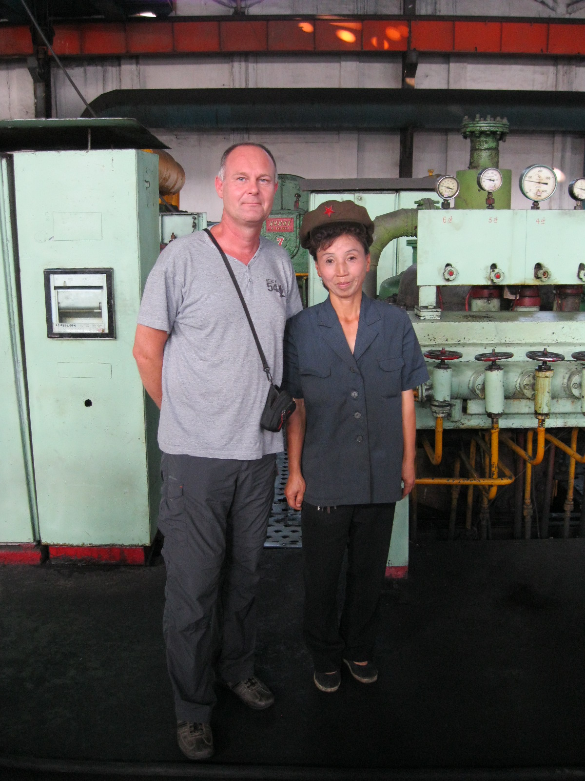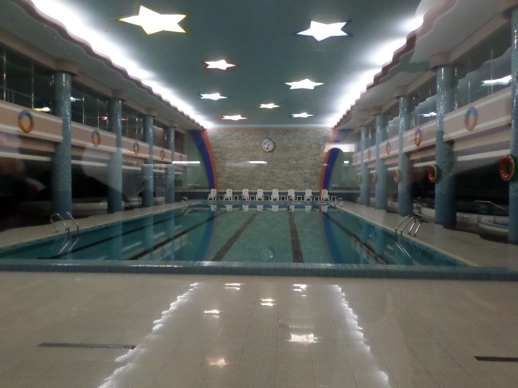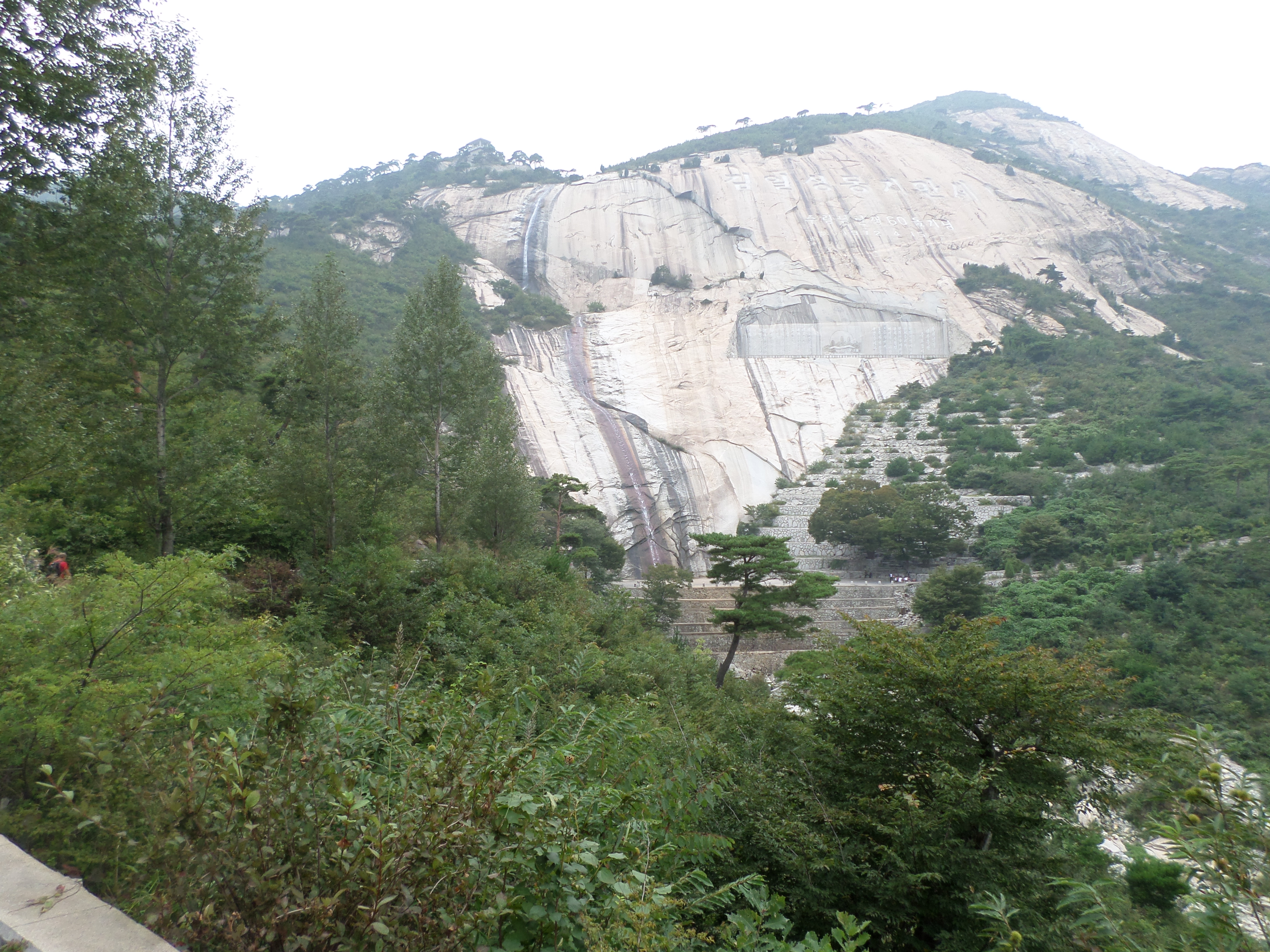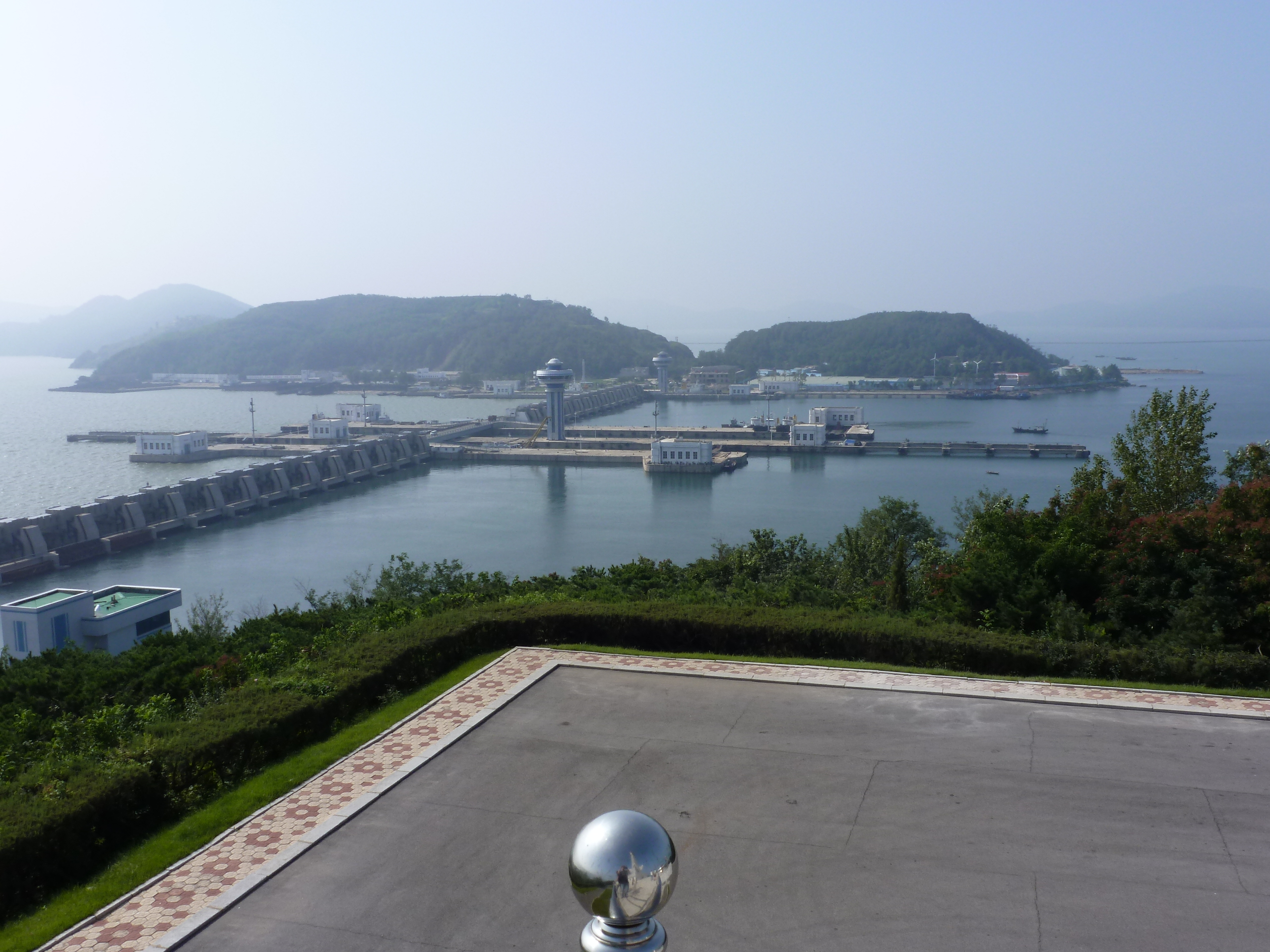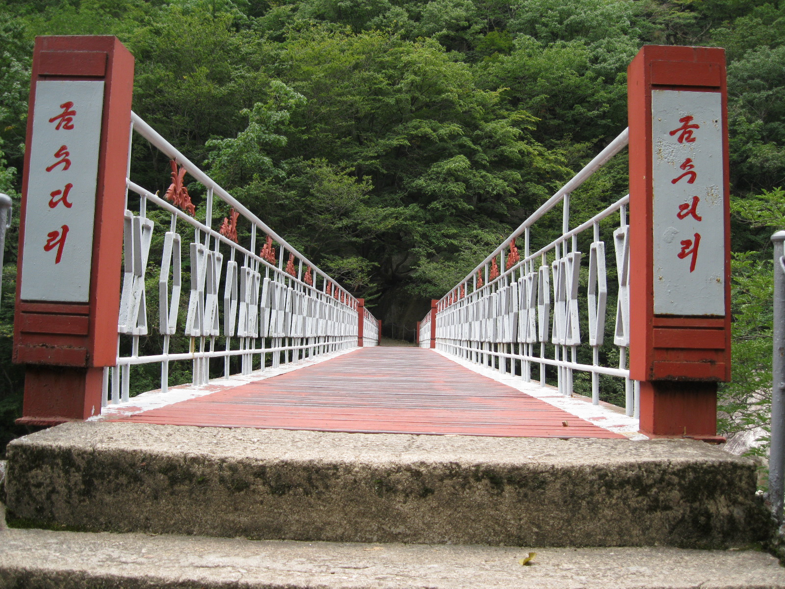 In Peking hebben we enkele uren tijd om ons voor te bereiden op de treinreis richting Noord-Korea. De trein vertrok rond 6u 's avonds. De volgende ochtend komen we aan in Dandong, een Chinese stad die grenst aan Noord-Korea.Het station van PekingDe slaapcabineHet restaurant op de trein. Een deel van het treinpersoneel was er al aan het eten. Ik besloot dan ook maar iets te eten. "Can I have a knife and fork?". "No sowwy". En de chinezen maar lachen.Op dag 3 arriveren we in Dandong, waar we een ontbijt krijgen. De rest van de treinreis wordt verdergezet op een andere trein richting de Noord-Koreaanse hoofdstad Pyongyang.Aankomst in DandongDandongIn de trein over de China-Noord-Korea Vriendschapsbrug. De Yalu rivier die we oversteken maakt een groot deel uit van de grens tussen China en Noord-Korea.Parallel loopt nog een brug, maar deze werd grotendeels vernield tijdens de Koreaanse oorlog.Links: Noord-Korea Rechts: ChinaAl snel verschijnen de portretten van de (overleden) grote leiders Kim Il Sung (links) en Kim Jong Il (rechts). Die zien we overal in Noord-Korea.Langs het platteland zien we vooral rijstvelden.Openbare werkenOnze Nederlandse reisbegeleider Jan is zeer fier op zijn Noord-Koreaanse badge. Deze badges worden door bijna alle Noord-Koreanen gedragen. Als buitenlander kan je deze badge enkel uitgereikt krijgen als je je loyaliteit bewezen hebt.In onze wagon zitten ook enkele Chinese toeristen. De meeste toeristen in Noord-Korea zijn Chinezen.Bij een tussenstop worden we gecontroleerd door Noord-Koreaanse militairen. Alle fototoestellen en telefoons worden geregistreerd, boeken en magazines worden nagekeken. Bagages worden slechts steekproefsgewijs doorgelicht. Onze paspoorten worden ook in beslag genomen. Die krijgen we pas terug op het einde van de reis.De rijstvelden zijn meestal in rechthoekige stukken ingedeeld, met bonenplanten om ze te scheiden.Tegen de avond rijden we Pyongyang binnen. Het volledige treintraject van Peking tot Pyongyang is 1371km lang en deden we ongeveer 24u over.Op dag 4 rijden we met de bus naar de industriestad Hamhung (함흥시). Hier bezoeken we oa. een fabriek van kunstmeststof.Het Yanggakdo International Hotel in Pyongyang waar we deze eerste nacht verbleven. Later keren we hier nog terug.Een tussenstop aan een meer langs het bergachtige landschap.Simon en ikDe bus waar we heel de reis mee rondtrokkenEen fotostop langs het bergachtige landschapDe gidsen vermelden dat zowat driekwart van het land bergen zijn. Omdat de Noord-Koreanen er naar streven om volledig zelfvoorzienend te zijn, wordt bijna alle vlakke grond gebruikt voor landbouw.Aan de linkerkant zie je onze Koreaanse gidsen. Meestal spreken Koreanen elkaar aan met hun volledige naam, maar gemakkelijkheidshalve mochten wij ze aanspreken als miss Kim (links) en miss Ha (rechts).Even dalen we af om een waterval te bezoeken. We picknicken hier in de buurt.De waterval zou in 2001 ontdekt zijn door Kim Jong Il, dankzij zijn fantastisch gehoor.BronwaterDit was een van de weinige maaltijden die ik volledig op kreeg. Op de bus krijgen we dan te horen dat de lunchschotels achtergelaten werden voor kinderen die de overschot zouden eten...De meeste wegen bestaan uit betonplaten.Een propagandabord langs de wegWe komen aan in Hamhung, de tweede grootste stad van Noord-Korea (~ 800.000 inwoners). We rijden hier voorbij een van de talrijke mozaïeken die we te zien zullen krijgen. Links: Kim Il Sung Midden: Kim Jong Il Rechts: Kim Jong Suk (de eerste vrouw van Kim Il Sung)Hamhung is nog maar enkele jaren "open" voor toeristen.Een fabriek van kunstmeststofBij elke bezienswaardigheid krijgen we te horen hoe vaak en wanneer juist de grote leiders die plaats bezocht hebben. Vaak zijn er mozaïeken die hun bezoek afbeelden.Binnen in de fabriekEr zijn maar weinig fabriekswerkers aanwezig, maar ze poseren wel graag voor een foto.'s avonds verblijven we in het Majon Tourist Resort aan de Oost-Koreaanse zee. Hier nemen we een frisse duik in het water.De huisjes waar we verblijven zijn vlak aan het strand.Onze zwembroeken buiten gehangen, maar echt droog werden ze niet door het vochtige klimaat.Het avondmaal. Zoals gewoonlijk werden er nog voortdurend bordjes bij gezet. Als je al vol zit krijg je dan nog een kom rijst en soep.'s middags en 's avonds was er als drank meestal plat water en bier, met de mogelijkheid om "juice" te drinken in plaats van bier. Dat was een soort appel/peren sap (niet op de foto).Onze kamerHier was geen stromend water, en diende het bad als waterreservoir. Wassen moest "op z'n Bangladesh" door een teiltje water over je gieten. In de rode emmer kon water elektrisch verwarmd worden.Op dag 5 bezoeken we nog enkele plaatsen in Hamhung, en vertrekken dan richting Mt. Kumgang. Onderweg bezoeken we oa. nog de kuststad Wonsan.Het huis van de voormalige koning Taejo van Joseon in Hamhung. Hij richtte de Koreaanse Joseondynastie op in 1392, die eindigde in 1897.Een zeer oude boomBuiten het huis stond een groep Koreaanse studenten te wachten.Een aangelegde (niet natuurlijke) heuvel met grote bronzen beelden van de leidersDe lokale gids die ons een woordje uitleg gaf. De plaatselijke gidsen spraken meestal Koreaans, dat dan naar Engels vertaald werd door onze gids miss Kim.Hamhung Grand TheatreWonsanDit verkeersbord leek met de hand geschilderd te zijn.Bezoek aan een de Chonsam coöperatieve boerderijEen persimmon boomOok de grote leiders zijn hier geweest.In het winkeltje van de boerderij kochten we enkele gedroogde persimmons.Naast de boerderij was er een kleuterschool. De kinderen zongen een liedje en wuifden ons dan uit.Iets verderop bezoeken we nog het huis van de boerin die ons begeleidde.Dit huis heeft een soort vloerverwarming die hier vaak toegepast zou worden. Op internet vond ik dit systeem terug als "Ondol".Wat voor een decoder is dat onder de TV? Telenet of Belgacom?Ten slotte bezochten we nog een boeddhistische tempel...Maar bij de tempel zelf mochten we niet komen, omdat er constructi