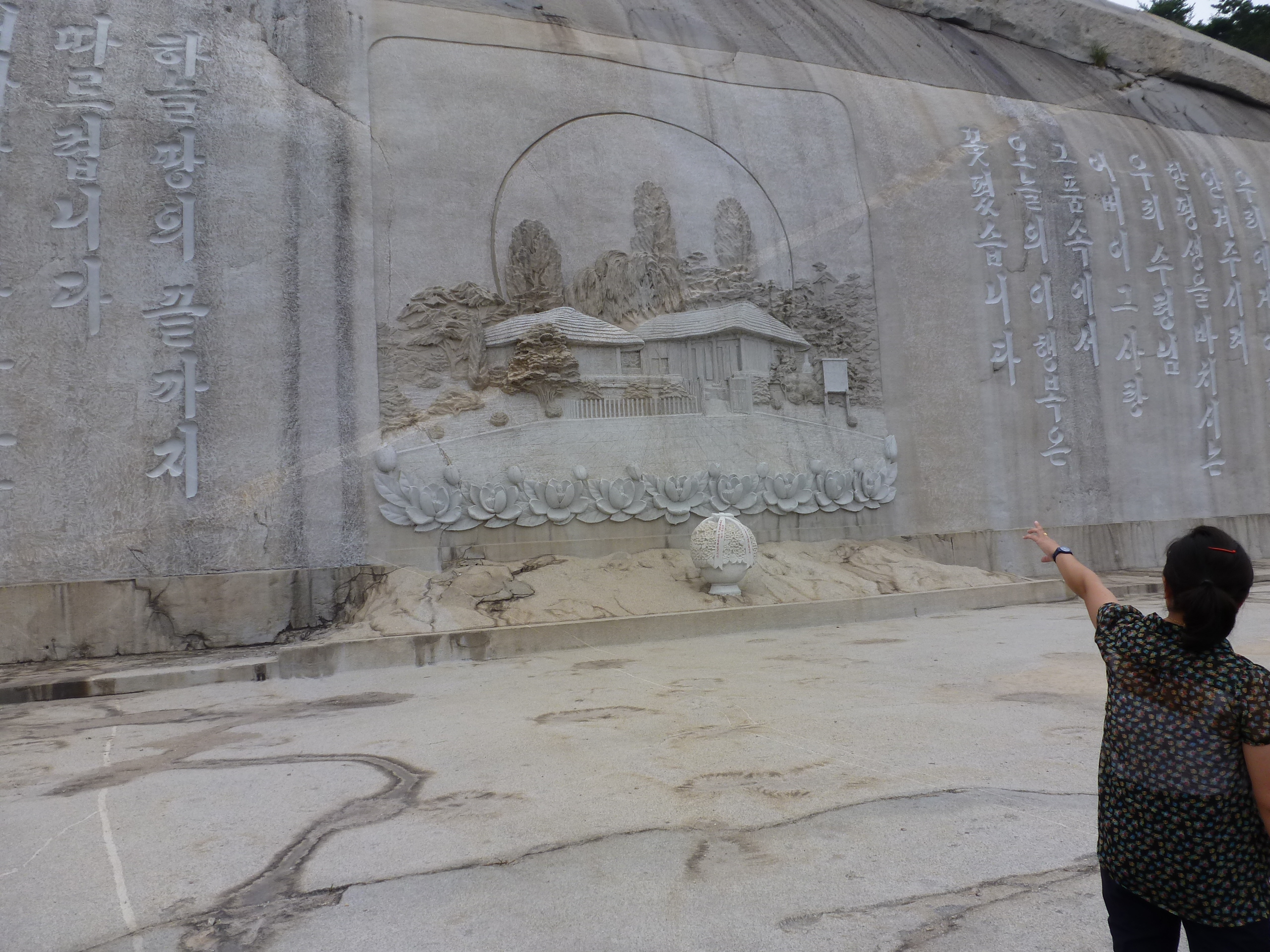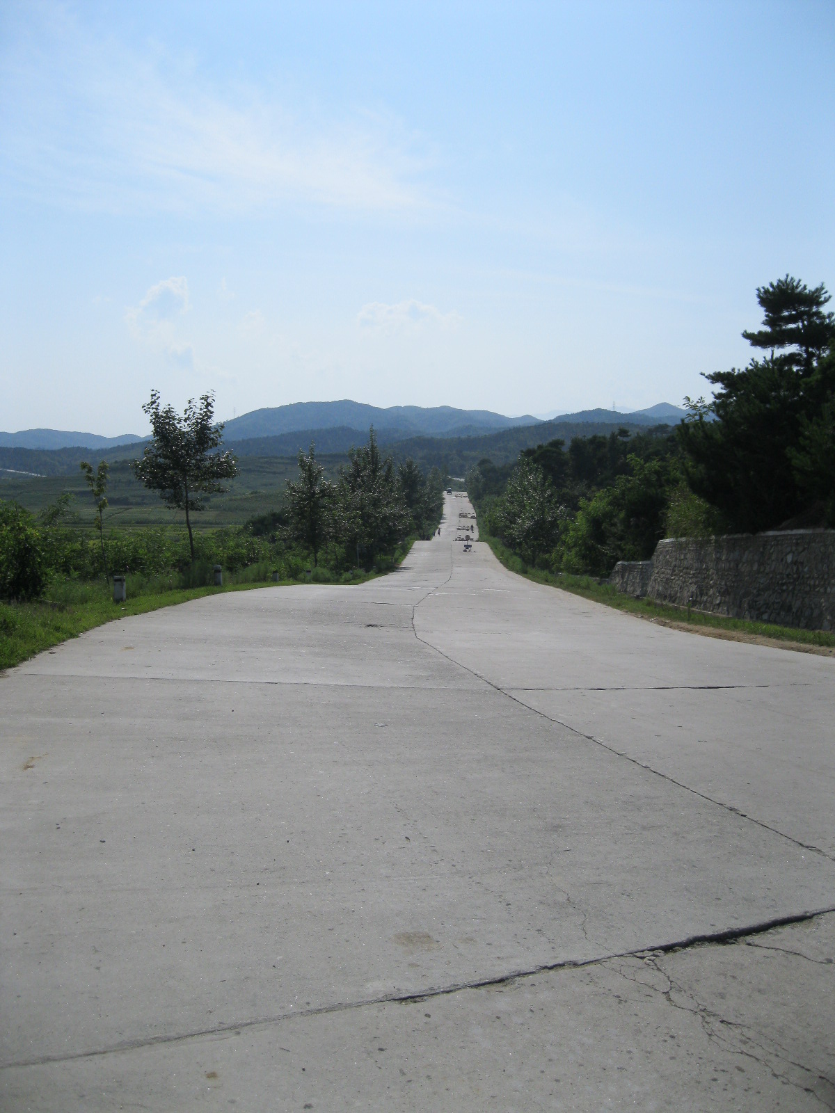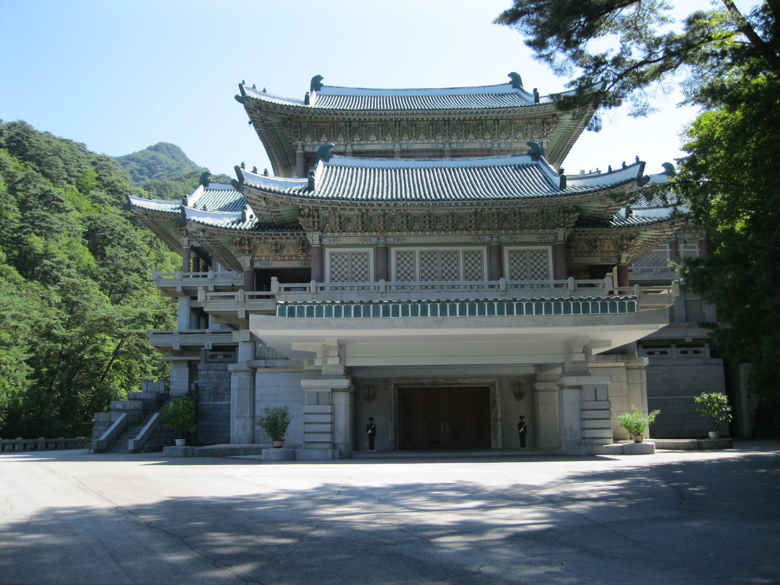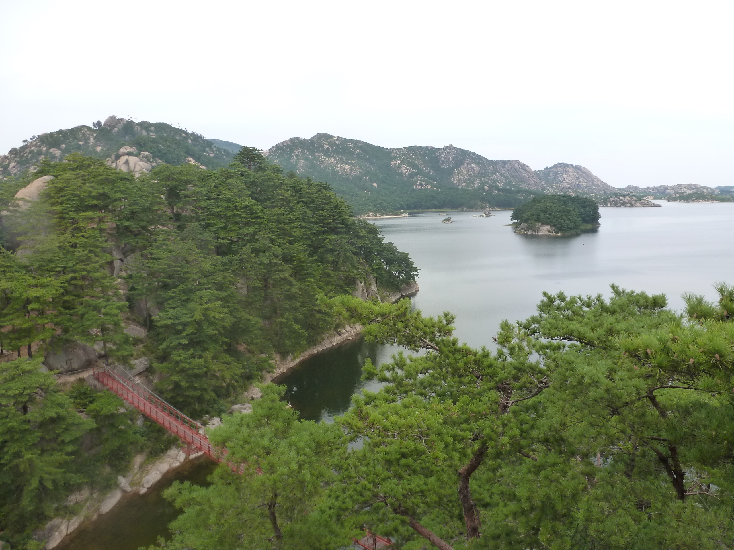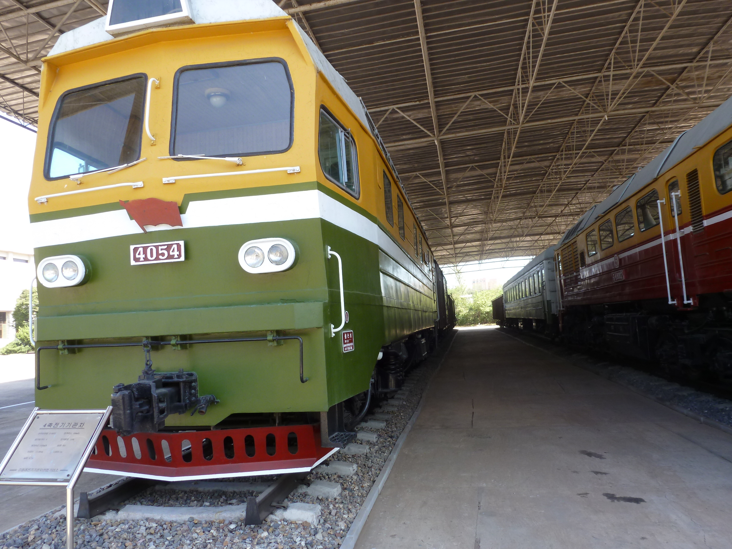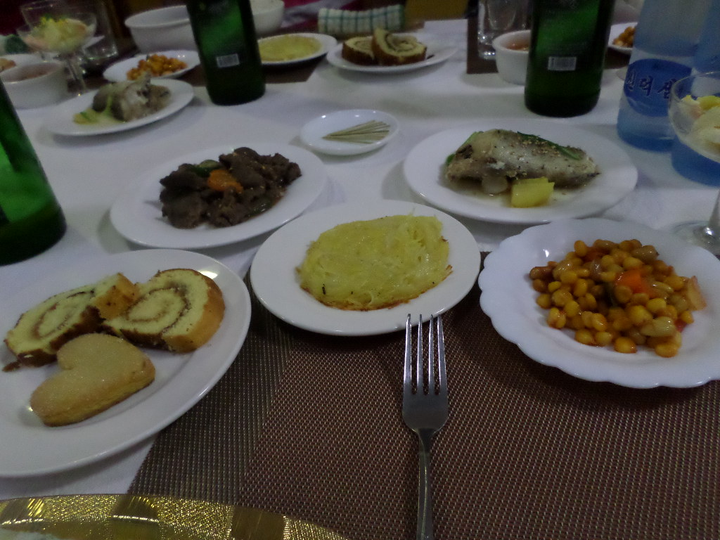 In Peking hebben we enkele uren tijd om ons voor te bereiden op de treinreis richting Noord-Korea. De trein vertrok rond 6u 's avonds. De volgende ochtend komen we aan in Dandong, een Chinese stad die grenst aan Noord-Korea.Het station van PekingDe slaapcabineHet restaurant op de trein. Een deel van het treinpersoneel was er al aan het eten. Ik besloot dan ook maar iets te eten. "Can I have a knife and fork?". "No sowwy". En de chinezen maar lachen.Op dag 3 arriveren we in Dandong, waar we een ontbijt krijgen. De rest van de treinreis wordt verdergezet op een andere trein richting de Noord-Koreaanse hoofdstad Pyongyang.Aankomst in DandongDandongIn de trein over de China-Noord-Korea Vriendschapsbrug. De Yalu rivier die we oversteken maakt een groot deel uit van de grens tussen China en Noord-Korea.Parallel loopt nog een brug, maar deze werd grotendeels vernield tijdens de Koreaanse oorlog.Links: Noord-Korea Rechts: ChinaAl snel verschijnen de portretten van de (overleden) grote leiders Kim Il Sung (links) en Kim Jong Il (rechts). Die zien we overal in Noord-Korea.Langs het platteland zien we vooral rijstvelden.Openbare werkenOnze Nederlandse reisbegeleider Jan is zeer fier op zijn Noord-Koreaanse badge. Deze badges worden door bijna alle Noord-Koreanen gedragen. Als buitenlander kan je deze badge enkel uitgereikt krijgen als je je loyaliteit bewezen hebt.In onze wagon zitten ook enkele Chinese toeristen. De meeste toeristen in Noord-Korea zijn Chinezen.Bij een tussenstop worden we gecontroleerd door Noord-Koreaanse militairen. Alle fototoestellen en telefoons worden geregistreerd, boeken en magazines worden nagekeken. Bagages worden slechts steekproefsgewijs doorgelicht. Onze paspoorten worden ook in beslag genomen. Die krijgen we pas terug op het einde van de reis.De rijstvelden zijn meestal in rechthoekige stukken ingedeeld, met bonenplanten om ze te scheiden.Tegen de avond rijden we Pyongyang binnen. Het volledige treintraject van Peking tot Pyongyang is 1371km lang en deden we ongeveer 24u over.Op dag 4 rijden we met de bus naar de industriestad Hamhung (함흥시). Hier bezoeken we oa. een fabriek van kunstmeststof.Het Yanggakdo International Hotel in Pyongyang waar we deze eerste nacht verbleven. Later keren we hier nog terug.Een tussenstop aan een meer langs het bergachtige landschap.Simon en ikDe bus waar we heel de reis mee rondtrokkenEen fotostop langs het bergachtige landschapDe gidsen vermelden dat zowat driekwart van het land bergen zijn. Omdat de Noord-Koreanen er naar streven om volledig zelfvoorzienend te zijn, wordt bijna alle vlakke grond gebruikt voor landbouw.Aan de linkerkant zie je onze Koreaanse gidsen. Meestal spreken Koreanen elkaar aan met hun volledige naam, maar gemakkelijkheidshalve mochten wij ze aanspreken als miss Kim (links) en miss Ha (rechts).Even dalen we af om een waterval te bezoeken. We picknicken hier in de buurt.De waterval zou in 2001 ontdekt zijn door Kim Jong Il, dankzij zijn fantastisch gehoor.BronwaterDit was een van de weinige maaltijden die ik volledig op kreeg. Op de bus krijgen we dan te horen dat de lunchschotels achtergelaten werden voor kinderen die de overschot zouden eten...De meeste wegen bestaan uit betonplaten.Een propagandabord langs de wegWe komen aan in Hamhung, de tweede grootste stad van Noord-Korea (~ 800.000 inwoners). We rijden hier voorbij een van de talrijke mozaïeken die we te zien zullen krijgen. Links: Kim Il Sung Midden: Kim Jong Il Rechts: Kim Jong Suk (de eerste vrouw van Kim Il Sung)Hamhung is nog maar enkele jaren "open" voor toeristen.Een fabriek van kunstmeststofBij elke bezienswaardigheid krijgen we te horen hoe vaak en wanneer juist de grote leiders die plaats bezocht hebben. Vaak zijn er mozaïeken die hun bezoek afbeelden.Binnen in de fabriekEr zijn maar weinig fabriekswerkers aanwezig, maar ze poseren wel graag voor een foto.'s avonds verblijven we in het Majon Tourist Resort aan de Oost-Koreaanse zee. Hier nemen we een frisse duik in het water.De huisjes waar we verblijven zijn vlak aan het strand.Onze zwembroeken buiten gehangen, maar echt droog werden ze niet door het vochtige klimaat.Het avondmaal. Zoals gewoonlijk werden er nog voortdurend bordjes bij gezet. Als je al vol zit krijg je dan nog een kom rijst en soep.'s middags en 's avonds was er als drank meestal plat water en bier, met de mogelijkheid om "juice" te drinken in plaats van bier. Dat was een soort appel/peren sap (niet op de foto).Onze kamerHier was geen stromend water, en diende het bad als waterreservoir. Wassen moest "op z'n Bangladesh" door een teiltje water over je gieten. In de rode emmer kon water elektrisch verwarmd worden.Op dag 5 bezoeken we nog enkele plaatsen in Hamhung, en vertrekken dan richting Mt. Kumgang. Onderweg bezoeken we oa. nog de kuststad Wonsan.Het huis van de voormalige koning Taejo van Joseon in Hamhung. Hij richtte de Koreaanse Joseondynastie op in 1392, die eindigde in 1897.Een zeer oude boomBuiten het huis stond een groep Koreaanse studenten te wachten.Een aangelegde (niet natuurlijke) heuvel met grote bronzen beelden van de leidersDe lokale gids die ons een woordje uitleg gaf. De plaatselijke gidsen spraken meestal Koreaans, dat dan naar Engels vertaald werd door onze gids miss Kim.Hamhung Grand TheatreWonsanDit verkeersbord leek met de hand geschilderd te zijn.Bezoek aan een de Chonsam coöperatieve boerderijEen persimmon boomOok de grote leiders zijn hier geweest.In het winkeltje van de boerderij kochten we enkele gedroogde persimmons.Naast de boerderij was er een kleuterschool. De kinderen zongen een liedje en wuifden ons dan uit.Iets verderop bezoeken we nog het huis van de boerin die ons begeleidde.Dit huis heeft een soort vloerverwarming die hier vaak toegepast zou worden. Op internet vond ik dit systeem terug als "Ondol".Wat voor een decoder is dat onder de TV? Telenet of Belgacom?Ten slotte bezochten we nog een boeddhistische tempel...Maar bij de tempel zelf mochten we niet komen, omdat er constructi