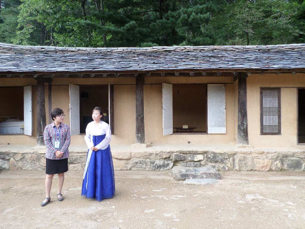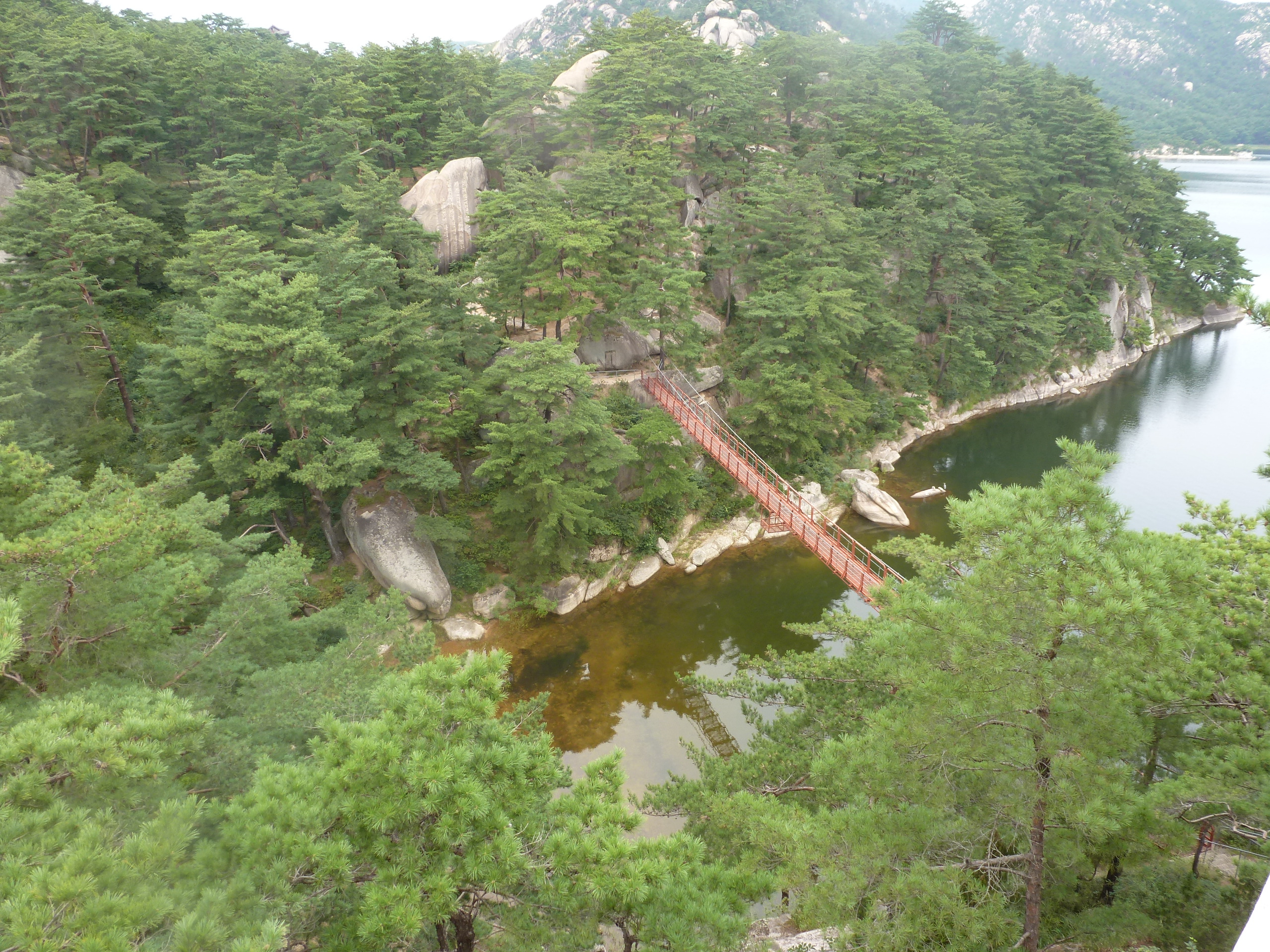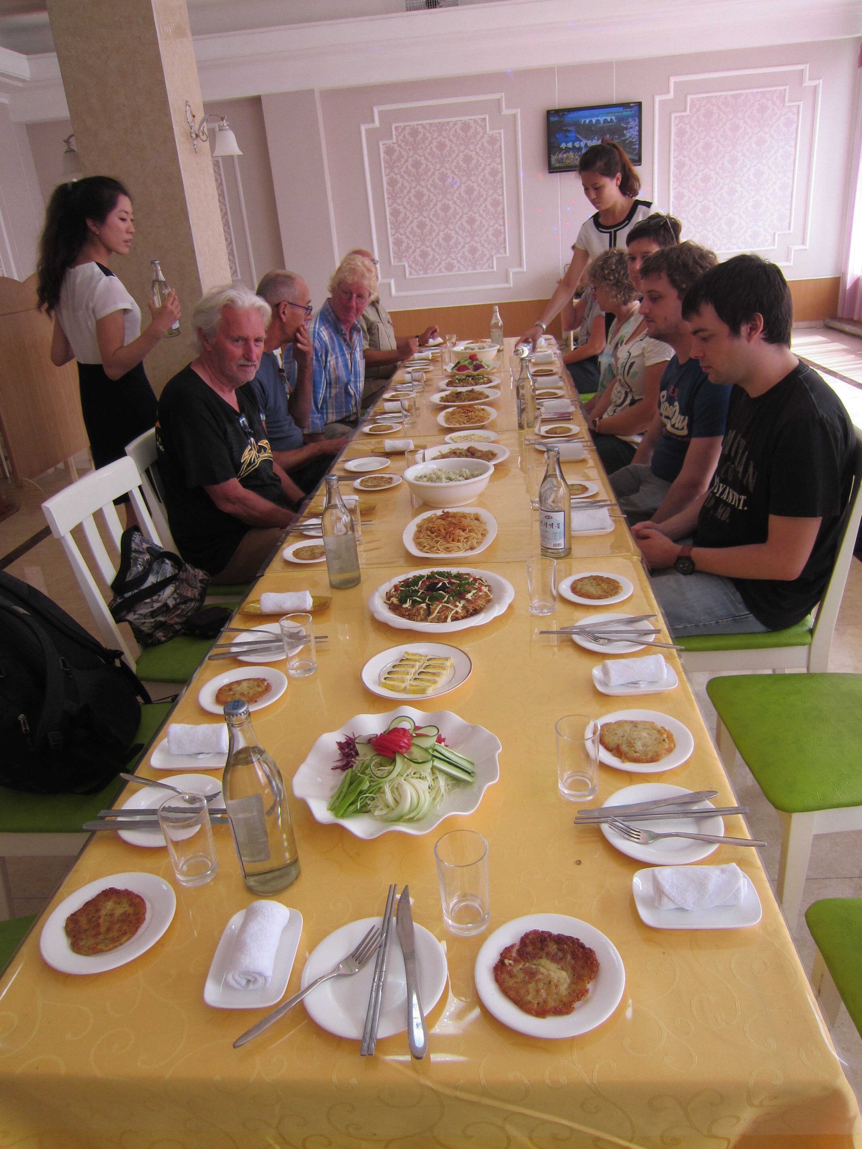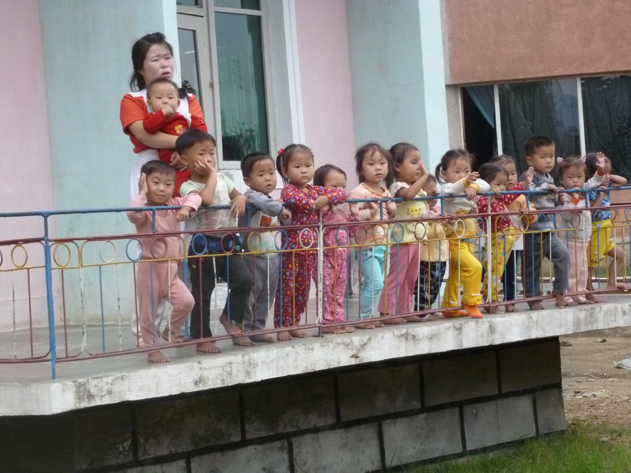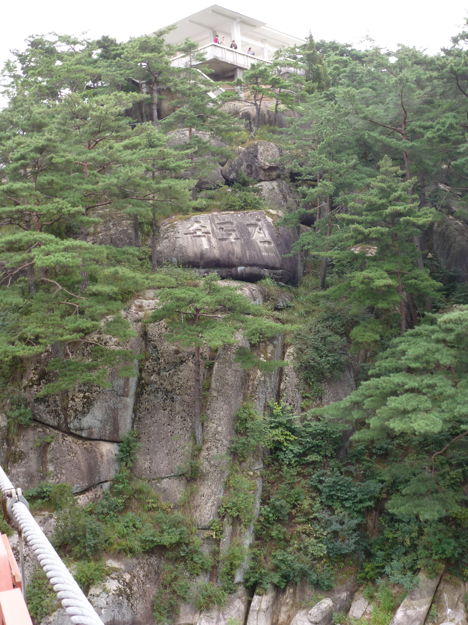 In Peking hebben we enkele uren tijd om ons voor te bereiden op de treinreis richting Noord-Korea. De trein vertrok rond 6u 's avonds. De volgende ochtend komen we aan in Dandong, een Chinese stad die grenst aan Noord-Korea.Het station van PekingDe slaapcabineHet restaurant op de trein. Een deel van het treinpersoneel was er al aan het eten. Ik besloot dan ook maar iets te eten. "Can I have a knife and fork?". "No sowwy". En de chinezen maar lachen.Op dag 3 arriveren we in Dandong, waar we een ontbijt krijgen. De rest van de treinreis wordt verdergezet op een andere trein richting de Noord-Koreaanse hoofdstad Pyongyang.Aankomst in DandongDandongIn de trein over de China-Noord-Korea Vriendschapsbrug. De Yalu rivier die we oversteken maakt een groot deel uit van de grens tussen China en Noord-Korea.Parallel loopt nog een brug, maar deze werd grotendeels vernield tijdens de Koreaanse oorlog.Links: Noord-Korea Rechts: ChinaAl snel verschijnen de portretten van de (overleden) grote leiders Kim Il Sung (links) en Kim Jong Il (rechts). Die zien we overal in Noord-Korea.Langs het platteland zien we vooral rijstvelden.Openbare werkenOnze Nederlandse reisbegeleider Jan is zeer fier op zijn Noord-Koreaanse badge. Deze badges worden door bijna alle Noord-Koreanen gedragen. Als buitenlander kan je deze badge enkel uitgereikt krijgen als je je loyaliteit bewezen hebt.In onze wagon zitten ook enkele Chinese toeristen. De meeste toeristen in Noord-Korea zijn Chinezen.Bij een tussenstop worden we gecontroleerd door Noord-Koreaanse militairen. Alle fototoestellen en telefoons worden geregistreerd, boeken en magazines worden nagekeken. Bagages worden slechts steekproefsgewijs doorgelicht. Onze paspoorten worden ook in beslag genomen. Die krijgen we pas terug op het einde van de reis.De rijstvelden zijn meestal in rechthoekige stukken ingedeeld, met bonenplanten om ze te scheiden.Tegen de avond rijden we Pyongyang binnen. Het volledige treintraject van Peking tot Pyongyang is 1371km lang en deden we ongeveer 24u over.Op dag 4 rijden we met de bus naar de industriestad Hamhung (함흥시). Hier bezoeken we oa. een fabriek van kunstmeststof.Het Yanggakdo International Hotel in Pyongyang waar we deze eerste nacht verbleven. Later keren we hier nog terug.Een tussenstop aan een meer langs het bergachtige landschap.Simon en ikDe bus waar we heel de reis mee rondtrokkenEen fotostop langs het bergachtige landschapDe gidsen vermelden dat zowat driekwart van het land bergen zijn. Omdat de Noord-Koreanen er naar streven om volledig zelfvoorzienend te zijn, wordt bijna alle vlakke grond gebruikt voor landbouw.Aan de linkerkant zie je onze Koreaanse gidsen. Meestal spreken Koreanen elkaar aan met hun volledige naam, maar gemakkelijkheidshalve mochten wij ze aanspreken als miss Kim (links) en miss Ha (rechts).Even dalen we af om een waterval te bezoeken. We picknicken hier in de buurt.De waterval zou in 2001 ontdekt zijn door Kim Jong Il, dankzij zijn fantastisch gehoor.BronwaterDit was een van de weinige maaltijden die ik volledig op kreeg. Op de bus krijgen we dan te horen dat de lunchschotels achtergelaten werden voor kinderen die de overschot zouden eten...De meeste wegen bestaan uit betonplaten.Een propagandabord langs de wegWe komen aan in Hamhung, de tweede grootste stad van Noord-Korea (~ 800.000 inwoners). We rijden hier voorbij een van de talrijke mozaïeken die we te zien zullen krijgen. Links: Kim Il Sung Midden: Kim Jong Il Rechts: Kim Jong Suk (de eerste vrouw van Kim Il Sung)Hamhung is nog maar enkele jaren "open" voor toeristen.Een fabriek van kunstmeststofBij elke bezienswaardigheid krijgen we te horen hoe vaak en wanneer juist de grote leiders die plaats bezocht hebben. Vaak zijn er mozaïeken die hun bezoek afbeelden.Binnen in de fabriekEr zijn maar weinig fabriekswerkers aanwezig, maar ze poseren wel graag voor een foto.'s avonds verblijven we in het Majon Tourist Resort aan de Oost-Koreaanse zee. Hier nemen we een frisse duik in het water.De huisjes waar we verblijven zijn vlak aan het strand.Onze zwembroeken buiten gehangen, maar echt droog werden ze niet door het vochtige klimaat.Het avondmaal. Zoals gewoonlijk werden er nog voortdurend bordjes bij gezet. Als je al vol zit krijg je dan nog een kom rijst en soep.'s middags en 's avonds was er als drank meestal plat water en bier, met de mogelijkheid om "juice" te drinken in plaats van bier. Dat was een soort appel/peren sap (niet op de foto).Onze kamerHier was geen stromend water, en diende het bad als waterreservoir. Wassen moest "op z'n Bangladesh" door een teiltje water over je gieten. In de rode emmer kon water elektrisch verwarmd worden.Op dag 5 bezoeken we nog enkele plaatsen in Hamhung, en vertrekken dan richting Mt. Kumgang. Onderweg bezoeken we oa. nog de kuststad Wonsan.Het huis van de voormalige koning Taejo van Joseon in Hamhung. Hij richtte de Koreaanse Joseondynastie op in 1392, die eindigde in 1897.Een zeer oude boomBuiten het huis stond een groep Koreaanse studenten te wachten.Een aangelegde (niet natuurlijke) heuvel met grote bronzen beelden van de leidersDe lokale gids die ons een woordje uitleg gaf. De plaatselijke gidsen spraken meestal Koreaans, dat dan naar Engels vertaald werd door onze gids miss Kim.Hamhung Grand TheatreWonsanDit verkeersbord leek met de hand geschilderd te zijn.Bezoek aan een de Chonsam coöperatieve boerderijEen persimmon boomOok de grote leiders zijn hier geweest.In het winkeltje van de boerderij kochten we enkele gedroogde persimmons.Naast de boerderij was er een kleuterschool. De kinderen zongen een liedje en wuifden ons dan uit.Iets verderop bezoeken we nog het huis van de boerin die ons begeleidde.Dit huis heeft een soort vloerverwarming die hier vaak toegepast zou worden. Op internet vond ik dit systeem terug als "Ondol".Wat voor een decoder is dat onder de TV? Telenet of Belgacom?Ten slotte bezochten we nog een boeddhistische tempel...Maar bij de tempel zelf mochten we niet komen, omdat er constructi