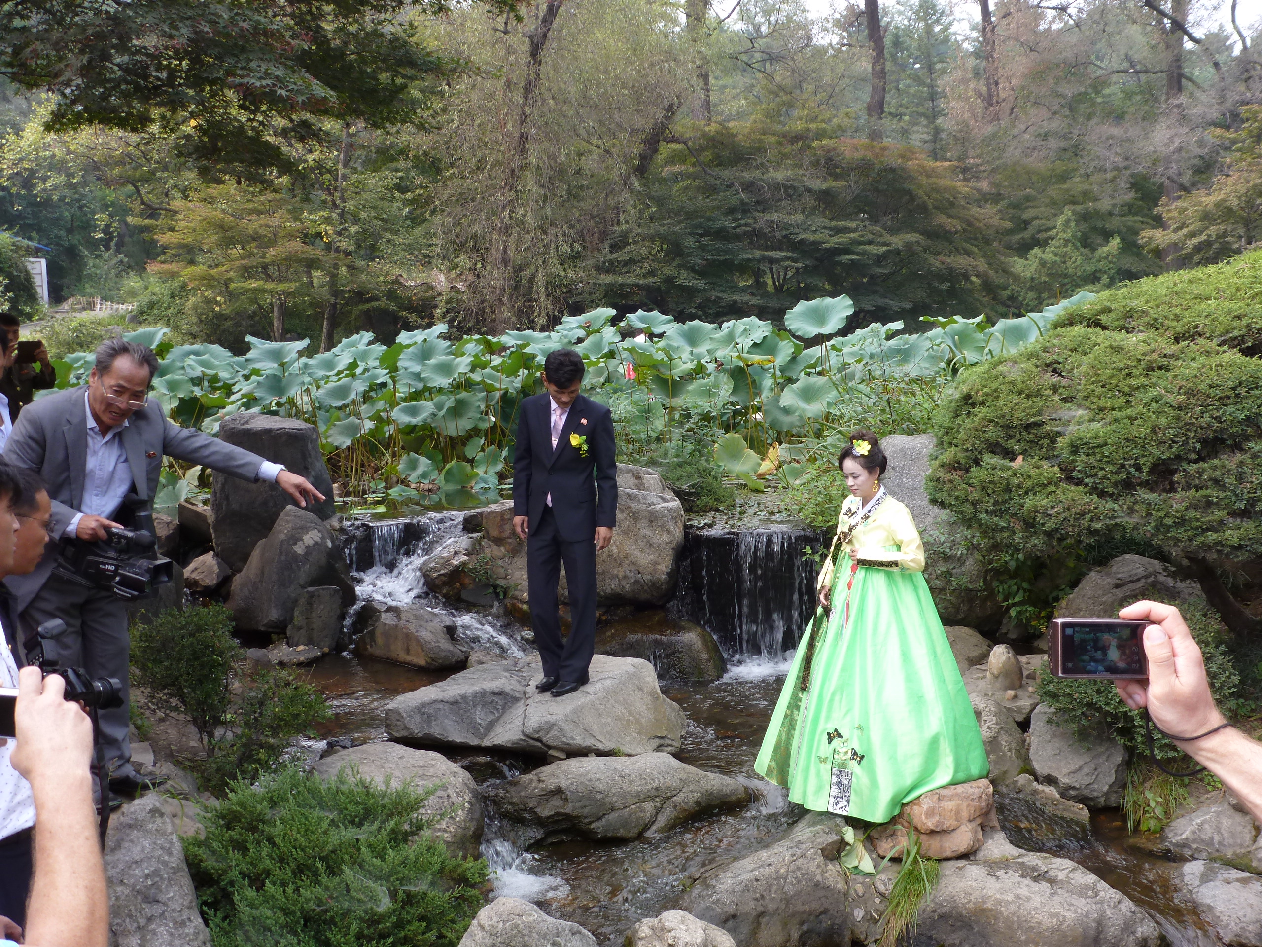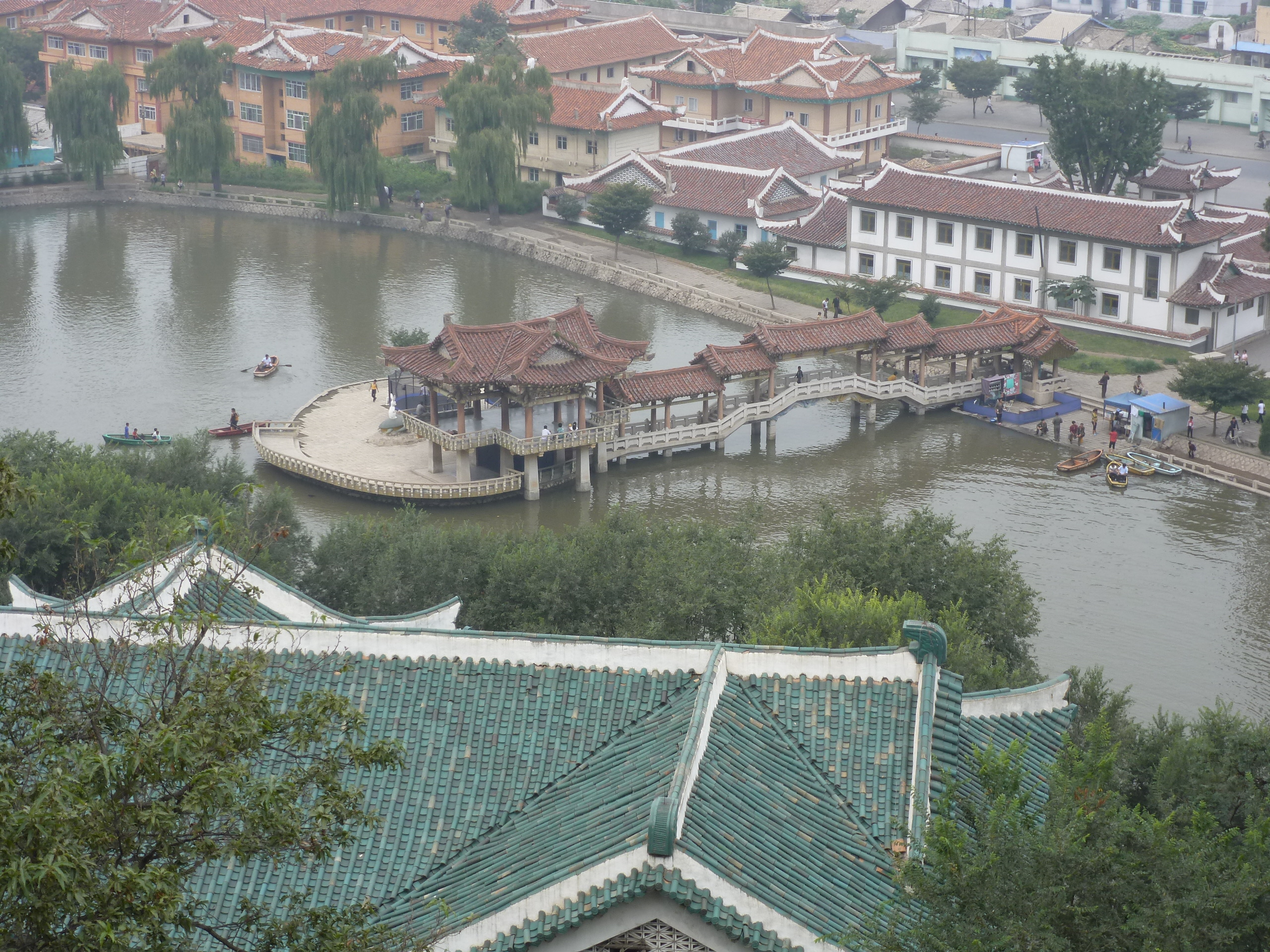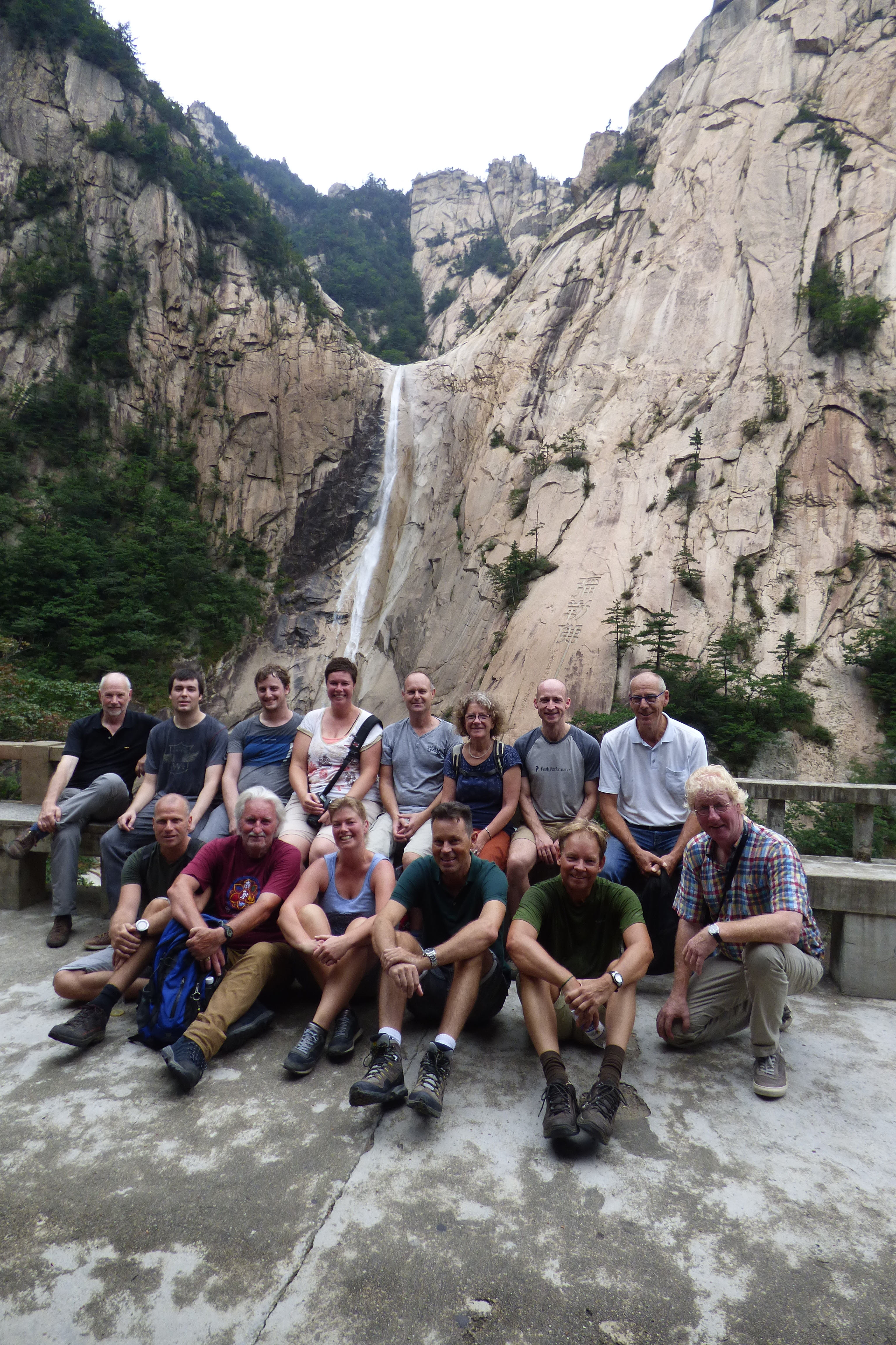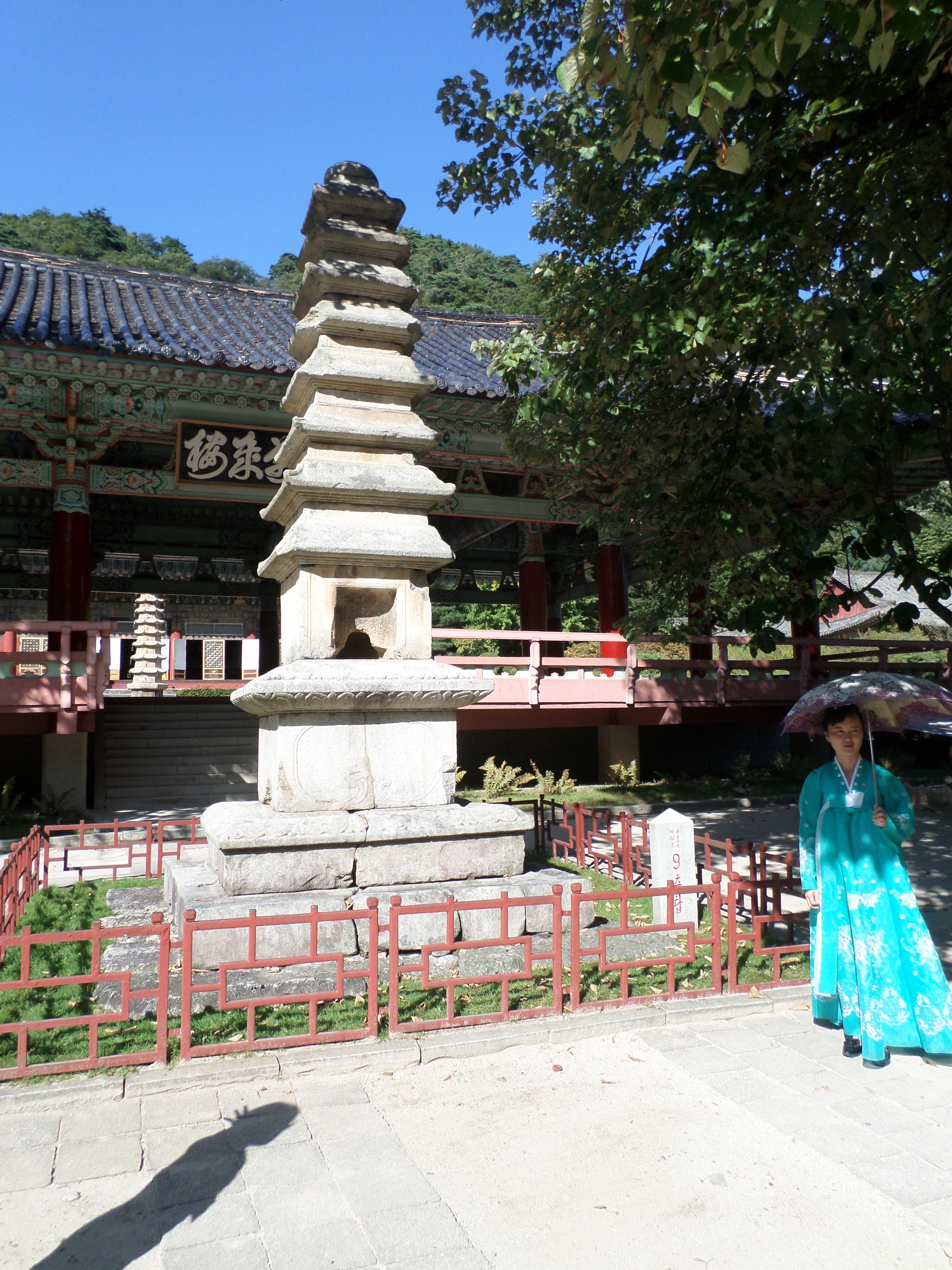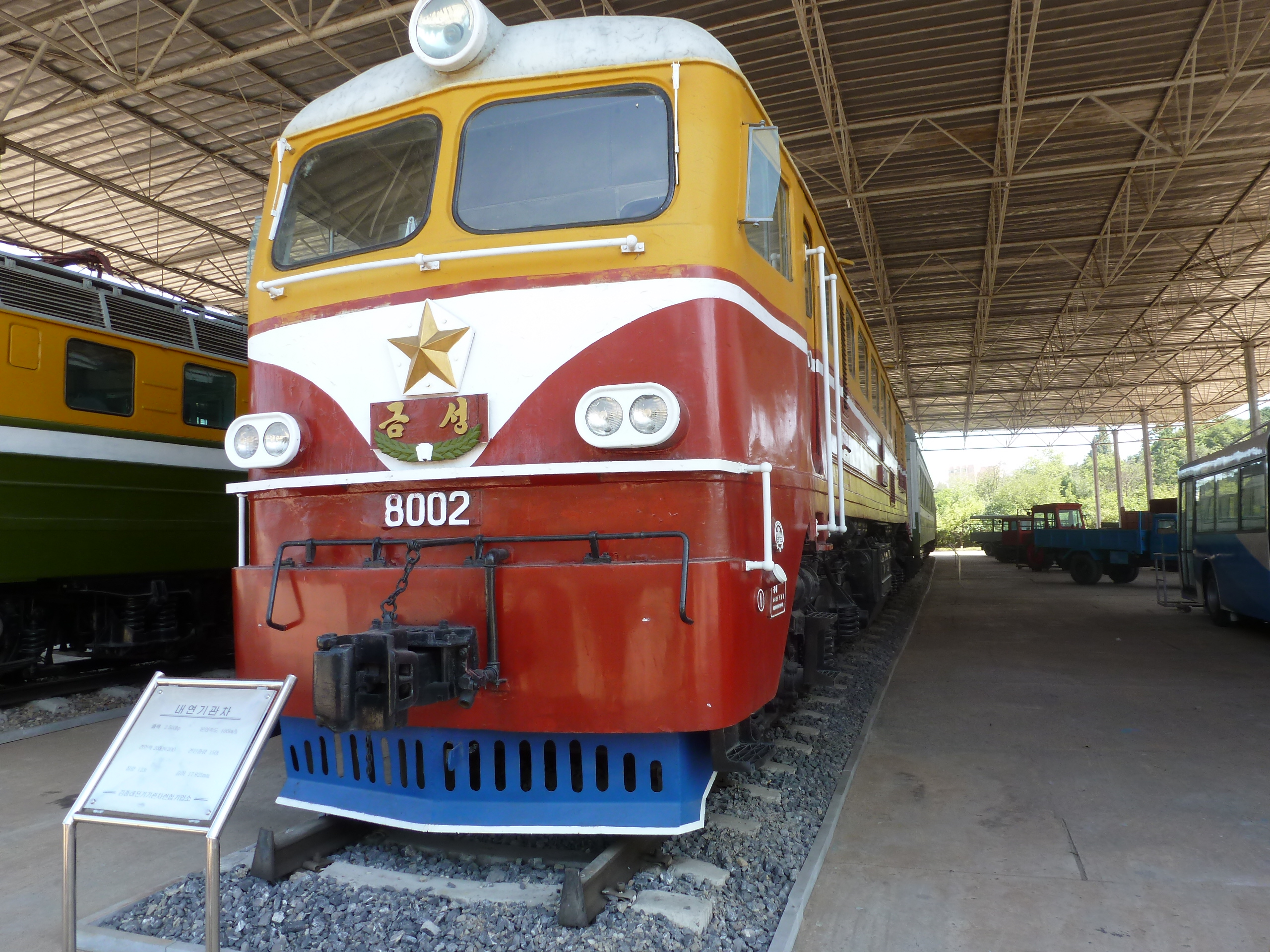 In Peking hebben we enkele uren tijd om ons voor te bereiden op de treinreis richting Noord-Korea. De trein vertrok rond 6u 's avonds. De volgende ochtend komen we aan in Dandong, een Chinese stad die grenst aan Noord-Korea.Het station van PekingDe slaapcabineHet restaurant op de trein. Een deel van het treinpersoneel was er al aan het eten. Ik besloot dan ook maar iets te eten. "Can I have a knife and fork?". "No sowwy". En de chinezen maar lachen.Op dag 3 arriveren we in Dandong, waar we een ontbijt krijgen. De rest van de treinreis wordt verdergezet op een andere trein richting de Noord-Koreaanse hoofdstad Pyongyang.Aankomst in DandongDandongIn de trein over de China-Noord-Korea Vriendschapsbrug. De Yalu rivier die we oversteken maakt een groot deel uit van de grens tussen China en Noord-Korea.Parallel loopt nog een brug, maar deze werd grotendeels vernield tijdens de Koreaanse oorlog.Links: Noord-Korea Rechts: ChinaAl snel verschijnen de portretten van de (overleden) grote leiders Kim Il Sung (links) en Kim Jong Il (rechts). Die zien we overal in Noord-Korea.Langs het platteland zien we vooral rijstvelden.Openbare werkenOnze Nederlandse reisbegeleider Jan is zeer fier op zijn Noord-Koreaanse badge. Deze badges worden door bijna alle Noord-Koreanen gedragen. Als buitenlander kan je deze badge enkel uitgereikt krijgen als je je loyaliteit bewezen hebt.In onze wagon zitten ook enkele Chinese toeristen. De meeste toeristen in Noord-Korea zijn Chinezen.Bij een tussenstop worden we gecontroleerd door Noord-Koreaanse militairen. Alle fototoestellen en telefoons worden geregistreerd, boeken en magazines worden nagekeken. Bagages worden slechts steekproefsgewijs doorgelicht. Onze paspoorten worden ook in beslag genomen. Die krijgen we pas terug op het einde van de reis.De rijstvelden zijn meestal in rechthoekige stukken ingedeeld, met bonenplanten om ze te scheiden.Tegen de avond rijden we Pyongyang binnen. Het volledige treintraject van Peking tot Pyongyang is 1371km lang en deden we ongeveer 24u over.Op dag 4 rijden we met de bus naar de industriestad Hamhung (함흥시). Hier bezoeken we oa. een fabriek van kunstmeststof.Het Yanggakdo International Hotel in Pyongyang waar we deze eerste nacht verbleven. Later keren we hier nog terug.Een tussenstop aan een meer langs het bergachtige landschap.Simon en ikDe bus waar we heel de reis mee rondtrokkenEen fotostop langs het bergachtige landschapDe gidsen vermelden dat zowat driekwart van het land bergen zijn. Omdat de Noord-Koreanen er naar streven om volledig zelfvoorzienend te zijn, wordt bijna alle vlakke grond gebruikt voor landbouw.Aan de linkerkant zie je onze Koreaanse gidsen. Meestal spreken Koreanen elkaar aan met hun volledige naam, maar gemakkelijkheidshalve mochten wij ze aanspreken als miss Kim (links) en miss Ha (rechts).Even dalen we af om een waterval te bezoeken. We picknicken hier in de buurt.De waterval zou in 2001 ontdekt zijn door Kim Jong Il, dankzij zijn fantastisch gehoor.BronwaterDit was een van de weinige maaltijden die ik volledig op kreeg. Op de bus krijgen we dan te horen dat de lunchschotels achtergelaten werden voor kinderen die de overschot zouden eten...De meeste wegen bestaan uit betonplaten.Een propagandabord langs de wegWe komen aan in Hamhung, de tweede grootste stad van Noord-Korea (~ 800.000 inwoners). We rijden hier voorbij een van de talrijke mozaïeken die we te zien zullen krijgen. Links: Kim Il Sung Midden: Kim Jong Il Rechts: Kim Jong Suk (de eerste vrouw van Kim Il Sung)Hamhung is nog maar enkele jaren "open" voor toeristen.Een fabriek van kunstmeststofBij elke bezienswaardigheid krijgen we te horen hoe vaak en wanneer juist de grote leiders die plaats bezocht hebben. Vaak zijn er mozaïeken die hun bezoek afbeelden.Binnen in de fabriekEr zijn maar weinig fabriekswerkers aanwezig, maar ze poseren wel graag voor een foto.'s avonds verblijven we in het Majon Tourist Resort aan de Oost-Koreaanse zee. Hier nemen we een frisse duik in het water.De huisjes waar we verblijven zijn vlak aan het strand.Onze zwembroeken buiten gehangen, maar echt droog werden ze niet door het vochtige klimaat.Het avondmaal. Zoals gewoonlijk werden er nog voortdurend bordjes bij gezet. Als je al vol zit krijg je dan nog een kom rijst en soep.'s middags en 's avonds was er als drank meestal plat water en bier, met de mogelijkheid om "juice" te drinken in plaats van bier. Dat was een soort appel/peren sap (niet op de foto).Onze kamerHier was geen stromend water, en diende het bad als waterreservoir. Wassen moest "op z'n Bangladesh" door een teiltje water over je gieten. In de rode emmer kon water elektrisch verwarmd worden.Op dag 5 bezoeken we nog enkele plaatsen in Hamhung, en vertrekken dan richting Mt. Kumgang. Onderweg bezoeken we oa. nog de kuststad Wonsan.Het huis van de voormalige koning Taejo van Joseon in Hamhung. Hij richtte de Koreaanse Joseondynastie op in 1392, die eindigde in 1897.Een zeer oude boomBuiten het huis stond een groep Koreaanse studenten te wachten.Een aangelegde (niet natuurlijke) heuvel met grote bronzen beelden van de leidersDe lokale gids die ons een woordje uitleg gaf. De plaatselijke gidsen spraken meestal Koreaans, dat dan naar Engels vertaald werd door onze gids miss Kim.Hamhung Grand TheatreWonsanDit verkeersbord leek met de hand geschilderd te zijn.Bezoek aan een de Chonsam coöperatieve boerderijEen persimmon boomOok de grote leiders zijn hier geweest.In het winkeltje van de boerderij kochten we enkele gedroogde persimmons.Naast de boerderij was er een kleuterschool. De kinderen zongen een liedje en wuifden ons dan uit.Iets verderop bezoeken we nog het huis van de boerin die ons begeleidde.Dit huis heeft een soort vloerverwarming die hier vaak toegepast zou worden. Op internet vond ik dit systeem terug als "Ondol".Wat voor een decoder is dat onder de TV? Telenet of Belgacom?Ten slotte bezochten we nog een boeddhistische tempel...Maar bij de tempel zelf mochten we niet komen, omdat er constructi