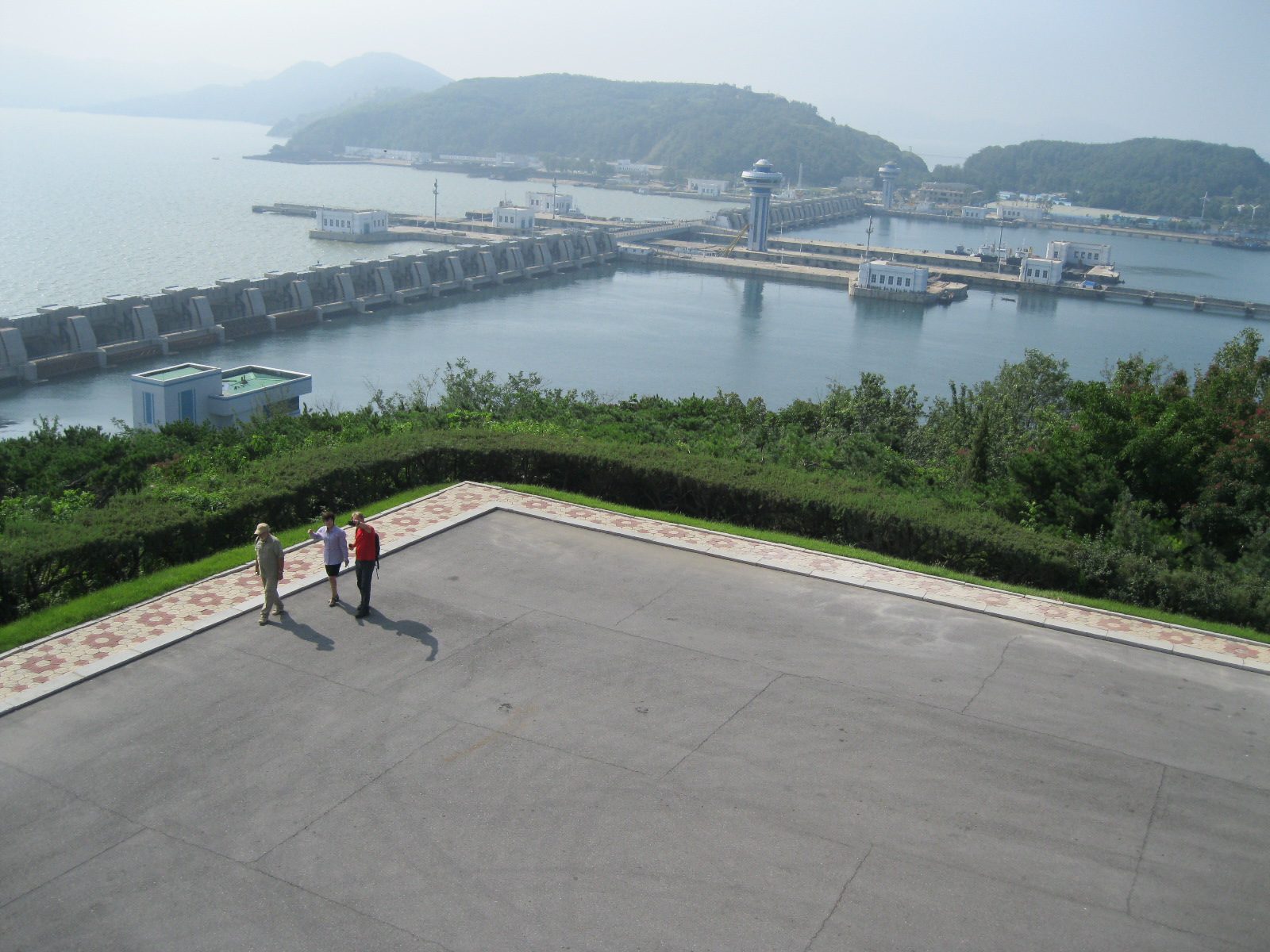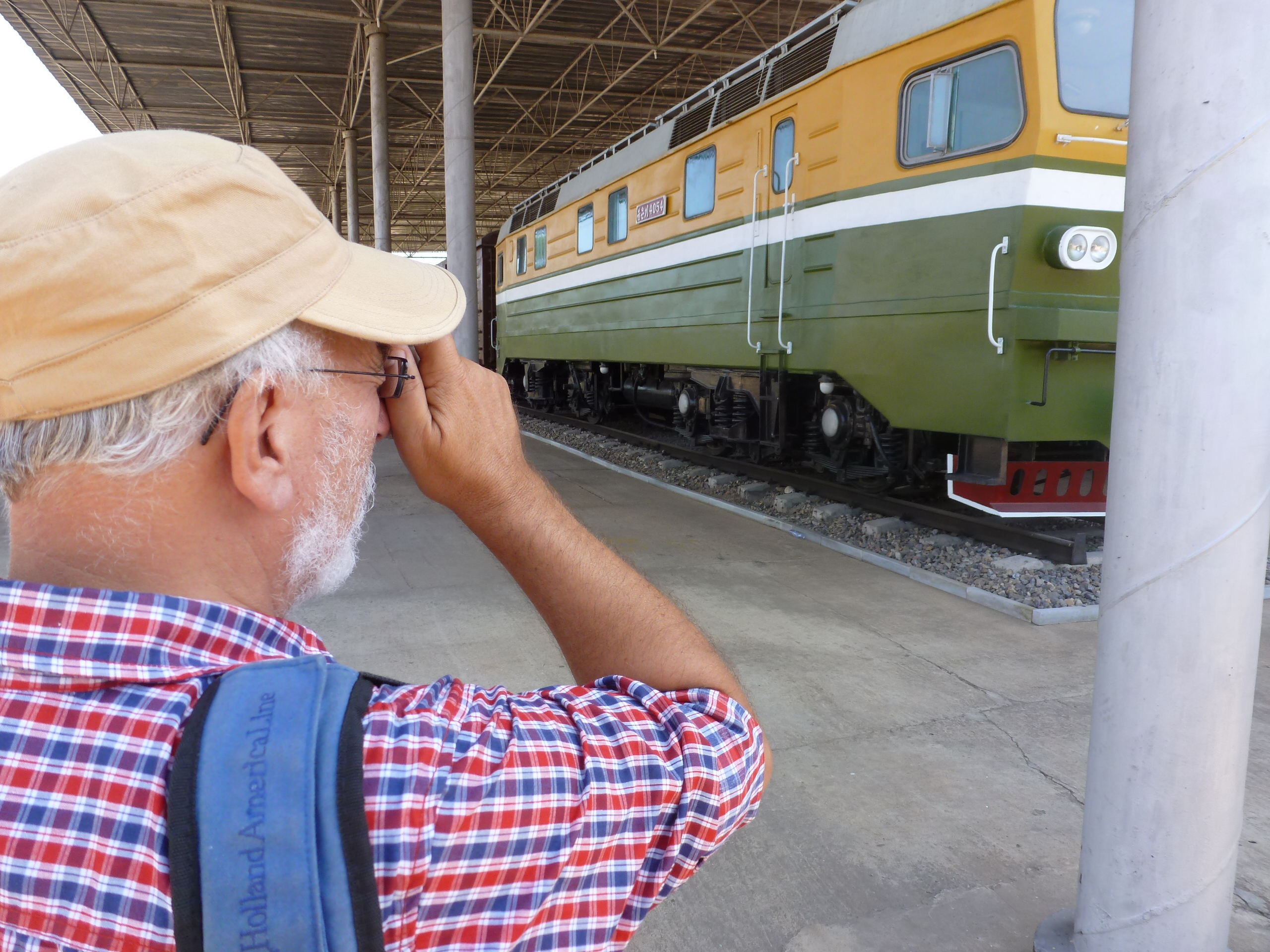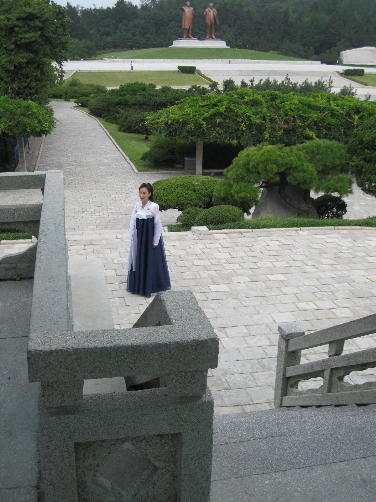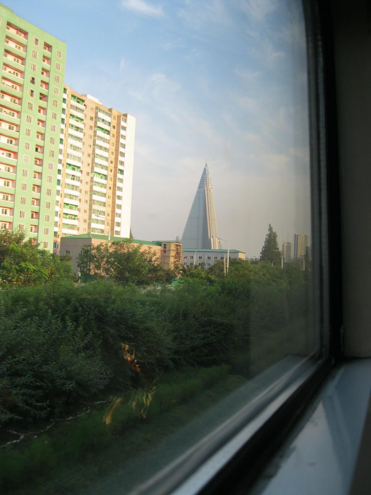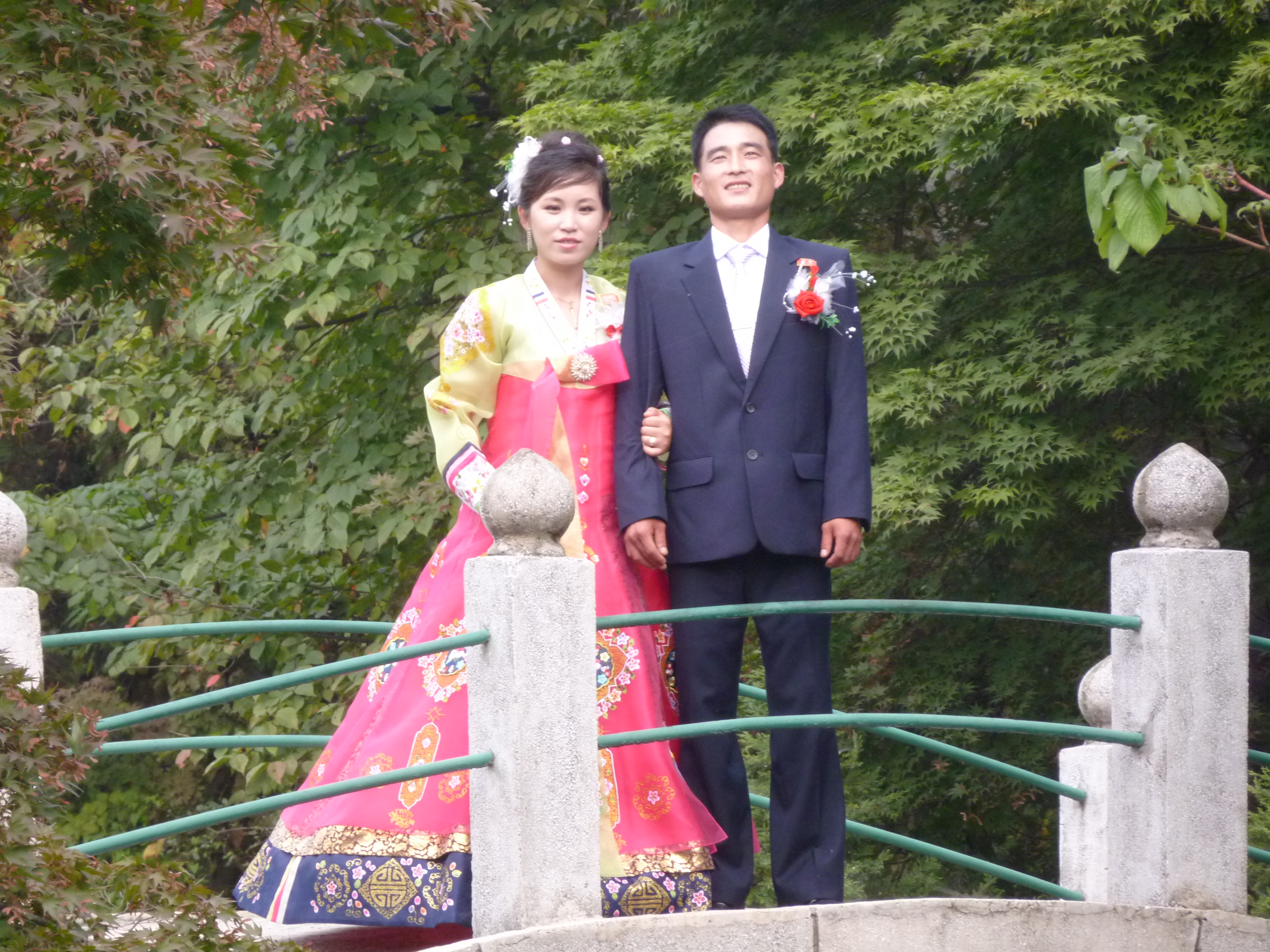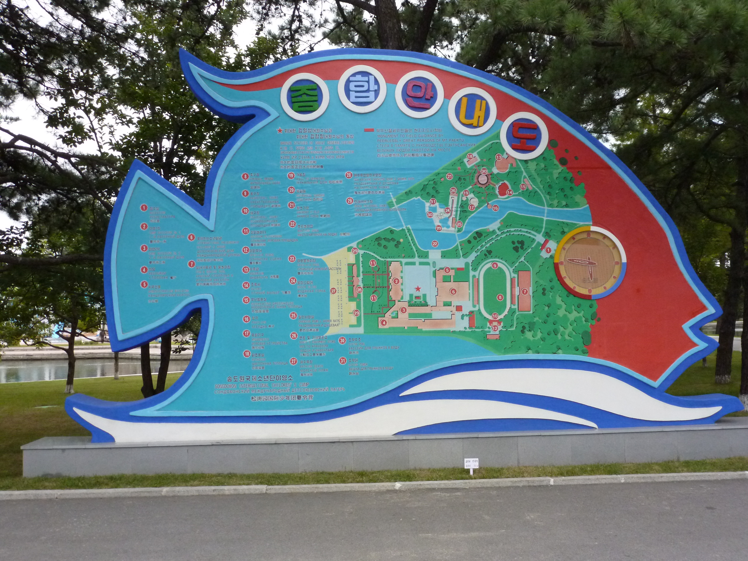 In Peking hebben we enkele uren tijd om ons voor te bereiden op de treinreis richting Noord-Korea. De trein vertrok rond 6u 's avonds. De volgende ochtend komen we aan in Dandong, een Chinese stad die grenst aan Noord-Korea.Het station van PekingDe slaapcabineHet restaurant op de trein. Een deel van het treinpersoneel was er al aan het eten. Ik besloot dan ook maar iets te eten. "Can I have a knife and fork?". "No sowwy". En de chinezen maar lachen.Op dag 3 arriveren we in Dandong, waar we een ontbijt krijgen. De rest van de treinreis wordt verdergezet op een andere trein richting de Noord-Koreaanse hoofdstad Pyongyang.Aankomst in DandongDandongIn de trein over de China-Noord-Korea Vriendschapsbrug. De Yalu rivier die we oversteken maakt een groot deel uit van de grens tussen China en Noord-Korea.Parallel loopt nog een brug, maar deze werd grotendeels vernield tijdens de Koreaanse oorlog.Links: Noord-Korea Rechts: ChinaAl snel verschijnen de portretten van de (overleden) grote leiders Kim Il Sung (links) en Kim Jong Il (rechts). Die zien we overal in Noord-Korea.Langs het platteland zien we vooral rijstvelden.Openbare werkenOnze Nederlandse reisbegeleider Jan is zeer fier op zijn Noord-Koreaanse badge. Deze badges worden door bijna alle Noord-Koreanen gedragen. Als buitenlander kan je deze badge enkel uitgereikt krijgen als je je loyaliteit bewezen hebt.In onze wagon zitten ook enkele Chinese toeristen. De meeste toeristen in Noord-Korea zijn Chinezen.Bij een tussenstop worden we gecontroleerd door Noord-Koreaanse militairen. Alle fototoestellen en telefoons worden geregistreerd, boeken en magazines worden nagekeken. Bagages worden slechts steekproefsgewijs doorgelicht. Onze paspoorten worden ook in beslag genomen. Die krijgen we pas terug op het einde van de reis.De rijstvelden zijn meestal in rechthoekige stukken ingedeeld, met bonenplanten om ze te scheiden.Tegen de avond rijden we Pyongyang binnen. Het volledige treintraject van Peking tot Pyongyang is 1371km lang en deden we ongeveer 24u over.Op dag 4 rijden we met de bus naar de industriestad Hamhung (함흥시). Hier bezoeken we oa. een fabriek van kunstmeststof.Het Yanggakdo International Hotel in Pyongyang waar we deze eerste nacht verbleven. Later keren we hier nog terug.Een tussenstop aan een meer langs het bergachtige landschap.Simon en ikDe bus waar we heel de reis mee rondtrokkenEen fotostop langs het bergachtige landschapDe gidsen vermelden dat zowat driekwart van het land bergen zijn. Omdat de Noord-Koreanen er naar streven om volledig zelfvoorzienend te zijn, wordt bijna alle vlakke grond gebruikt voor landbouw.Aan de linkerkant zie je onze Koreaanse gidsen. Meestal spreken Koreanen elkaar aan met hun volledige naam, maar gemakkelijkheidshalve mochten wij ze aanspreken als miss Kim (links) en miss Ha (rechts).Even dalen we af om een waterval te bezoeken. We picknicken hier in de buurt.De waterval zou in 2001 ontdekt zijn door Kim Jong Il, dankzij zijn fantastisch gehoor.BronwaterDit was een van de weinige maaltijden die ik volledig op kreeg. Op de bus krijgen we dan te horen dat de lunchschotels achtergelaten werden voor kinderen die de overschot zouden eten...De meeste wegen bestaan uit betonplaten.Een propagandabord langs de wegWe komen aan in Hamhung, de tweede grootste stad van Noord-Korea (~ 800.000 inwoners). We rijden hier voorbij een van de talrijke mozaïeken die we te zien zullen krijgen. Links: Kim Il Sung Midden: Kim Jong Il Rechts: Kim Jong Suk (de eerste vrouw van Kim Il Sung)Hamhung is nog maar enkele jaren "open" voor toeristen.Een fabriek van kunstmeststofBij elke bezienswaardigheid krijgen we te horen hoe vaak en wanneer juist de grote leiders die plaats bezocht hebben. Vaak zijn er mozaïeken die hun bezoek afbeelden.Binnen in de fabriekEr zijn maar weinig fabriekswerkers aanwezig, maar ze poseren wel graag voor een foto.'s avonds verblijven we in het Majon Tourist Resort aan de Oost-Koreaanse zee. Hier nemen we een frisse duik in het water.De huisjes waar we verblijven zijn vlak aan het strand.Onze zwembroeken buiten gehangen, maar echt droog werden ze niet door het vochtige klimaat.Het avondmaal. Zoals gewoonlijk werden er nog voortdurend bordjes bij gezet. Als je al vol zit krijg je dan nog een kom rijst en soep.'s middags en 's avonds was er als drank meestal plat water en bier, met de mogelijkheid om "juice" te drinken in plaats van bier. Dat was een soort appel/peren sap (niet op de foto).Onze kamerHier was geen stromend water, en diende het bad als waterreservoir. Wassen moest "op z'n Bangladesh" door een teiltje water over je gieten. In de rode emmer kon water elektrisch verwarmd worden.Op dag 5 bezoeken we nog enkele plaatsen in Hamhung, en vertrekken dan richting Mt. Kumgang. Onderweg bezoeken we oa. nog de kuststad Wonsan.Het huis van de voormalige koning Taejo van Joseon in Hamhung. Hij richtte de Koreaanse Joseondynastie op in 1392, die eindigde in 1897.Een zeer oude boomBuiten het huis stond een groep Koreaanse studenten te wachten.Een aangelegde (niet natuurlijke) heuvel met grote bronzen beelden van de leidersDe lokale gids die ons een woordje uitleg gaf. De plaatselijke gidsen spraken meestal Koreaans, dat dan naar Engels vertaald werd door onze gids miss Kim.Hamhung Grand TheatreWonsanDit verkeersbord leek met de hand geschilderd te zijn.Bezoek aan een de Chonsam coöperatieve boerderijEen persimmon boomOok de grote leiders zijn hier geweest.In het winkeltje van de boerderij kochten we enkele gedroogde persimmons.Naast de boerderij was er een kleuterschool. De kinderen zongen een liedje en wuifden ons dan uit.Iets verderop bezoeken we nog het huis van de boerin die ons begeleidde.Dit huis heeft een soort vloerverwarming die hier vaak toegepast zou worden. Op internet vond ik dit systeem terug als "Ondol".Wat voor een decoder is dat onder de TV? Telenet of Belgacom?Ten slotte bezochten we nog een boeddhistische tempel...Maar bij de tempel zelf mochten we niet komen, omdat er constructi