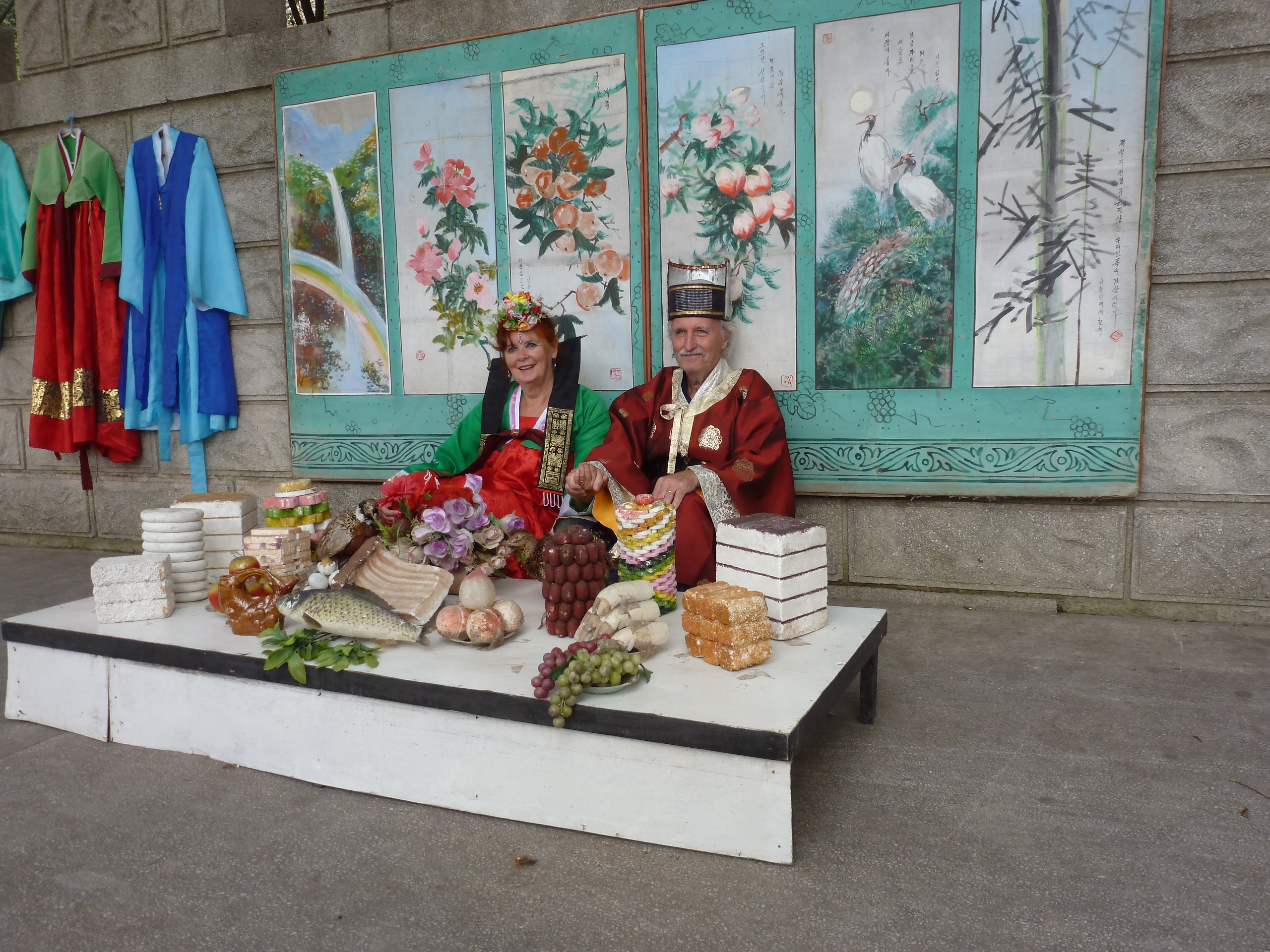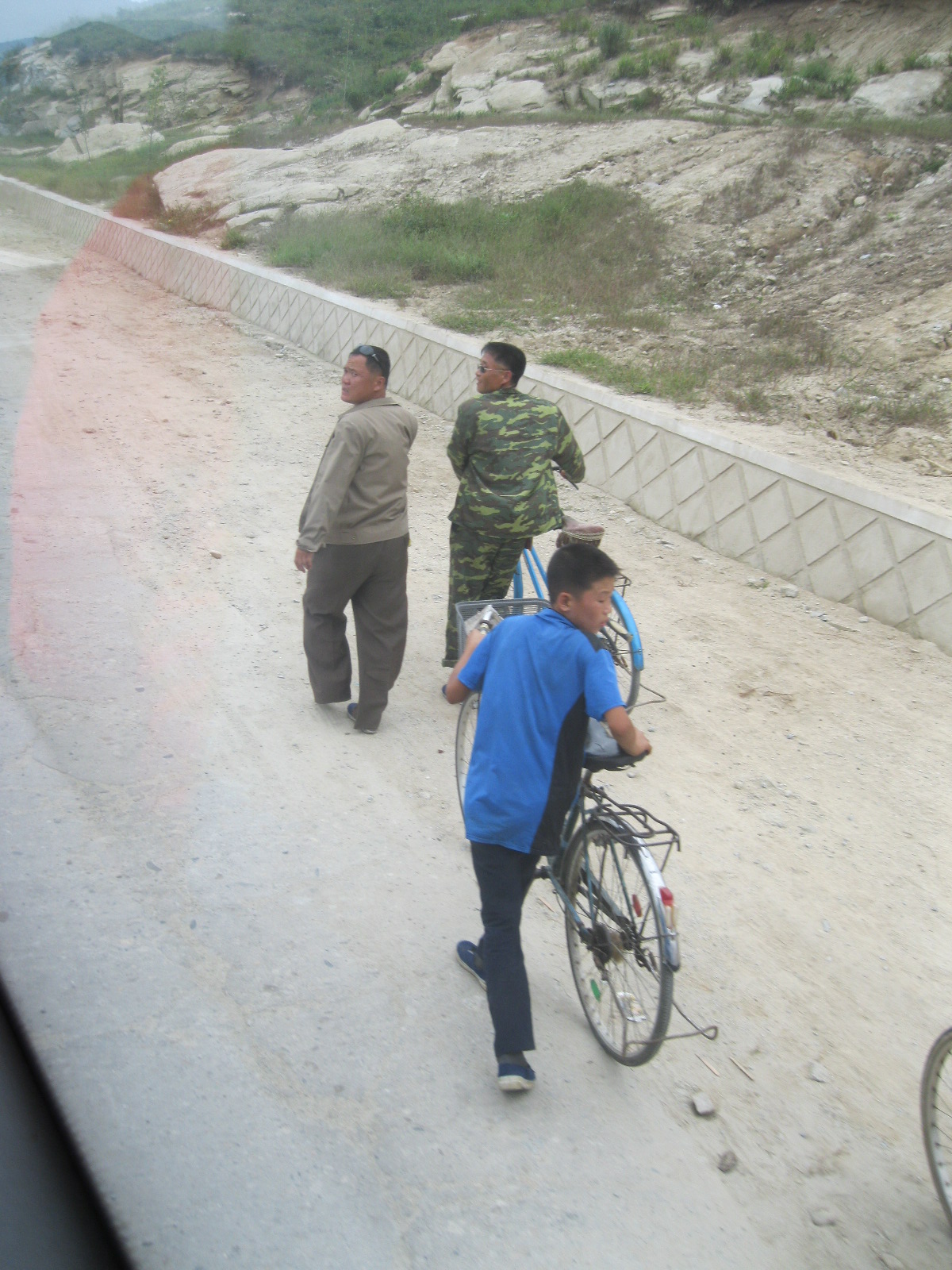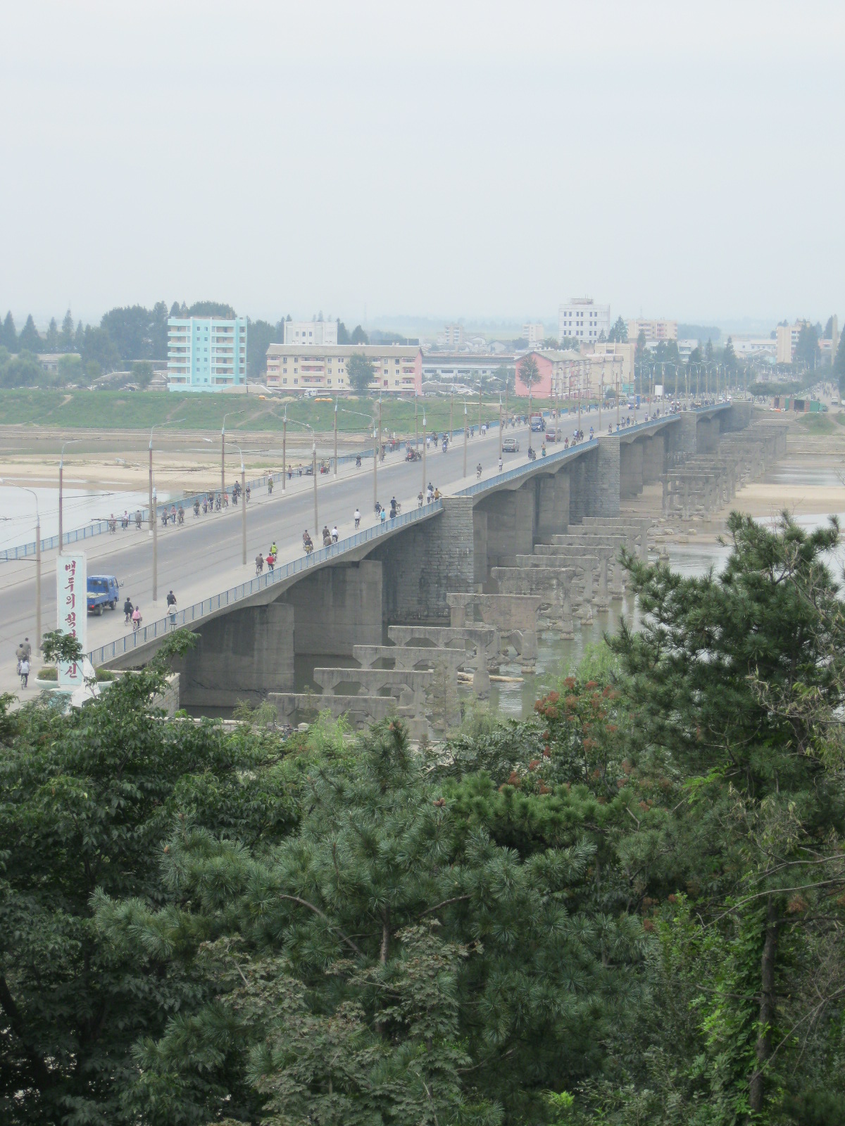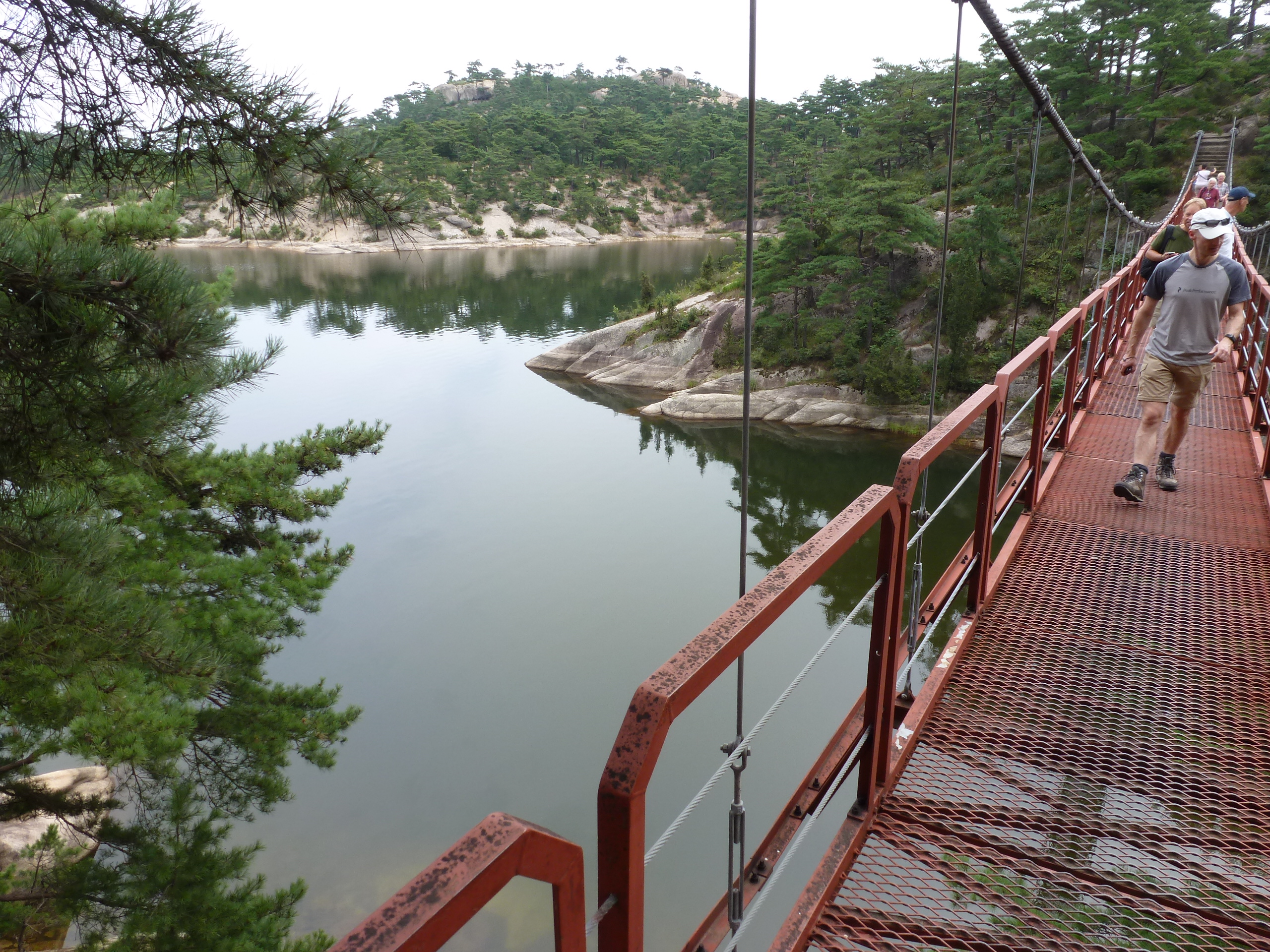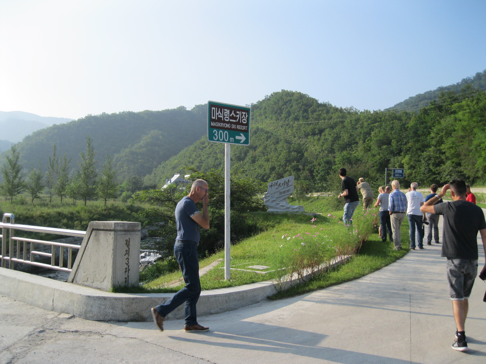 In Peking hebben we enkele uren tijd om ons voor te bereiden op de treinreis richting Noord-Korea. De trein vertrok rond 6u 's avonds. De volgende ochtend komen we aan in Dandong, een Chinese stad die grenst aan Noord-Korea.Het station van PekingDe slaapcabineHet restaurant op de trein. Een deel van het treinpersoneel was er al aan het eten. Ik besloot dan ook maar iets te eten. "Can I have a knife and fork?". "No sowwy". En de chinezen maar lachen.Op dag 3 arriveren we in Dandong, waar we een ontbijt krijgen. De rest van de treinreis wordt verdergezet op een andere trein richting de Noord-Koreaanse hoofdstad Pyongyang.Aankomst in DandongDandongIn de trein over de China-Noord-Korea Vriendschapsbrug. De Yalu rivier die we oversteken maakt een groot deel uit van de grens tussen China en Noord-Korea.Parallel loopt nog een brug, maar deze werd grotendeels vernield tijdens de Koreaanse oorlog.Links: Noord-Korea Rechts: ChinaAl snel verschijnen de portretten van de (overleden) grote leiders Kim Il Sung (links) en Kim Jong Il (rechts). Die zien we overal in Noord-Korea.Langs het platteland zien we vooral rijstvelden.Openbare werkenOnze Nederlandse reisbegeleider Jan is zeer fier op zijn Noord-Koreaanse badge. Deze badges worden door bijna alle Noord-Koreanen gedragen. Als buitenlander kan je deze badge enkel uitgereikt krijgen als je je loyaliteit bewezen hebt.In onze wagon zitten ook enkele Chinese toeristen. De meeste toeristen in Noord-Korea zijn Chinezen.Bij een tussenstop worden we gecontroleerd door Noord-Koreaanse militairen. Alle fototoestellen en telefoons worden geregistreerd, boeken en magazines worden nagekeken. Bagages worden slechts steekproefsgewijs doorgelicht. Onze paspoorten worden ook in beslag genomen. Die krijgen we pas terug op het einde van de reis.De rijstvelden zijn meestal in rechthoekige stukken ingedeeld, met bonenplanten om ze te scheiden.Tegen de avond rijden we Pyongyang binnen. Het volledige treintraject van Peking tot Pyongyang is 1371km lang en deden we ongeveer 24u over.Op dag 4 rijden we met de bus naar de industriestad Hamhung (함흥시). Hier bezoeken we oa. een fabriek van kunstmeststof.Het Yanggakdo International Hotel in Pyongyang waar we deze eerste nacht verbleven. Later keren we hier nog terug.Een tussenstop aan een meer langs het bergachtige landschap.Simon en ikDe bus waar we heel de reis mee rondtrokkenEen fotostop langs het bergachtige landschapDe gidsen vermelden dat zowat driekwart van het land bergen zijn. Omdat de Noord-Koreanen er naar streven om volledig zelfvoorzienend te zijn, wordt bijna alle vlakke grond gebruikt voor landbouw.Aan de linkerkant zie je onze Koreaanse gidsen. Meestal spreken Koreanen elkaar aan met hun volledige naam, maar gemakkelijkheidshalve mochten wij ze aanspreken als miss Kim (links) en miss Ha (rechts).Even dalen we af om een waterval te bezoeken. We picknicken hier in de buurt.De waterval zou in 2001 ontdekt zijn door Kim Jong Il, dankzij zijn fantastisch gehoor.BronwaterDit was een van de weinige maaltijden die ik volledig op kreeg. Op de bus krijgen we dan te horen dat de lunchschotels achtergelaten werden voor kinderen die de overschot zouden eten...De meeste wegen bestaan uit betonplaten.Een propagandabord langs de wegWe komen aan in Hamhung, de tweede grootste stad van Noord-Korea (~ 800.000 inwoners). We rijden hier voorbij een van de talrijke mozaïeken die we te zien zullen krijgen. Links: Kim Il Sung Midden: Kim Jong Il Rechts: Kim Jong Suk (de eerste vrouw van Kim Il Sung)Hamhung is nog maar enkele jaren "open" voor toeristen.Een fabriek van kunstmeststofBij elke bezienswaardigheid krijgen we te horen hoe vaak en wanneer juist de grote leiders die plaats bezocht hebben. Vaak zijn er mozaïeken die hun bezoek afbeelden.Binnen in de fabriekEr zijn maar weinig fabriekswerkers aanwezig, maar ze poseren wel graag voor een foto.'s avonds verblijven we in het Majon Tourist Resort aan de Oost-Koreaanse zee. Hier nemen we een frisse duik in het water.De huisjes waar we verblijven zijn vlak aan het strand.Onze zwembroeken buiten gehangen, maar echt droog werden ze niet door het vochtige klimaat.Het avondmaal. Zoals gewoonlijk werden er nog voortdurend bordjes bij gezet. Als je al vol zit krijg je dan nog een kom rijst en soep.'s middags en 's avonds was er als drank meestal plat water en bier, met de mogelijkheid om "juice" te drinken in plaats van bier. Dat was een soort appel/peren sap (niet op de foto).Onze kamerHier was geen stromend water, en diende het bad als waterreservoir. Wassen moest "op z'n Bangladesh" door een teiltje water over je gieten. In de rode emmer kon water elektrisch verwarmd worden.Op dag 5 bezoeken we nog enkele plaatsen in Hamhung, en vertrekken dan richting Mt. Kumgang. Onderweg bezoeken we oa. nog de kuststad Wonsan.Het huis van de voormalige koning Taejo van Joseon in Hamhung. Hij richtte de Koreaanse Joseondynastie op in 1392, die eindigde in 1897.Een zeer oude boomBuiten het huis stond een groep Koreaanse studenten te wachten.Een aangelegde (niet natuurlijke) heuvel met grote bronzen beelden van de leidersDe lokale gids die ons een woordje uitleg gaf. De plaatselijke gidsen spraken meestal Koreaans, dat dan naar Engels vertaald werd door onze gids miss Kim.Hamhung Grand TheatreWonsanDit verkeersbord leek met de hand geschilderd te zijn.Bezoek aan een de Chonsam coöperatieve boerderijEen persimmon boomOok de grote leiders zijn hier geweest.In het winkeltje van de boerderij kochten we enkele gedroogde persimmons.Naast de boerderij was er een kleuterschool. De kinderen zongen een liedje en wuifden ons dan uit.Iets verderop bezoeken we nog het huis van de boerin die ons begeleidde.Dit huis heeft een soort vloerverwarming die hier vaak toegepast zou worden. Op internet vond ik dit systeem terug als "Ondol".Wat voor een decoder is dat onder de TV? Telenet of Belgacom?Ten slotte bezochten we nog een boeddhistische tempel...Maar bij de tempel zelf mochten we niet komen, omdat er constructi