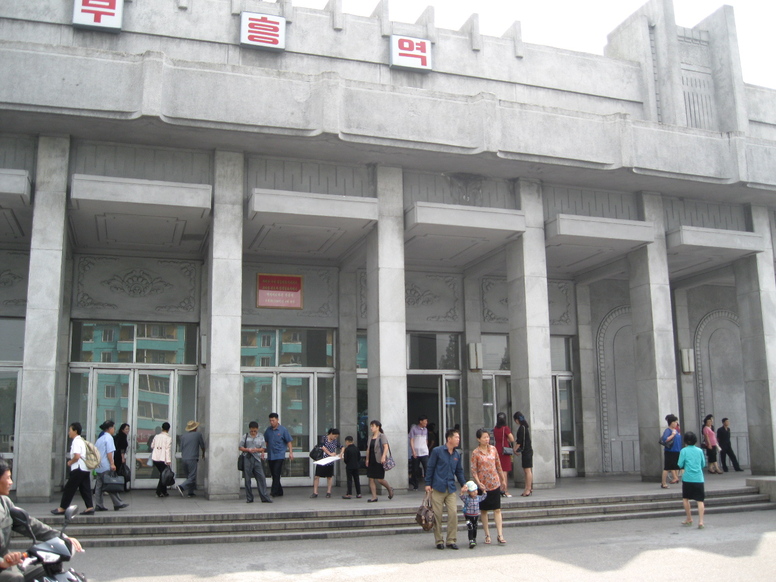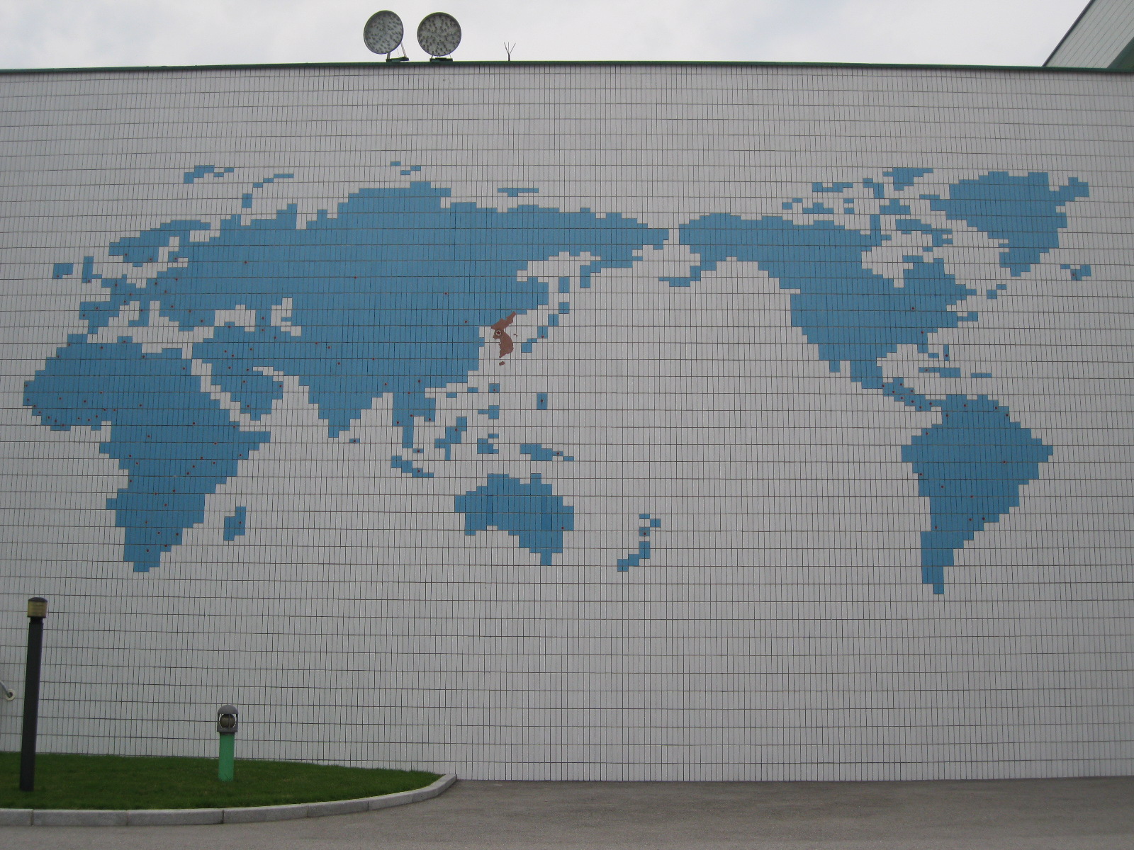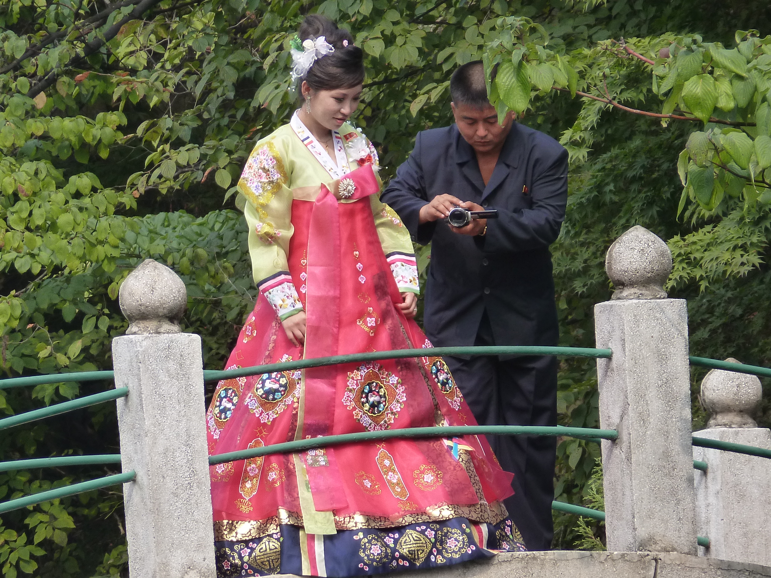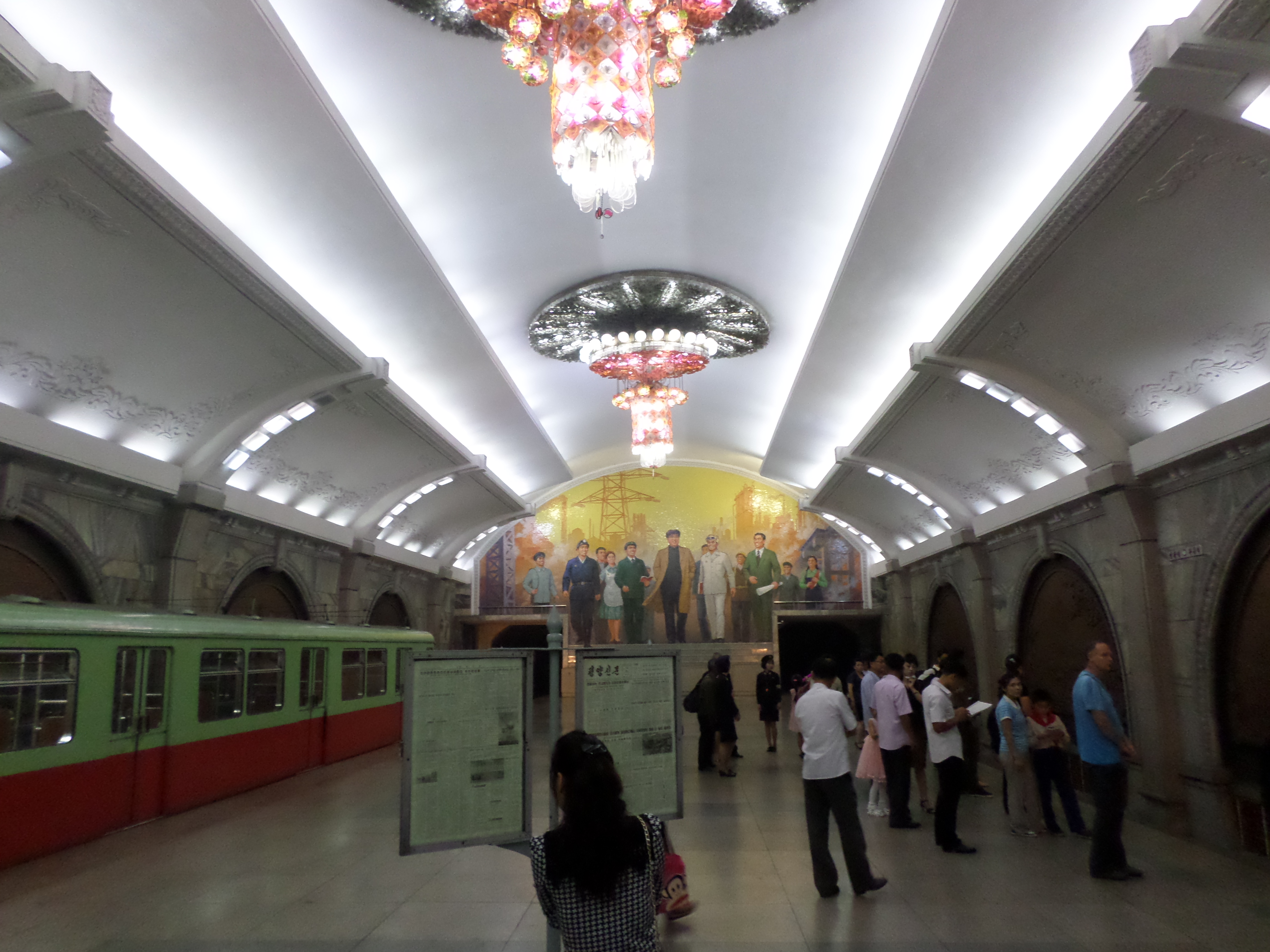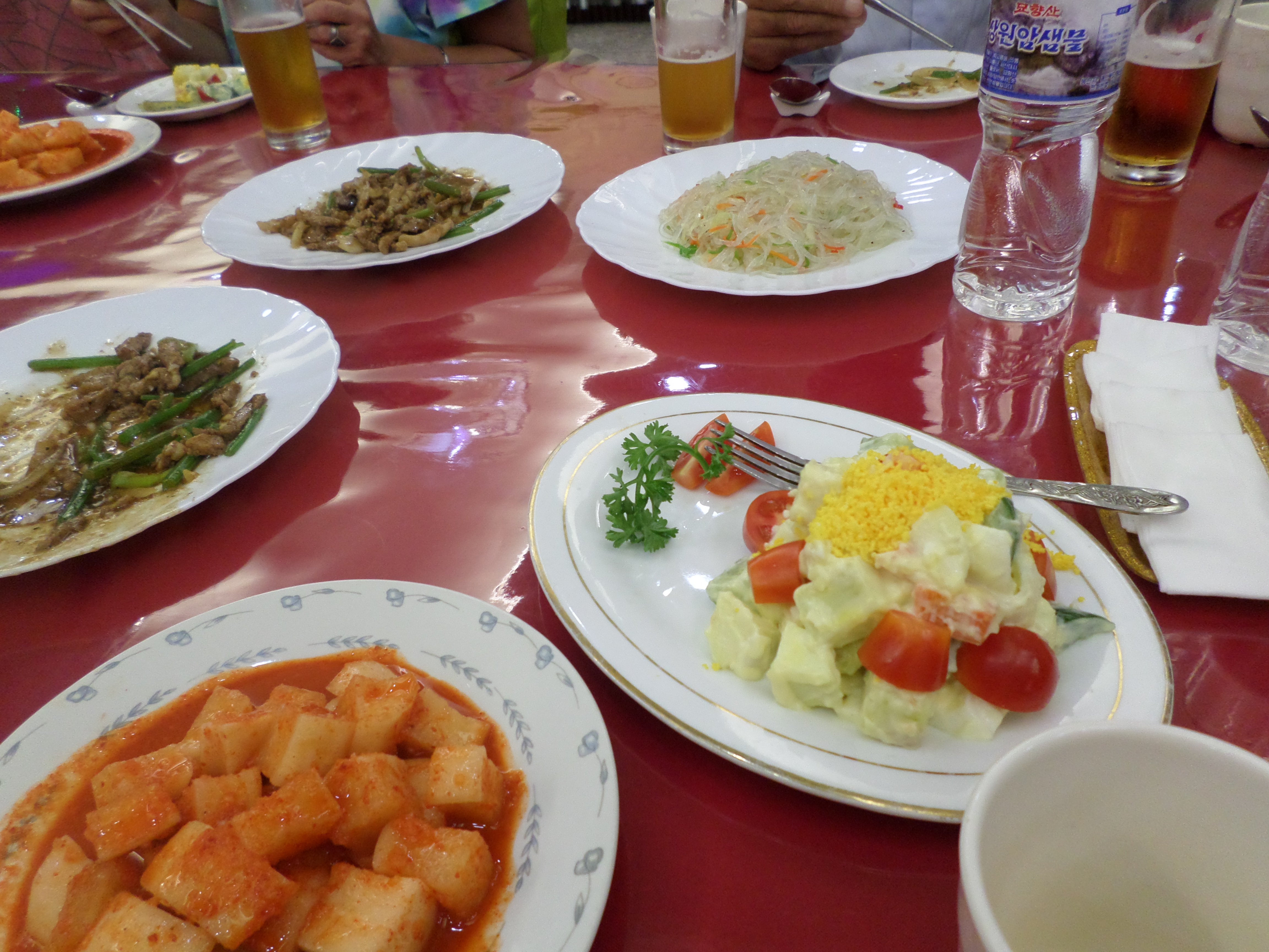 In Peking hebben we enkele uren tijd om ons voor te bereiden op de treinreis richting Noord-Korea. De trein vertrok rond 6u 's avonds. De volgende ochtend komen we aan in Dandong, een Chinese stad die grenst aan Noord-Korea.Het station van PekingDe slaapcabineHet restaurant op de trein. Een deel van het treinpersoneel was er al aan het eten. Ik besloot dan ook maar iets te eten. "Can I have a knife and fork?". "No sowwy". En de chinezen maar lachen.Op dag 3 arriveren we in Dandong, waar we een ontbijt krijgen. De rest van de treinreis wordt verdergezet op een andere trein richting de Noord-Koreaanse hoofdstad Pyongyang.Aankomst in DandongDandongIn de trein over de China-Noord-Korea Vriendschapsbrug. De Yalu rivier die we oversteken maakt een groot deel uit van de grens tussen China en Noord-Korea.Parallel loopt nog een brug, maar deze werd grotendeels vernield tijdens de Koreaanse oorlog.Links: Noord-Korea Rechts: ChinaAl snel verschijnen de portretten van de (overleden) grote leiders Kim Il Sung (links) en Kim Jong Il (rechts). Die zien we overal in Noord-Korea.Langs het platteland zien we vooral rijstvelden.Openbare werkenOnze Nederlandse reisbegeleider Jan is zeer fier op zijn Noord-Koreaanse badge. Deze badges worden door bijna alle Noord-Koreanen gedragen. Als buitenlander kan je deze badge enkel uitgereikt krijgen als je je loyaliteit bewezen hebt.In onze wagon zitten ook enkele Chinese toeristen. De meeste toeristen in Noord-Korea zijn Chinezen.Bij een tussenstop worden we gecontroleerd door Noord-Koreaanse militairen. Alle fototoestellen en telefoons worden geregistreerd, boeken en magazines worden nagekeken. Bagages worden slechts steekproefsgewijs doorgelicht. Onze paspoorten worden ook in beslag genomen. Die krijgen we pas terug op het einde van de reis.De rijstvelden zijn meestal in rechthoekige stukken ingedeeld, met bonenplanten om ze te scheiden.Tegen de avond rijden we Pyongyang binnen. Het volledige treintraject van Peking tot Pyongyang is 1371km lang en deden we ongeveer 24u over.Op dag 4 rijden we met de bus naar de industriestad Hamhung (함흥시). Hier bezoeken we oa. een fabriek van kunstmeststof.Het Yanggakdo International Hotel in Pyongyang waar we deze eerste nacht verbleven. Later keren we hier nog terug.Een tussenstop aan een meer langs het bergachtige landschap.Simon en ikDe bus waar we heel de reis mee rondtrokkenEen fotostop langs het bergachtige landschapDe gidsen vermelden dat zowat driekwart van het land bergen zijn. Omdat de Noord-Koreanen er naar streven om volledig zelfvoorzienend te zijn, wordt bijna alle vlakke grond gebruikt voor landbouw.Aan de linkerkant zie je onze Koreaanse gidsen. Meestal spreken Koreanen elkaar aan met hun volledige naam, maar gemakkelijkheidshalve mochten wij ze aanspreken als miss Kim (links) en miss Ha (rechts).Even dalen we af om een waterval te bezoeken. We picknicken hier in de buurt.De waterval zou in 2001 ontdekt zijn door Kim Jong Il, dankzij zijn fantastisch gehoor.BronwaterDit was een van de weinige maaltijden die ik volledig op kreeg. Op de bus krijgen we dan te horen dat de lunchschotels achtergelaten werden voor kinderen die de overschot zouden eten...De meeste wegen bestaan uit betonplaten.Een propagandabord langs de wegWe komen aan in Hamhung, de tweede grootste stad van Noord-Korea (~ 800.000 inwoners). We rijden hier voorbij een van de talrijke mozaïeken die we te zien zullen krijgen. Links: Kim Il Sung Midden: Kim Jong Il Rechts: Kim Jong Suk (de eerste vrouw van Kim Il Sung)Hamhung is nog maar enkele jaren "open" voor toeristen.Een fabriek van kunstmeststofBij elke bezienswaardigheid krijgen we te horen hoe vaak en wanneer juist de grote leiders die plaats bezocht hebben. Vaak zijn er mozaïeken die hun bezoek afbeelden.Binnen in de fabriekEr zijn maar weinig fabriekswerkers aanwezig, maar ze poseren wel graag voor een foto.'s avonds verblijven we in het Majon Tourist Resort aan de Oost-Koreaanse zee. Hier nemen we een frisse duik in het water.De huisjes waar we verblijven zijn vlak aan het strand.Onze zwembroeken buiten gehangen, maar echt droog werden ze niet door het vochtige klimaat.Het avondmaal. Zoals gewoonlijk werden er nog voortdurend bordjes bij gezet. Als je al vol zit krijg je dan nog een kom rijst en soep.'s middags en 's avonds was er als drank meestal plat water en bier, met de mogelijkheid om "juice" te drinken in plaats van bier. Dat was een soort appel/peren sap (niet op de foto).Onze kamerHier was geen stromend water, en diende het bad als waterreservoir. Wassen moest "op z'n Bangladesh" door een teiltje water over je gieten. In de rode emmer kon water elektrisch verwarmd worden.Op dag 5 bezoeken we nog enkele plaatsen in Hamhung, en vertrekken dan richting Mt. Kumgang. Onderweg bezoeken we oa. nog de kuststad Wonsan.Het huis van de voormalige koning Taejo van Joseon in Hamhung. Hij richtte de Koreaanse Joseondynastie op in 1392, die eindigde in 1897.Een zeer oude boomBuiten het huis stond een groep Koreaanse studenten te wachten.Een aangelegde (niet natuurlijke) heuvel met grote bronzen beelden van de leidersDe lokale gids die ons een woordje uitleg gaf. De plaatselijke gidsen spraken meestal Koreaans, dat dan naar Engels vertaald werd door onze gids miss Kim.Hamhung Grand TheatreWonsanDit verkeersbord leek met de hand geschilderd te zijn.Bezoek aan een de Chonsam coöperatieve boerderijEen persimmon boomOok de grote leiders zijn hier geweest.In het winkeltje van de boerderij kochten we enkele gedroogde persimmons.Naast de boerderij was er een kleuterschool. De kinderen zongen een liedje en wuifden ons dan uit.Iets verderop bezoeken we nog het huis van de boerin die ons begeleidde.Dit huis heeft een soort vloerverwarming die hier vaak toegepast zou worden. Op internet vond ik dit systeem terug als "Ondol".Wat voor een decoder is dat onder de TV? Telenet of Belgacom?Ten slotte bezochten we nog een boeddhistische tempel...Maar bij de tempel zelf mochten we niet komen, omdat er constructi
