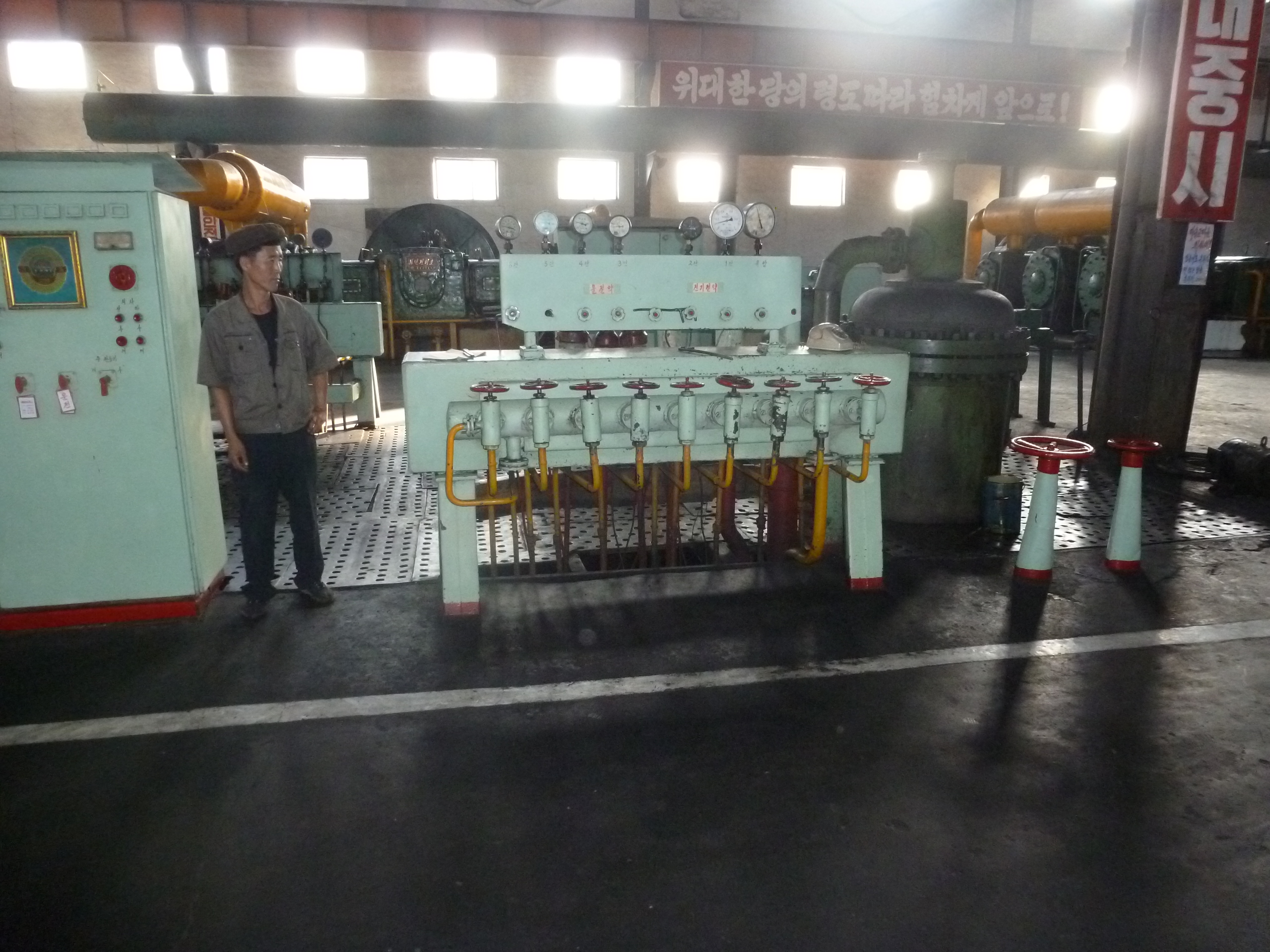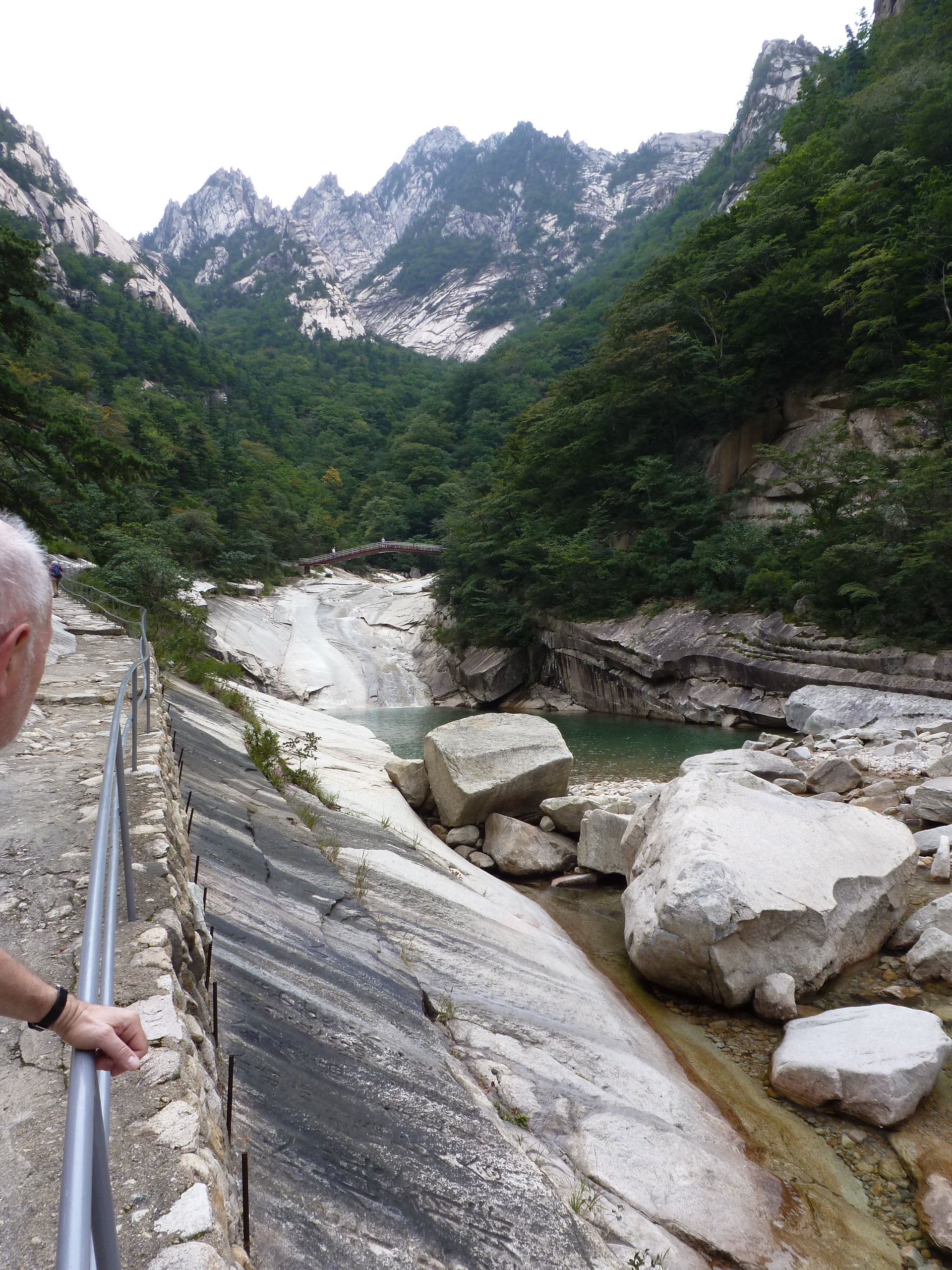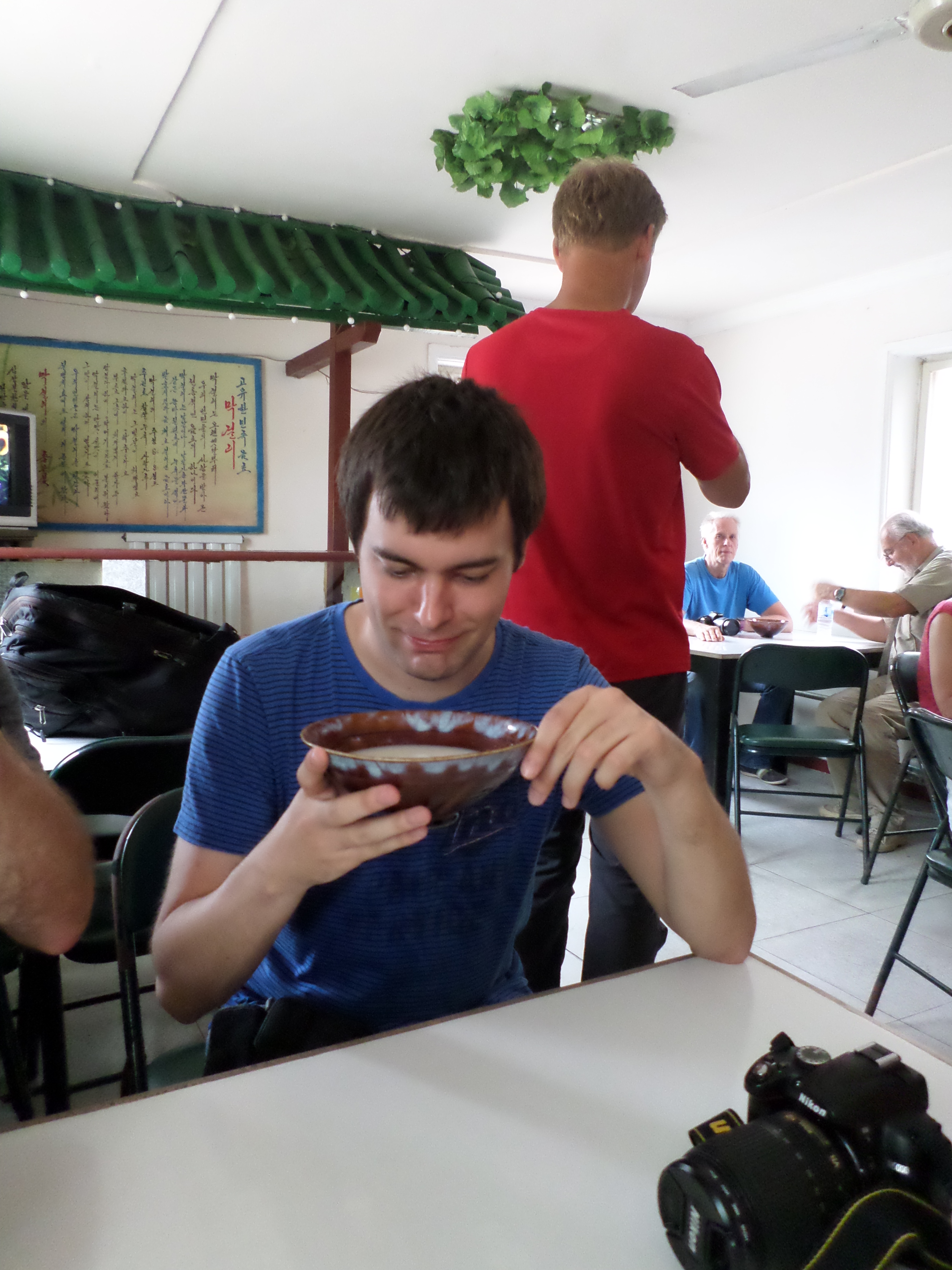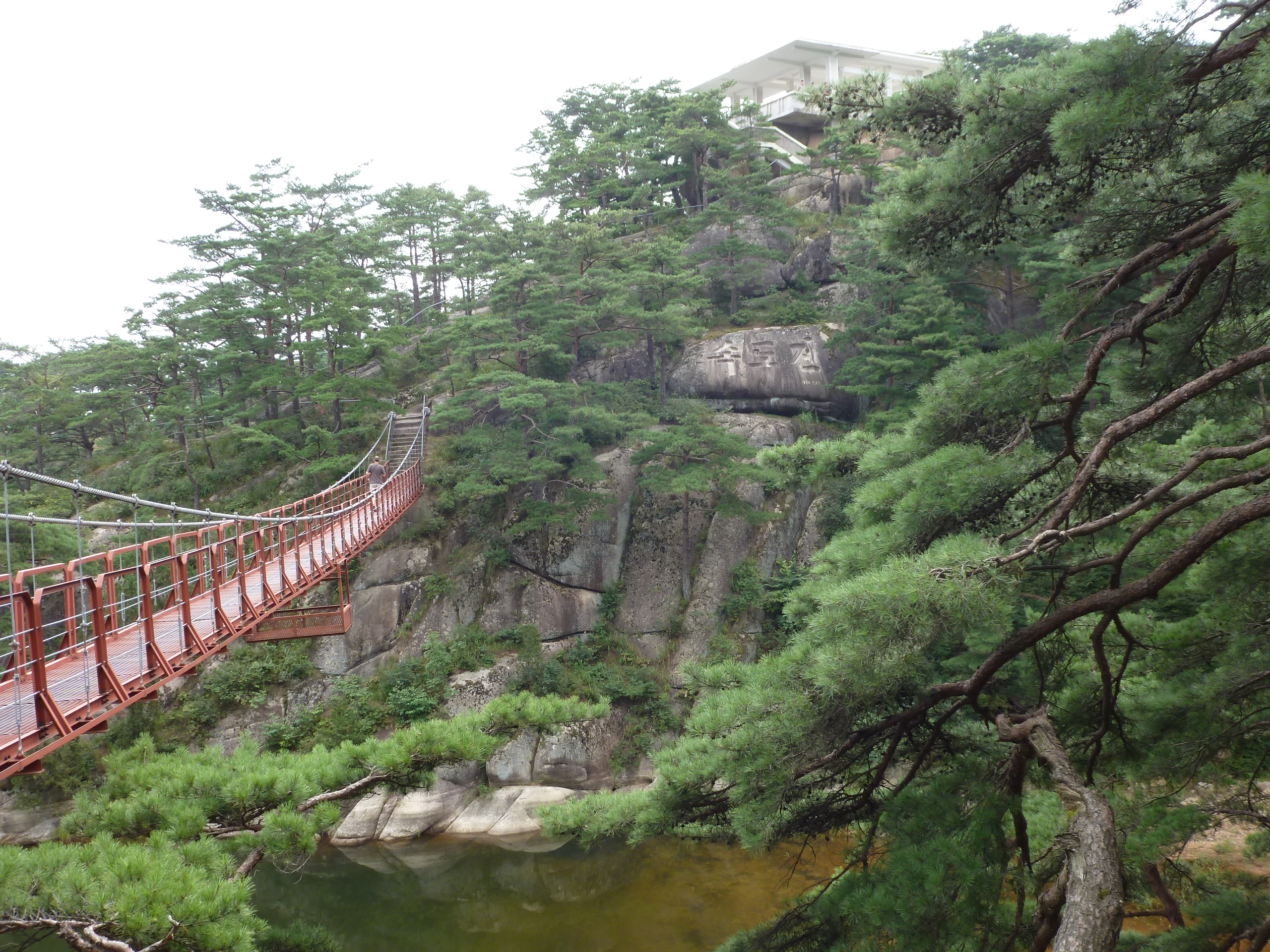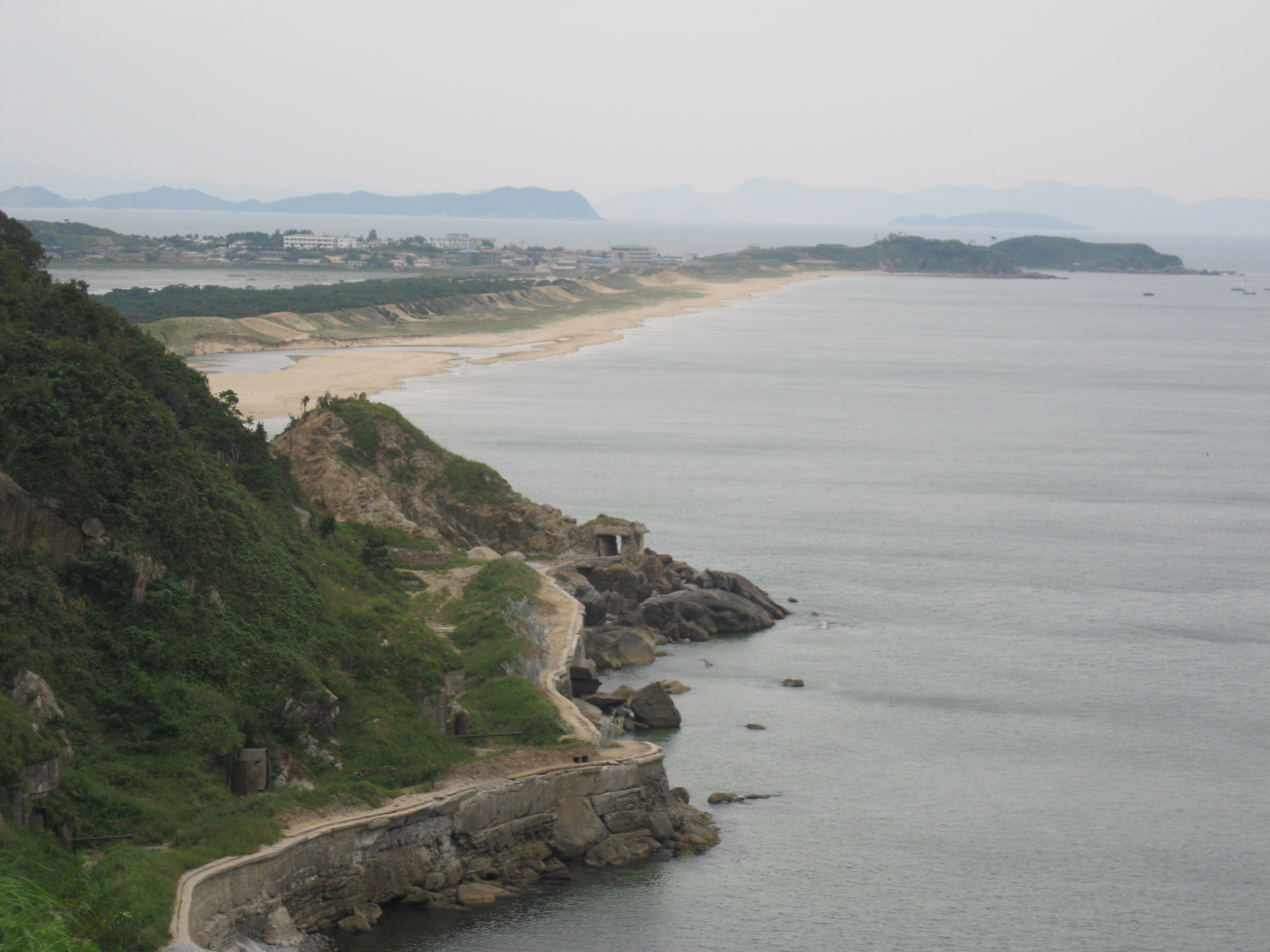In Peking hebben we enkele uren tijd om ons voor te bereiden op de treinreis richting Noord-Korea. De trein vertrok rond 6u 's avonds. De volgende ochtend komen we aan in Dandong, een Chinese stad die grenst aan Noord-Korea.Het station van PekingDe slaapcabineHet restaurant op de trein. Een deel van het treinpersoneel was er al aan het eten. Ik besloot dan ook maar iets te eten. "Can I have a knife and fork?". "No sowwy". En de chinezen maar lachen.Op dag 3 arriveren we in Dandong, waar we een ontbijt krijgen. De rest van de treinreis wordt verdergezet op een andere trein richting de Noord-Koreaanse hoofdstad Pyongyang.Aankomst in DandongDandongIn de trein over de China-Noord-Korea Vriendschapsbrug. De Yalu rivier die we oversteken maakt een groot deel uit van de grens tussen China en Noord-Korea.Parallel loopt nog een brug, maar deze werd grotendeels vernield tijdens de Koreaanse oorlog.Links: Noord-Korea Rechts: ChinaAl snel verschijnen de portretten van de (overleden) grote leiders Kim Il Sung (links) en Kim Jong Il (rechts). Die zien we overal in Noord-Korea.Langs het platteland zien we vooral rijstvelden.Openbare werkenOnze Nederlandse reisbegeleider Jan is zeer fier op zijn Noord-Koreaanse badge. Deze badges worden door bijna alle Noord-Koreanen gedragen. Als buitenlander kan je deze badge enkel uitgereikt krijgen als je je loyaliteit bewezen hebt.In onze wagon zitten ook enkele Chinese toeristen. De meeste toeristen in Noord-Korea zijn Chinezen.Bij een tussenstop worden we gecontroleerd door Noord-Koreaanse militairen. Alle fototoestellen en telefoons worden geregistreerd, boeken en magazines worden nagekeken. Bagages worden slechts steekproefsgewijs doorgelicht. Onze paspoorten worden ook in beslag genomen. Die krijgen we pas terug op het einde van de reis.De rijstvelden zijn meestal in rechthoekige stukken ingedeeld, met bonenplanten om ze te scheiden.Tegen de avond rijden we Pyongyang binnen. Het volledige treintraject van Peking tot Pyongyang is 1371km lang en deden we ongeveer 24u over.Op dag 4 rijden we met de bus naar de industriestad Hamhung (함흥시). Hier bezoeken we oa. een fabriek van kunstmeststof.Het Yanggakdo International Hotel in Pyongyang waar we deze eerste nacht verbleven. Later keren we hier nog terug.Een tussenstop aan een meer langs het bergachtige landschap.Simon en ikDe bus waar we heel de reis mee rondtrokkenEen fotostop langs het bergachtige landschapDe gidsen vermelden dat zowat driekwart van het land bergen zijn. Omdat de Noord-Koreanen er naar streven om volledig zelfvoorzienend te zijn, wordt bijna alle vlakke grond gebruikt voor landbouw.Aan de linkerkant zie je onze Koreaanse gidsen. Meestal spreken Koreanen elkaar aan met hun volledige naam, maar gemakkelijkheidshalve mochten wij ze aanspreken als miss Kim (links) en miss Ha (rechts).Even dalen we af om een waterval te bezoeken. We picknicken hier in de buurt.De waterval zou in 2001 ontdekt zijn door Kim Jong Il, dankzij zijn fantastisch gehoor.BronwaterDit was een van de weinige maaltijden die ik volledig op kreeg. Op de bus krijgen we dan te horen dat de lunchschotels achtergelaten werden voor kinderen die de overschot zouden eten...De meeste wegen bestaan uit betonplaten.Een propagandabord langs de wegWe komen aan in Hamhung, de tweede grootste stad van Noord-Korea (~ 800.000 inwoners). We rijden hier voorbij een van de talrijke mozaïeken die we te zien zullen krijgen. Links: Kim Il Sung Midden: Kim Jong Il Rechts: Kim Jong Suk (de eerste vrouw van Kim Il Sung)Hamhung is nog maar enkele jaren "open" voor toeristen.Een fabriek van kunstmeststofBij elke bezienswaardigheid krijgen we te horen hoe vaak en wanneer juist de grote leiders die plaats bezocht hebben. Vaak zijn er mozaïeken die hun bezoek afbeelden.Binnen in de fabriekEr zijn maar weinig fabriekswerkers aanwezig, maar ze poseren wel graag voor een foto.'s avonds verblijven we in het Majon Tourist Resort aan de Oost-Koreaanse zee. Hier nemen we een frisse duik in het water.De huisjes waar we verblijven zijn vlak aan het strand.Onze zwembroeken buiten gehangen, maar echt droog werden ze niet door het vochtige klimaat.Het avondmaal. Zoals gewoonlijk werden er nog voortdurend bordjes bij gezet. Als je al vol zit krijg je dan nog een kom rijst en soep.'s middags en 's avonds was er als drank meestal plat water en bier, met de mogelijkheid om "juice" te drinken in plaats van bier. Dat was een soort appel/peren sap (niet op de foto).Onze kamerHier was geen stromend water, en diende het bad als waterreservoir. Wassen moest "op z'n Bangladesh" door een teiltje water over je gieten. In de rode emmer kon water elektrisch verwarmd worden.Op dag 5 bezoeken we nog enkele plaatsen in Hamhung, en vertrekken dan richting Mt. Kumgang. Onderweg bezoeken we oa. nog de kuststad Wonsan.Het huis van de voormalige koning Taejo van Joseon in Hamhung. Hij richtte de Koreaanse Joseondynastie op in 1392, die eindigde in 1897.Een zeer oude boomBuiten het huis stond een groep Koreaanse studenten te wachten.Een aangelegde (niet natuurlijke) heuvel met grote bronzen beelden van de leidersDe lokale gids die ons een woordje uitleg gaf. De plaatselijke gidsen spraken meestal Koreaans, dat dan naar Engels vertaald werd door onze gids miss Kim.Hamhung Grand TheatreWonsanDit verkeersbord leek met de hand geschilderd te zijn.Bezoek aan een de Chonsam coöperatieve boerderijEen persimmon boomOok de grote leiders zijn hier geweest.In het winkeltje van de boerderij kochten we enkele gedroogde persimmons.Naast de boerderij was er een kleuterschool. De kinderen zongen een liedje en wuifden ons dan uit.Iets verderop bezoeken we nog het huis van de boerin die ons begeleidde.Dit huis heeft een soort vloerverwarming die hier vaak toegepast zou worden. Op internet vond ik dit systeem terug als "Ondol".Wat voor een decoder is dat onder de TV? Telenet of Belgacom?Ten slotte bezochten we nog een boeddhistische tempel...Maar bij de tempel zelf mochten we niet komen, omdat er constructi