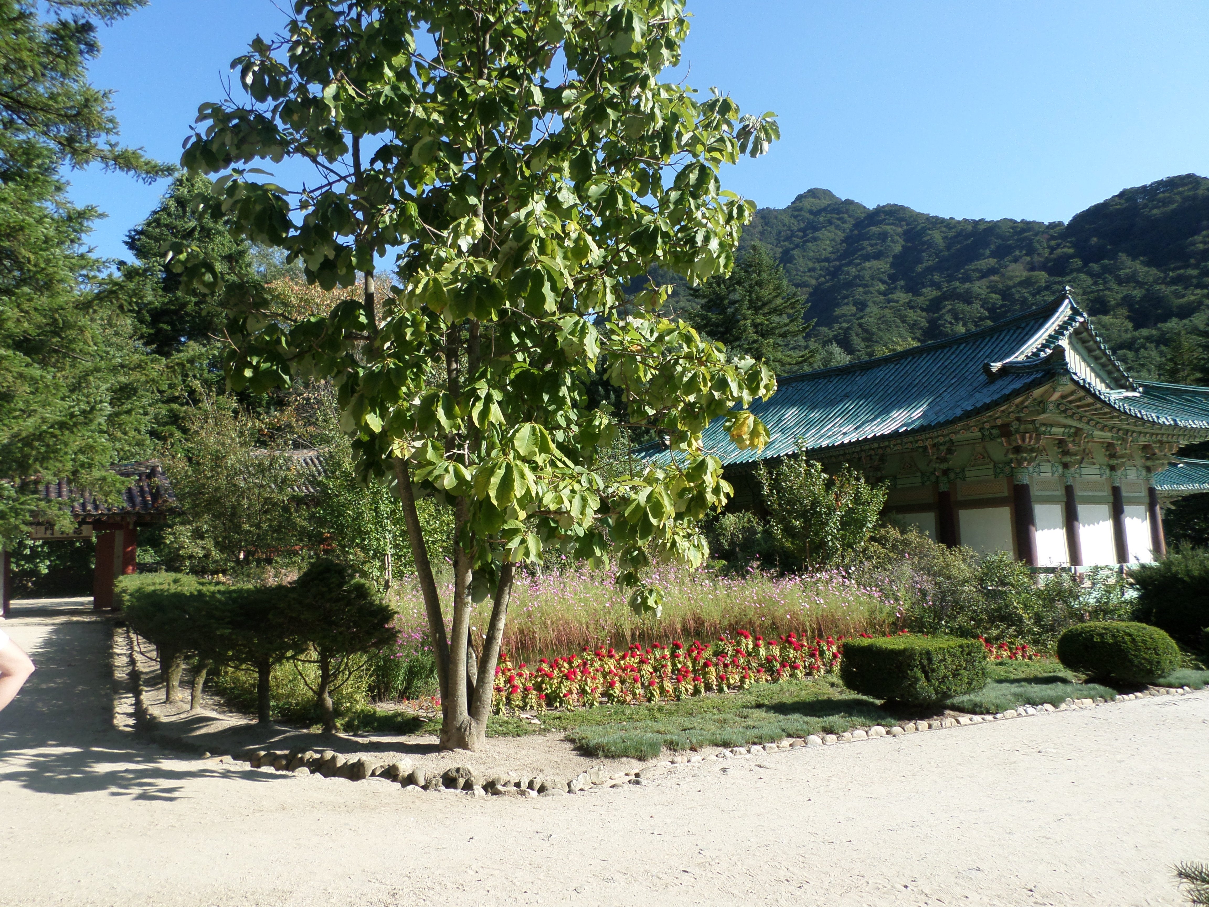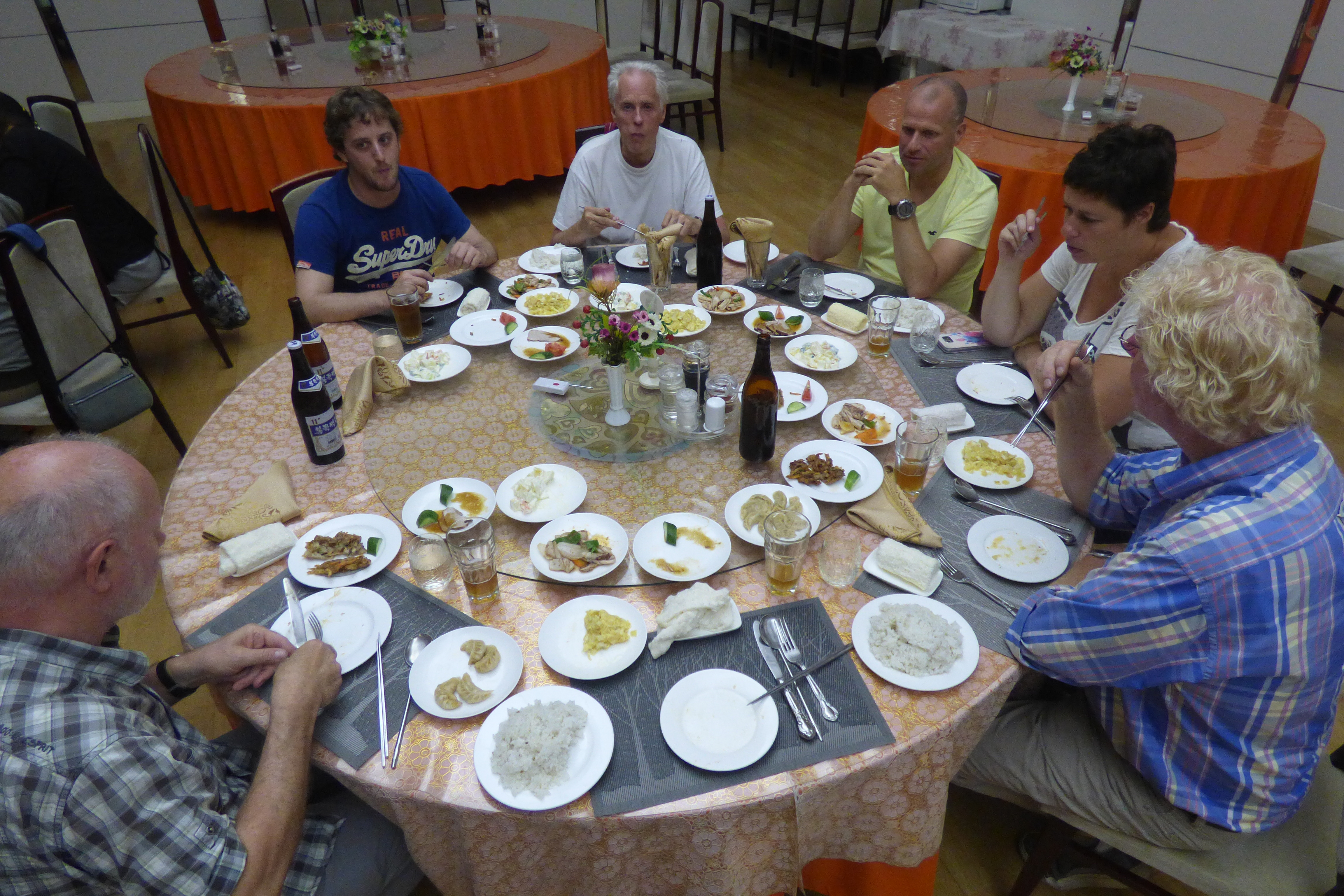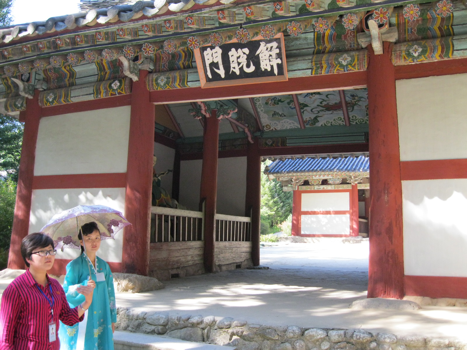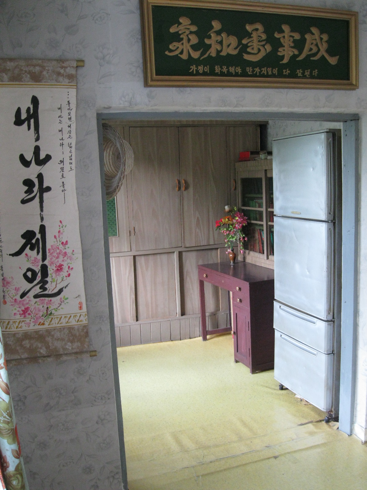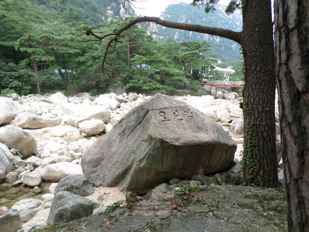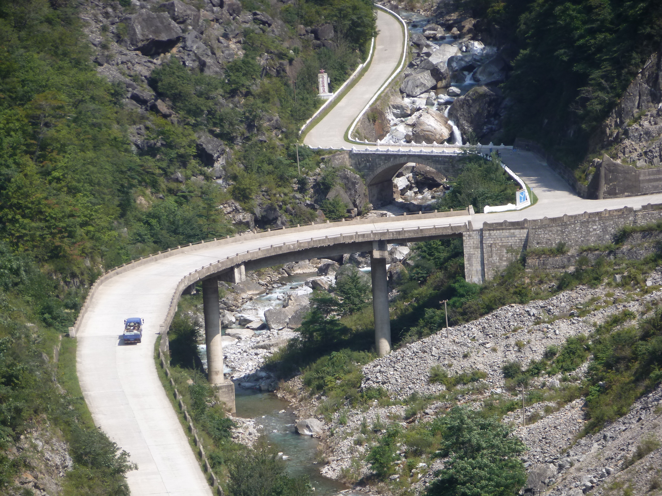 In Peking hebben we enkele uren tijd om ons voor te bereiden op de treinreis richting Noord-Korea. De trein vertrok rond 6u 's avonds. De volgende ochtend komen we aan in Dandong, een Chinese stad die grenst aan Noord-Korea.Het station van PekingDe slaapcabineHet restaurant op de trein. Een deel van het treinpersoneel was er al aan het eten. Ik besloot dan ook maar iets te eten. "Can I have a knife and fork?". "No sowwy". En de chinezen maar lachen.Op dag 3 arriveren we in Dandong, waar we een ontbijt krijgen. De rest van de treinreis wordt verdergezet op een andere trein richting de Noord-Koreaanse hoofdstad Pyongyang.Aankomst in DandongDandongIn de trein over de China-Noord-Korea Vriendschapsbrug. De Yalu rivier die we oversteken maakt een groot deel uit van de grens tussen China en Noord-Korea.Parallel loopt nog een brug, maar deze werd grotendeels vernield tijdens de Koreaanse oorlog.Links: Noord-Korea Rechts: ChinaAl snel verschijnen de portretten van de (overleden) grote leiders Kim Il Sung (links) en Kim Jong Il (rechts). Die zien we overal in Noord-Korea.Langs het platteland zien we vooral rijstvelden.Openbare werkenOnze Nederlandse reisbegeleider Jan is zeer fier op zijn Noord-Koreaanse badge. Deze badges worden door bijna alle Noord-Koreanen gedragen. Als buitenlander kan je deze badge enkel uitgereikt krijgen als je je loyaliteit bewezen hebt.In onze wagon zitten ook enkele Chinese toeristen. De meeste toeristen in Noord-Korea zijn Chinezen.Bij een tussenstop worden we gecontroleerd door Noord-Koreaanse militairen. Alle fototoestellen en telefoons worden geregistreerd, boeken en magazines worden nagekeken. Bagages worden slechts steekproefsgewijs doorgelicht. Onze paspoorten worden ook in beslag genomen. Die krijgen we pas terug op het einde van de reis.De rijstvelden zijn meestal in rechthoekige stukken ingedeeld, met bonenplanten om ze te scheiden.Tegen de avond rijden we Pyongyang binnen. Het volledige treintraject van Peking tot Pyongyang is 1371km lang en deden we ongeveer 24u over.Op dag 4 rijden we met de bus naar de industriestad Hamhung (함흥시). Hier bezoeken we oa. een fabriek van kunstmeststof.Het Yanggakdo International Hotel in Pyongyang waar we deze eerste nacht verbleven. Later keren we hier nog terug.Een tussenstop aan een meer langs het bergachtige landschap.Simon en ikDe bus waar we heel de reis mee rondtrokkenEen fotostop langs het bergachtige landschapDe gidsen vermelden dat zowat driekwart van het land bergen zijn. Omdat de Noord-Koreanen er naar streven om volledig zelfvoorzienend te zijn, wordt bijna alle vlakke grond gebruikt voor landbouw.Aan de linkerkant zie je onze Koreaanse gidsen. Meestal spreken Koreanen elkaar aan met hun volledige naam, maar gemakkelijkheidshalve mochten wij ze aanspreken als miss Kim (links) en miss Ha (rechts).Even dalen we af om een waterval te bezoeken. We picknicken hier in de buurt.De waterval zou in 2001 ontdekt zijn door Kim Jong Il, dankzij zijn fantastisch gehoor.BronwaterDit was een van de weinige maaltijden die ik volledig op kreeg. Op de bus krijgen we dan te horen dat de lunchschotels achtergelaten werden voor kinderen die de overschot zouden eten...De meeste wegen bestaan uit betonplaten.Een propagandabord langs de wegWe komen aan in Hamhung, de tweede grootste stad van Noord-Korea (~ 800.000 inwoners). We rijden hier voorbij een van de talrijke mozaïeken die we te zien zullen krijgen. Links: Kim Il Sung Midden: Kim Jong Il Rechts: Kim Jong Suk (de eerste vrouw van Kim Il Sung)Hamhung is nog maar enkele jaren "open" voor toeristen.Een fabriek van kunstmeststofBij elke bezienswaardigheid krijgen we te horen hoe vaak en wanneer juist de grote leiders die plaats bezocht hebben. Vaak zijn er mozaïeken die hun bezoek afbeelden.Binnen in de fabriekEr zijn maar weinig fabriekswerkers aanwezig, maar ze poseren wel graag voor een foto.'s avonds verblijven we in het Majon Tourist Resort aan de Oost-Koreaanse zee. Hier nemen we een frisse duik in het water.De huisjes waar we verblijven zijn vlak aan het strand.Onze zwembroeken buiten gehangen, maar echt droog werden ze niet door het vochtige klimaat.Het avondmaal. Zoals gewoonlijk werden er nog voortdurend bordjes bij gezet. Als je al vol zit krijg je dan nog een kom rijst en soep.'s middags en 's avonds was er als drank meestal plat water en bier, met de mogelijkheid om "juice" te drinken in plaats van bier. Dat was een soort appel/peren sap (niet op de foto).Onze kamerHier was geen stromend water, en diende het bad als waterreservoir. Wassen moest "op z'n Bangladesh" door een teiltje water over je gieten. In de rode emmer kon water elektrisch verwarmd worden.Op dag 5 bezoeken we nog enkele plaatsen in Hamhung, en vertrekken dan richting Mt. Kumgang. Onderweg bezoeken we oa. nog de kuststad Wonsan.Het huis van de voormalige koning Taejo van Joseon in Hamhung. Hij richtte de Koreaanse Joseondynastie op in 1392, die eindigde in 1897.Een zeer oude boomBuiten het huis stond een groep Koreaanse studenten te wachten.Een aangelegde (niet natuurlijke) heuvel met grote bronzen beelden van de leidersDe lokale gids die ons een woordje uitleg gaf. De plaatselijke gidsen spraken meestal Koreaans, dat dan naar Engels vertaald werd door onze gids miss Kim.Hamhung Grand TheatreWonsanDit verkeersbord leek met de hand geschilderd te zijn.Bezoek aan een de Chonsam coöperatieve boerderijEen persimmon boomOok de grote leiders zijn hier geweest.In het winkeltje van de boerderij kochten we enkele gedroogde persimmons.Naast de boerderij was er een kleuterschool. De kinderen zongen een liedje en wuifden ons dan uit.Iets verderop bezoeken we nog het huis van de boerin die ons begeleidde.Dit huis heeft een soort vloerverwarming die hier vaak toegepast zou worden. Op internet vond ik dit systeem terug als "Ondol".Wat voor een decoder is dat onder de TV? Telenet of Belgacom?Ten slotte bezochten we nog een boeddhistische tempel...Maar bij de tempel zelf mochten we niet komen, omdat er constructi