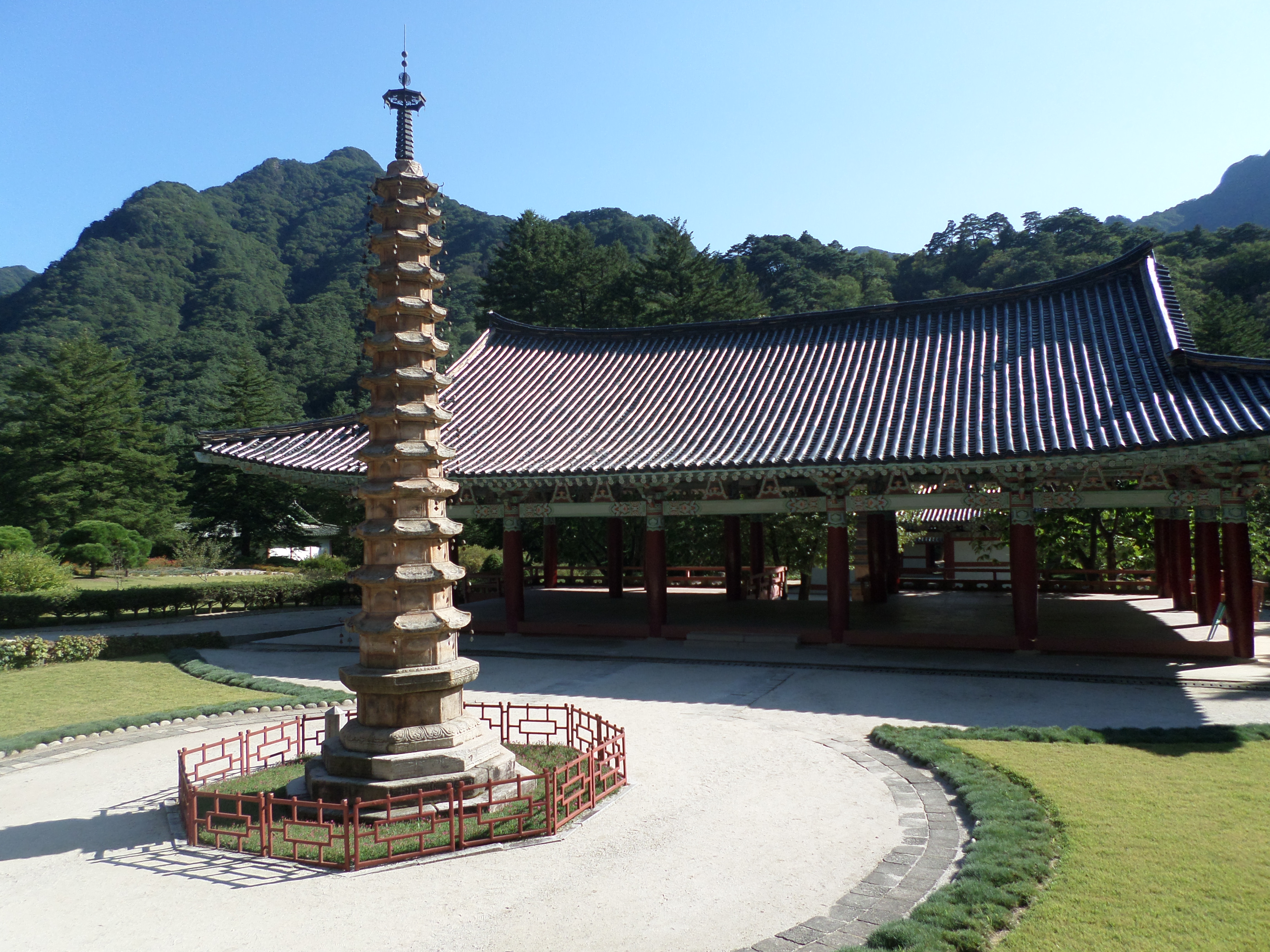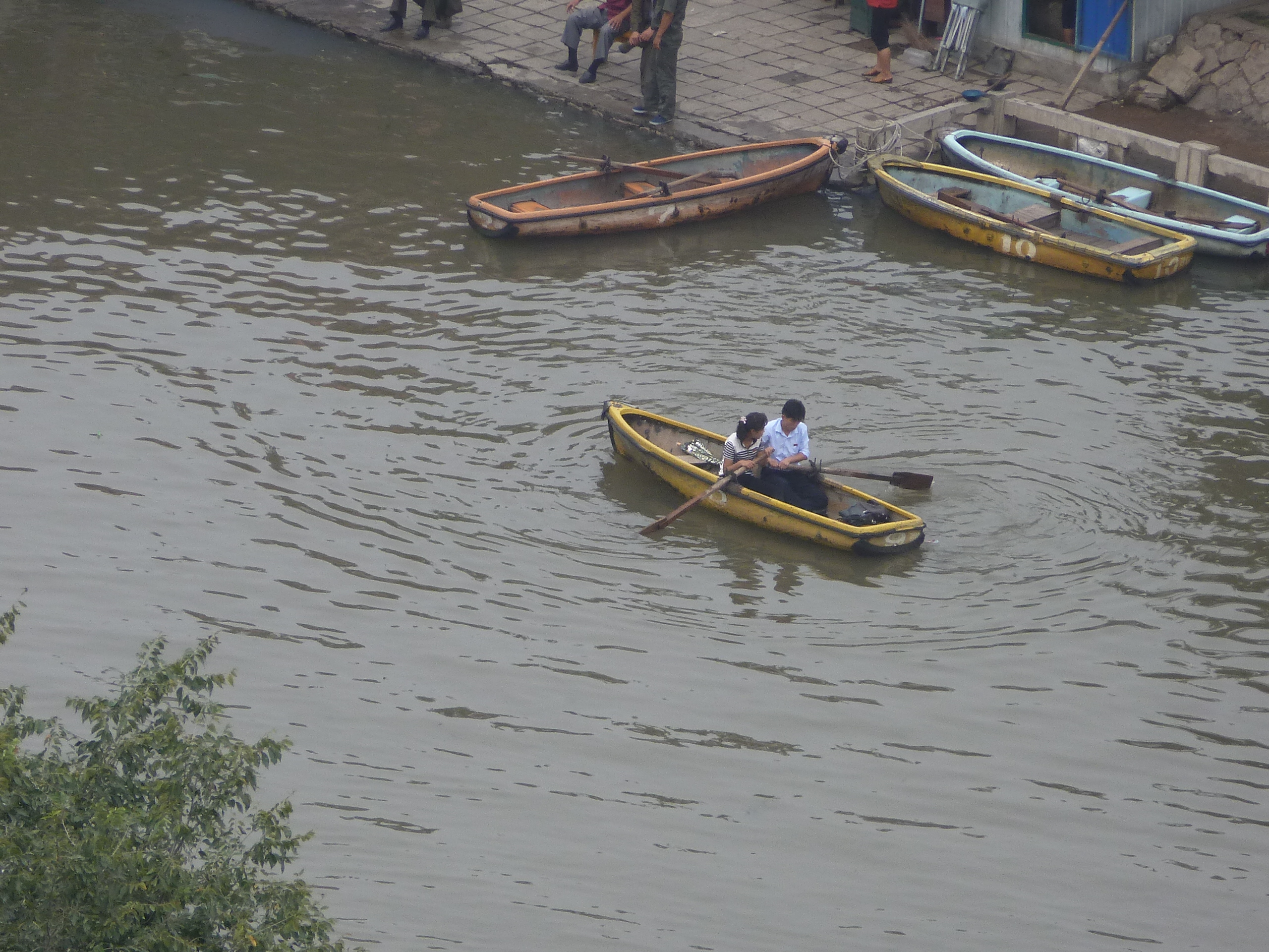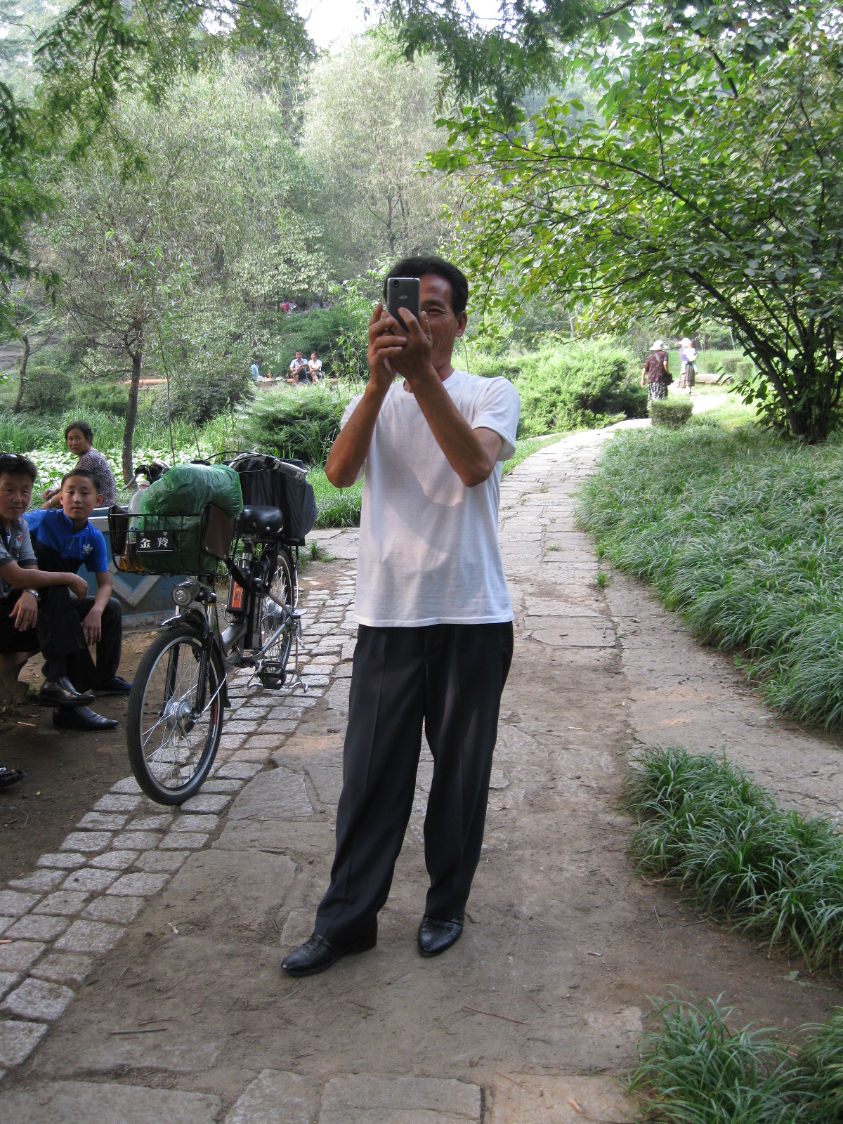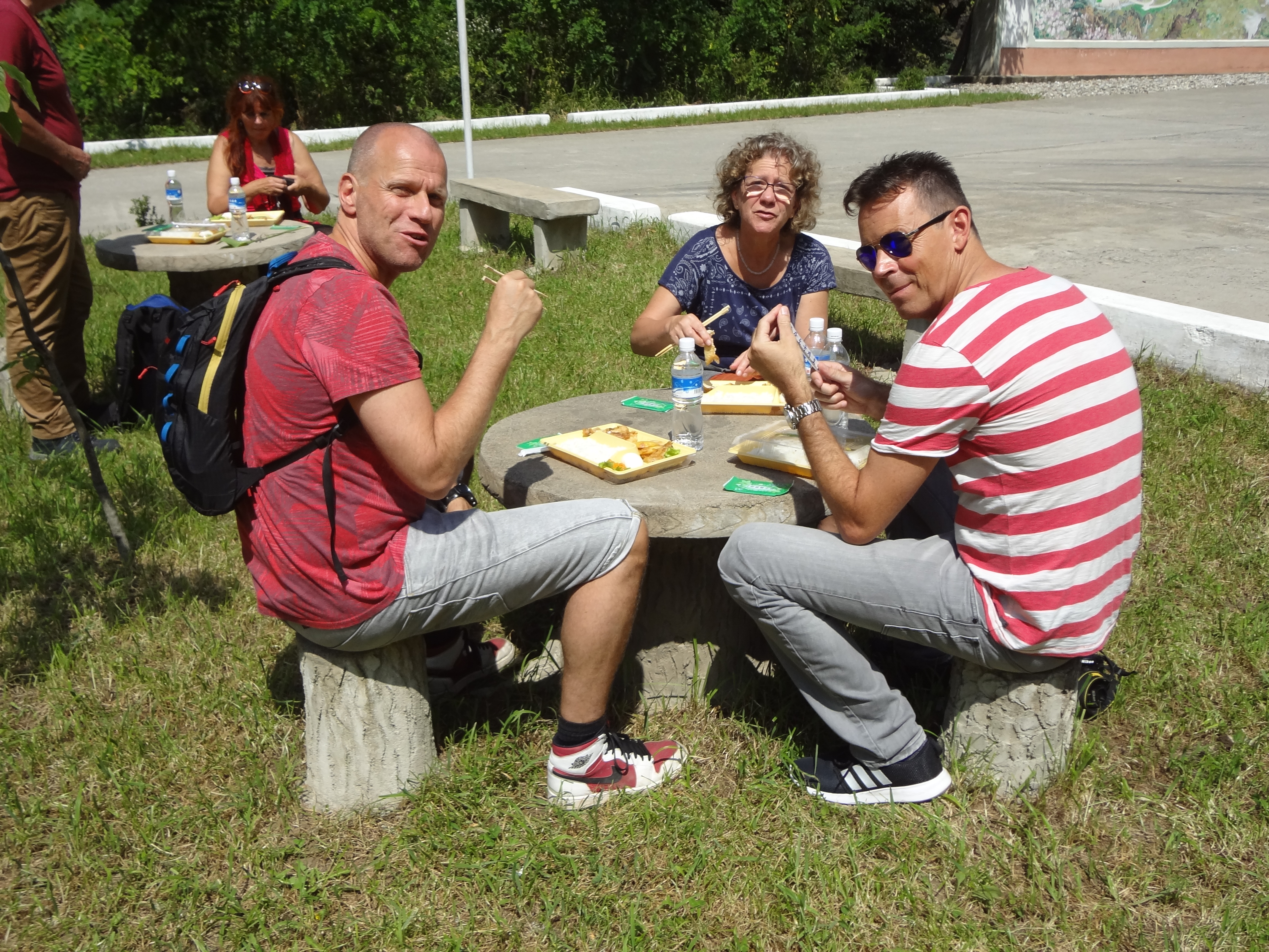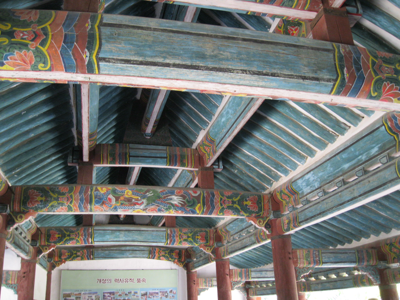 In Peking hebben we enkele uren tijd om ons voor te bereiden op de treinreis richting Noord-Korea. De trein vertrok rond 6u 's avonds. De volgende ochtend komen we aan in Dandong, een Chinese stad die grenst aan Noord-Korea.Het station van PekingDe slaapcabineHet restaurant op de trein. Een deel van het treinpersoneel was er al aan het eten. Ik besloot dan ook maar iets te eten. "Can I have a knife and fork?". "No sowwy". En de chinezen maar lachen.Op dag 3 arriveren we in Dandong, waar we een ontbijt krijgen. De rest van de treinreis wordt verdergezet op een andere trein richting de Noord-Koreaanse hoofdstad Pyongyang.Aankomst in DandongDandongIn de trein over de China-Noord-Korea Vriendschapsbrug. De Yalu rivier die we oversteken maakt een groot deel uit van de grens tussen China en Noord-Korea.Parallel loopt nog een brug, maar deze werd grotendeels vernield tijdens de Koreaanse oorlog.Links: Noord-Korea Rechts: ChinaAl snel verschijnen de portretten van de (overleden) grote leiders Kim Il Sung (links) en Kim Jong Il (rechts). Die zien we overal in Noord-Korea.Langs het platteland zien we vooral rijstvelden.Openbare werkenOnze Nederlandse reisbegeleider Jan is zeer fier op zijn Noord-Koreaanse badge. Deze badges worden door bijna alle Noord-Koreanen gedragen. Als buitenlander kan je deze badge enkel uitgereikt krijgen als je je loyaliteit bewezen hebt.In onze wagon zitten ook enkele Chinese toeristen. De meeste toeristen in Noord-Korea zijn Chinezen.Bij een tussenstop worden we gecontroleerd door Noord-Koreaanse militairen. Alle fototoestellen en telefoons worden geregistreerd, boeken en magazines worden nagekeken. Bagages worden slechts steekproefsgewijs doorgelicht. Onze paspoorten worden ook in beslag genomen. Die krijgen we pas terug op het einde van de reis.De rijstvelden zijn meestal in rechthoekige stukken ingedeeld, met bonenplanten om ze te scheiden.Tegen de avond rijden we Pyongyang binnen. Het volledige treintraject van Peking tot Pyongyang is 1371km lang en deden we ongeveer 24u over.Op dag 4 rijden we met de bus naar de industriestad Hamhung (함흥시). Hier bezoeken we oa. een fabriek van kunstmeststof.Het Yanggakdo International Hotel in Pyongyang waar we deze eerste nacht verbleven. Later keren we hier nog terug.Een tussenstop aan een meer langs het bergachtige landschap.Simon en ikDe bus waar we heel de reis mee rondtrokkenEen fotostop langs het bergachtige landschapDe gidsen vermelden dat zowat driekwart van het land bergen zijn. Omdat de Noord-Koreanen er naar streven om volledig zelfvoorzienend te zijn, wordt bijna alle vlakke grond gebruikt voor landbouw.Aan de linkerkant zie je onze Koreaanse gidsen. Meestal spreken Koreanen elkaar aan met hun volledige naam, maar gemakkelijkheidshalve mochten wij ze aanspreken als miss Kim (links) en miss Ha (rechts).Even dalen we af om een waterval te bezoeken. We picknicken hier in de buurt.De waterval zou in 2001 ontdekt zijn door Kim Jong Il, dankzij zijn fantastisch gehoor.BronwaterDit was een van de weinige maaltijden die ik volledig op kreeg. Op de bus krijgen we dan te horen dat de lunchschotels achtergelaten werden voor kinderen die de overschot zouden eten...De meeste wegen bestaan uit betonplaten.Een propagandabord langs de wegWe komen aan in Hamhung, de tweede grootste stad van Noord-Korea (~ 800.000 inwoners). We rijden hier voorbij een van de talrijke mozaïeken die we te zien zullen krijgen. Links: Kim Il Sung Midden: Kim Jong Il Rechts: Kim Jong Suk (de eerste vrouw van Kim Il Sung)Hamhung is nog maar enkele jaren "open" voor toeristen.Een fabriek van kunstmeststofBij elke bezienswaardigheid krijgen we te horen hoe vaak en wanneer juist de grote leiders die plaats bezocht hebben. Vaak zijn er mozaïeken die hun bezoek afbeelden.Binnen in de fabriekEr zijn maar weinig fabriekswerkers aanwezig, maar ze poseren wel graag voor een foto.'s avonds verblijven we in het Majon Tourist Resort aan de Oost-Koreaanse zee. Hier nemen we een frisse duik in het water.De huisjes waar we verblijven zijn vlak aan het strand.Onze zwembroeken buiten gehangen, maar echt droog werden ze niet door het vochtige klimaat.Het avondmaal. Zoals gewoonlijk werden er nog voortdurend bordjes bij gezet. Als je al vol zit krijg je dan nog een kom rijst en soep.'s middags en 's avonds was er als drank meestal plat water en bier, met de mogelijkheid om "juice" te drinken in plaats van bier. Dat was een soort appel/peren sap (niet op de foto).Onze kamerHier was geen stromend water, en diende het bad als waterreservoir. Wassen moest "op z'n Bangladesh" door een teiltje water over je gieten. In de rode emmer kon water elektrisch verwarmd worden.Op dag 5 bezoeken we nog enkele plaatsen in Hamhung, en vertrekken dan richting Mt. Kumgang. Onderweg bezoeken we oa. nog de kuststad Wonsan.Het huis van de voormalige koning Taejo van Joseon in Hamhung. Hij richtte de Koreaanse Joseondynastie op in 1392, die eindigde in 1897.Een zeer oude boomBuiten het huis stond een groep Koreaanse studenten te wachten.Een aangelegde (niet natuurlijke) heuvel met grote bronzen beelden van de leidersDe lokale gids die ons een woordje uitleg gaf. De plaatselijke gidsen spraken meestal Koreaans, dat dan naar Engels vertaald werd door onze gids miss Kim.Hamhung Grand TheatreWonsanDit verkeersbord leek met de hand geschilderd te zijn.Bezoek aan een de Chonsam coöperatieve boerderijEen persimmon boomOok de grote leiders zijn hier geweest.In het winkeltje van de boerderij kochten we enkele gedroogde persimmons.Naast de boerderij was er een kleuterschool. De kinderen zongen een liedje en wuifden ons dan uit.Iets verderop bezoeken we nog het huis van de boerin die ons begeleidde.Dit huis heeft een soort vloerverwarming die hier vaak toegepast zou worden. Op internet vond ik dit systeem terug als "Ondol".Wat voor een decoder is dat onder de TV? Telenet of Belgacom?Ten slotte bezochten we nog een boeddhistische tempel...Maar bij de tempel zelf mochten we niet komen, omdat er constructi