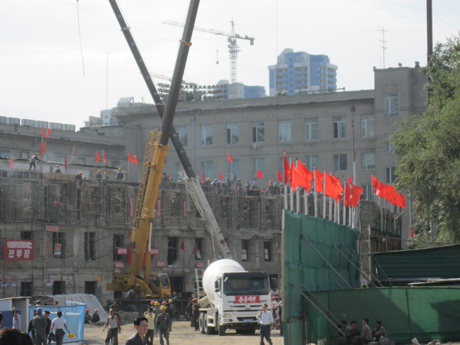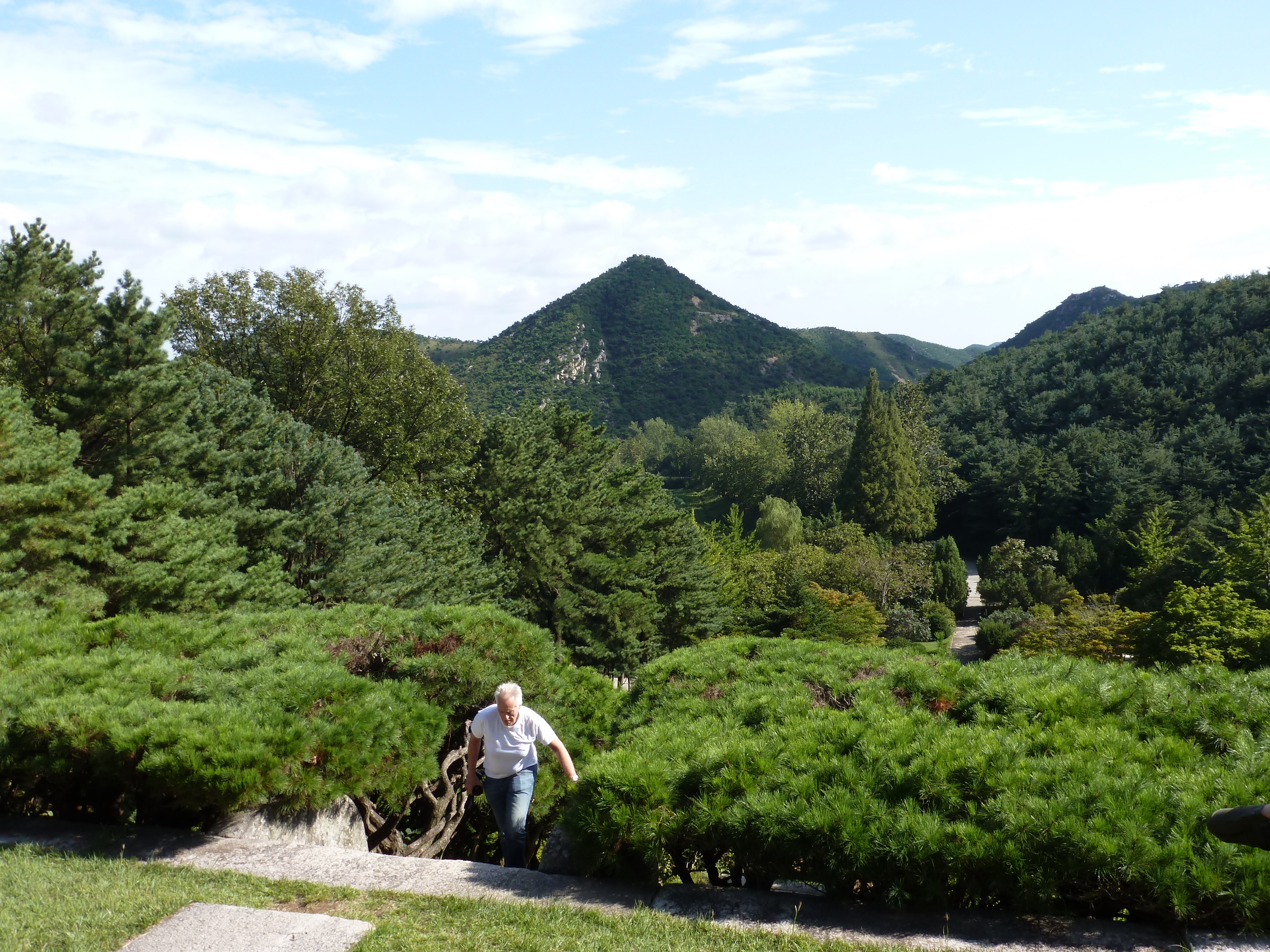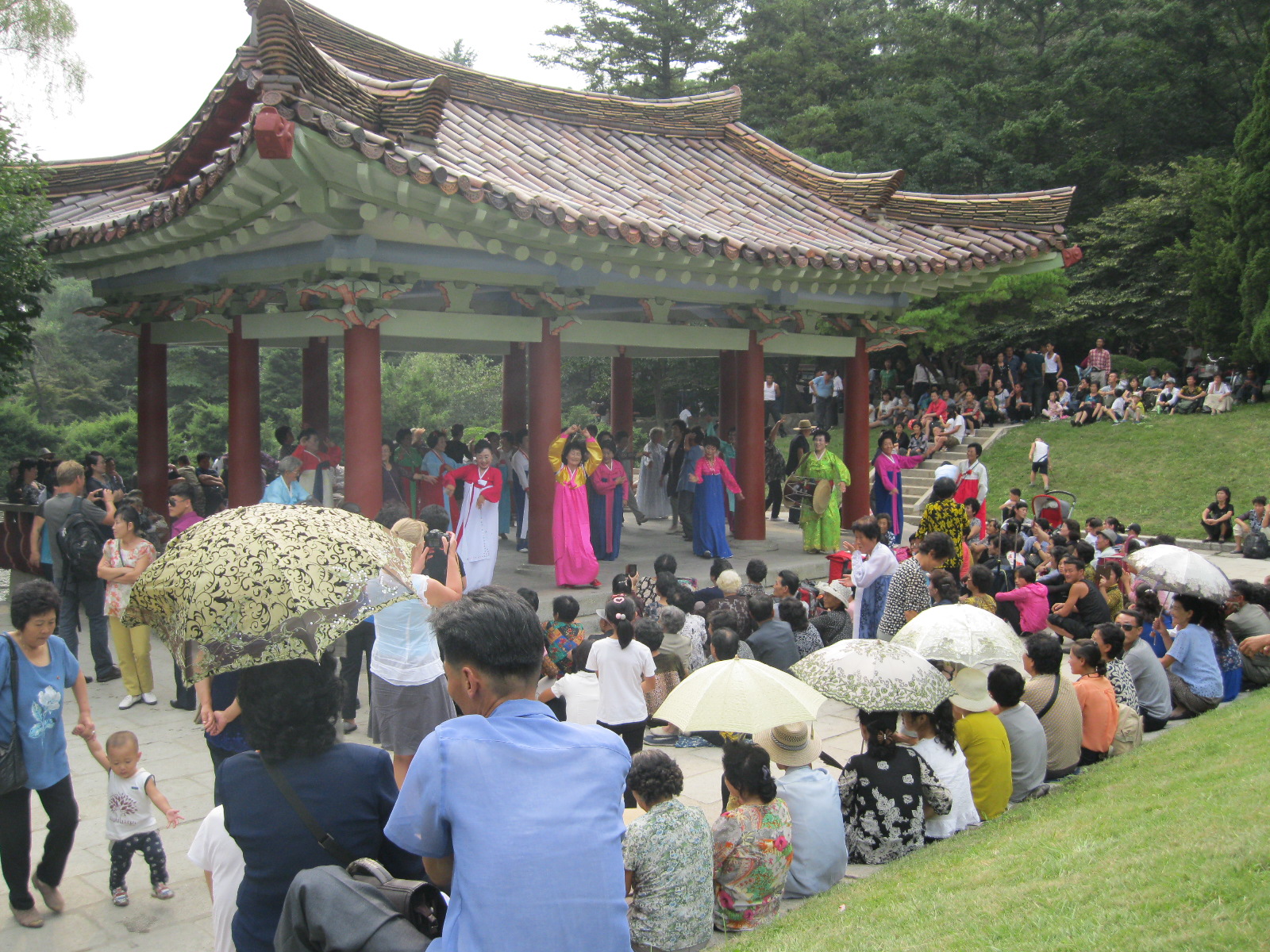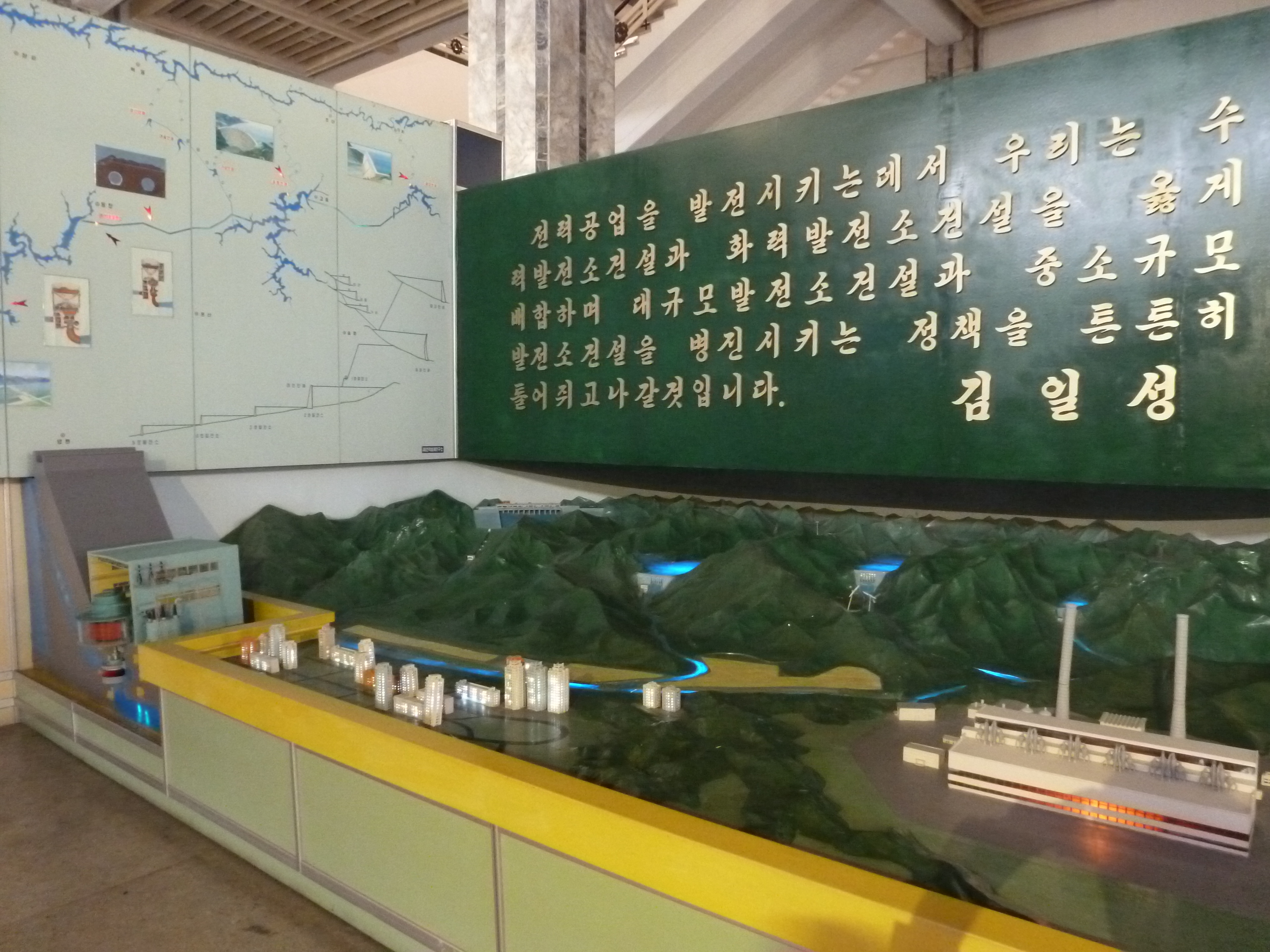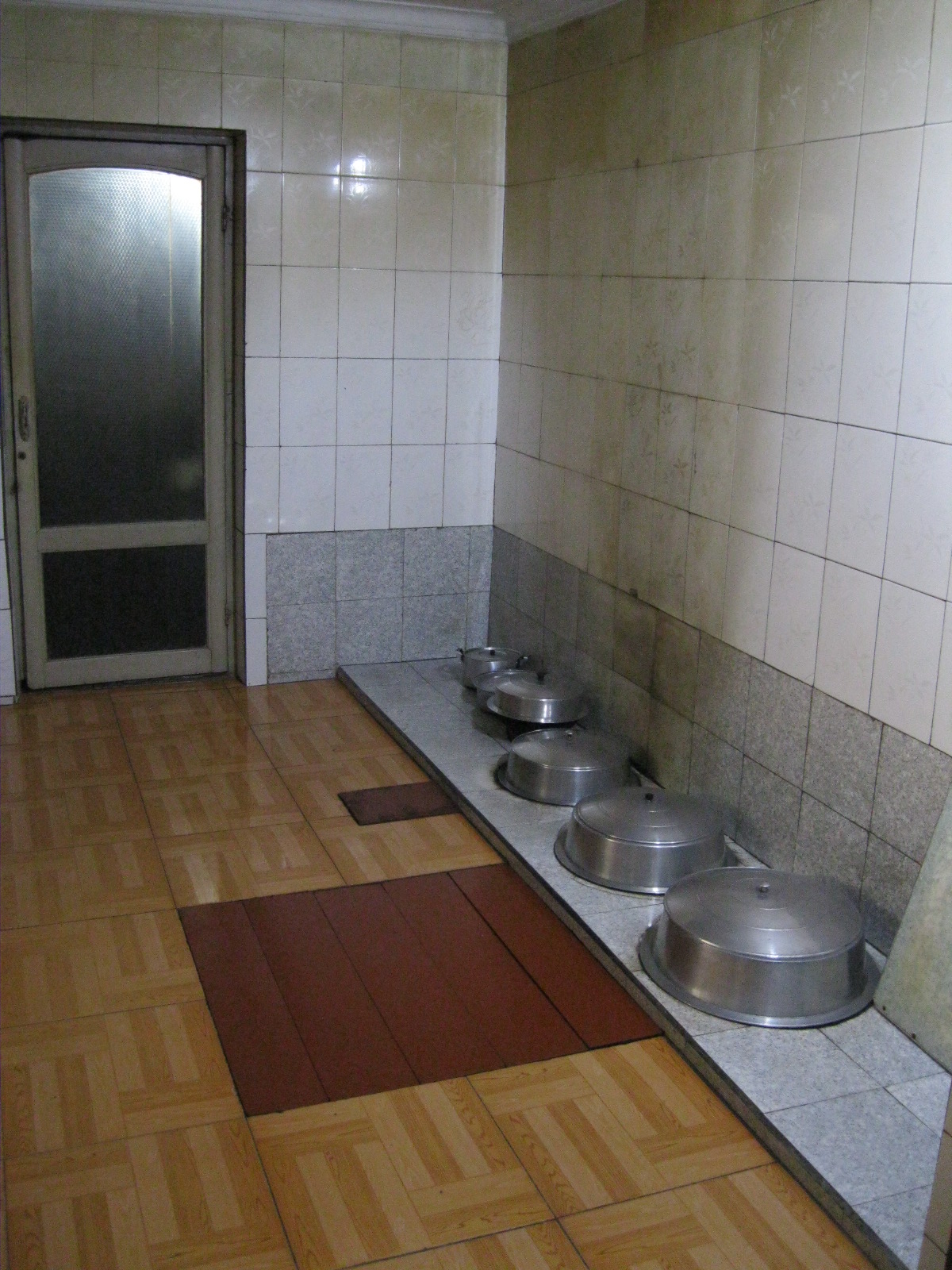 In Peking hebben we enkele uren tijd om ons voor te bereiden op de treinreis richting Noord-Korea. De trein vertrok rond 6u 's avonds. De volgende ochtend komen we aan in Dandong, een Chinese stad die grenst aan Noord-Korea.Het station van PekingDe slaapcabineHet restaurant op de trein. Een deel van het treinpersoneel was er al aan het eten. Ik besloot dan ook maar iets te eten. "Can I have a knife and fork?". "No sowwy". En de chinezen maar lachen.Op dag 3 arriveren we in Dandong, waar we een ontbijt krijgen. De rest van de treinreis wordt verdergezet op een andere trein richting de Noord-Koreaanse hoofdstad Pyongyang.Aankomst in DandongDandongIn de trein over de China-Noord-Korea Vriendschapsbrug. De Yalu rivier die we oversteken maakt een groot deel uit van de grens tussen China en Noord-Korea.Parallel loopt nog een brug, maar deze werd grotendeels vernield tijdens de Koreaanse oorlog.Links: Noord-Korea Rechts: ChinaAl snel verschijnen de portretten van de (overleden) grote leiders Kim Il Sung (links) en Kim Jong Il (rechts). Die zien we overal in Noord-Korea.Langs het platteland zien we vooral rijstvelden.Openbare werkenOnze Nederlandse reisbegeleider Jan is zeer fier op zijn Noord-Koreaanse badge. Deze badges worden door bijna alle Noord-Koreanen gedragen. Als buitenlander kan je deze badge enkel uitgereikt krijgen als je je loyaliteit bewezen hebt.In onze wagon zitten ook enkele Chinese toeristen. De meeste toeristen in Noord-Korea zijn Chinezen.Bij een tussenstop worden we gecontroleerd door Noord-Koreaanse militairen. Alle fototoestellen en telefoons worden geregistreerd, boeken en magazines worden nagekeken. Bagages worden slechts steekproefsgewijs doorgelicht. Onze paspoorten worden ook in beslag genomen. Die krijgen we pas terug op het einde van de reis.De rijstvelden zijn meestal in rechthoekige stukken ingedeeld, met bonenplanten om ze te scheiden.Tegen de avond rijden we Pyongyang binnen. Het volledige treintraject van Peking tot Pyongyang is 1371km lang en deden we ongeveer 24u over.Op dag 4 rijden we met de bus naar de industriestad Hamhung (함흥시). Hier bezoeken we oa. een fabriek van kunstmeststof.Het Yanggakdo International Hotel in Pyongyang waar we deze eerste nacht verbleven. Later keren we hier nog terug.Een tussenstop aan een meer langs het bergachtige landschap.Simon en ikDe bus waar we heel de reis mee rondtrokkenEen fotostop langs het bergachtige landschapDe gidsen vermelden dat zowat driekwart van het land bergen zijn. Omdat de Noord-Koreanen er naar streven om volledig zelfvoorzienend te zijn, wordt bijna alle vlakke grond gebruikt voor landbouw.Aan de linkerkant zie je onze Koreaanse gidsen. Meestal spreken Koreanen elkaar aan met hun volledige naam, maar gemakkelijkheidshalve mochten wij ze aanspreken als miss Kim (links) en miss Ha (rechts).Even dalen we af om een waterval te bezoeken. We picknicken hier in de buurt.De waterval zou in 2001 ontdekt zijn door Kim Jong Il, dankzij zijn fantastisch gehoor.BronwaterDit was een van de weinige maaltijden die ik volledig op kreeg. Op de bus krijgen we dan te horen dat de lunchschotels achtergelaten werden voor kinderen die de overschot zouden eten...De meeste wegen bestaan uit betonplaten.Een propagandabord langs de wegWe komen aan in Hamhung, de tweede grootste stad van Noord-Korea (~ 800.000 inwoners). We rijden hier voorbij een van de talrijke mozaïeken die we te zien zullen krijgen. Links: Kim Il Sung Midden: Kim Jong Il Rechts: Kim Jong Suk (de eerste vrouw van Kim Il Sung)Hamhung is nog maar enkele jaren "open" voor toeristen.Een fabriek van kunstmeststofBij elke bezienswaardigheid krijgen we te horen hoe vaak en wanneer juist de grote leiders die plaats bezocht hebben. Vaak zijn er mozaïeken die hun bezoek afbeelden.Binnen in de fabriekEr zijn maar weinig fabriekswerkers aanwezig, maar ze poseren wel graag voor een foto.'s avonds verblijven we in het Majon Tourist Resort aan de Oost-Koreaanse zee. Hier nemen we een frisse duik in het water.De huisjes waar we verblijven zijn vlak aan het strand.Onze zwembroeken buiten gehangen, maar echt droog werden ze niet door het vochtige klimaat.Het avondmaal. Zoals gewoonlijk werden er nog voortdurend bordjes bij gezet. Als je al vol zit krijg je dan nog een kom rijst en soep.'s middags en 's avonds was er als drank meestal plat water en bier, met de mogelijkheid om "juice" te drinken in plaats van bier. Dat was een soort appel/peren sap (niet op de foto).Onze kamerHier was geen stromend water, en diende het bad als waterreservoir. Wassen moest "op z'n Bangladesh" door een teiltje water over je gieten. In de rode emmer kon water elektrisch verwarmd worden.Op dag 5 bezoeken we nog enkele plaatsen in Hamhung, en vertrekken dan richting Mt. Kumgang. Onderweg bezoeken we oa. nog de kuststad Wonsan.Het huis van de voormalige koning Taejo van Joseon in Hamhung. Hij richtte de Koreaanse Joseondynastie op in 1392, die eindigde in 1897.Een zeer oude boomBuiten het huis stond een groep Koreaanse studenten te wachten.Een aangelegde (niet natuurlijke) heuvel met grote bronzen beelden van de leidersDe lokale gids die ons een woordje uitleg gaf. De plaatselijke gidsen spraken meestal Koreaans, dat dan naar Engels vertaald werd door onze gids miss Kim.Hamhung Grand TheatreWonsanDit verkeersbord leek met de hand geschilderd te zijn.Bezoek aan een de Chonsam coöperatieve boerderijEen persimmon boomOok de grote leiders zijn hier geweest.In het winkeltje van de boerderij kochten we enkele gedroogde persimmons.Naast de boerderij was er een kleuterschool. De kinderen zongen een liedje en wuifden ons dan uit.Iets verderop bezoeken we nog het huis van de boerin die ons begeleidde.Dit huis heeft een soort vloerverwarming die hier vaak toegepast zou worden. Op internet vond ik dit systeem terug als "Ondol".Wat voor een decoder is dat onder de TV? Telenet of Belgacom?Ten slotte bezochten we nog een boeddhistische tempel...Maar bij de tempel zelf mochten we niet komen, omdat er constructi