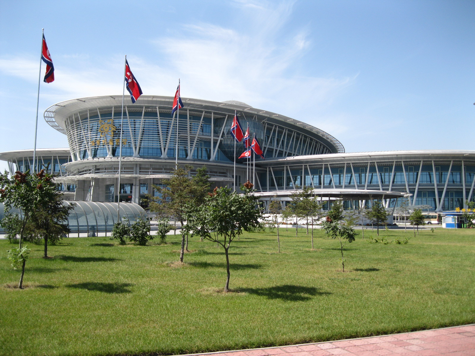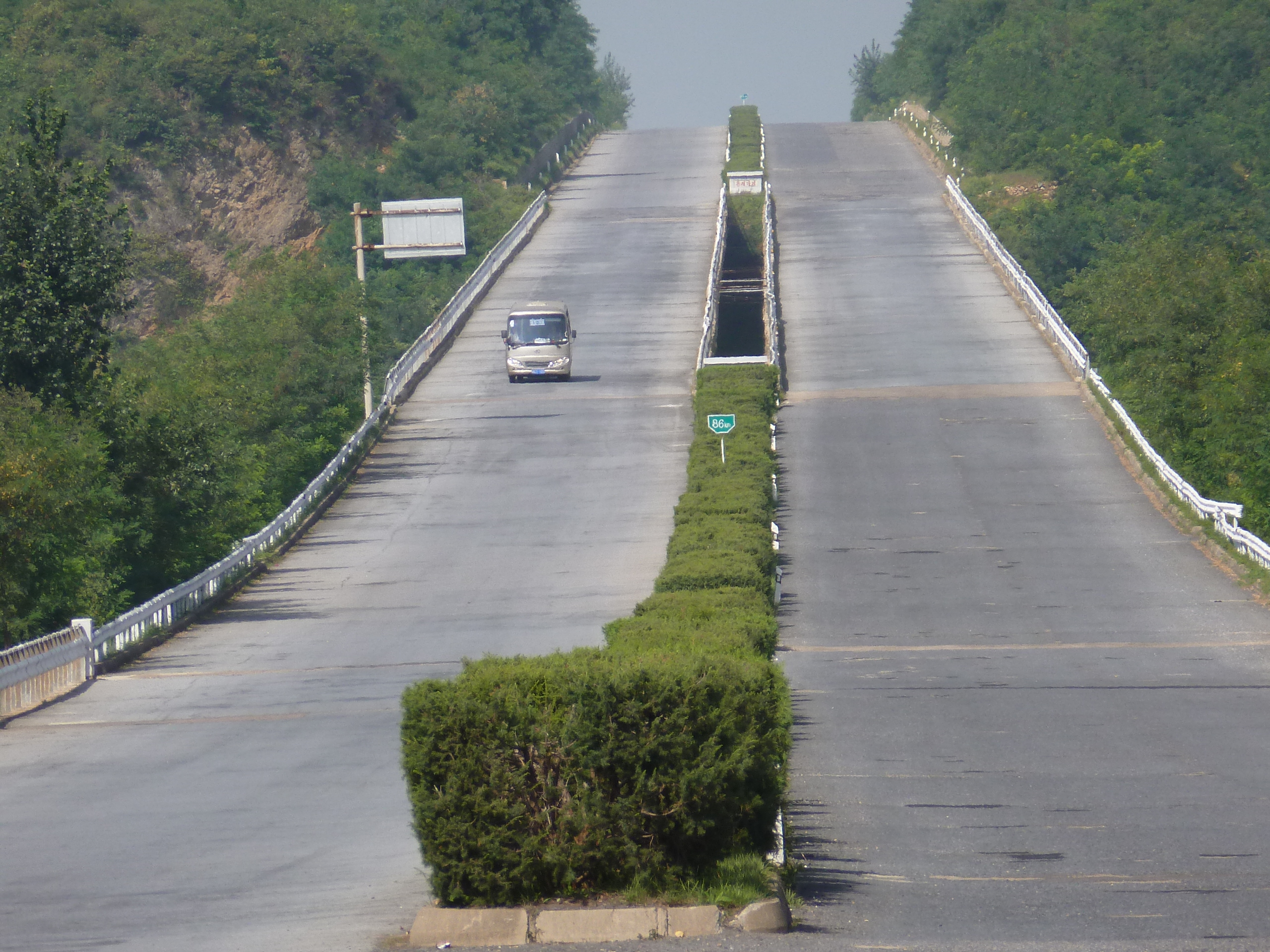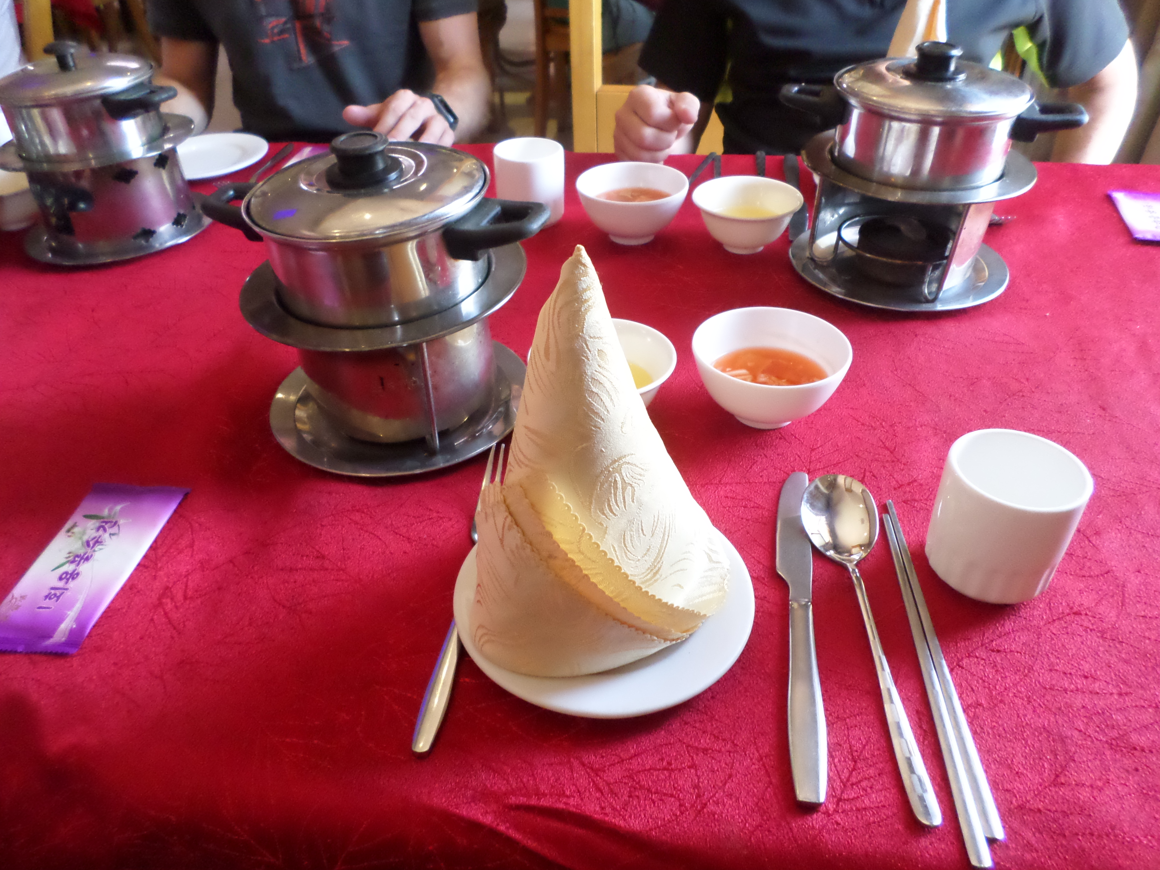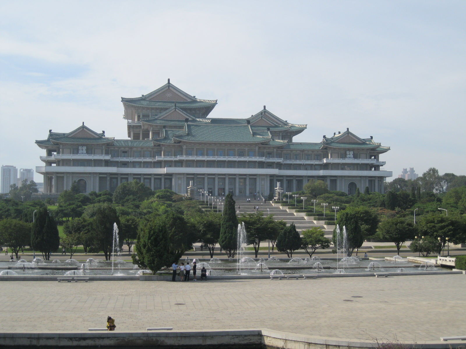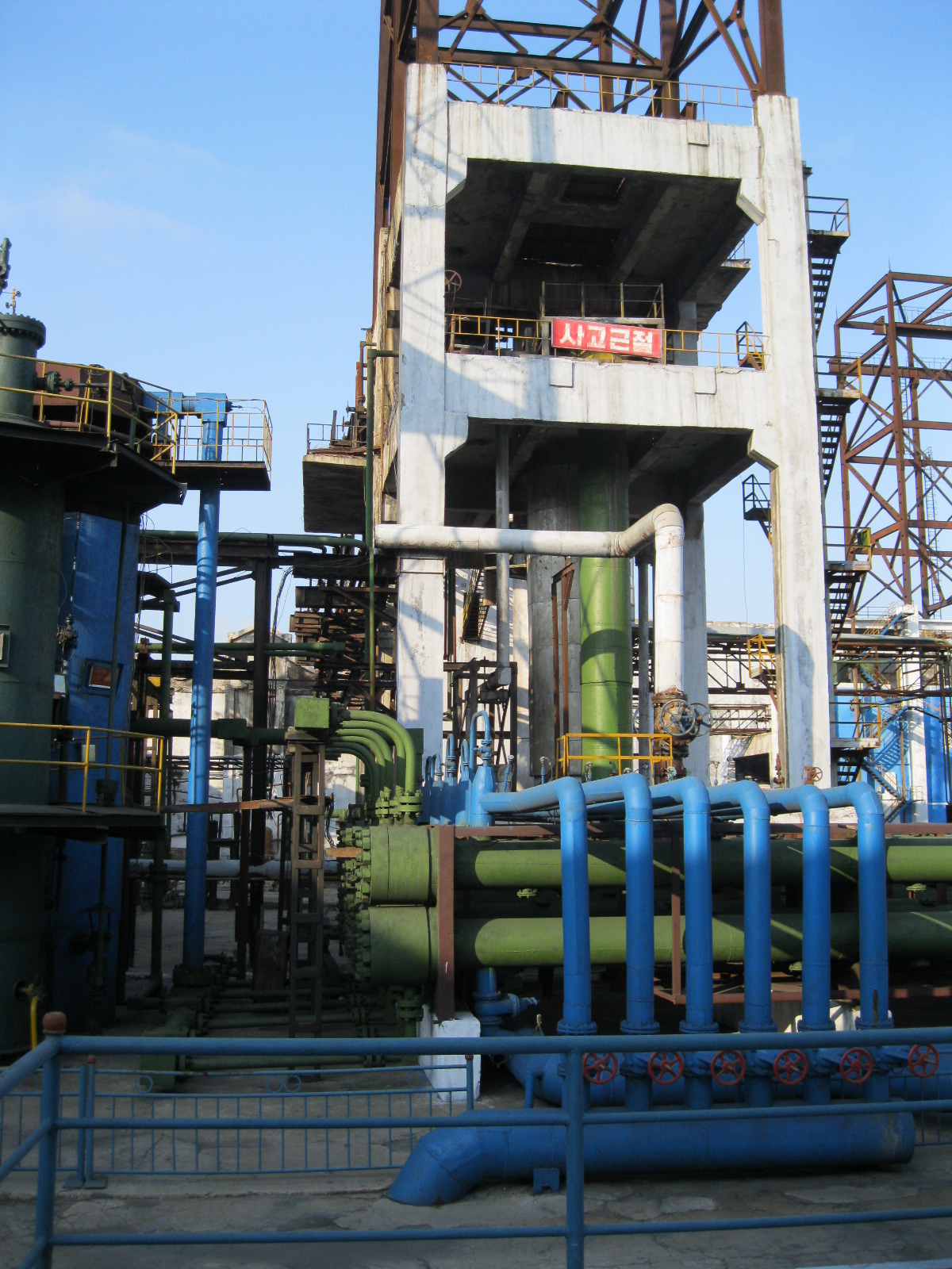 In Peking hebben we enkele uren tijd om ons voor te bereiden op de treinreis richting Noord-Korea. De trein vertrok rond 6u 's avonds. De volgende ochtend komen we aan in Dandong, een Chinese stad die grenst aan Noord-Korea.Het station van PekingDe slaapcabineHet restaurant op de trein. Een deel van het treinpersoneel was er al aan het eten. Ik besloot dan ook maar iets te eten. "Can I have a knife and fork?". "No sowwy". En de chinezen maar lachen.Op dag 3 arriveren we in Dandong, waar we een ontbijt krijgen. De rest van de treinreis wordt verdergezet op een andere trein richting de Noord-Koreaanse hoofdstad Pyongyang.Aankomst in DandongDandongIn de trein over de China-Noord-Korea Vriendschapsbrug. De Yalu rivier die we oversteken maakt een groot deel uit van de grens tussen China en Noord-Korea.Parallel loopt nog een brug, maar deze werd grotendeels vernield tijdens de Koreaanse oorlog.Links: Noord-Korea Rechts: ChinaAl snel verschijnen de portretten van de (overleden) grote leiders Kim Il Sung (links) en Kim Jong Il (rechts). Die zien we overal in Noord-Korea.Langs het platteland zien we vooral rijstvelden.Openbare werkenOnze Nederlandse reisbegeleider Jan is zeer fier op zijn Noord-Koreaanse badge. Deze badges worden door bijna alle Noord-Koreanen gedragen. Als buitenlander kan je deze badge enkel uitgereikt krijgen als je je loyaliteit bewezen hebt.In onze wagon zitten ook enkele Chinese toeristen. De meeste toeristen in Noord-Korea zijn Chinezen.Bij een tussenstop worden we gecontroleerd door Noord-Koreaanse militairen. Alle fototoestellen en telefoons worden geregistreerd, boeken en magazines worden nagekeken. Bagages worden slechts steekproefsgewijs doorgelicht. Onze paspoorten worden ook in beslag genomen. Die krijgen we pas terug op het einde van de reis.De rijstvelden zijn meestal in rechthoekige stukken ingedeeld, met bonenplanten om ze te scheiden.Tegen de avond rijden we Pyongyang binnen. Het volledige treintraject van Peking tot Pyongyang is 1371km lang en deden we ongeveer 24u over.Op dag 4 rijden we met de bus naar de industriestad Hamhung (함흥시). Hier bezoeken we oa. een fabriek van kunstmeststof.Het Yanggakdo International Hotel in Pyongyang waar we deze eerste nacht verbleven. Later keren we hier nog terug.Een tussenstop aan een meer langs het bergachtige landschap.Simon en ikDe bus waar we heel de reis mee rondtrokkenEen fotostop langs het bergachtige landschapDe gidsen vermelden dat zowat driekwart van het land bergen zijn. Omdat de Noord-Koreanen er naar streven om volledig zelfvoorzienend te zijn, wordt bijna alle vlakke grond gebruikt voor landbouw.Aan de linkerkant zie je onze Koreaanse gidsen. Meestal spreken Koreanen elkaar aan met hun volledige naam, maar gemakkelijkheidshalve mochten wij ze aanspreken als miss Kim (links) en miss Ha (rechts).Even dalen we af om een waterval te bezoeken. We picknicken hier in de buurt.De waterval zou in 2001 ontdekt zijn door Kim Jong Il, dankzij zijn fantastisch gehoor.BronwaterDit was een van de weinige maaltijden die ik volledig op kreeg. Op de bus krijgen we dan te horen dat de lunchschotels achtergelaten werden voor kinderen die de overschot zouden eten...De meeste wegen bestaan uit betonplaten.Een propagandabord langs de wegWe komen aan in Hamhung, de tweede grootste stad van Noord-Korea (~ 800.000 inwoners). We rijden hier voorbij een van de talrijke mozaïeken die we te zien zullen krijgen. Links: Kim Il Sung Midden: Kim Jong Il Rechts: Kim Jong Suk (de eerste vrouw van Kim Il Sung)Hamhung is nog maar enkele jaren "open" voor toeristen.Een fabriek van kunstmeststofBij elke bezienswaardigheid krijgen we te horen hoe vaak en wanneer juist de grote leiders die plaats bezocht hebben. Vaak zijn er mozaïeken die hun bezoek afbeelden.Binnen in de fabriekEr zijn maar weinig fabriekswerkers aanwezig, maar ze poseren wel graag voor een foto.'s avonds verblijven we in het Majon Tourist Resort aan de Oost-Koreaanse zee. Hier nemen we een frisse duik in het water.De huisjes waar we verblijven zijn vlak aan het strand.Onze zwembroeken buiten gehangen, maar echt droog werden ze niet door het vochtige klimaat.Het avondmaal. Zoals gewoonlijk werden er nog voortdurend bordjes bij gezet. Als je al vol zit krijg je dan nog een kom rijst en soep.'s middags en 's avonds was er als drank meestal plat water en bier, met de mogelijkheid om "juice" te drinken in plaats van bier. Dat was een soort appel/peren sap (niet op de foto).Onze kamerHier was geen stromend water, en diende het bad als waterreservoir. Wassen moest "op z'n Bangladesh" door een teiltje water over je gieten. In de rode emmer kon water elektrisch verwarmd worden.Op dag 5 bezoeken we nog enkele plaatsen in Hamhung, en vertrekken dan richting Mt. Kumgang. Onderweg bezoeken we oa. nog de kuststad Wonsan.Het huis van de voormalige koning Taejo van Joseon in Hamhung. Hij richtte de Koreaanse Joseondynastie op in 1392, die eindigde in 1897.Een zeer oude boomBuiten het huis stond een groep Koreaanse studenten te wachten.Een aangelegde (niet natuurlijke) heuvel met grote bronzen beelden van de leidersDe lokale gids die ons een woordje uitleg gaf. De plaatselijke gidsen spraken meestal Koreaans, dat dan naar Engels vertaald werd door onze gids miss Kim.Hamhung Grand TheatreWonsanDit verkeersbord leek met de hand geschilderd te zijn.Bezoek aan een de Chonsam coöperatieve boerderijEen persimmon boomOok de grote leiders zijn hier geweest.In het winkeltje van de boerderij kochten we enkele gedroogde persimmons.Naast de boerderij was er een kleuterschool. De kinderen zongen een liedje en wuifden ons dan uit.Iets verderop bezoeken we nog het huis van de boerin die ons begeleidde.Dit huis heeft een soort vloerverwarming die hier vaak toegepast zou worden. Op internet vond ik dit systeem terug als "Ondol".Wat voor een decoder is dat onder de TV? Telenet of Belgacom?Ten slotte bezochten we nog een boeddhistische tempel...Maar bij de tempel zelf mochten we niet komen, omdat er constructi