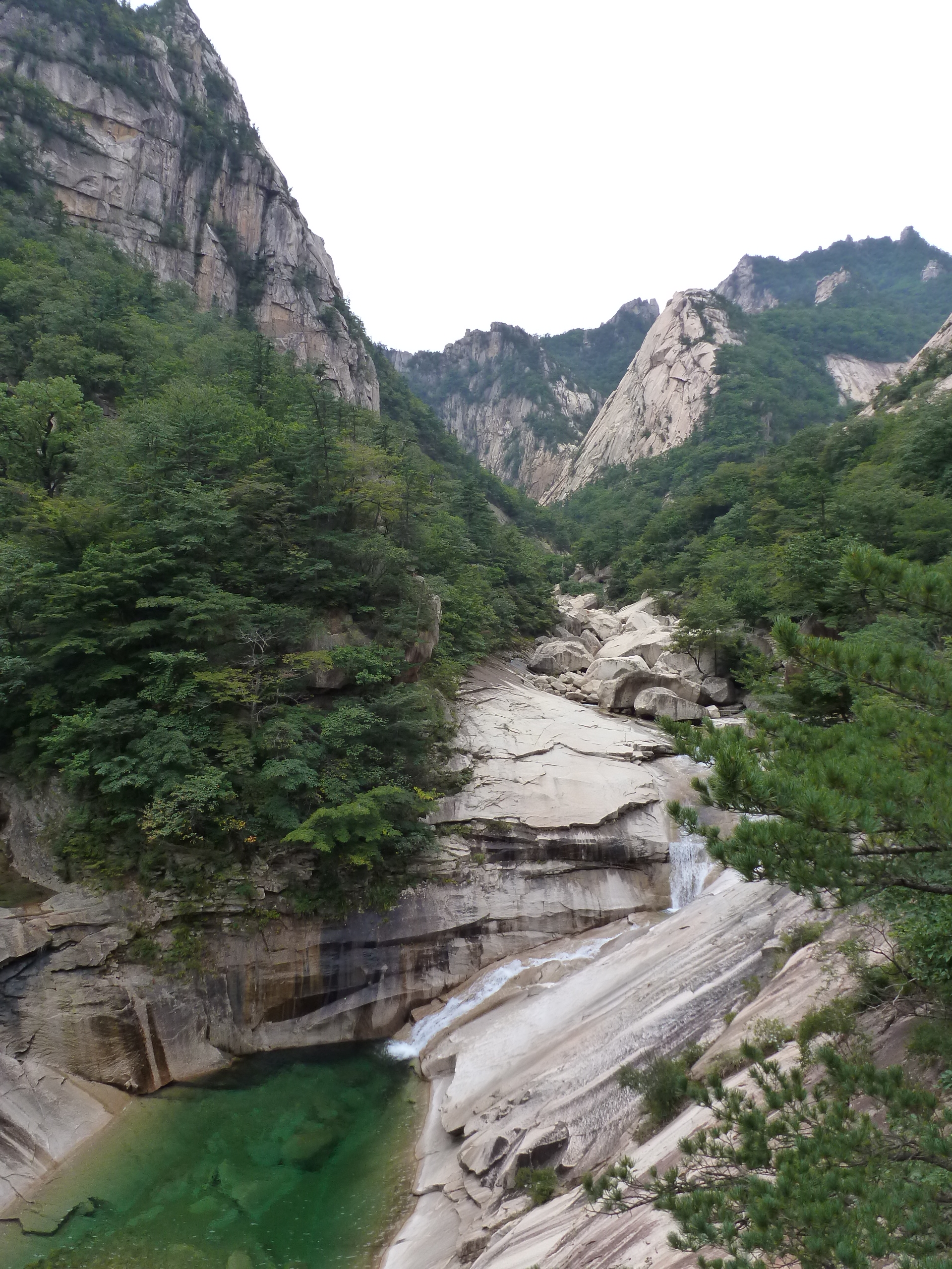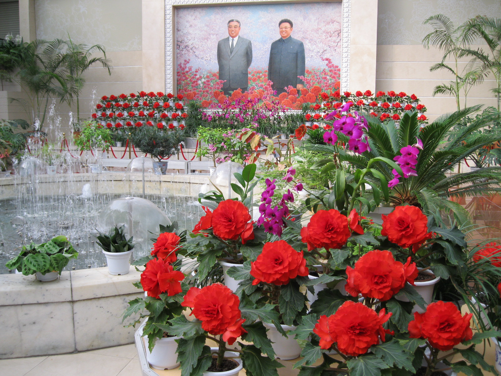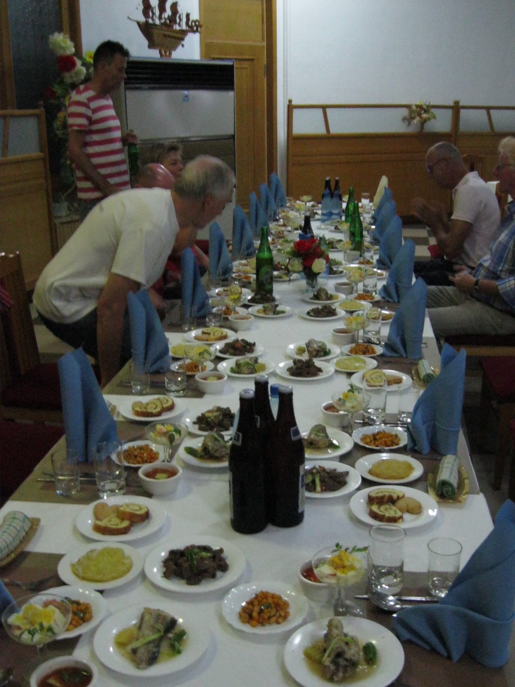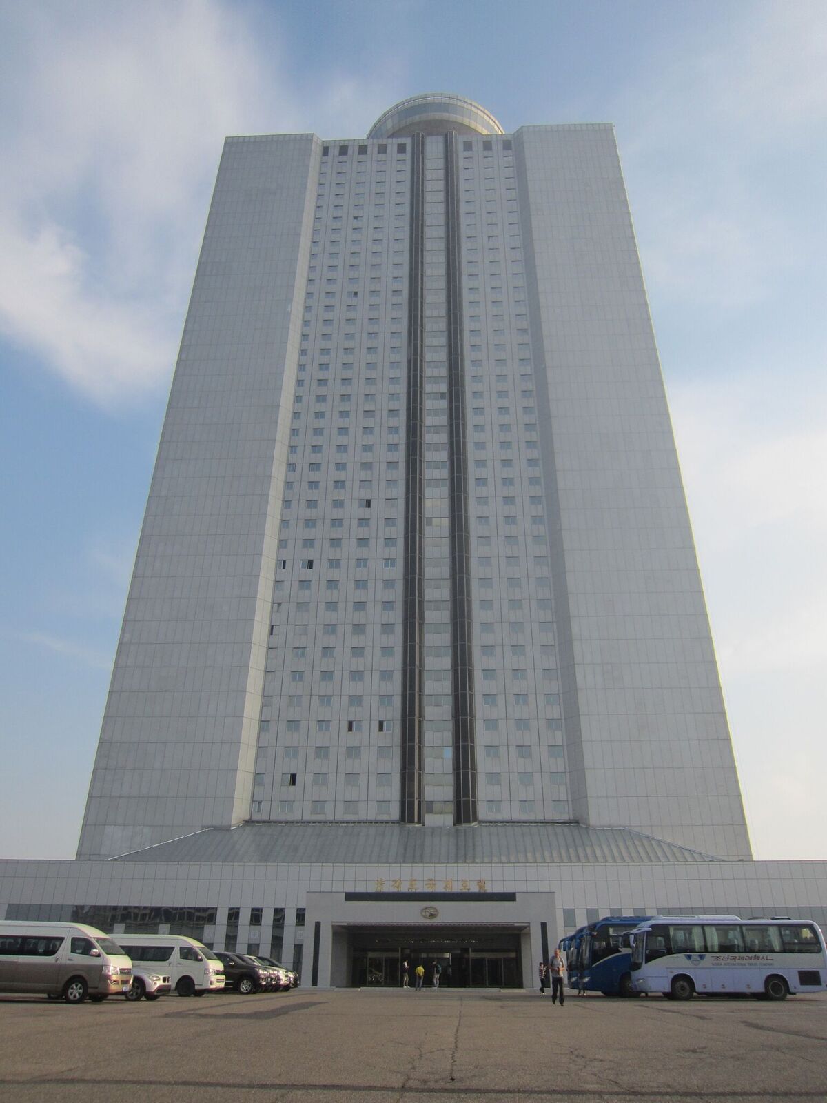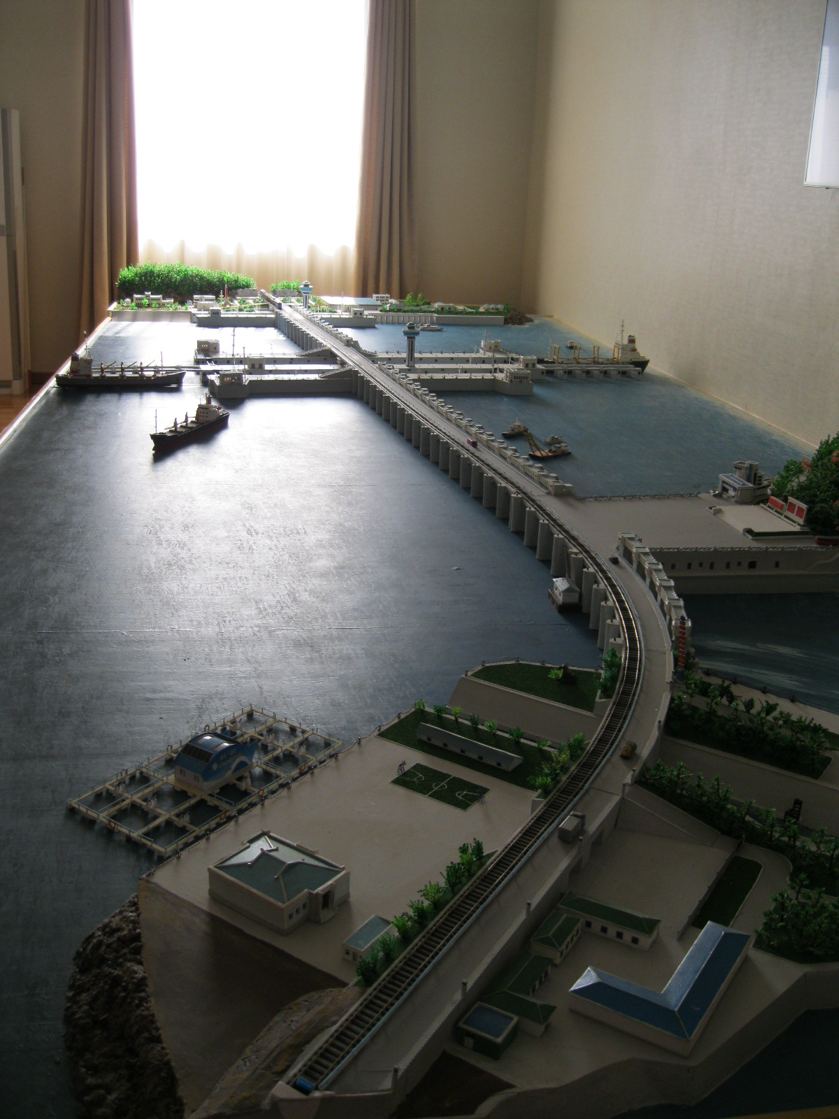 In Peking hebben we enkele uren tijd om ons voor te bereiden op de treinreis richting Noord-Korea. De trein vertrok rond 6u 's avonds. De volgende ochtend komen we aan in Dandong, een Chinese stad die grenst aan Noord-Korea.Het station van PekingDe slaapcabineHet restaurant op de trein. Een deel van het treinpersoneel was er al aan het eten. Ik besloot dan ook maar iets te eten. "Can I have a knife and fork?". "No sowwy". En de chinezen maar lachen.Op dag 3 arriveren we in Dandong, waar we een ontbijt krijgen. De rest van de treinreis wordt verdergezet op een andere trein richting de Noord-Koreaanse hoofdstad Pyongyang.Aankomst in DandongDandongIn de trein over de China-Noord-Korea Vriendschapsbrug. De Yalu rivier die we oversteken maakt een groot deel uit van de grens tussen China en Noord-Korea.Parallel loopt nog een brug, maar deze werd grotendeels vernield tijdens de Koreaanse oorlog.Links: Noord-Korea Rechts: ChinaAl snel verschijnen de portretten van de (overleden) grote leiders Kim Il Sung (links) en Kim Jong Il (rechts). Die zien we overal in Noord-Korea.Langs het platteland zien we vooral rijstvelden.Openbare werkenOnze Nederlandse reisbegeleider Jan is zeer fier op zijn Noord-Koreaanse badge. Deze badges worden door bijna alle Noord-Koreanen gedragen. Als buitenlander kan je deze badge enkel uitgereikt krijgen als je je loyaliteit bewezen hebt.In onze wagon zitten ook enkele Chinese toeristen. De meeste toeristen in Noord-Korea zijn Chinezen.Bij een tussenstop worden we gecontroleerd door Noord-Koreaanse militairen. Alle fototoestellen en telefoons worden geregistreerd, boeken en magazines worden nagekeken. Bagages worden slechts steekproefsgewijs doorgelicht. Onze paspoorten worden ook in beslag genomen. Die krijgen we pas terug op het einde van de reis.De rijstvelden zijn meestal in rechthoekige stukken ingedeeld, met bonenplanten om ze te scheiden.Tegen de avond rijden we Pyongyang binnen. Het volledige treintraject van Peking tot Pyongyang is 1371km lang en deden we ongeveer 24u over.Op dag 4 rijden we met de bus naar de industriestad Hamhung (함흥시). Hier bezoeken we oa. een fabriek van kunstmeststof.Het Yanggakdo International Hotel in Pyongyang waar we deze eerste nacht verbleven. Later keren we hier nog terug.Een tussenstop aan een meer langs het bergachtige landschap.Simon en ikDe bus waar we heel de reis mee rondtrokkenEen fotostop langs het bergachtige landschapDe gidsen vermelden dat zowat driekwart van het land bergen zijn. Omdat de Noord-Koreanen er naar streven om volledig zelfvoorzienend te zijn, wordt bijna alle vlakke grond gebruikt voor landbouw.Aan de linkerkant zie je onze Koreaanse gidsen. Meestal spreken Koreanen elkaar aan met hun volledige naam, maar gemakkelijkheidshalve mochten wij ze aanspreken als miss Kim (links) en miss Ha (rechts).Even dalen we af om een waterval te bezoeken. We picknicken hier in de buurt.De waterval zou in 2001 ontdekt zijn door Kim Jong Il, dankzij zijn fantastisch gehoor.BronwaterDit was een van de weinige maaltijden die ik volledig op kreeg. Op de bus krijgen we dan te horen dat de lunchschotels achtergelaten werden voor kinderen die de overschot zouden eten...De meeste wegen bestaan uit betonplaten.Een propagandabord langs de wegWe komen aan in Hamhung, de tweede grootste stad van Noord-Korea (~ 800.000 inwoners). We rijden hier voorbij een van de talrijke mozaïeken die we te zien zullen krijgen. Links: Kim Il Sung Midden: Kim Jong Il Rechts: Kim Jong Suk (de eerste vrouw van Kim Il Sung)Hamhung is nog maar enkele jaren "open" voor toeristen.Een fabriek van kunstmeststofBij elke bezienswaardigheid krijgen we te horen hoe vaak en wanneer juist de grote leiders die plaats bezocht hebben. Vaak zijn er mozaïeken die hun bezoek afbeelden.Binnen in de fabriekEr zijn maar weinig fabriekswerkers aanwezig, maar ze poseren wel graag voor een foto.'s avonds verblijven we in het Majon Tourist Resort aan de Oost-Koreaanse zee. Hier nemen we een frisse duik in het water.De huisjes waar we verblijven zijn vlak aan het strand.Onze zwembroeken buiten gehangen, maar echt droog werden ze niet door het vochtige klimaat.Het avondmaal. Zoals gewoonlijk werden er nog voortdurend bordjes bij gezet. Als je al vol zit krijg je dan nog een kom rijst en soep.'s middags en 's avonds was er als drank meestal plat water en bier, met de mogelijkheid om "juice" te drinken in plaats van bier. Dat was een soort appel/peren sap (niet op de foto).Onze kamerHier was geen stromend water, en diende het bad als waterreservoir. Wassen moest "op z'n Bangladesh" door een teiltje water over je gieten. In de rode emmer kon water elektrisch verwarmd worden.Op dag 5 bezoeken we nog enkele plaatsen in Hamhung, en vertrekken dan richting Mt. Kumgang. Onderweg bezoeken we oa. nog de kuststad Wonsan.Het huis van de voormalige koning Taejo van Joseon in Hamhung. Hij richtte de Koreaanse Joseondynastie op in 1392, die eindigde in 1897.Een zeer oude boomBuiten het huis stond een groep Koreaanse studenten te wachten.Een aangelegde (niet natuurlijke) heuvel met grote bronzen beelden van de leidersDe lokale gids die ons een woordje uitleg gaf. De plaatselijke gidsen spraken meestal Koreaans, dat dan naar Engels vertaald werd door onze gids miss Kim.Hamhung Grand TheatreWonsanDit verkeersbord leek met de hand geschilderd te zijn.Bezoek aan een de Chonsam coöperatieve boerderijEen persimmon boomOok de grote leiders zijn hier geweest.In het winkeltje van de boerderij kochten we enkele gedroogde persimmons.Naast de boerderij was er een kleuterschool. De kinderen zongen een liedje en wuifden ons dan uit.Iets verderop bezoeken we nog het huis van de boerin die ons begeleidde.Dit huis heeft een soort vloerverwarming die hier vaak toegepast zou worden. Op internet vond ik dit systeem terug als "Ondol".Wat voor een decoder is dat onder de TV? Telenet of Belgacom?Ten slotte bezochten we nog een boeddhistische tempel...Maar bij de tempel zelf mochten we niet komen, omdat er constructi