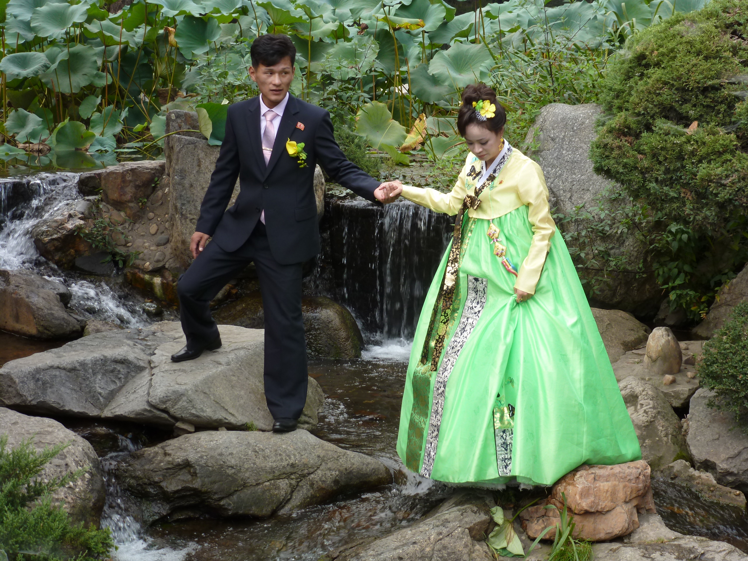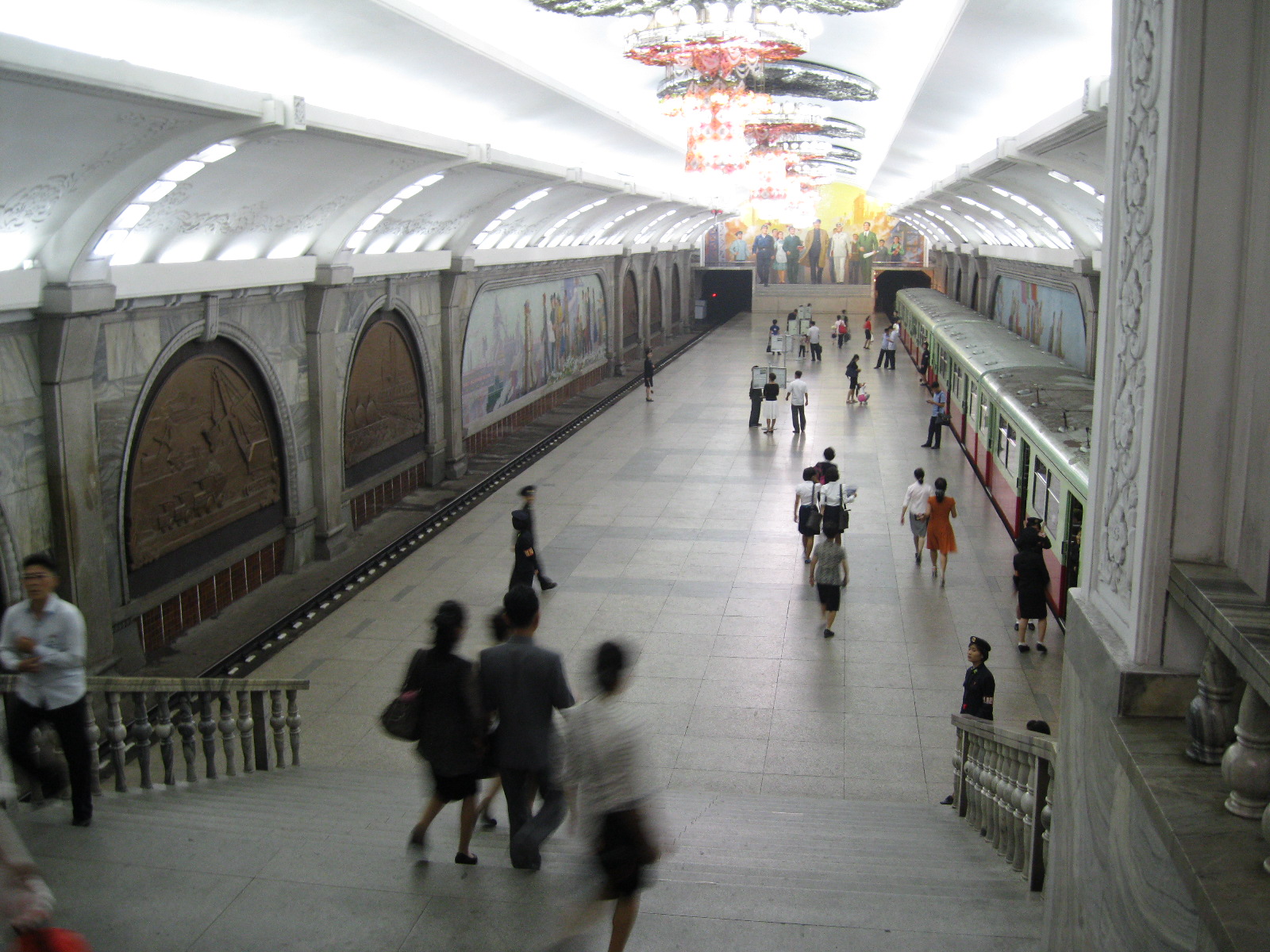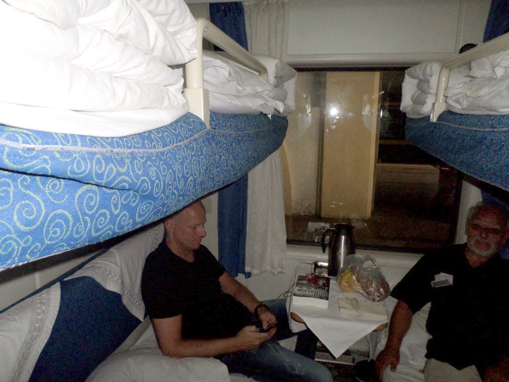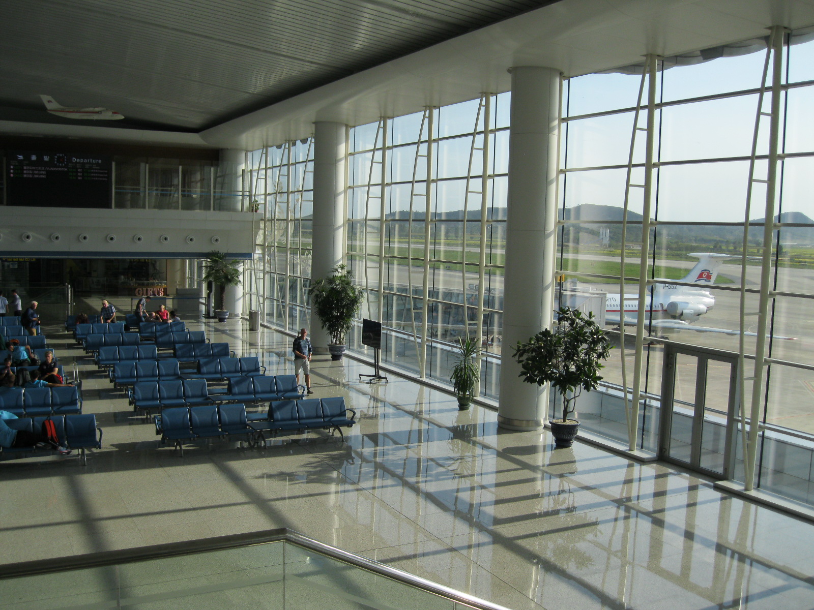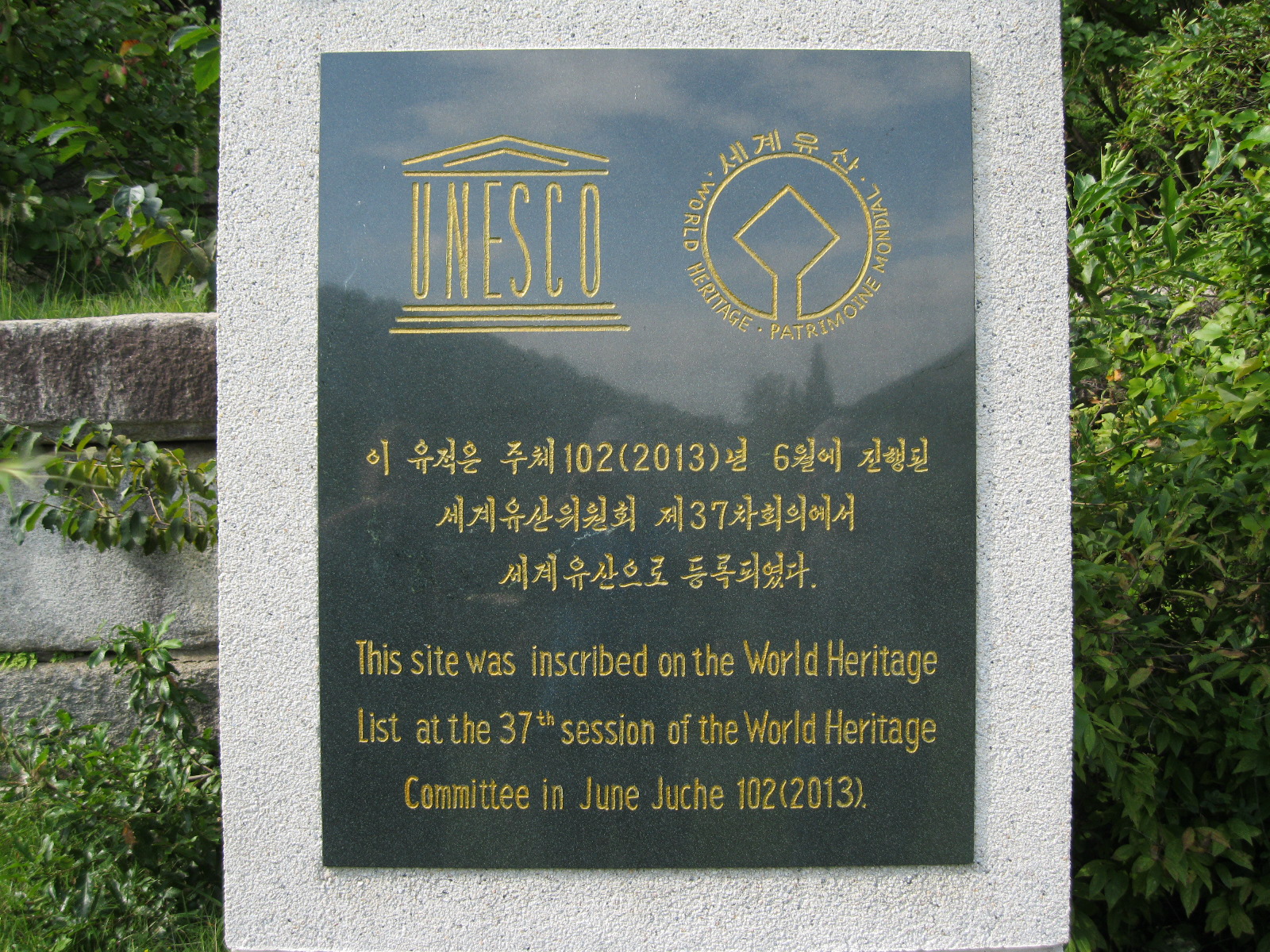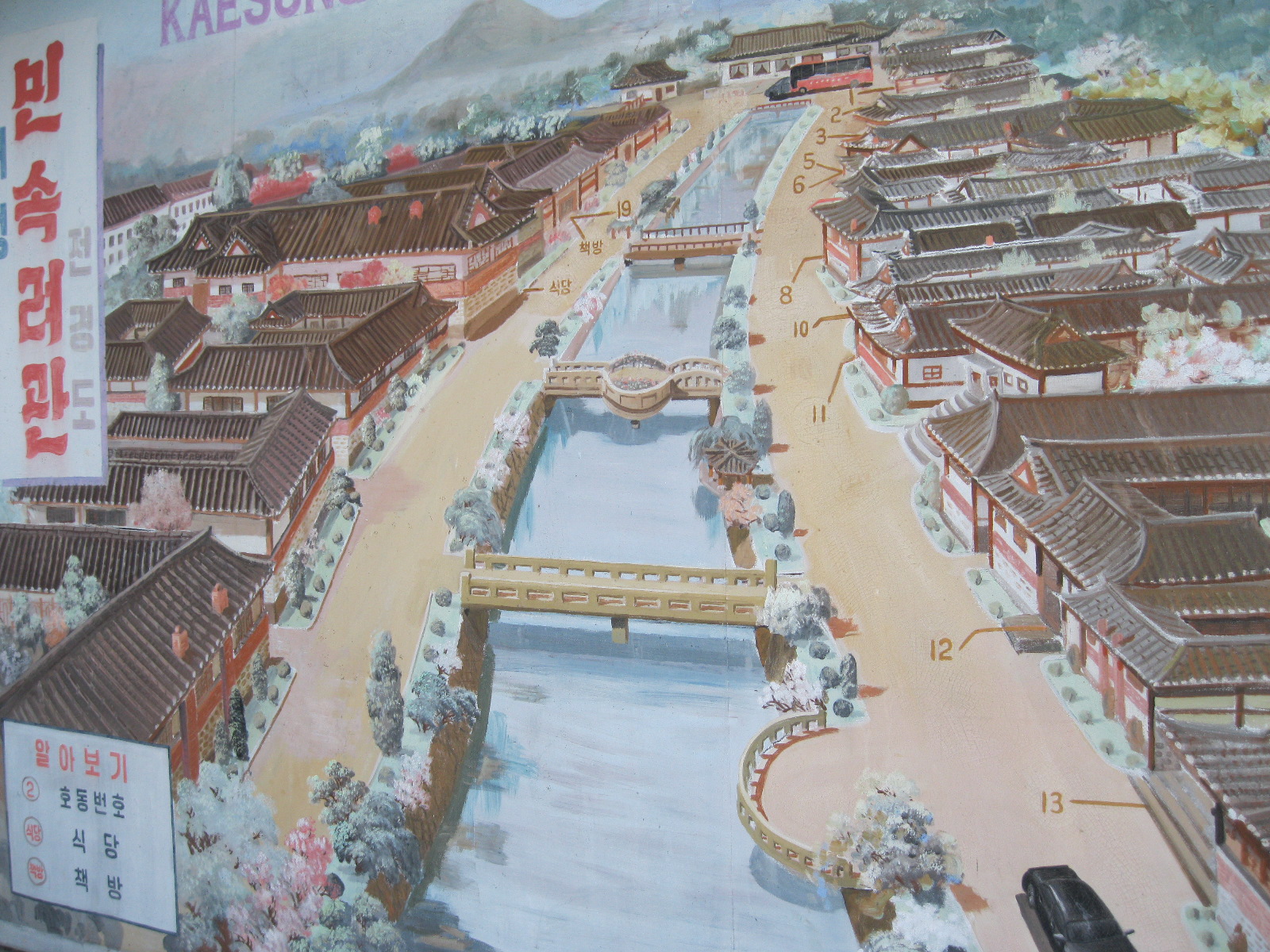 In Peking hebben we enkele uren tijd om ons voor te bereiden op de treinreis richting Noord-Korea. De trein vertrok rond 6u 's avonds. De volgende ochtend komen we aan in Dandong, een Chinese stad die grenst aan Noord-Korea.Het station van PekingDe slaapcabineHet restaurant op de trein. Een deel van het treinpersoneel was er al aan het eten. Ik besloot dan ook maar iets te eten. "Can I have a knife and fork?". "No sowwy". En de chinezen maar lachen.Op dag 3 arriveren we in Dandong, waar we een ontbijt krijgen. De rest van de treinreis wordt verdergezet op een andere trein richting de Noord-Koreaanse hoofdstad Pyongyang.Aankomst in DandongDandongIn de trein over de China-Noord-Korea Vriendschapsbrug. De Yalu rivier die we oversteken maakt een groot deel uit van de grens tussen China en Noord-Korea.Parallel loopt nog een brug, maar deze werd grotendeels vernield tijdens de Koreaanse oorlog.Links: Noord-Korea Rechts: ChinaAl snel verschijnen de portretten van de (overleden) grote leiders Kim Il Sung (links) en Kim Jong Il (rechts). Die zien we overal in Noord-Korea.Langs het platteland zien we vooral rijstvelden.Openbare werkenOnze Nederlandse reisbegeleider Jan is zeer fier op zijn Noord-Koreaanse badge. Deze badges worden door bijna alle Noord-Koreanen gedragen. Als buitenlander kan je deze badge enkel uitgereikt krijgen als je je loyaliteit bewezen hebt.In onze wagon zitten ook enkele Chinese toeristen. De meeste toeristen in Noord-Korea zijn Chinezen.Bij een tussenstop worden we gecontroleerd door Noord-Koreaanse militairen. Alle fototoestellen en telefoons worden geregistreerd, boeken en magazines worden nagekeken. Bagages worden slechts steekproefsgewijs doorgelicht. Onze paspoorten worden ook in beslag genomen. Die krijgen we pas terug op het einde van de reis.De rijstvelden zijn meestal in rechthoekige stukken ingedeeld, met bonenplanten om ze te scheiden.Tegen de avond rijden we Pyongyang binnen. Het volledige treintraject van Peking tot Pyongyang is 1371km lang en deden we ongeveer 24u over.Op dag 4 rijden we met de bus naar de industriestad Hamhung (함흥시). Hier bezoeken we oa. een fabriek van kunstmeststof.Het Yanggakdo International Hotel in Pyongyang waar we deze eerste nacht verbleven. Later keren we hier nog terug.Een tussenstop aan een meer langs het bergachtige landschap.Simon en ikDe bus waar we heel de reis mee rondtrokkenEen fotostop langs het bergachtige landschapDe gidsen vermelden dat zowat driekwart van het land bergen zijn. Omdat de Noord-Koreanen er naar streven om volledig zelfvoorzienend te zijn, wordt bijna alle vlakke grond gebruikt voor landbouw.Aan de linkerkant zie je onze Koreaanse gidsen. Meestal spreken Koreanen elkaar aan met hun volledige naam, maar gemakkelijkheidshalve mochten wij ze aanspreken als miss Kim (links) en miss Ha (rechts).Even dalen we af om een waterval te bezoeken. We picknicken hier in de buurt.De waterval zou in 2001 ontdekt zijn door Kim Jong Il, dankzij zijn fantastisch gehoor.BronwaterDit was een van de weinige maaltijden die ik volledig op kreeg. Op de bus krijgen we dan te horen dat de lunchschotels achtergelaten werden voor kinderen die de overschot zouden eten...De meeste wegen bestaan uit betonplaten.Een propagandabord langs de wegWe komen aan in Hamhung, de tweede grootste stad van Noord-Korea (~ 800.000 inwoners). We rijden hier voorbij een van de talrijke mozaïeken die we te zien zullen krijgen. Links: Kim Il Sung Midden: Kim Jong Il Rechts: Kim Jong Suk (de eerste vrouw van Kim Il Sung)Hamhung is nog maar enkele jaren "open" voor toeristen.Een fabriek van kunstmeststofBij elke bezienswaardigheid krijgen we te horen hoe vaak en wanneer juist de grote leiders die plaats bezocht hebben. Vaak zijn er mozaïeken die hun bezoek afbeelden.Binnen in de fabriekEr zijn maar weinig fabriekswerkers aanwezig, maar ze poseren wel graag voor een foto.'s avonds verblijven we in het Majon Tourist Resort aan de Oost-Koreaanse zee. Hier nemen we een frisse duik in het water.De huisjes waar we verblijven zijn vlak aan het strand.Onze zwembroeken buiten gehangen, maar echt droog werden ze niet door het vochtige klimaat.Het avondmaal. Zoals gewoonlijk werden er nog voortdurend bordjes bij gezet. Als je al vol zit krijg je dan nog een kom rijst en soep.'s middags en 's avonds was er als drank meestal plat water en bier, met de mogelijkheid om "juice" te drinken in plaats van bier. Dat was een soort appel/peren sap (niet op de foto).Onze kamerHier was geen stromend water, en diende het bad als waterreservoir. Wassen moest "op z'n Bangladesh" door een teiltje water over je gieten. In de rode emmer kon water elektrisch verwarmd worden.Op dag 5 bezoeken we nog enkele plaatsen in Hamhung, en vertrekken dan richting Mt. Kumgang. Onderweg bezoeken we oa. nog de kuststad Wonsan.Het huis van de voormalige koning Taejo van Joseon in Hamhung. Hij richtte de Koreaanse Joseondynastie op in 1392, die eindigde in 1897.Een zeer oude boomBuiten het huis stond een groep Koreaanse studenten te wachten.Een aangelegde (niet natuurlijke) heuvel met grote bronzen beelden van de leidersDe lokale gids die ons een woordje uitleg gaf. De plaatselijke gidsen spraken meestal Koreaans, dat dan naar Engels vertaald werd door onze gids miss Kim.Hamhung Grand TheatreWonsanDit verkeersbord leek met de hand geschilderd te zijn.Bezoek aan een de Chonsam coöperatieve boerderijEen persimmon boomOok de grote leiders zijn hier geweest.In het winkeltje van de boerderij kochten we enkele gedroogde persimmons.Naast de boerderij was er een kleuterschool. De kinderen zongen een liedje en wuifden ons dan uit.Iets verderop bezoeken we nog het huis van de boerin die ons begeleidde.Dit huis heeft een soort vloerverwarming die hier vaak toegepast zou worden. Op internet vond ik dit systeem terug als "Ondol".Wat voor een decoder is dat onder de TV? Telenet of Belgacom?Ten slotte bezochten we nog een boeddhistische tempel...Maar bij de tempel zelf mochten we niet komen, omdat er constructi