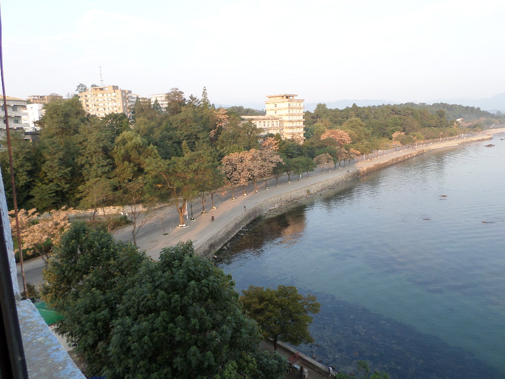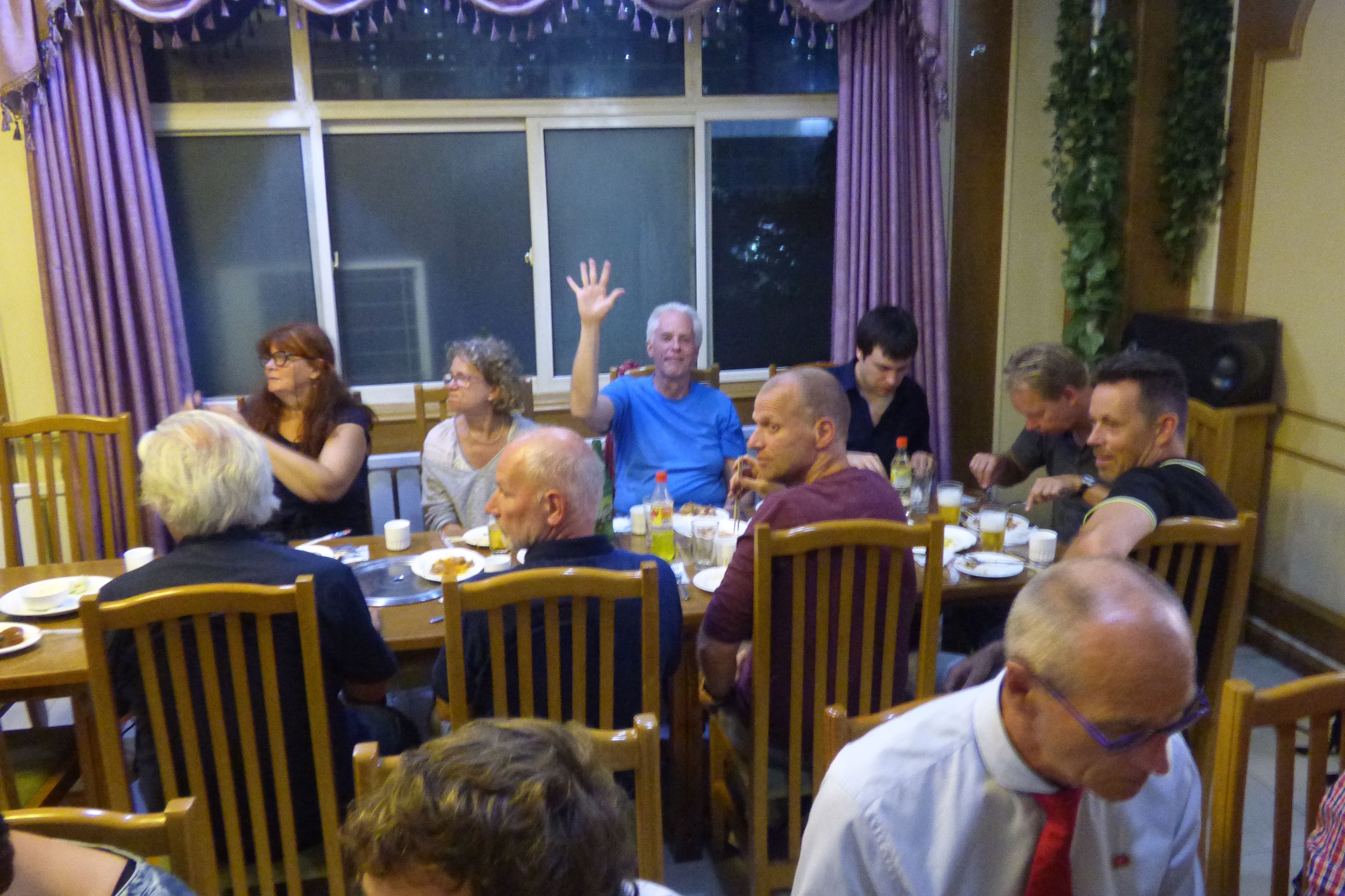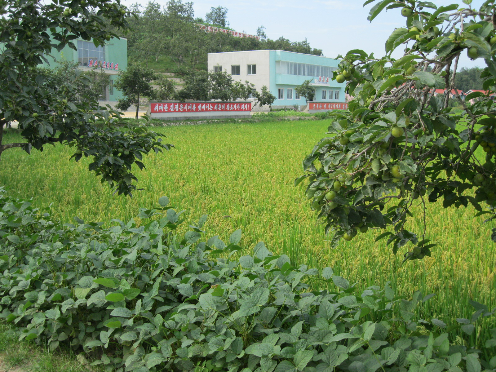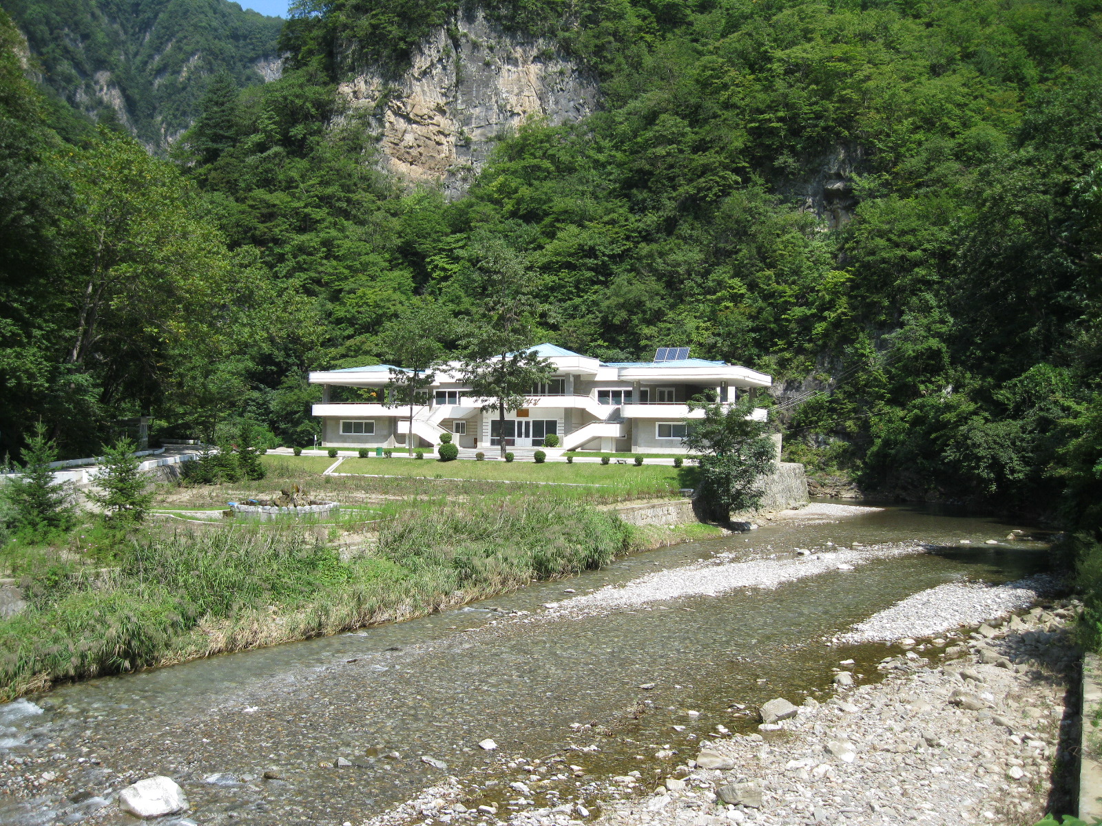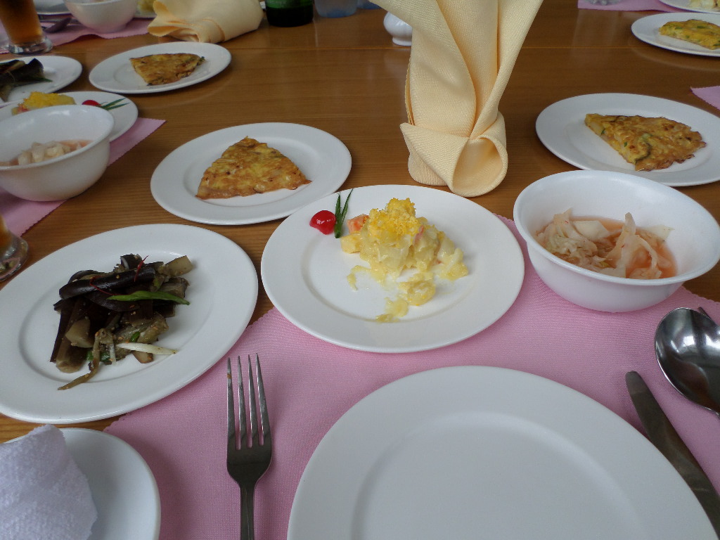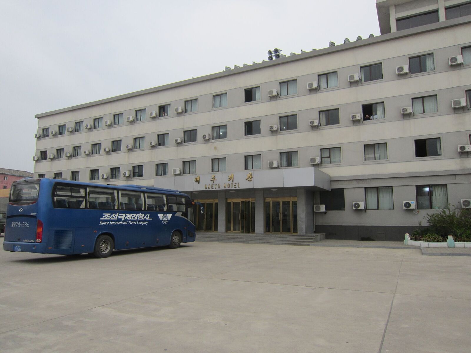 In Peking hebben we enkele uren tijd om ons voor te bereiden op de treinreis richting Noord-Korea. De trein vertrok rond 6u 's avonds. De volgende ochtend komen we aan in Dandong, een Chinese stad die grenst aan Noord-Korea.Het station van PekingDe slaapcabineHet restaurant op de trein. Een deel van het treinpersoneel was er al aan het eten. Ik besloot dan ook maar iets te eten. "Can I have a knife and fork?". "No sowwy". En de chinezen maar lachen.Op dag 3 arriveren we in Dandong, waar we een ontbijt krijgen. De rest van de treinreis wordt verdergezet op een andere trein richting de Noord-Koreaanse hoofdstad Pyongyang.Aankomst in DandongDandongIn de trein over de China-Noord-Korea Vriendschapsbrug. De Yalu rivier die we oversteken maakt een groot deel uit van de grens tussen China en Noord-Korea.Parallel loopt nog een brug, maar deze werd grotendeels vernield tijdens de Koreaanse oorlog.Links: Noord-Korea Rechts: ChinaAl snel verschijnen de portretten van de (overleden) grote leiders Kim Il Sung (links) en Kim Jong Il (rechts). Die zien we overal in Noord-Korea.Langs het platteland zien we vooral rijstvelden.Openbare werkenOnze Nederlandse reisbegeleider Jan is zeer fier op zijn Noord-Koreaanse badge. Deze badges worden door bijna alle Noord-Koreanen gedragen. Als buitenlander kan je deze badge enkel uitgereikt krijgen als je je loyaliteit bewezen hebt.In onze wagon zitten ook enkele Chinese toeristen. De meeste toeristen in Noord-Korea zijn Chinezen.Bij een tussenstop worden we gecontroleerd door Noord-Koreaanse militairen. Alle fototoestellen en telefoons worden geregistreerd, boeken en magazines worden nagekeken. Bagages worden slechts steekproefsgewijs doorgelicht. Onze paspoorten worden ook in beslag genomen. Die krijgen we pas terug op het einde van de reis.De rijstvelden zijn meestal in rechthoekige stukken ingedeeld, met bonenplanten om ze te scheiden.Tegen de avond rijden we Pyongyang binnen. Het volledige treintraject van Peking tot Pyongyang is 1371km lang en deden we ongeveer 24u over.Op dag 4 rijden we met de bus naar de industriestad Hamhung (함흥시). Hier bezoeken we oa. een fabriek van kunstmeststof.Het Yanggakdo International Hotel in Pyongyang waar we deze eerste nacht verbleven. Later keren we hier nog terug.Een tussenstop aan een meer langs het bergachtige landschap.Simon en ikDe bus waar we heel de reis mee rondtrokkenEen fotostop langs het bergachtige landschapDe gidsen vermelden dat zowat driekwart van het land bergen zijn. Omdat de Noord-Koreanen er naar streven om volledig zelfvoorzienend te zijn, wordt bijna alle vlakke grond gebruikt voor landbouw.Aan de linkerkant zie je onze Koreaanse gidsen. Meestal spreken Koreanen elkaar aan met hun volledige naam, maar gemakkelijkheidshalve mochten wij ze aanspreken als miss Kim (links) en miss Ha (rechts).Even dalen we af om een waterval te bezoeken. We picknicken hier in de buurt.De waterval zou in 2001 ontdekt zijn door Kim Jong Il, dankzij zijn fantastisch gehoor.BronwaterDit was een van de weinige maaltijden die ik volledig op kreeg. Op de bus krijgen we dan te horen dat de lunchschotels achtergelaten werden voor kinderen die de overschot zouden eten...De meeste wegen bestaan uit betonplaten.Een propagandabord langs de wegWe komen aan in Hamhung, de tweede grootste stad van Noord-Korea (~ 800.000 inwoners). We rijden hier voorbij een van de talrijke mozaïeken die we te zien zullen krijgen. Links: Kim Il Sung Midden: Kim Jong Il Rechts: Kim Jong Suk (de eerste vrouw van Kim Il Sung)Hamhung is nog maar enkele jaren "open" voor toeristen.Een fabriek van kunstmeststofBij elke bezienswaardigheid krijgen we te horen hoe vaak en wanneer juist de grote leiders die plaats bezocht hebben. Vaak zijn er mozaïeken die hun bezoek afbeelden.Binnen in de fabriekEr zijn maar weinig fabriekswerkers aanwezig, maar ze poseren wel graag voor een foto.'s avonds verblijven we in het Majon Tourist Resort aan de Oost-Koreaanse zee. Hier nemen we een frisse duik in het water.De huisjes waar we verblijven zijn vlak aan het strand.Onze zwembroeken buiten gehangen, maar echt droog werden ze niet door het vochtige klimaat.Het avondmaal. Zoals gewoonlijk werden er nog voortdurend bordjes bij gezet. Als je al vol zit krijg je dan nog een kom rijst en soep.'s middags en 's avonds was er als drank meestal plat water en bier, met de mogelijkheid om "juice" te drinken in plaats van bier. Dat was een soort appel/peren sap (niet op de foto).Onze kamerHier was geen stromend water, en diende het bad als waterreservoir. Wassen moest "op z'n Bangladesh" door een teiltje water over je gieten. In de rode emmer kon water elektrisch verwarmd worden.Op dag 5 bezoeken we nog enkele plaatsen in Hamhung, en vertrekken dan richting Mt. Kumgang. Onderweg bezoeken we oa. nog de kuststad Wonsan.Het huis van de voormalige koning Taejo van Joseon in Hamhung. Hij richtte de Koreaanse Joseondynastie op in 1392, die eindigde in 1897.Een zeer oude boomBuiten het huis stond een groep Koreaanse studenten te wachten.Een aangelegde (niet natuurlijke) heuvel met grote bronzen beelden van de leidersDe lokale gids die ons een woordje uitleg gaf. De plaatselijke gidsen spraken meestal Koreaans, dat dan naar Engels vertaald werd door onze gids miss Kim.Hamhung Grand TheatreWonsanDit verkeersbord leek met de hand geschilderd te zijn.Bezoek aan een de Chonsam coöperatieve boerderijEen persimmon boomOok de grote leiders zijn hier geweest.In het winkeltje van de boerderij kochten we enkele gedroogde persimmons.Naast de boerderij was er een kleuterschool. De kinderen zongen een liedje en wuifden ons dan uit.Iets verderop bezoeken we nog het huis van de boerin die ons begeleidde.Dit huis heeft een soort vloerverwarming die hier vaak toegepast zou worden. Op internet vond ik dit systeem terug als "Ondol".Wat voor een decoder is dat onder de TV? Telenet of Belgacom?Ten slotte bezochten we nog een boeddhistische tempel...Maar bij de tempel zelf mochten we niet komen, omdat er constructi