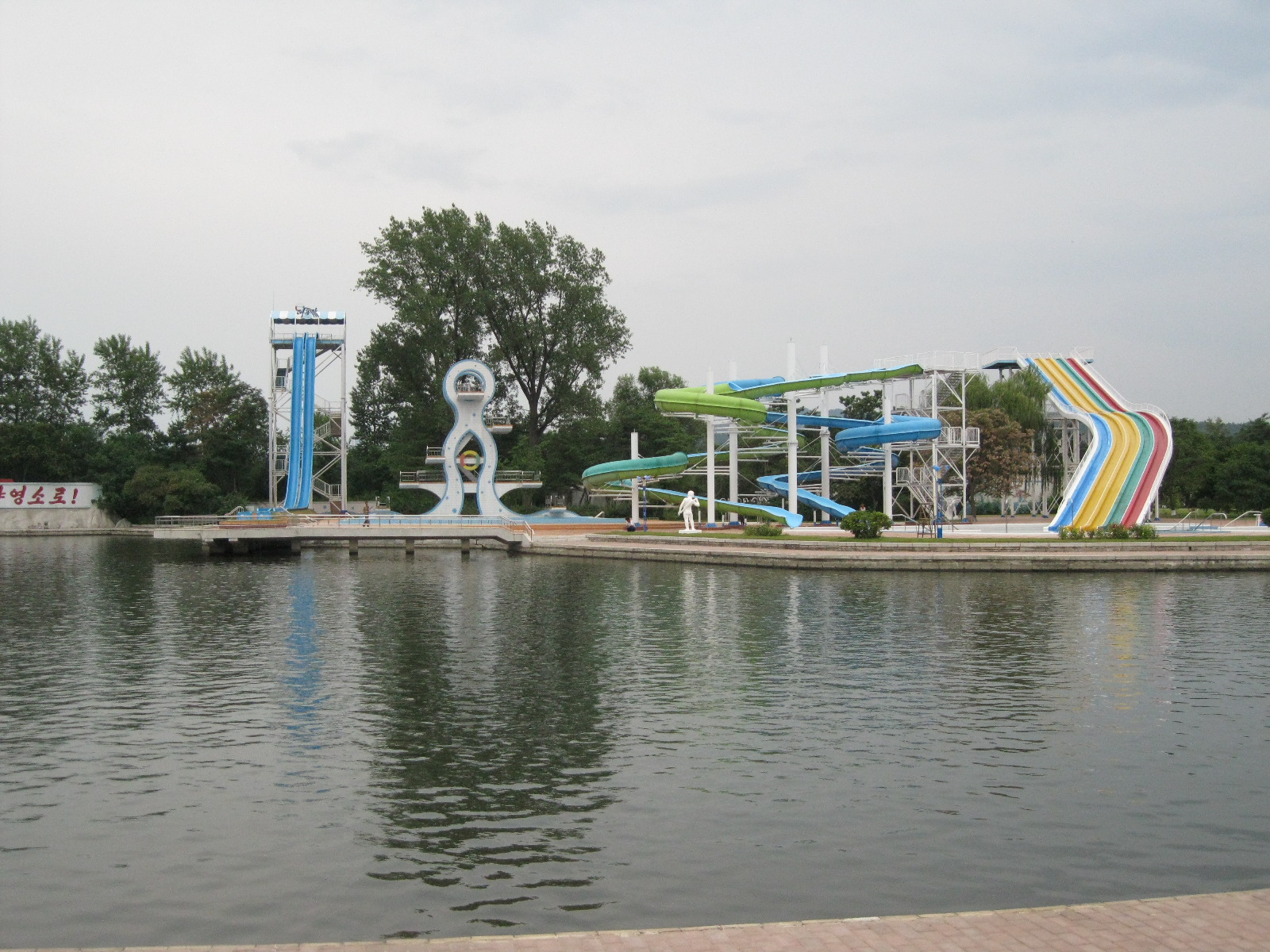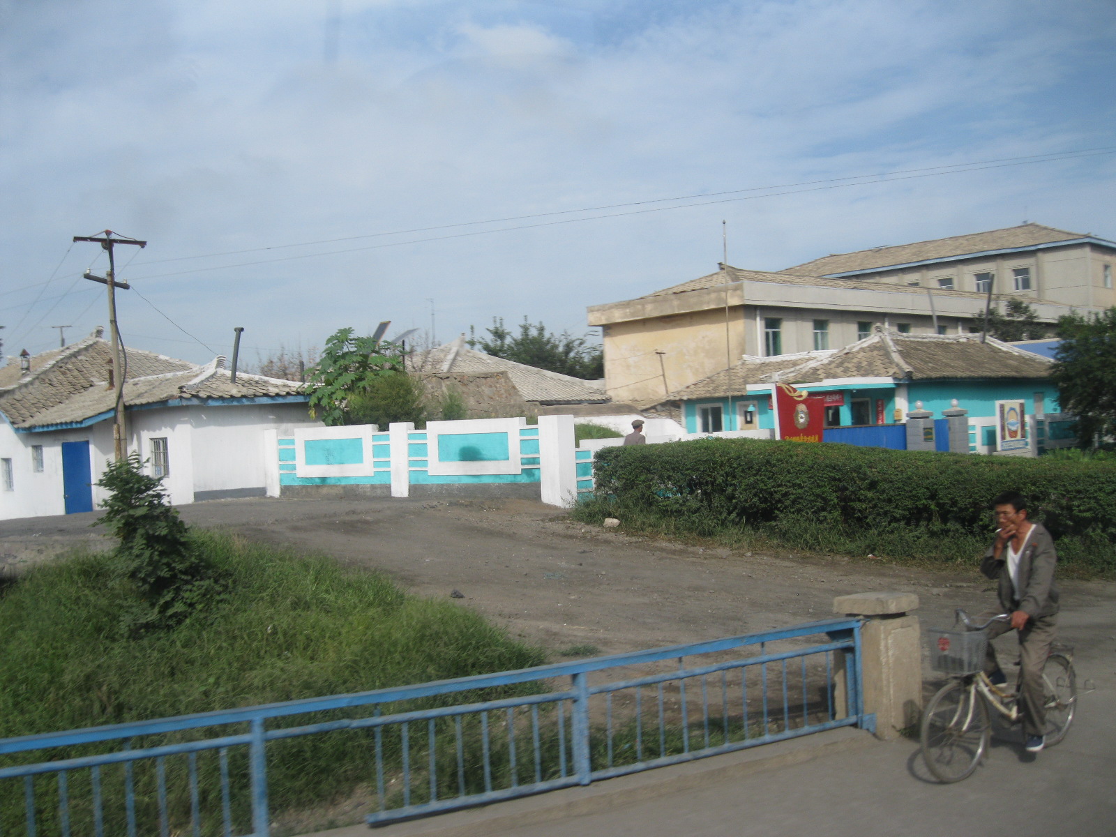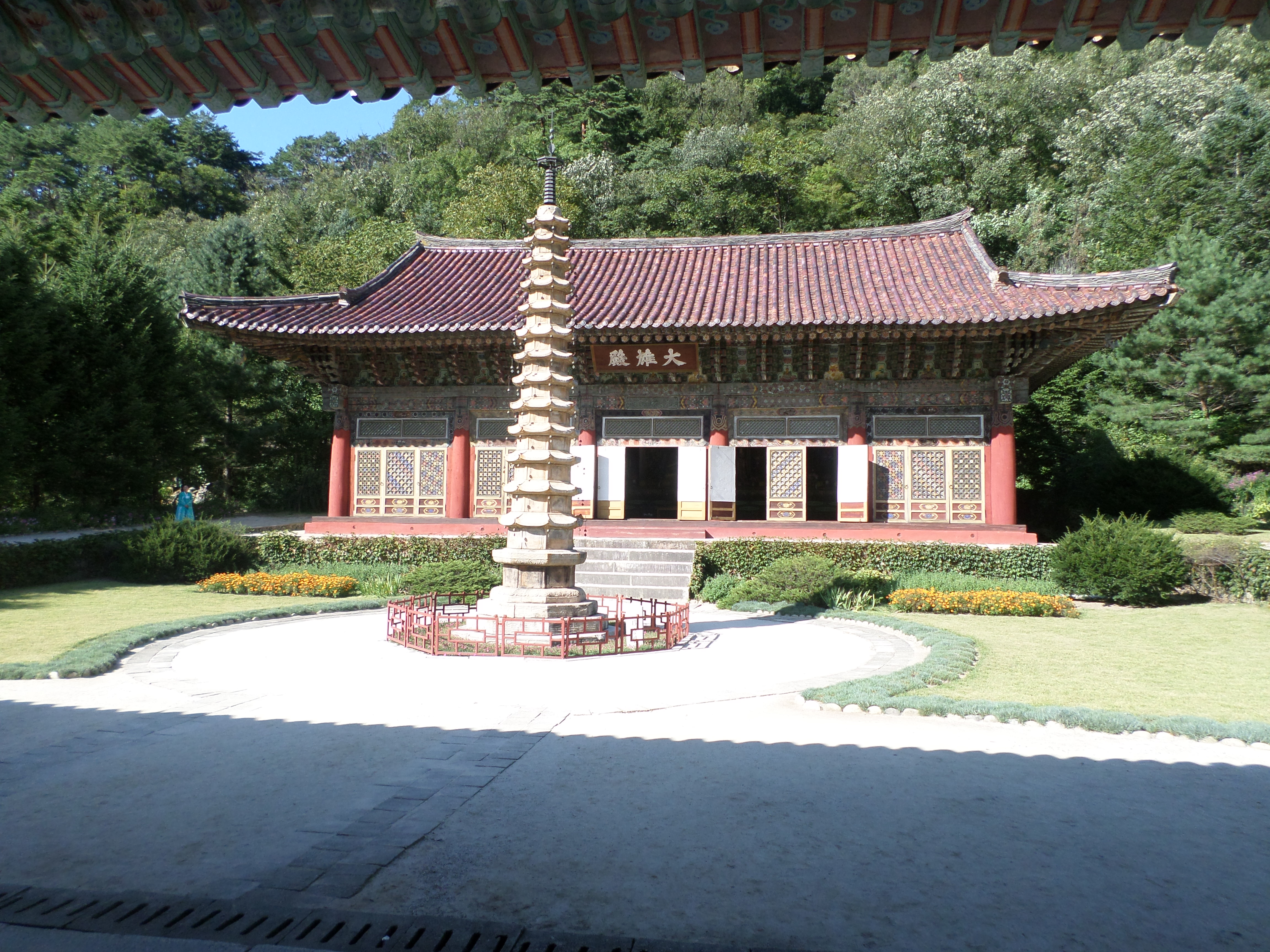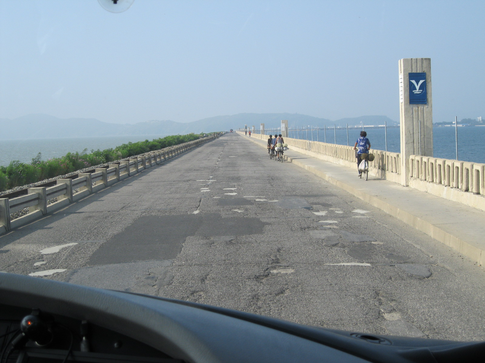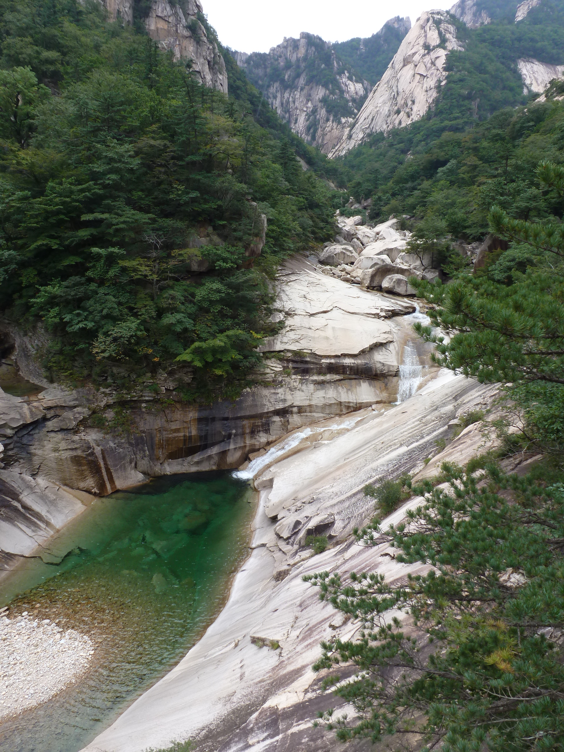 In Peking hebben we enkele uren tijd om ons voor te bereiden op de treinreis richting Noord-Korea. De trein vertrok rond 6u 's avonds. De volgende ochtend komen we aan in Dandong, een Chinese stad die grenst aan Noord-Korea.Het station van PekingDe slaapcabineHet restaurant op de trein. Een deel van het treinpersoneel was er al aan het eten. Ik besloot dan ook maar iets te eten. "Can I have a knife and fork?". "No sowwy". En de chinezen maar lachen.Op dag 3 arriveren we in Dandong, waar we een ontbijt krijgen. De rest van de treinreis wordt verdergezet op een andere trein richting de Noord-Koreaanse hoofdstad Pyongyang.Aankomst in DandongDandongIn de trein over de China-Noord-Korea Vriendschapsbrug. De Yalu rivier die we oversteken maakt een groot deel uit van de grens tussen China en Noord-Korea.Parallel loopt nog een brug, maar deze werd grotendeels vernield tijdens de Koreaanse oorlog.Links: Noord-Korea Rechts: ChinaAl snel verschijnen de portretten van de (overleden) grote leiders Kim Il Sung (links) en Kim Jong Il (rechts). Die zien we overal in Noord-Korea.Langs het platteland zien we vooral rijstvelden.Openbare werkenOnze Nederlandse reisbegeleider Jan is zeer fier op zijn Noord-Koreaanse badge. Deze badges worden door bijna alle Noord-Koreanen gedragen. Als buitenlander kan je deze badge enkel uitgereikt krijgen als je je loyaliteit bewezen hebt.In onze wagon zitten ook enkele Chinese toeristen. De meeste toeristen in Noord-Korea zijn Chinezen.Bij een tussenstop worden we gecontroleerd door Noord-Koreaanse militairen. Alle fototoestellen en telefoons worden geregistreerd, boeken en magazines worden nagekeken. Bagages worden slechts steekproefsgewijs doorgelicht. Onze paspoorten worden ook in beslag genomen. Die krijgen we pas terug op het einde van de reis.De rijstvelden zijn meestal in rechthoekige stukken ingedeeld, met bonenplanten om ze te scheiden.Tegen de avond rijden we Pyongyang binnen. Het volledige treintraject van Peking tot Pyongyang is 1371km lang en deden we ongeveer 24u over.Op dag 4 rijden we met de bus naar de industriestad Hamhung (함흥시). Hier bezoeken we oa. een fabriek van kunstmeststof.Het Yanggakdo International Hotel in Pyongyang waar we deze eerste nacht verbleven. Later keren we hier nog terug.Een tussenstop aan een meer langs het bergachtige landschap.Simon en ikDe bus waar we heel de reis mee rondtrokkenEen fotostop langs het bergachtige landschapDe gidsen vermelden dat zowat driekwart van het land bergen zijn. Omdat de Noord-Koreanen er naar streven om volledig zelfvoorzienend te zijn, wordt bijna alle vlakke grond gebruikt voor landbouw.Aan de linkerkant zie je onze Koreaanse gidsen. Meestal spreken Koreanen elkaar aan met hun volledige naam, maar gemakkelijkheidshalve mochten wij ze aanspreken als miss Kim (links) en miss Ha (rechts).Even dalen we af om een waterval te bezoeken. We picknicken hier in de buurt.De waterval zou in 2001 ontdekt zijn door Kim Jong Il, dankzij zijn fantastisch gehoor.BronwaterDit was een van de weinige maaltijden die ik volledig op kreeg. Op de bus krijgen we dan te horen dat de lunchschotels achtergelaten werden voor kinderen die de overschot zouden eten...De meeste wegen bestaan uit betonplaten.Een propagandabord langs de wegWe komen aan in Hamhung, de tweede grootste stad van Noord-Korea (~ 800.000 inwoners). We rijden hier voorbij een van de talrijke mozaïeken die we te zien zullen krijgen. Links: Kim Il Sung Midden: Kim Jong Il Rechts: Kim Jong Suk (de eerste vrouw van Kim Il Sung)Hamhung is nog maar enkele jaren "open" voor toeristen.Een fabriek van kunstmeststofBij elke bezienswaardigheid krijgen we te horen hoe vaak en wanneer juist de grote leiders die plaats bezocht hebben. Vaak zijn er mozaïeken die hun bezoek afbeelden.Binnen in de fabriekEr zijn maar weinig fabriekswerkers aanwezig, maar ze poseren wel graag voor een foto.'s avonds verblijven we in het Majon Tourist Resort aan de Oost-Koreaanse zee. Hier nemen we een frisse duik in het water.De huisjes waar we verblijven zijn vlak aan het strand.Onze zwembroeken buiten gehangen, maar echt droog werden ze niet door het vochtige klimaat.Het avondmaal. Zoals gewoonlijk werden er nog voortdurend bordjes bij gezet. Als je al vol zit krijg je dan nog een kom rijst en soep.'s middags en 's avonds was er als drank meestal plat water en bier, met de mogelijkheid om "juice" te drinken in plaats van bier. Dat was een soort appel/peren sap (niet op de foto).Onze kamerHier was geen stromend water, en diende het bad als waterreservoir. Wassen moest "op z'n Bangladesh" door een teiltje water over je gieten. In de rode emmer kon water elektrisch verwarmd worden.Op dag 5 bezoeken we nog enkele plaatsen in Hamhung, en vertrekken dan richting Mt. Kumgang. Onderweg bezoeken we oa. nog de kuststad Wonsan.Het huis van de voormalige koning Taejo van Joseon in Hamhung. Hij richtte de Koreaanse Joseondynastie op in 1392, die eindigde in 1897.Een zeer oude boomBuiten het huis stond een groep Koreaanse studenten te wachten.Een aangelegde (niet natuurlijke) heuvel met grote bronzen beelden van de leidersDe lokale gids die ons een woordje uitleg gaf. De plaatselijke gidsen spraken meestal Koreaans, dat dan naar Engels vertaald werd door onze gids miss Kim.Hamhung Grand TheatreWonsanDit verkeersbord leek met de hand geschilderd te zijn.Bezoek aan een de Chonsam coöperatieve boerderijEen persimmon boomOok de grote leiders zijn hier geweest.In het winkeltje van de boerderij kochten we enkele gedroogde persimmons.Naast de boerderij was er een kleuterschool. De kinderen zongen een liedje en wuifden ons dan uit.Iets verderop bezoeken we nog het huis van de boerin die ons begeleidde.Dit huis heeft een soort vloerverwarming die hier vaak toegepast zou worden. Op internet vond ik dit systeem terug als "Ondol".Wat voor een decoder is dat onder de TV? Telenet of Belgacom?Ten slotte bezochten we nog een boeddhistische tempel...Maar bij de tempel zelf mochten we niet komen, omdat er constructi
