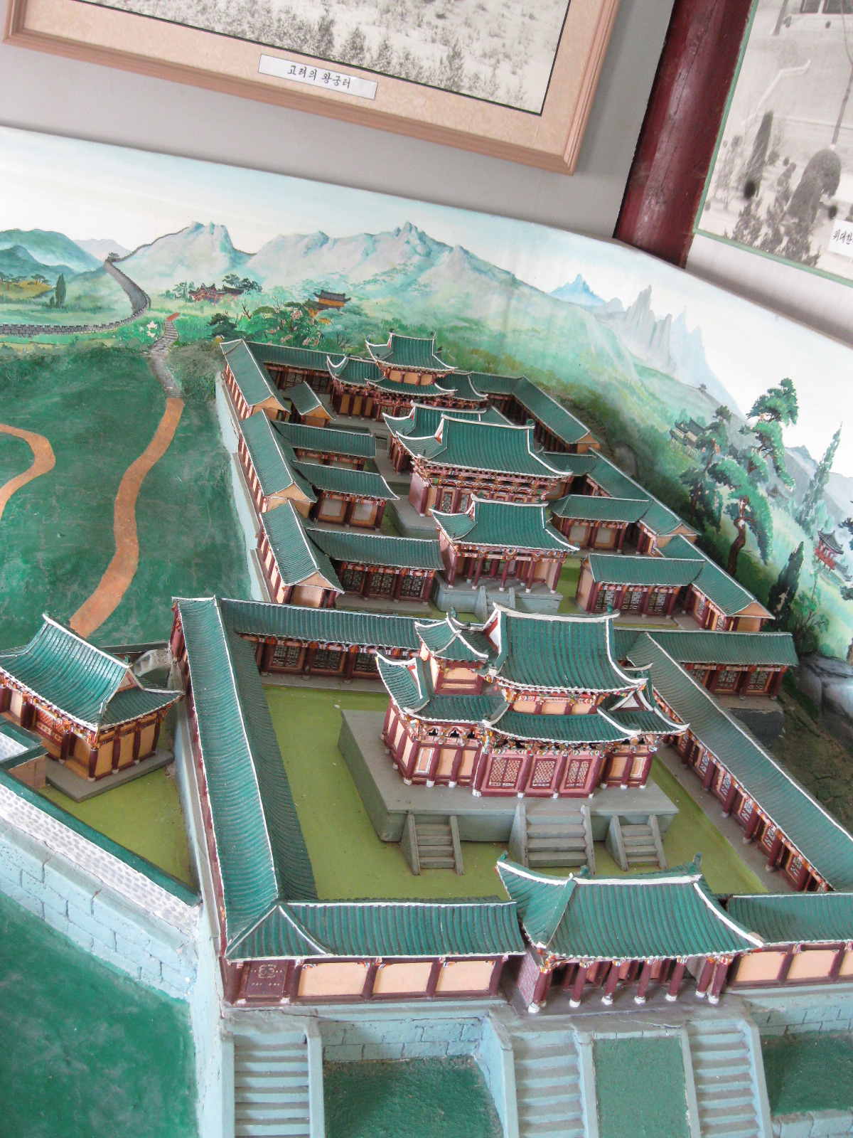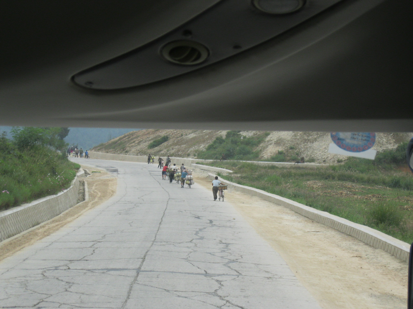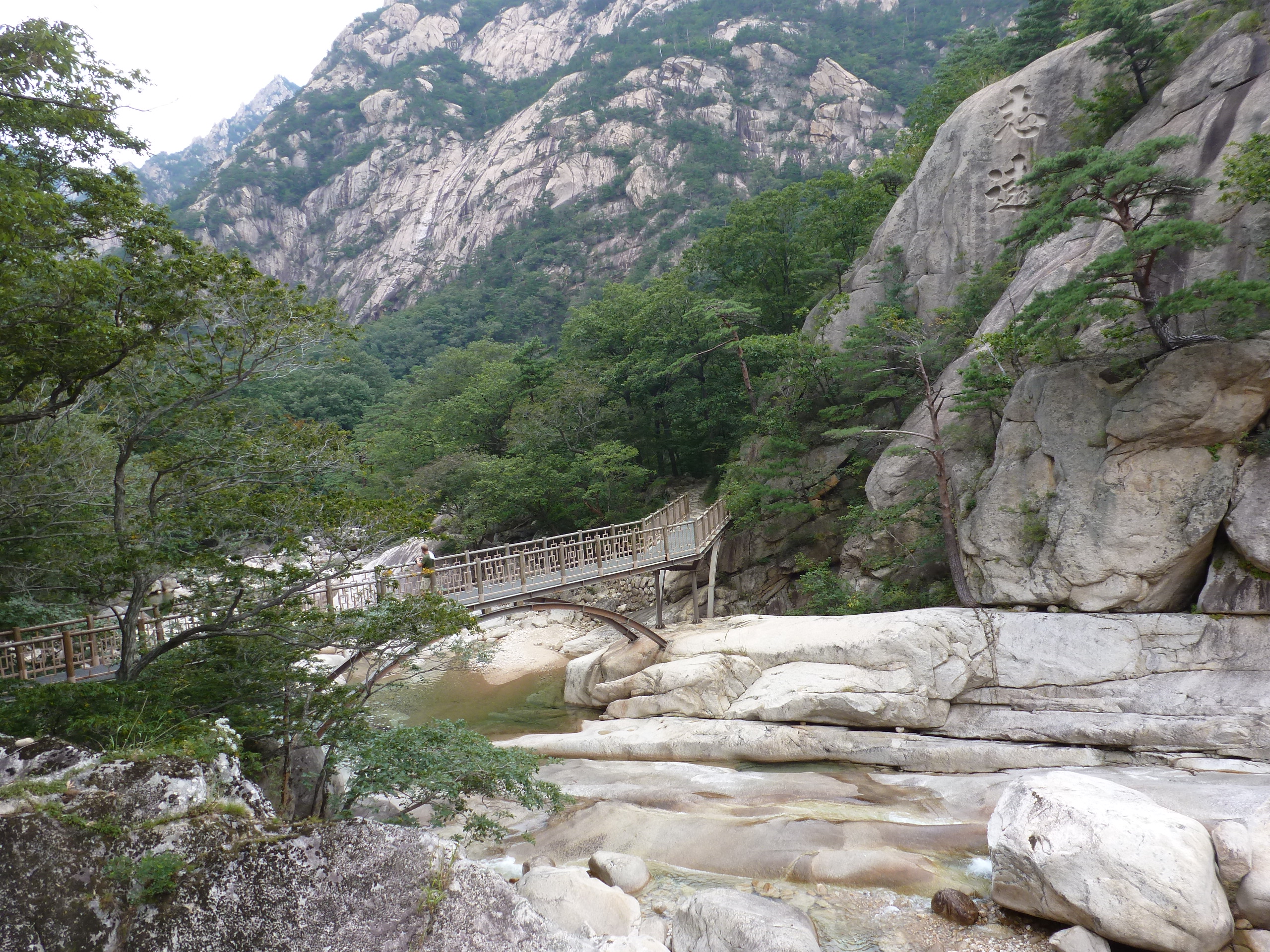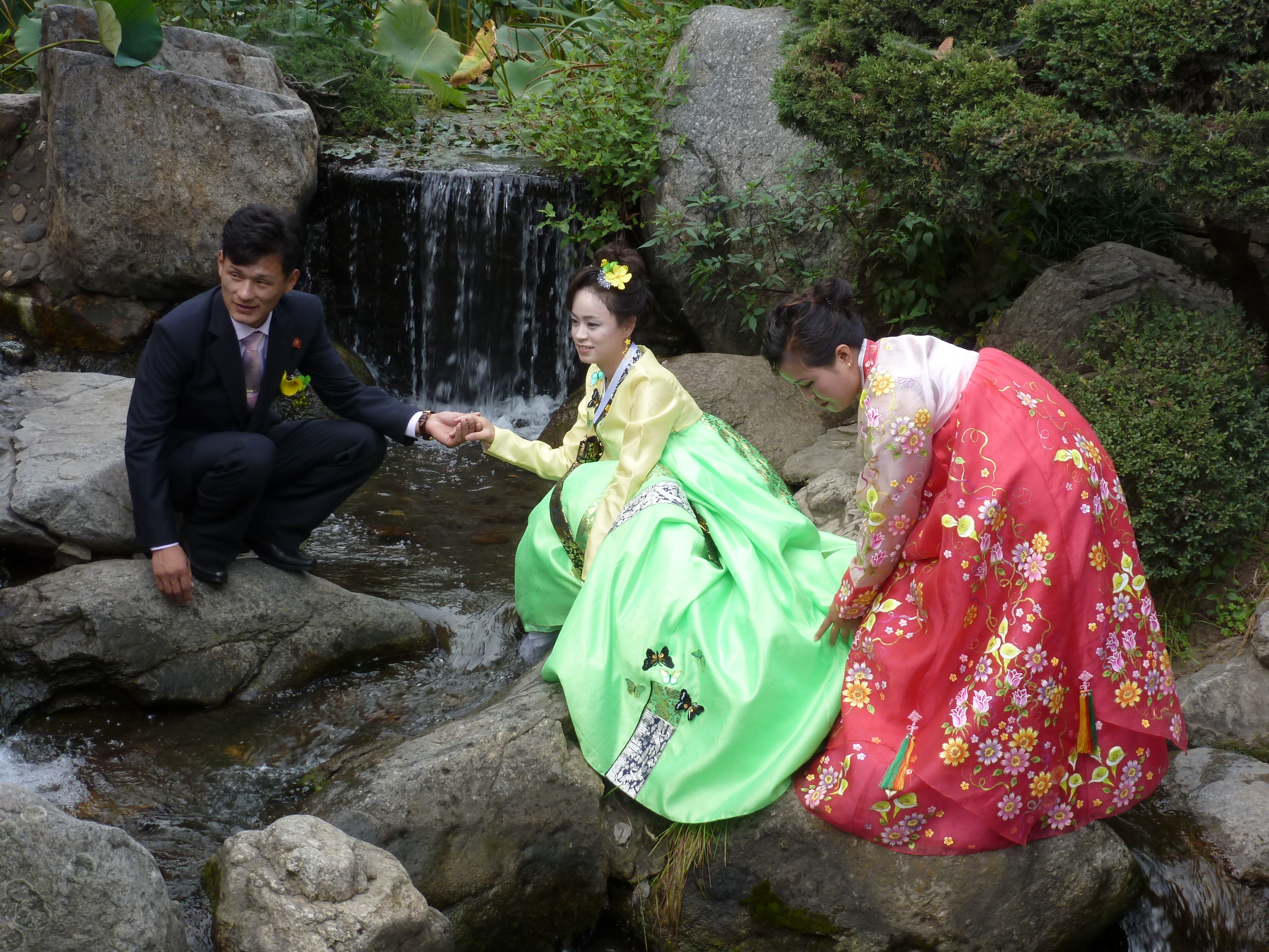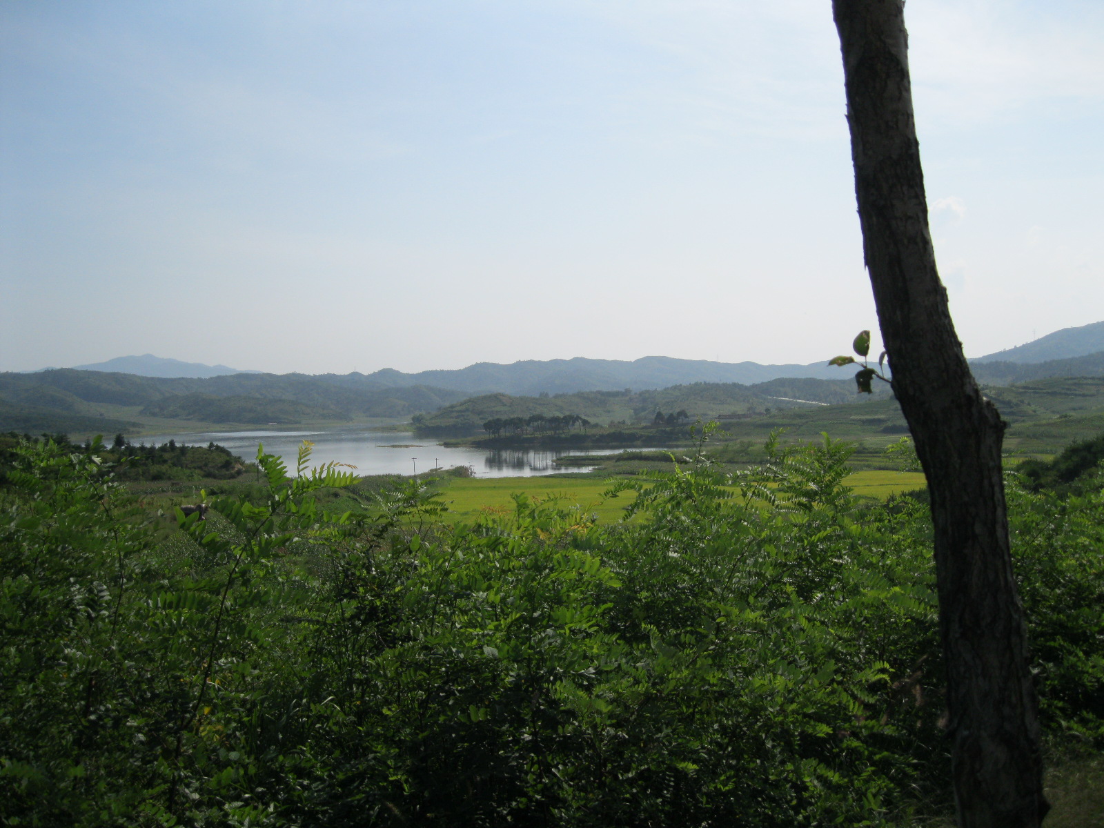 In Peking hebben we enkele uren tijd om ons voor te bereiden op de treinreis richting Noord-Korea. De trein vertrok rond 6u 's avonds. De volgende ochtend komen we aan in Dandong, een Chinese stad die grenst aan Noord-Korea.Het station van PekingDe slaapcabineHet restaurant op de trein. Een deel van het treinpersoneel was er al aan het eten. Ik besloot dan ook maar iets te eten. "Can I have a knife and fork?". "No sowwy". En de chinezen maar lachen.Op dag 3 arriveren we in Dandong, waar we een ontbijt krijgen. De rest van de treinreis wordt verdergezet op een andere trein richting de Noord-Koreaanse hoofdstad Pyongyang.Aankomst in DandongDandongIn de trein over de China-Noord-Korea Vriendschapsbrug. De Yalu rivier die we oversteken maakt een groot deel uit van de grens tussen China en Noord-Korea.Parallel loopt nog een brug, maar deze werd grotendeels vernield tijdens de Koreaanse oorlog.Links: Noord-Korea Rechts: ChinaAl snel verschijnen de portretten van de (overleden) grote leiders Kim Il Sung (links) en Kim Jong Il (rechts). Die zien we overal in Noord-Korea.Langs het platteland zien we vooral rijstvelden.Openbare werkenOnze Nederlandse reisbegeleider Jan is zeer fier op zijn Noord-Koreaanse badge. Deze badges worden door bijna alle Noord-Koreanen gedragen. Als buitenlander kan je deze badge enkel uitgereikt krijgen als je je loyaliteit bewezen hebt.In onze wagon zitten ook enkele Chinese toeristen. De meeste toeristen in Noord-Korea zijn Chinezen.Bij een tussenstop worden we gecontroleerd door Noord-Koreaanse militairen. Alle fototoestellen en telefoons worden geregistreerd, boeken en magazines worden nagekeken. Bagages worden slechts steekproefsgewijs doorgelicht. Onze paspoorten worden ook in beslag genomen. Die krijgen we pas terug op het einde van de reis.De rijstvelden zijn meestal in rechthoekige stukken ingedeeld, met bonenplanten om ze te scheiden.Tegen de avond rijden we Pyongyang binnen. Het volledige treintraject van Peking tot Pyongyang is 1371km lang en deden we ongeveer 24u over.Op dag 4 rijden we met de bus naar de industriestad Hamhung (함흥시). Hier bezoeken we oa. een fabriek van kunstmeststof.Het Yanggakdo International Hotel in Pyongyang waar we deze eerste nacht verbleven. Later keren we hier nog terug.Een tussenstop aan een meer langs het bergachtige landschap.Simon en ikDe bus waar we heel de reis mee rondtrokkenEen fotostop langs het bergachtige landschapDe gidsen vermelden dat zowat driekwart van het land bergen zijn. Omdat de Noord-Koreanen er naar streven om volledig zelfvoorzienend te zijn, wordt bijna alle vlakke grond gebruikt voor landbouw.Aan de linkerkant zie je onze Koreaanse gidsen. Meestal spreken Koreanen elkaar aan met hun volledige naam, maar gemakkelijkheidshalve mochten wij ze aanspreken als miss Kim (links) en miss Ha (rechts).Even dalen we af om een waterval te bezoeken. We picknicken hier in de buurt.De waterval zou in 2001 ontdekt zijn door Kim Jong Il, dankzij zijn fantastisch gehoor.BronwaterDit was een van de weinige maaltijden die ik volledig op kreeg. Op de bus krijgen we dan te horen dat de lunchschotels achtergelaten werden voor kinderen die de overschot zouden eten...De meeste wegen bestaan uit betonplaten.Een propagandabord langs de wegWe komen aan in Hamhung, de tweede grootste stad van Noord-Korea (~ 800.000 inwoners). We rijden hier voorbij een van de talrijke mozaïeken die we te zien zullen krijgen. Links: Kim Il Sung Midden: Kim Jong Il Rechts: Kim Jong Suk (de eerste vrouw van Kim Il Sung)Hamhung is nog maar enkele jaren "open" voor toeristen.Een fabriek van kunstmeststofBij elke bezienswaardigheid krijgen we te horen hoe vaak en wanneer juist de grote leiders die plaats bezocht hebben. Vaak zijn er mozaïeken die hun bezoek afbeelden.Binnen in de fabriekEr zijn maar weinig fabriekswerkers aanwezig, maar ze poseren wel graag voor een foto.'s avonds verblijven we in het Majon Tourist Resort aan de Oost-Koreaanse zee. Hier nemen we een frisse duik in het water.De huisjes waar we verblijven zijn vlak aan het strand.Onze zwembroeken buiten gehangen, maar echt droog werden ze niet door het vochtige klimaat.Het avondmaal. Zoals gewoonlijk werden er nog voortdurend bordjes bij gezet. Als je al vol zit krijg je dan nog een kom rijst en soep.'s middags en 's avonds was er als drank meestal plat water en bier, met de mogelijkheid om "juice" te drinken in plaats van bier. Dat was een soort appel/peren sap (niet op de foto).Onze kamerHier was geen stromend water, en diende het bad als waterreservoir. Wassen moest "op z'n Bangladesh" door een teiltje water over je gieten. In de rode emmer kon water elektrisch verwarmd worden.Op dag 5 bezoeken we nog enkele plaatsen in Hamhung, en vertrekken dan richting Mt. Kumgang. Onderweg bezoeken we oa. nog de kuststad Wonsan.Het huis van de voormalige koning Taejo van Joseon in Hamhung. Hij richtte de Koreaanse Joseondynastie op in 1392, die eindigde in 1897.Een zeer oude boomBuiten het huis stond een groep Koreaanse studenten te wachten.Een aangelegde (niet natuurlijke) heuvel met grote bronzen beelden van de leidersDe lokale gids die ons een woordje uitleg gaf. De plaatselijke gidsen spraken meestal Koreaans, dat dan naar Engels vertaald werd door onze gids miss Kim.Hamhung Grand TheatreWonsanDit verkeersbord leek met de hand geschilderd te zijn.Bezoek aan een de Chonsam coöperatieve boerderijEen persimmon boomOok de grote leiders zijn hier geweest.In het winkeltje van de boerderij kochten we enkele gedroogde persimmons.Naast de boerderij was er een kleuterschool. De kinderen zongen een liedje en wuifden ons dan uit.Iets verderop bezoeken we nog het huis van de boerin die ons begeleidde.Dit huis heeft een soort vloerverwarming die hier vaak toegepast zou worden. Op internet vond ik dit systeem terug als "Ondol".Wat voor een decoder is dat onder de TV? Telenet of Belgacom?Ten slotte bezochten we nog een boeddhistische tempel...Maar bij de tempel zelf mochten we niet komen, omdat er constructi