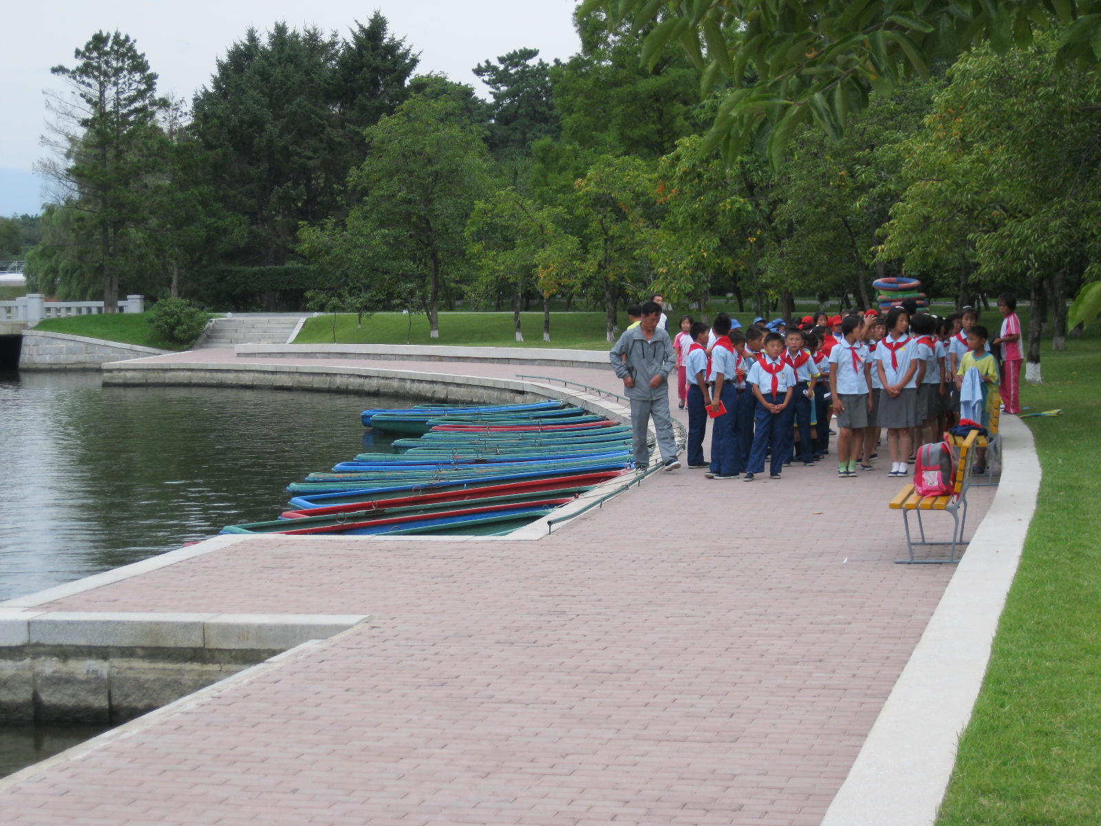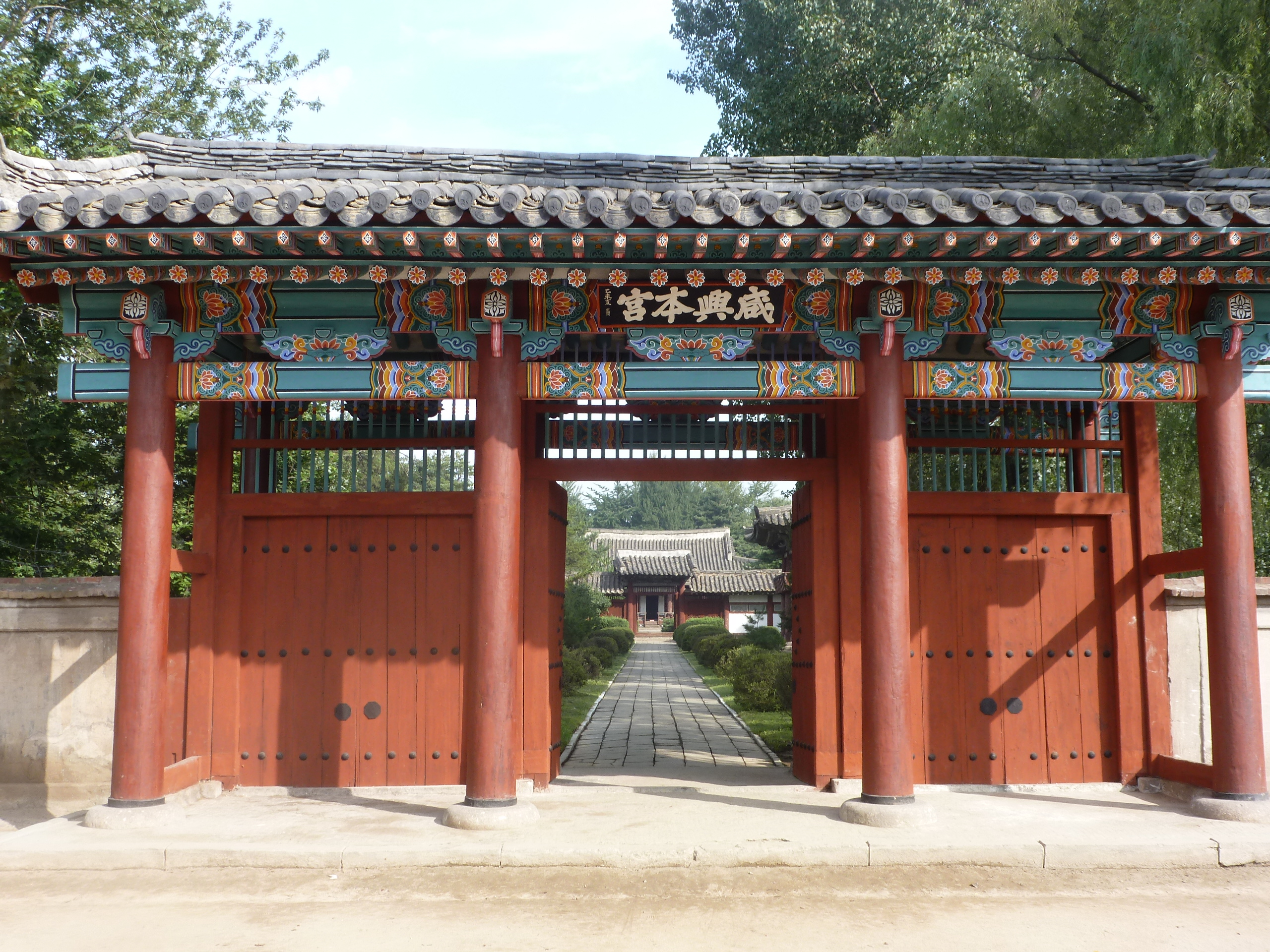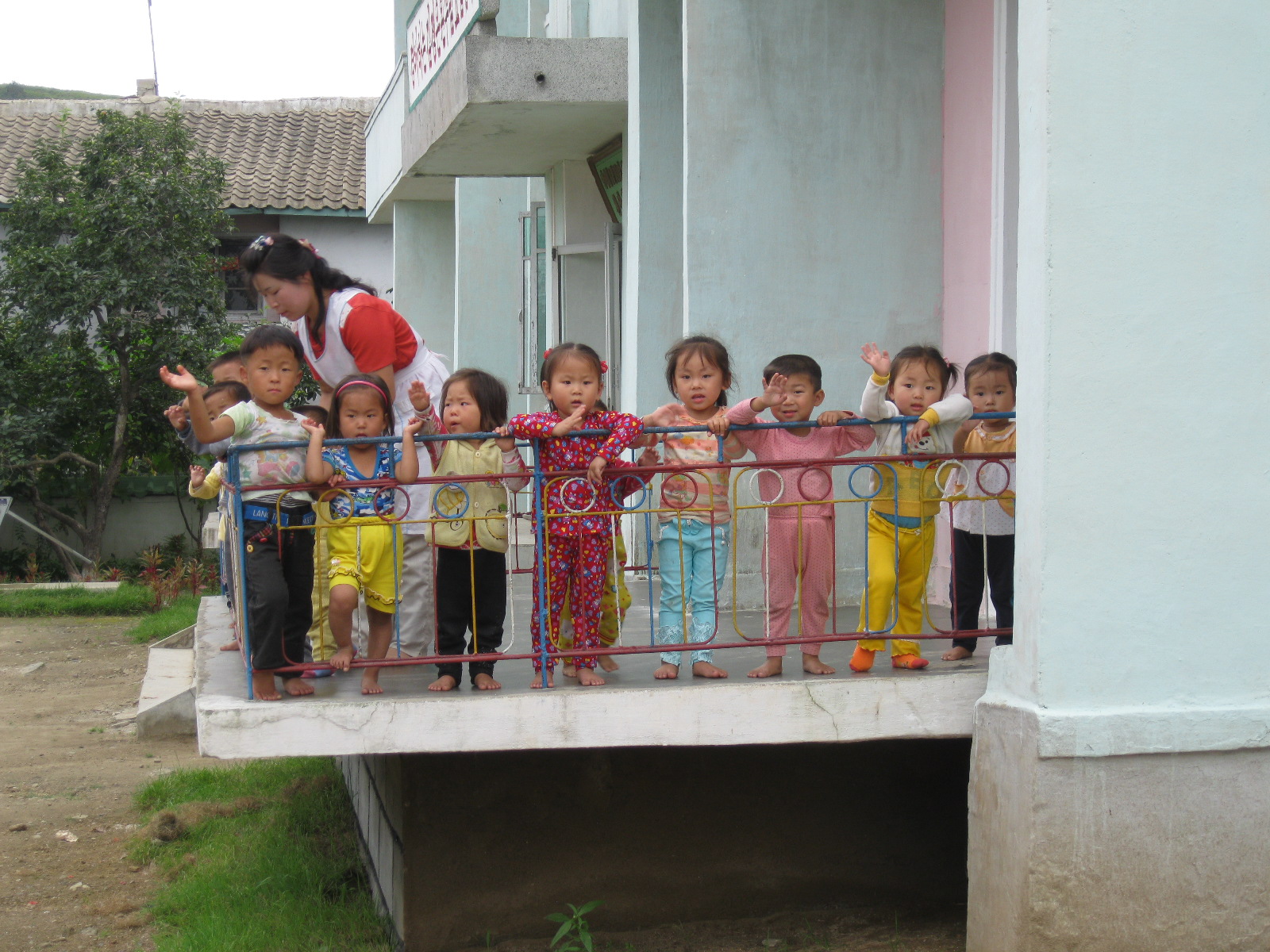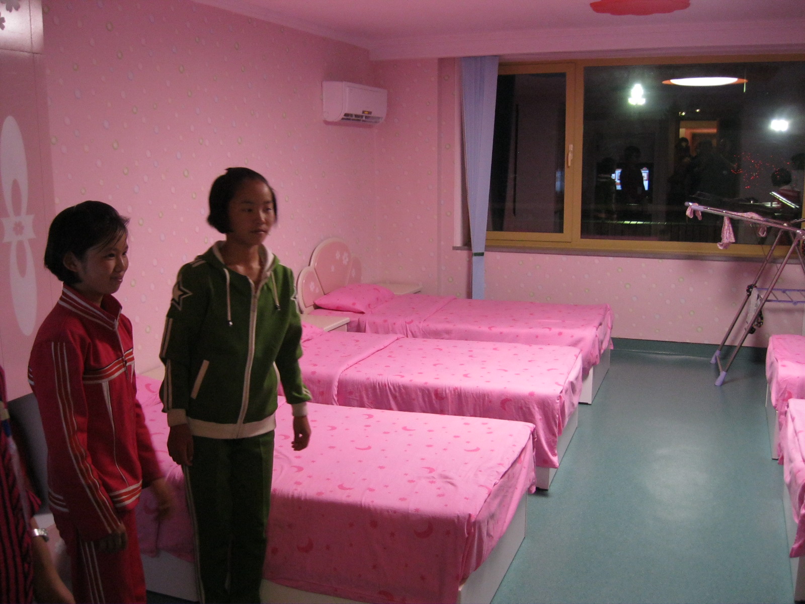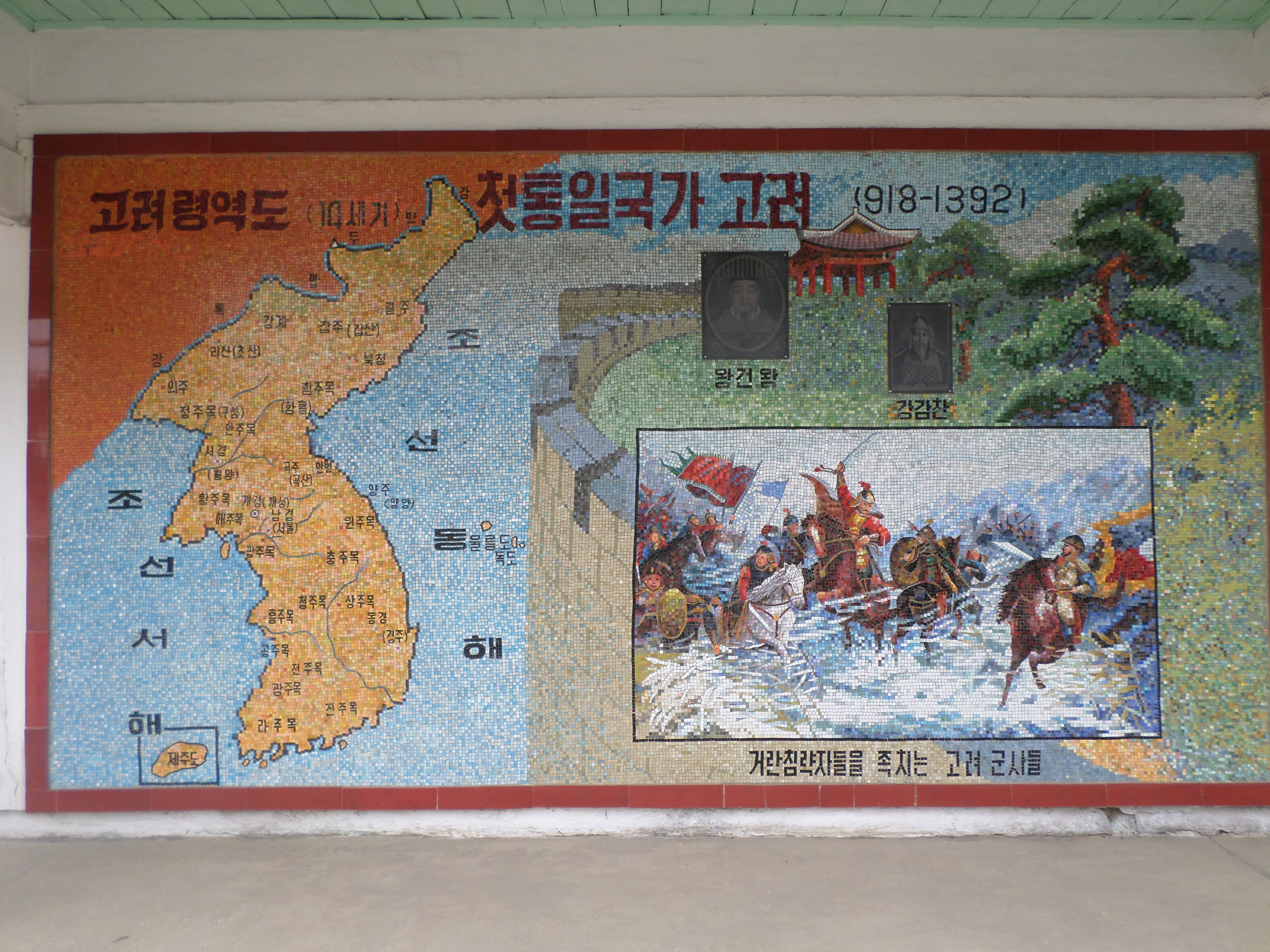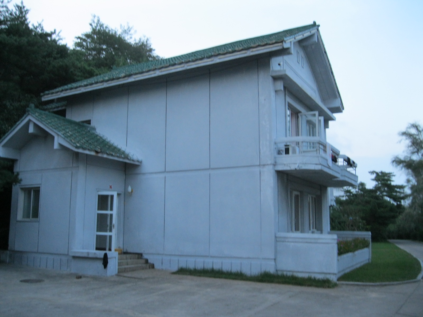 In Peking hebben we enkele uren tijd om ons voor te bereiden op de treinreis richting Noord-Korea. De trein vertrok rond 6u 's avonds. De volgende ochtend komen we aan in Dandong, een Chinese stad die grenst aan Noord-Korea.Het station van PekingDe slaapcabineHet restaurant op de trein. Een deel van het treinpersoneel was er al aan het eten. Ik besloot dan ook maar iets te eten. "Can I have a knife and fork?". "No sowwy". En de chinezen maar lachen.Op dag 3 arriveren we in Dandong, waar we een ontbijt krijgen. De rest van de treinreis wordt verdergezet op een andere trein richting de Noord-Koreaanse hoofdstad Pyongyang.Aankomst in DandongDandongIn de trein over de China-Noord-Korea Vriendschapsbrug. De Yalu rivier die we oversteken maakt een groot deel uit van de grens tussen China en Noord-Korea.Parallel loopt nog een brug, maar deze werd grotendeels vernield tijdens de Koreaanse oorlog.Links: Noord-Korea Rechts: ChinaAl snel verschijnen de portretten van de (overleden) grote leiders Kim Il Sung (links) en Kim Jong Il (rechts). Die zien we overal in Noord-Korea.Langs het platteland zien we vooral rijstvelden.Openbare werkenOnze Nederlandse reisbegeleider Jan is zeer fier op zijn Noord-Koreaanse badge. Deze badges worden door bijna alle Noord-Koreanen gedragen. Als buitenlander kan je deze badge enkel uitgereikt krijgen als je je loyaliteit bewezen hebt.In onze wagon zitten ook enkele Chinese toeristen. De meeste toeristen in Noord-Korea zijn Chinezen.Bij een tussenstop worden we gecontroleerd door Noord-Koreaanse militairen. Alle fototoestellen en telefoons worden geregistreerd, boeken en magazines worden nagekeken. Bagages worden slechts steekproefsgewijs doorgelicht. Onze paspoorten worden ook in beslag genomen. Die krijgen we pas terug op het einde van de reis.De rijstvelden zijn meestal in rechthoekige stukken ingedeeld, met bonenplanten om ze te scheiden.Tegen de avond rijden we Pyongyang binnen. Het volledige treintraject van Peking tot Pyongyang is 1371km lang en deden we ongeveer 24u over.Op dag 4 rijden we met de bus naar de industriestad Hamhung (함흥시). Hier bezoeken we oa. een fabriek van kunstmeststof.Het Yanggakdo International Hotel in Pyongyang waar we deze eerste nacht verbleven. Later keren we hier nog terug.Een tussenstop aan een meer langs het bergachtige landschap.Simon en ikDe bus waar we heel de reis mee rondtrokkenEen fotostop langs het bergachtige landschapDe gidsen vermelden dat zowat driekwart van het land bergen zijn. Omdat de Noord-Koreanen er naar streven om volledig zelfvoorzienend te zijn, wordt bijna alle vlakke grond gebruikt voor landbouw.Aan de linkerkant zie je onze Koreaanse gidsen. Meestal spreken Koreanen elkaar aan met hun volledige naam, maar gemakkelijkheidshalve mochten wij ze aanspreken als miss Kim (links) en miss Ha (rechts).Even dalen we af om een waterval te bezoeken. We picknicken hier in de buurt.De waterval zou in 2001 ontdekt zijn door Kim Jong Il, dankzij zijn fantastisch gehoor.BronwaterDit was een van de weinige maaltijden die ik volledig op kreeg. Op de bus krijgen we dan te horen dat de lunchschotels achtergelaten werden voor kinderen die de overschot zouden eten...De meeste wegen bestaan uit betonplaten.Een propagandabord langs de wegWe komen aan in Hamhung, de tweede grootste stad van Noord-Korea (~ 800.000 inwoners). We rijden hier voorbij een van de talrijke mozaïeken die we te zien zullen krijgen. Links: Kim Il Sung Midden: Kim Jong Il Rechts: Kim Jong Suk (de eerste vrouw van Kim Il Sung)Hamhung is nog maar enkele jaren "open" voor toeristen.Een fabriek van kunstmeststofBij elke bezienswaardigheid krijgen we te horen hoe vaak en wanneer juist de grote leiders die plaats bezocht hebben. Vaak zijn er mozaïeken die hun bezoek afbeelden.Binnen in de fabriekEr zijn maar weinig fabriekswerkers aanwezig, maar ze poseren wel graag voor een foto.'s avonds verblijven we in het Majon Tourist Resort aan de Oost-Koreaanse zee. Hier nemen we een frisse duik in het water.De huisjes waar we verblijven zijn vlak aan het strand.Onze zwembroeken buiten gehangen, maar echt droog werden ze niet door het vochtige klimaat.Het avondmaal. Zoals gewoonlijk werden er nog voortdurend bordjes bij gezet. Als je al vol zit krijg je dan nog een kom rijst en soep.'s middags en 's avonds was er als drank meestal plat water en bier, met de mogelijkheid om "juice" te drinken in plaats van bier. Dat was een soort appel/peren sap (niet op de foto).Onze kamerHier was geen stromend water, en diende het bad als waterreservoir. Wassen moest "op z'n Bangladesh" door een teiltje water over je gieten. In de rode emmer kon water elektrisch verwarmd worden.Op dag 5 bezoeken we nog enkele plaatsen in Hamhung, en vertrekken dan richting Mt. Kumgang. Onderweg bezoeken we oa. nog de kuststad Wonsan.Het huis van de voormalige koning Taejo van Joseon in Hamhung. Hij richtte de Koreaanse Joseondynastie op in 1392, die eindigde in 1897.Een zeer oude boomBuiten het huis stond een groep Koreaanse studenten te wachten.Een aangelegde (niet natuurlijke) heuvel met grote bronzen beelden van de leidersDe lokale gids die ons een woordje uitleg gaf. De plaatselijke gidsen spraken meestal Koreaans, dat dan naar Engels vertaald werd door onze gids miss Kim.Hamhung Grand TheatreWonsanDit verkeersbord leek met de hand geschilderd te zijn.Bezoek aan een de Chonsam coöperatieve boerderijEen persimmon boomOok de grote leiders zijn hier geweest.In het winkeltje van de boerderij kochten we enkele gedroogde persimmons.Naast de boerderij was er een kleuterschool. De kinderen zongen een liedje en wuifden ons dan uit.Iets verderop bezoeken we nog het huis van de boerin die ons begeleidde.Dit huis heeft een soort vloerverwarming die hier vaak toegepast zou worden. Op internet vond ik dit systeem terug als "Ondol".Wat voor een decoder is dat onder de TV? Telenet of Belgacom?Ten slotte bezochten we nog een boeddhistische tempel...Maar bij de tempel zelf mochten we niet komen, omdat er constructi