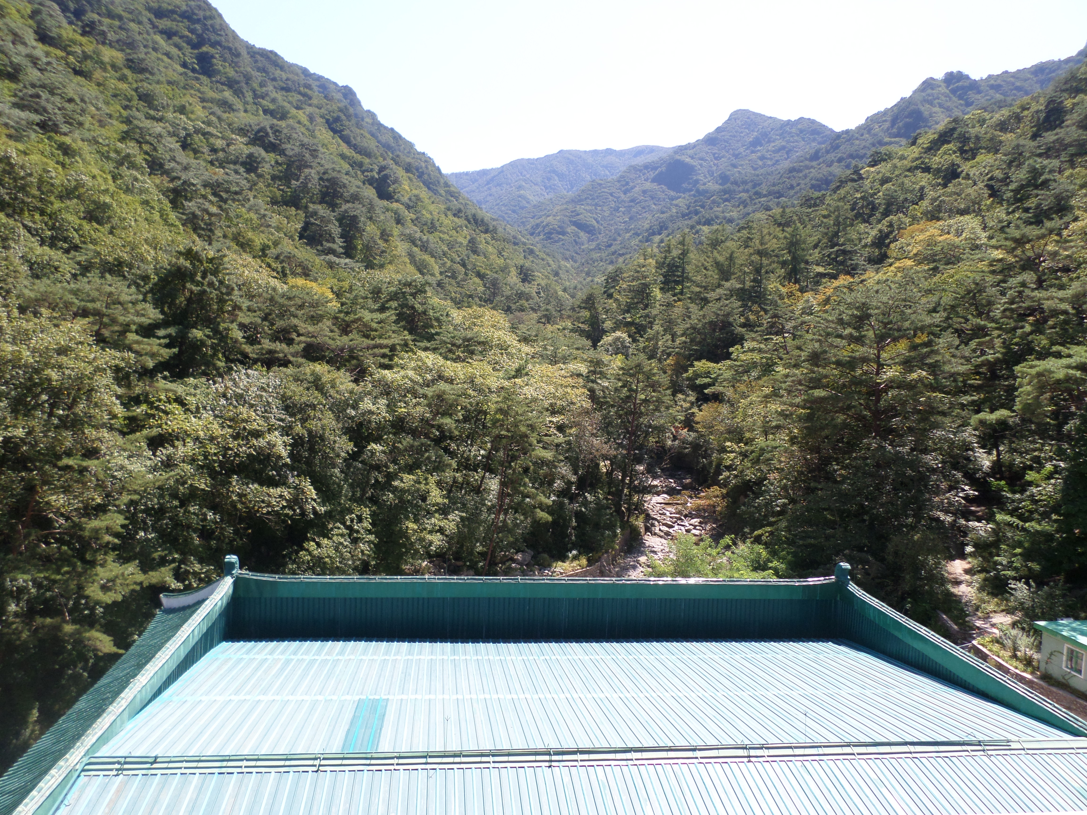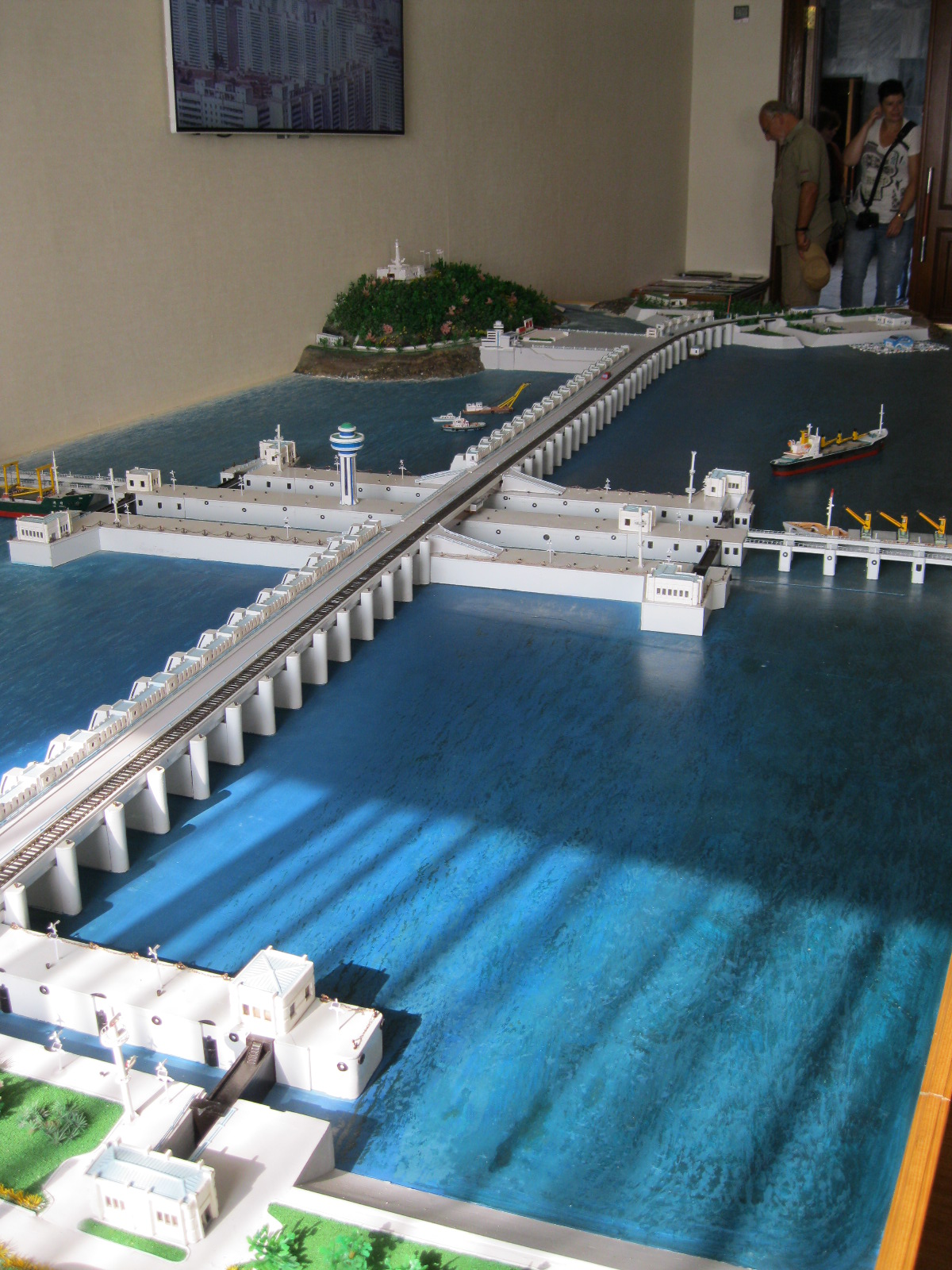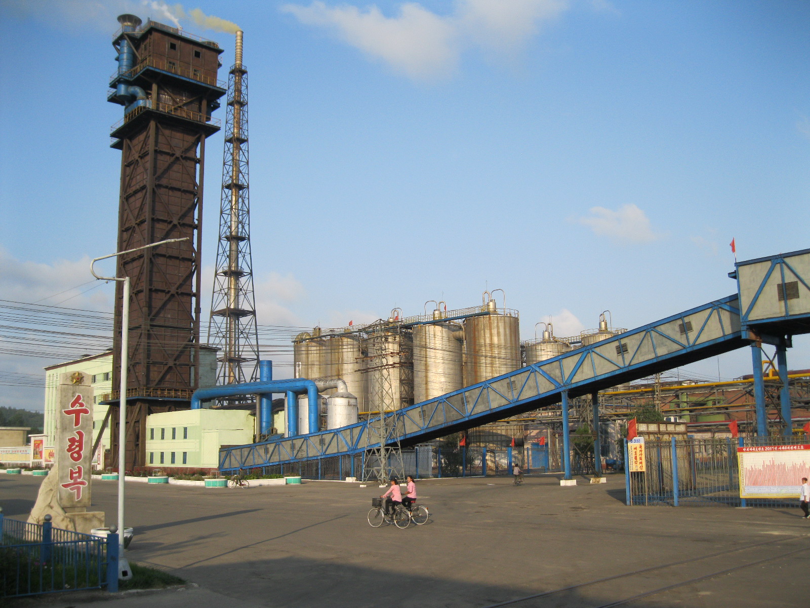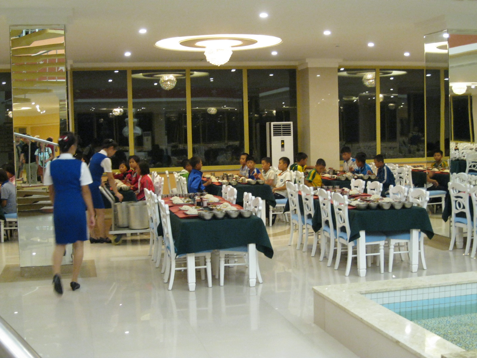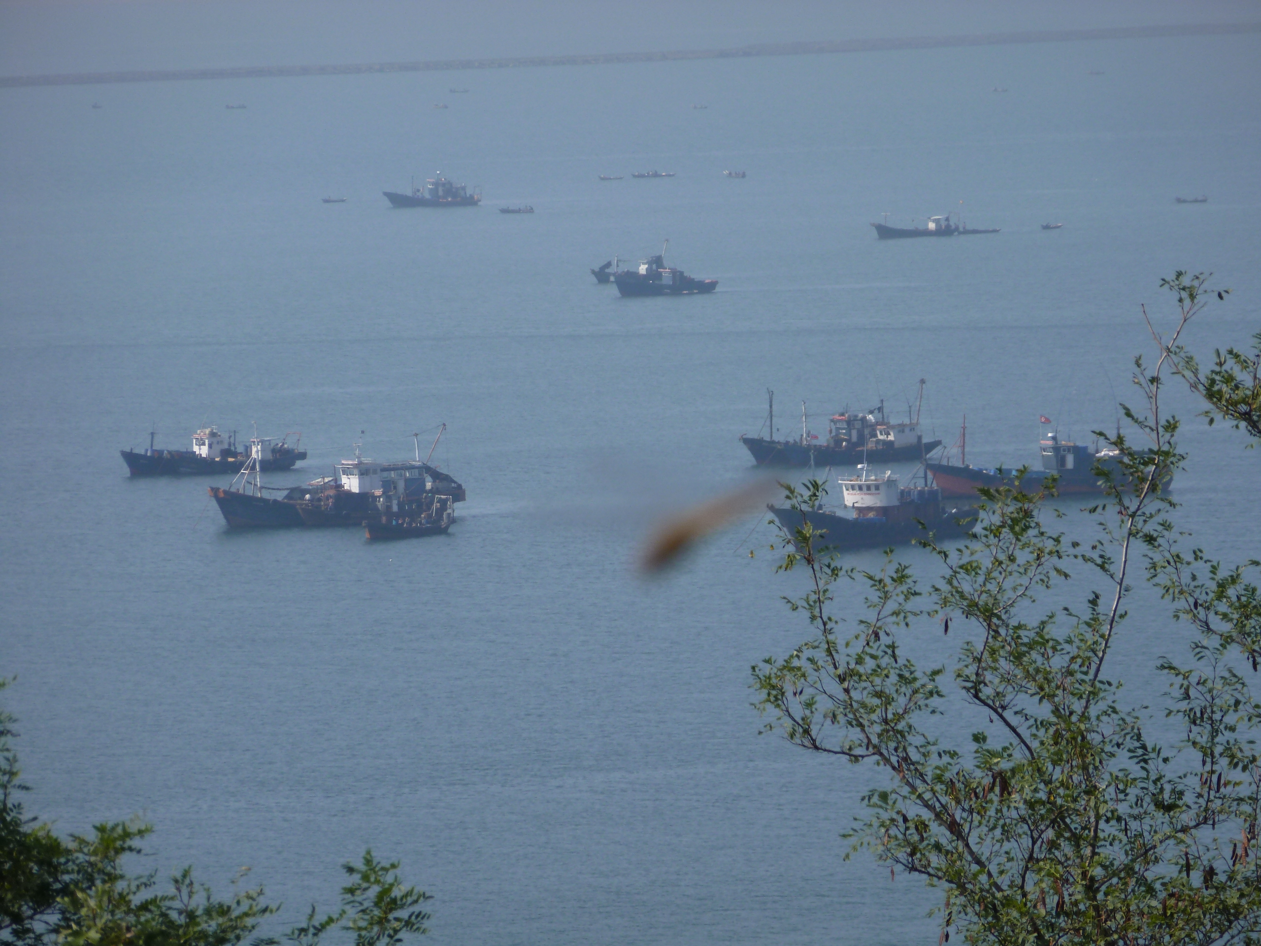 In Peking hebben we enkele uren tijd om ons voor te bereiden op de treinreis richting Noord-Korea. De trein vertrok rond 6u 's avonds. De volgende ochtend komen we aan in Dandong, een Chinese stad die grenst aan Noord-Korea.Het station van PekingDe slaapcabineHet restaurant op de trein. Een deel van het treinpersoneel was er al aan het eten. Ik besloot dan ook maar iets te eten. "Can I have a knife and fork?". "No sowwy". En de chinezen maar lachen.Op dag 3 arriveren we in Dandong, waar we een ontbijt krijgen. De rest van de treinreis wordt verdergezet op een andere trein richting de Noord-Koreaanse hoofdstad Pyongyang.Aankomst in DandongDandongIn de trein over de China-Noord-Korea Vriendschapsbrug. De Yalu rivier die we oversteken maakt een groot deel uit van de grens tussen China en Noord-Korea.Parallel loopt nog een brug, maar deze werd grotendeels vernield tijdens de Koreaanse oorlog.Links: Noord-Korea Rechts: ChinaAl snel verschijnen de portretten van de (overleden) grote leiders Kim Il Sung (links) en Kim Jong Il (rechts). Die zien we overal in Noord-Korea.Langs het platteland zien we vooral rijstvelden.Openbare werkenOnze Nederlandse reisbegeleider Jan is zeer fier op zijn Noord-Koreaanse badge. Deze badges worden door bijna alle Noord-Koreanen gedragen. Als buitenlander kan je deze badge enkel uitgereikt krijgen als je je loyaliteit bewezen hebt.In onze wagon zitten ook enkele Chinese toeristen. De meeste toeristen in Noord-Korea zijn Chinezen.Bij een tussenstop worden we gecontroleerd door Noord-Koreaanse militairen. Alle fototoestellen en telefoons worden geregistreerd, boeken en magazines worden nagekeken. Bagages worden slechts steekproefsgewijs doorgelicht. Onze paspoorten worden ook in beslag genomen. Die krijgen we pas terug op het einde van de reis.De rijstvelden zijn meestal in rechthoekige stukken ingedeeld, met bonenplanten om ze te scheiden.Tegen de avond rijden we Pyongyang binnen. Het volledige treintraject van Peking tot Pyongyang is 1371km lang en deden we ongeveer 24u over.Op dag 4 rijden we met de bus naar de industriestad Hamhung (함흥시). Hier bezoeken we oa. een fabriek van kunstmeststof.Het Yanggakdo International Hotel in Pyongyang waar we deze eerste nacht verbleven. Later keren we hier nog terug.Een tussenstop aan een meer langs het bergachtige landschap.Simon en ikDe bus waar we heel de reis mee rondtrokkenEen fotostop langs het bergachtige landschapDe gidsen vermelden dat zowat driekwart van het land bergen zijn. Omdat de Noord-Koreanen er naar streven om volledig zelfvoorzienend te zijn, wordt bijna alle vlakke grond gebruikt voor landbouw.Aan de linkerkant zie je onze Koreaanse gidsen. Meestal spreken Koreanen elkaar aan met hun volledige naam, maar gemakkelijkheidshalve mochten wij ze aanspreken als miss Kim (links) en miss Ha (rechts).Even dalen we af om een waterval te bezoeken. We picknicken hier in de buurt.De waterval zou in 2001 ontdekt zijn door Kim Jong Il, dankzij zijn fantastisch gehoor.BronwaterDit was een van de weinige maaltijden die ik volledig op kreeg. Op de bus krijgen we dan te horen dat de lunchschotels achtergelaten werden voor kinderen die de overschot zouden eten...De meeste wegen bestaan uit betonplaten.Een propagandabord langs de wegWe komen aan in Hamhung, de tweede grootste stad van Noord-Korea (~ 800.000 inwoners). We rijden hier voorbij een van de talrijke mozaïeken die we te zien zullen krijgen. Links: Kim Il Sung Midden: Kim Jong Il Rechts: Kim Jong Suk (de eerste vrouw van Kim Il Sung)Hamhung is nog maar enkele jaren "open" voor toeristen.Een fabriek van kunstmeststofBij elke bezienswaardigheid krijgen we te horen hoe vaak en wanneer juist de grote leiders die plaats bezocht hebben. Vaak zijn er mozaïeken die hun bezoek afbeelden.Binnen in de fabriekEr zijn maar weinig fabriekswerkers aanwezig, maar ze poseren wel graag voor een foto.'s avonds verblijven we in het Majon Tourist Resort aan de Oost-Koreaanse zee. Hier nemen we een frisse duik in het water.De huisjes waar we verblijven zijn vlak aan het strand.Onze zwembroeken buiten gehangen, maar echt droog werden ze niet door het vochtige klimaat.Het avondmaal. Zoals gewoonlijk werden er nog voortdurend bordjes bij gezet. Als je al vol zit krijg je dan nog een kom rijst en soep.'s middags en 's avonds was er als drank meestal plat water en bier, met de mogelijkheid om "juice" te drinken in plaats van bier. Dat was een soort appel/peren sap (niet op de foto).Onze kamerHier was geen stromend water, en diende het bad als waterreservoir. Wassen moest "op z'n Bangladesh" door een teiltje water over je gieten. In de rode emmer kon water elektrisch verwarmd worden.Op dag 5 bezoeken we nog enkele plaatsen in Hamhung, en vertrekken dan richting Mt. Kumgang. Onderweg bezoeken we oa. nog de kuststad Wonsan.Het huis van de voormalige koning Taejo van Joseon in Hamhung. Hij richtte de Koreaanse Joseondynastie op in 1392, die eindigde in 1897.Een zeer oude boomBuiten het huis stond een groep Koreaanse studenten te wachten.Een aangelegde (niet natuurlijke) heuvel met grote bronzen beelden van de leidersDe lokale gids die ons een woordje uitleg gaf. De plaatselijke gidsen spraken meestal Koreaans, dat dan naar Engels vertaald werd door onze gids miss Kim.Hamhung Grand TheatreWonsanDit verkeersbord leek met de hand geschilderd te zijn.Bezoek aan een de Chonsam coöperatieve boerderijEen persimmon boomOok de grote leiders zijn hier geweest.In het winkeltje van de boerderij kochten we enkele gedroogde persimmons.Naast de boerderij was er een kleuterschool. De kinderen zongen een liedje en wuifden ons dan uit.Iets verderop bezoeken we nog het huis van de boerin die ons begeleidde.Dit huis heeft een soort vloerverwarming die hier vaak toegepast zou worden. Op internet vond ik dit systeem terug als "Ondol".Wat voor een decoder is dat onder de TV? Telenet of Belgacom?Ten slotte bezochten we nog een boeddhistische tempel...Maar bij de tempel zelf mochten we niet komen, omdat er constructi