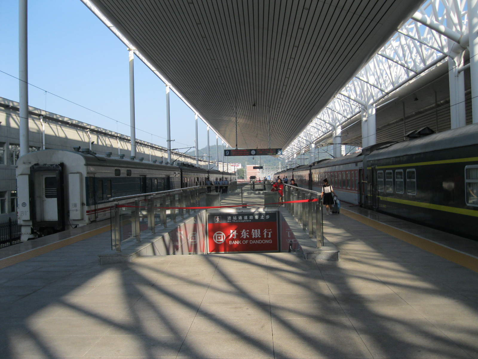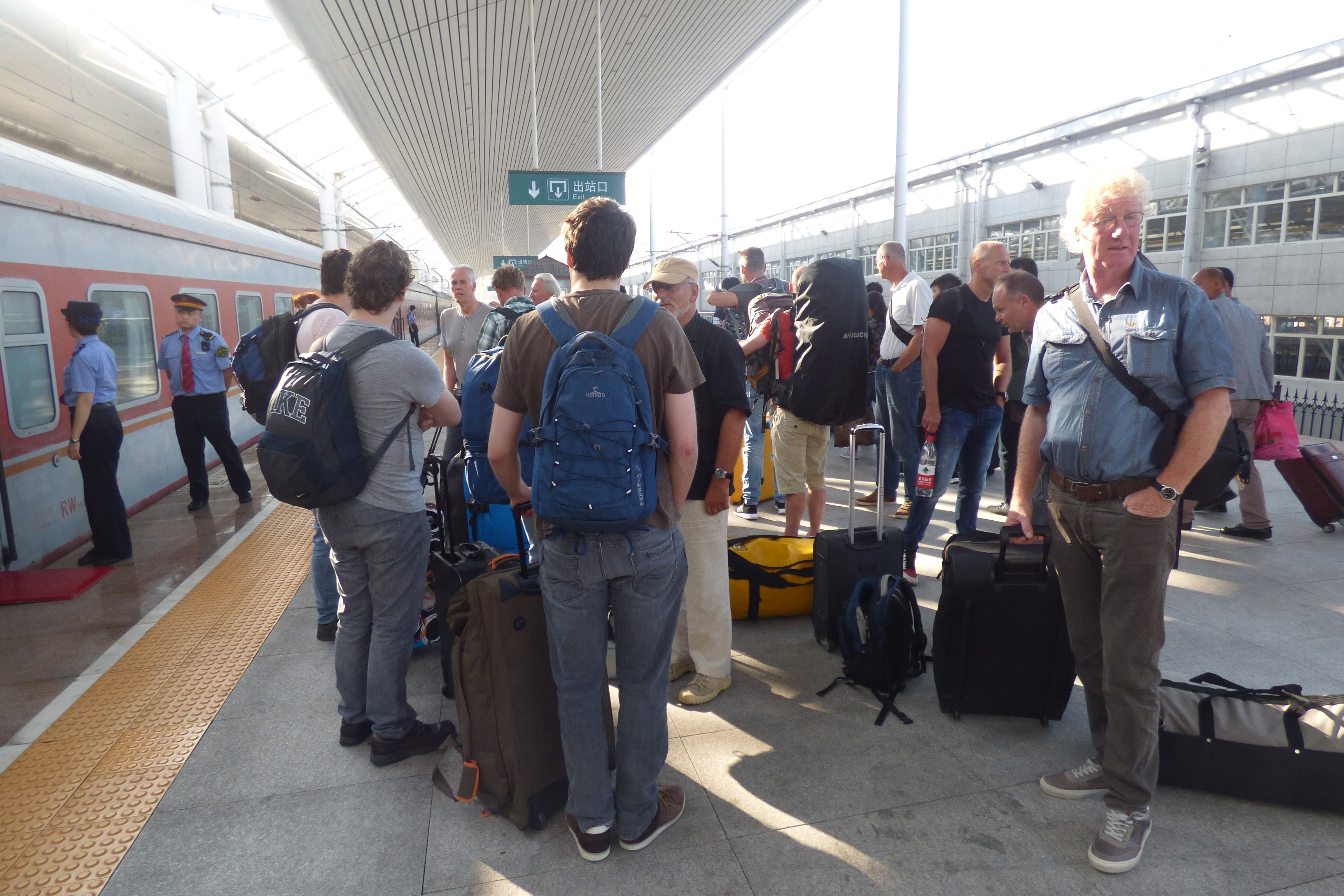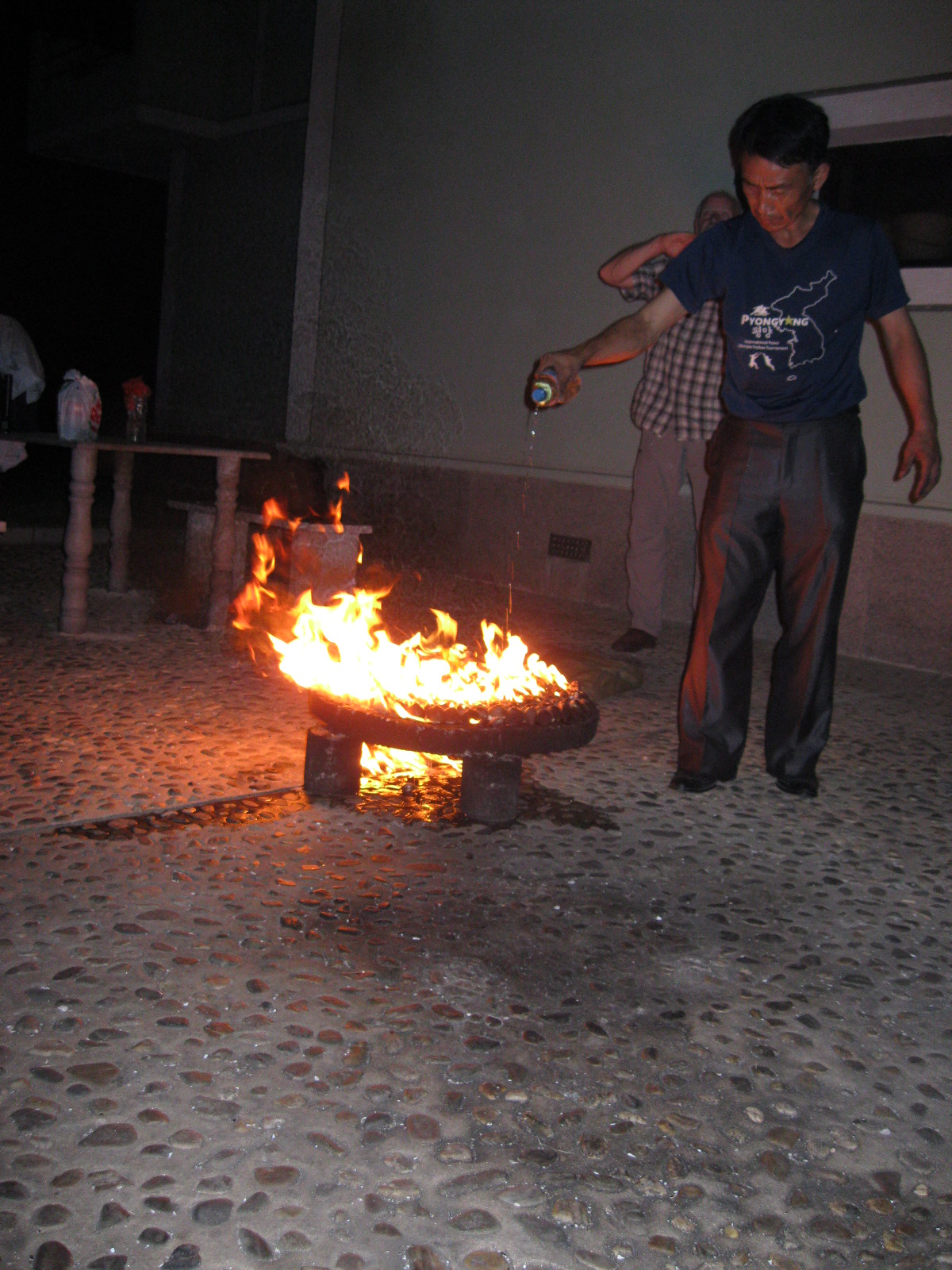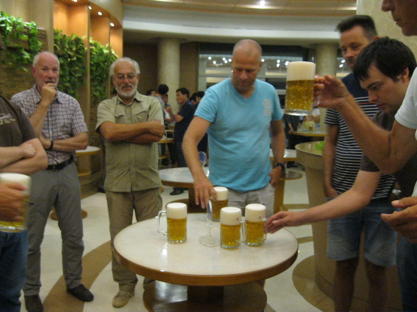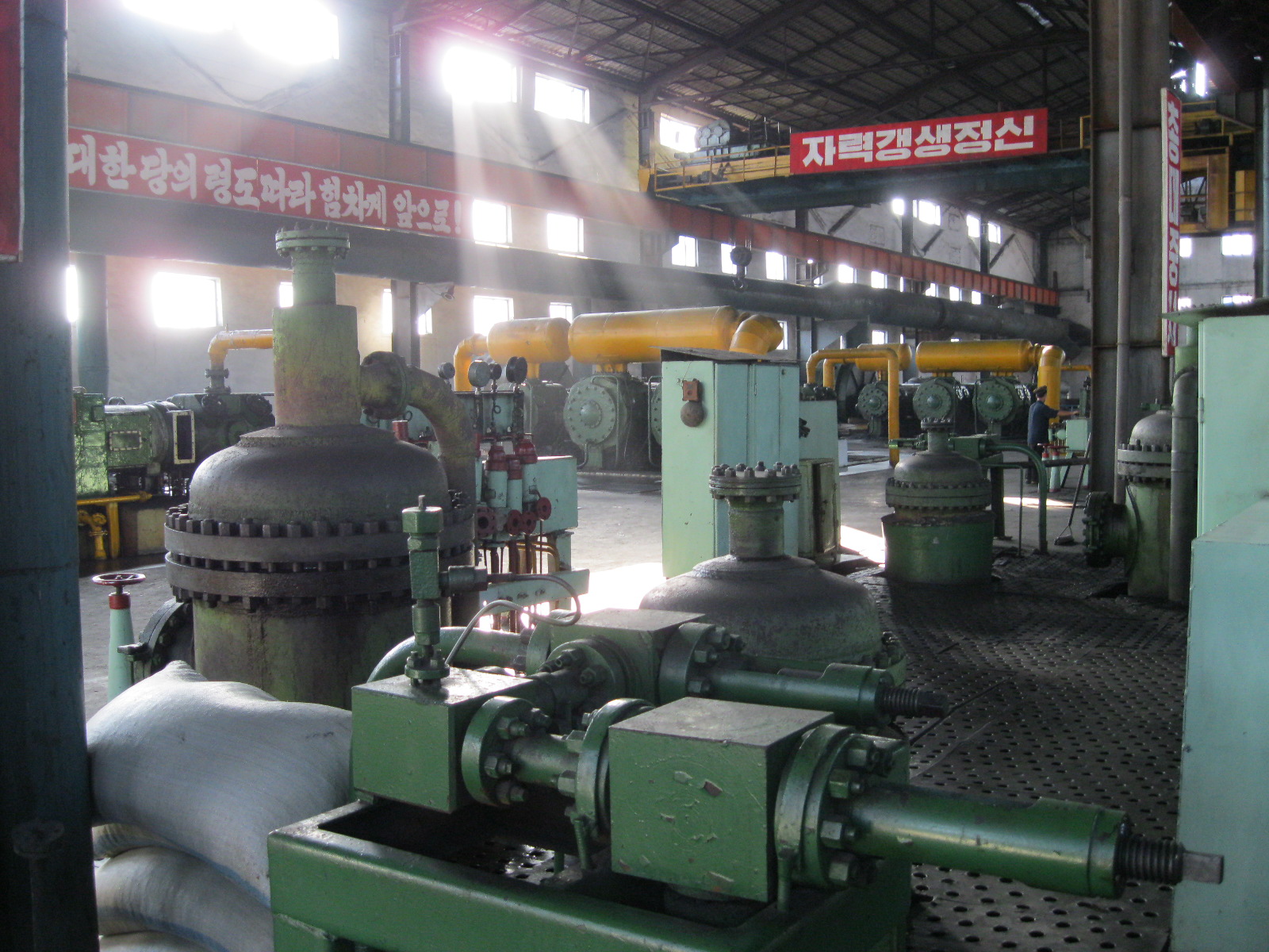 In Peking hebben we enkele uren tijd om ons voor te bereiden op de treinreis richting Noord-Korea. De trein vertrok rond 6u 's avonds. De volgende ochtend komen we aan in Dandong, een Chinese stad die grenst aan Noord-Korea.Het station van PekingDe slaapcabineHet restaurant op de trein. Een deel van het treinpersoneel was er al aan het eten. Ik besloot dan ook maar iets te eten. "Can I have a knife and fork?". "No sowwy". En de chinezen maar lachen.Op dag 3 arriveren we in Dandong, waar we een ontbijt krijgen. De rest van de treinreis wordt verdergezet op een andere trein richting de Noord-Koreaanse hoofdstad Pyongyang.Aankomst in DandongDandongIn de trein over de China-Noord-Korea Vriendschapsbrug. De Yalu rivier die we oversteken maakt een groot deel uit van de grens tussen China en Noord-Korea.Parallel loopt nog een brug, maar deze werd grotendeels vernield tijdens de Koreaanse oorlog.Links: Noord-Korea Rechts: ChinaAl snel verschijnen de portretten van de (overleden) grote leiders Kim Il Sung (links) en Kim Jong Il (rechts). Die zien we overal in Noord-Korea.Langs het platteland zien we vooral rijstvelden.Openbare werkenOnze Nederlandse reisbegeleider Jan is zeer fier op zijn Noord-Koreaanse badge. Deze badges worden door bijna alle Noord-Koreanen gedragen. Als buitenlander kan je deze badge enkel uitgereikt krijgen als je je loyaliteit bewezen hebt.In onze wagon zitten ook enkele Chinese toeristen. De meeste toeristen in Noord-Korea zijn Chinezen.Bij een tussenstop worden we gecontroleerd door Noord-Koreaanse militairen. Alle fototoestellen en telefoons worden geregistreerd, boeken en magazines worden nagekeken. Bagages worden slechts steekproefsgewijs doorgelicht. Onze paspoorten worden ook in beslag genomen. Die krijgen we pas terug op het einde van de reis.De rijstvelden zijn meestal in rechthoekige stukken ingedeeld, met bonenplanten om ze te scheiden.Tegen de avond rijden we Pyongyang binnen. Het volledige treintraject van Peking tot Pyongyang is 1371km lang en deden we ongeveer 24u over.Op dag 4 rijden we met de bus naar de industriestad Hamhung (함흥시). Hier bezoeken we oa. een fabriek van kunstmeststof.Het Yanggakdo International Hotel in Pyongyang waar we deze eerste nacht verbleven. Later keren we hier nog terug.Een tussenstop aan een meer langs het bergachtige landschap.Simon en ikDe bus waar we heel de reis mee rondtrokkenEen fotostop langs het bergachtige landschapDe gidsen vermelden dat zowat driekwart van het land bergen zijn. Omdat de Noord-Koreanen er naar streven om volledig zelfvoorzienend te zijn, wordt bijna alle vlakke grond gebruikt voor landbouw.Aan de linkerkant zie je onze Koreaanse gidsen. Meestal spreken Koreanen elkaar aan met hun volledige naam, maar gemakkelijkheidshalve mochten wij ze aanspreken als miss Kim (links) en miss Ha (rechts).Even dalen we af om een waterval te bezoeken. We picknicken hier in de buurt.De waterval zou in 2001 ontdekt zijn door Kim Jong Il, dankzij zijn fantastisch gehoor.BronwaterDit was een van de weinige maaltijden die ik volledig op kreeg. Op de bus krijgen we dan te horen dat de lunchschotels achtergelaten werden voor kinderen die de overschot zouden eten...De meeste wegen bestaan uit betonplaten.Een propagandabord langs de wegWe komen aan in Hamhung, de tweede grootste stad van Noord-Korea (~ 800.000 inwoners). We rijden hier voorbij een van de talrijke mozaïeken die we te zien zullen krijgen. Links: Kim Il Sung Midden: Kim Jong Il Rechts: Kim Jong Suk (de eerste vrouw van Kim Il Sung)Hamhung is nog maar enkele jaren "open" voor toeristen.Een fabriek van kunstmeststofBij elke bezienswaardigheid krijgen we te horen hoe vaak en wanneer juist de grote leiders die plaats bezocht hebben. Vaak zijn er mozaïeken die hun bezoek afbeelden.Binnen in de fabriekEr zijn maar weinig fabriekswerkers aanwezig, maar ze poseren wel graag voor een foto.'s avonds verblijven we in het Majon Tourist Resort aan de Oost-Koreaanse zee. Hier nemen we een frisse duik in het water.De huisjes waar we verblijven zijn vlak aan het strand.Onze zwembroeken buiten gehangen, maar echt droog werden ze niet door het vochtige klimaat.Het avondmaal. Zoals gewoonlijk werden er nog voortdurend bordjes bij gezet. Als je al vol zit krijg je dan nog een kom rijst en soep.'s middags en 's avonds was er als drank meestal plat water en bier, met de mogelijkheid om "juice" te drinken in plaats van bier. Dat was een soort appel/peren sap (niet op de foto).Onze kamerHier was geen stromend water, en diende het bad als waterreservoir. Wassen moest "op z'n Bangladesh" door een teiltje water over je gieten. In de rode emmer kon water elektrisch verwarmd worden.Op dag 5 bezoeken we nog enkele plaatsen in Hamhung, en vertrekken dan richting Mt. Kumgang. Onderweg bezoeken we oa. nog de kuststad Wonsan.Het huis van de voormalige koning Taejo van Joseon in Hamhung. Hij richtte de Koreaanse Joseondynastie op in 1392, die eindigde in 1897.Een zeer oude boomBuiten het huis stond een groep Koreaanse studenten te wachten.Een aangelegde (niet natuurlijke) heuvel met grote bronzen beelden van de leidersDe lokale gids die ons een woordje uitleg gaf. De plaatselijke gidsen spraken meestal Koreaans, dat dan naar Engels vertaald werd door onze gids miss Kim.Hamhung Grand TheatreWonsanDit verkeersbord leek met de hand geschilderd te zijn.Bezoek aan een de Chonsam coöperatieve boerderijEen persimmon boomOok de grote leiders zijn hier geweest.In het winkeltje van de boerderij kochten we enkele gedroogde persimmons.Naast de boerderij was er een kleuterschool. De kinderen zongen een liedje en wuifden ons dan uit.Iets verderop bezoeken we nog het huis van de boerin die ons begeleidde.Dit huis heeft een soort vloerverwarming die hier vaak toegepast zou worden. Op internet vond ik dit systeem terug als "Ondol".Wat voor een decoder is dat onder de TV? Telenet of Belgacom?Ten slotte bezochten we nog een boeddhistische tempel...Maar bij de tempel zelf mochten we niet komen, omdat er constructi