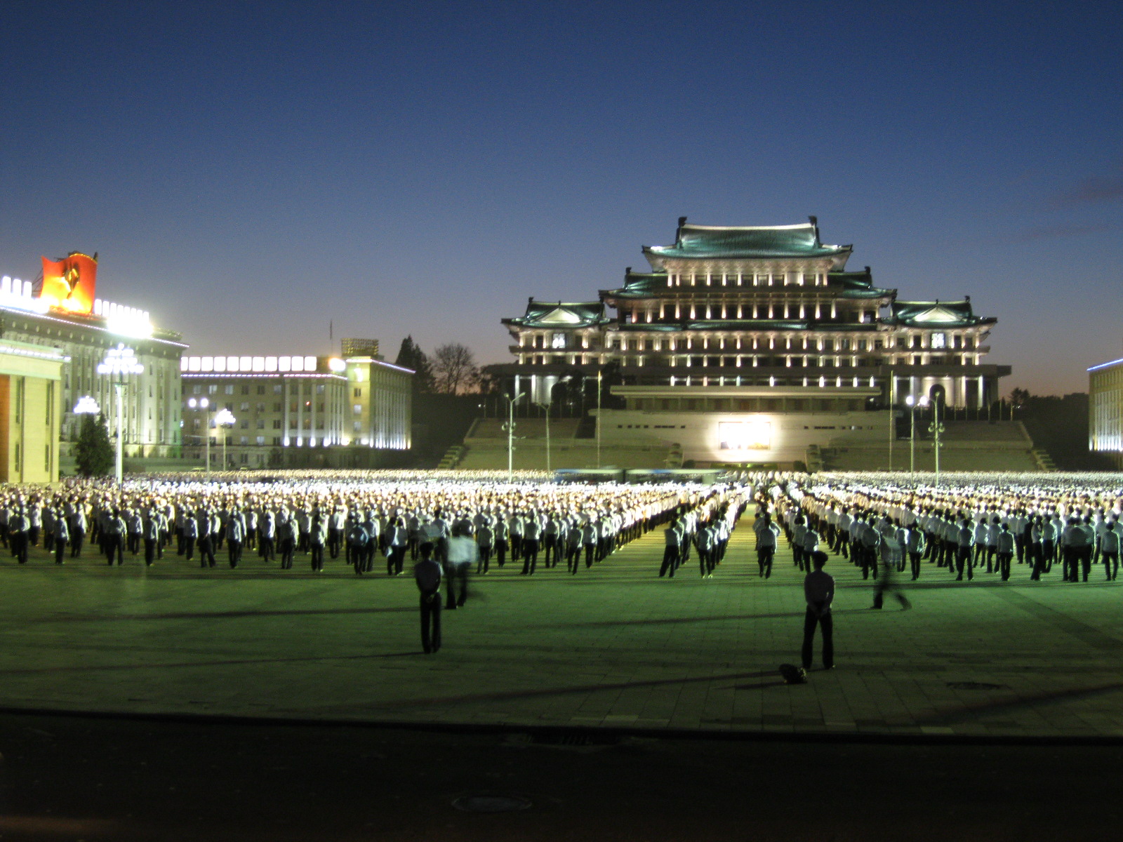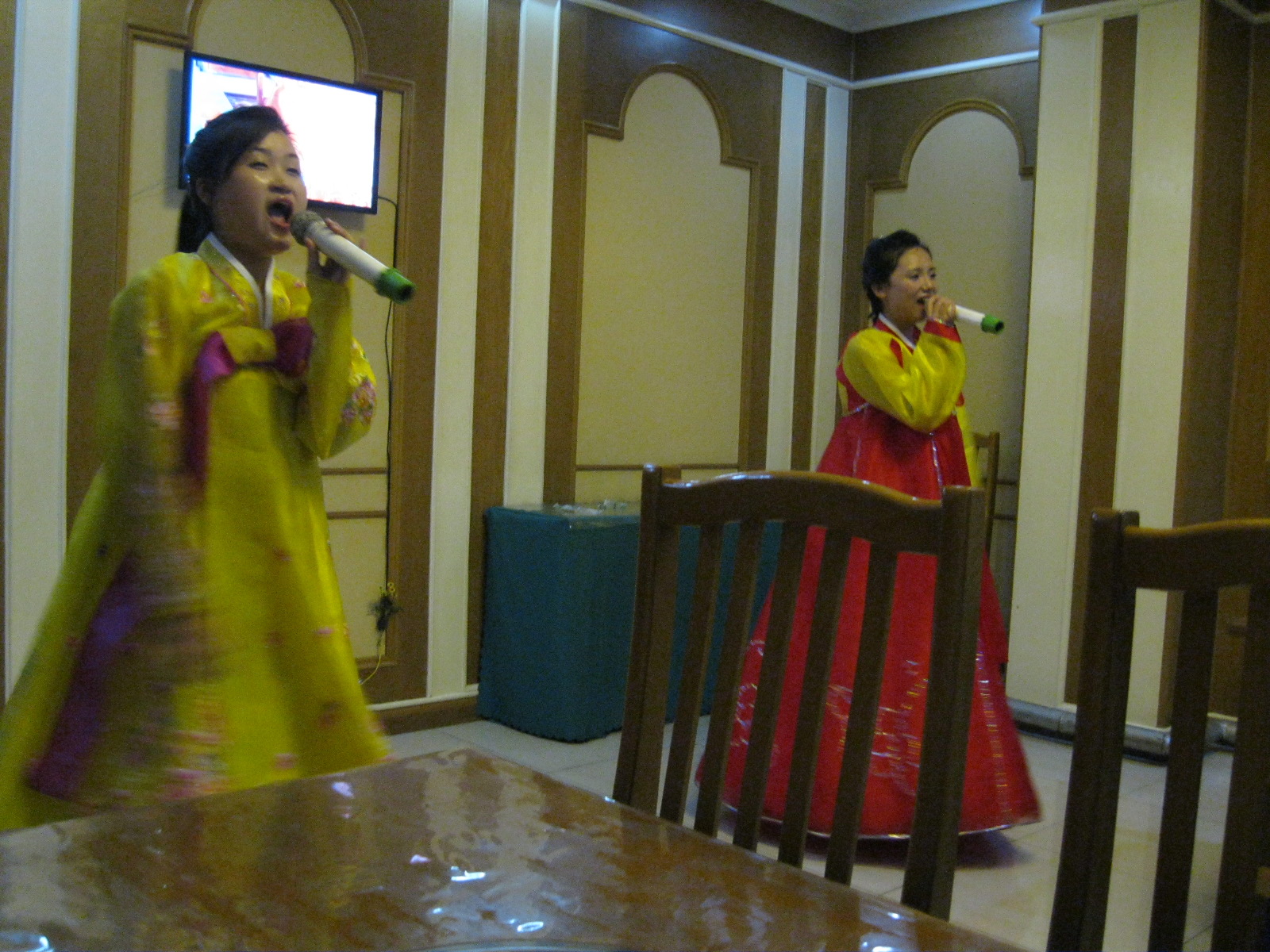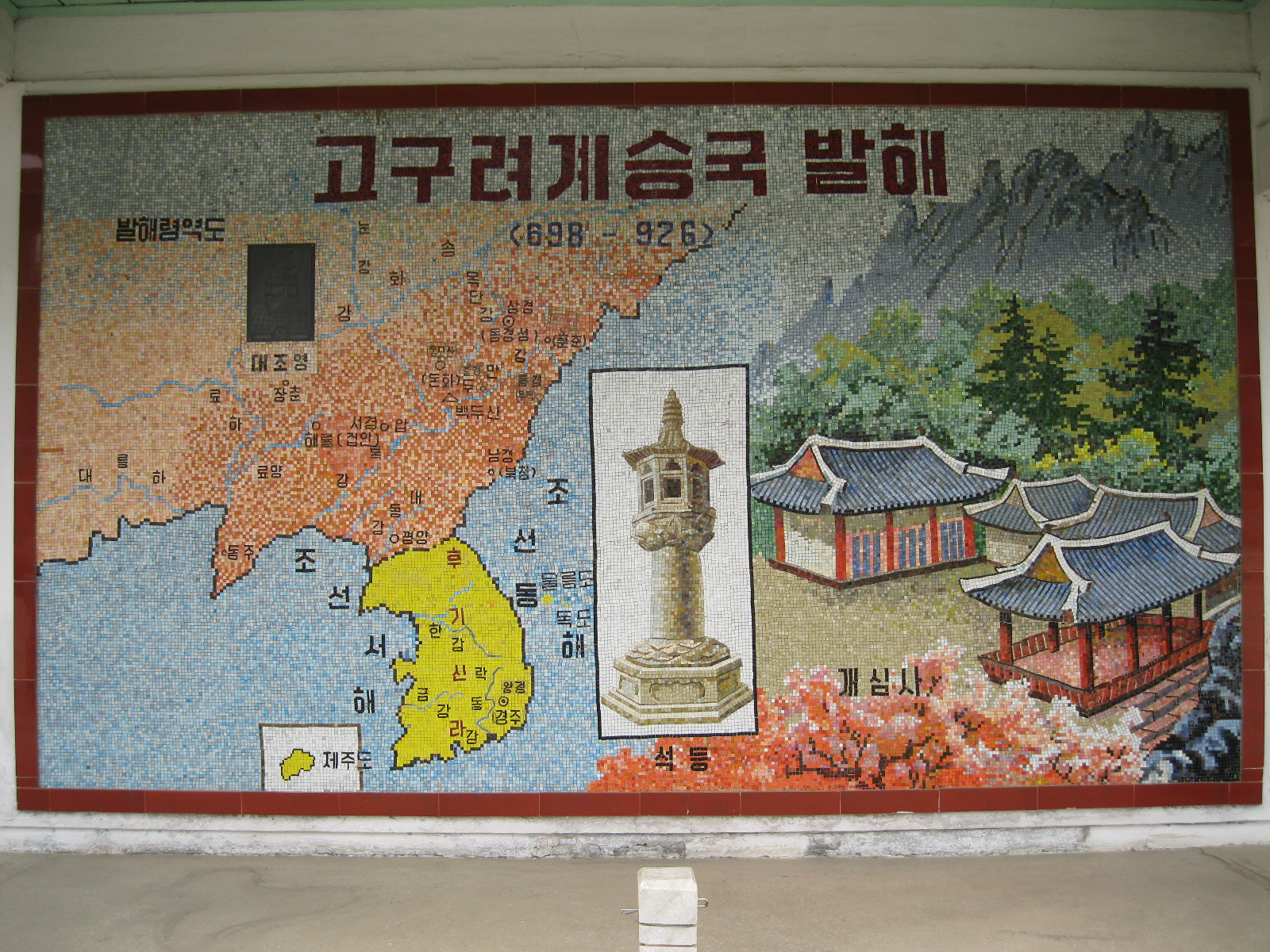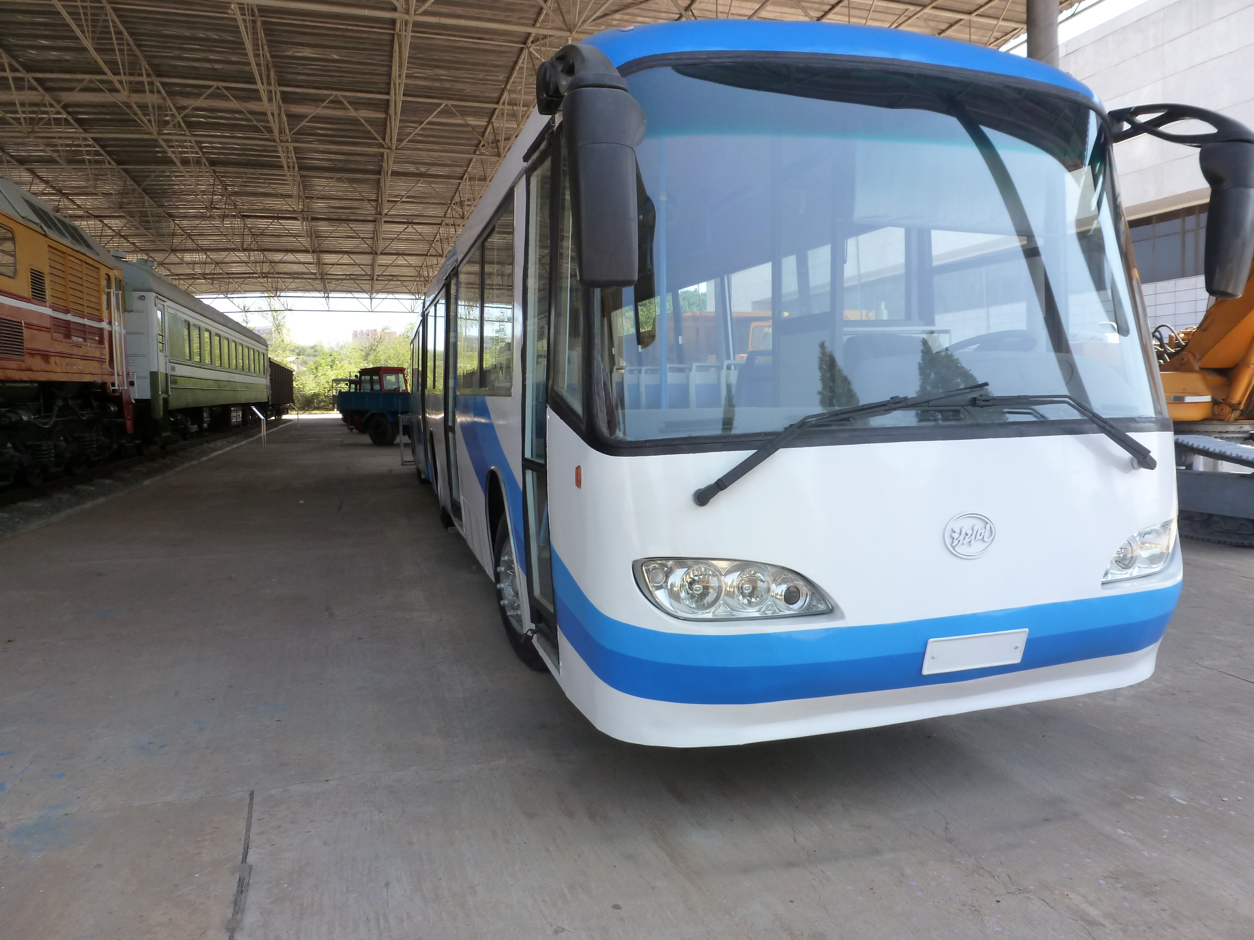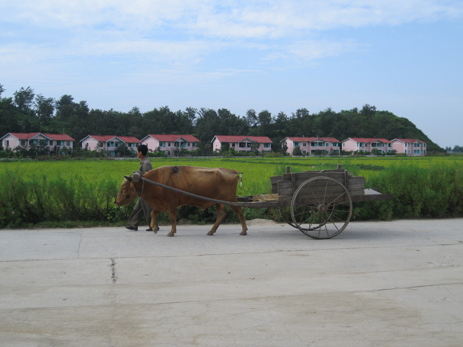 In Peking hebben we enkele uren tijd om ons voor te bereiden op de treinreis richting Noord-Korea. De trein vertrok rond 6u 's avonds. De volgende ochtend komen we aan in Dandong, een Chinese stad die grenst aan Noord-Korea.Het station van PekingDe slaapcabineHet restaurant op de trein. Een deel van het treinpersoneel was er al aan het eten. Ik besloot dan ook maar iets te eten. "Can I have a knife and fork?". "No sowwy". En de chinezen maar lachen.Op dag 3 arriveren we in Dandong, waar we een ontbijt krijgen. De rest van de treinreis wordt verdergezet op een andere trein richting de Noord-Koreaanse hoofdstad Pyongyang.Aankomst in DandongDandongIn de trein over de China-Noord-Korea Vriendschapsbrug. De Yalu rivier die we oversteken maakt een groot deel uit van de grens tussen China en Noord-Korea.Parallel loopt nog een brug, maar deze werd grotendeels vernield tijdens de Koreaanse oorlog.Links: Noord-Korea Rechts: ChinaAl snel verschijnen de portretten van de (overleden) grote leiders Kim Il Sung (links) en Kim Jong Il (rechts). Die zien we overal in Noord-Korea.Langs het platteland zien we vooral rijstvelden.Openbare werkenOnze Nederlandse reisbegeleider Jan is zeer fier op zijn Noord-Koreaanse badge. Deze badges worden door bijna alle Noord-Koreanen gedragen. Als buitenlander kan je deze badge enkel uitgereikt krijgen als je je loyaliteit bewezen hebt.In onze wagon zitten ook enkele Chinese toeristen. De meeste toeristen in Noord-Korea zijn Chinezen.Bij een tussenstop worden we gecontroleerd door Noord-Koreaanse militairen. Alle fototoestellen en telefoons worden geregistreerd, boeken en magazines worden nagekeken. Bagages worden slechts steekproefsgewijs doorgelicht. Onze paspoorten worden ook in beslag genomen. Die krijgen we pas terug op het einde van de reis.De rijstvelden zijn meestal in rechthoekige stukken ingedeeld, met bonenplanten om ze te scheiden.Tegen de avond rijden we Pyongyang binnen. Het volledige treintraject van Peking tot Pyongyang is 1371km lang en deden we ongeveer 24u over.Op dag 4 rijden we met de bus naar de industriestad Hamhung (함흥시). Hier bezoeken we oa. een fabriek van kunstmeststof.Het Yanggakdo International Hotel in Pyongyang waar we deze eerste nacht verbleven. Later keren we hier nog terug.Een tussenstop aan een meer langs het bergachtige landschap.Simon en ikDe bus waar we heel de reis mee rondtrokkenEen fotostop langs het bergachtige landschapDe gidsen vermelden dat zowat driekwart van het land bergen zijn. Omdat de Noord-Koreanen er naar streven om volledig zelfvoorzienend te zijn, wordt bijna alle vlakke grond gebruikt voor landbouw.Aan de linkerkant zie je onze Koreaanse gidsen. Meestal spreken Koreanen elkaar aan met hun volledige naam, maar gemakkelijkheidshalve mochten wij ze aanspreken als miss Kim (links) en miss Ha (rechts).Even dalen we af om een waterval te bezoeken. We picknicken hier in de buurt.De waterval zou in 2001 ontdekt zijn door Kim Jong Il, dankzij zijn fantastisch gehoor.BronwaterDit was een van de weinige maaltijden die ik volledig op kreeg. Op de bus krijgen we dan te horen dat de lunchschotels achtergelaten werden voor kinderen die de overschot zouden eten...De meeste wegen bestaan uit betonplaten.Een propagandabord langs de wegWe komen aan in Hamhung, de tweede grootste stad van Noord-Korea (~ 800.000 inwoners). We rijden hier voorbij een van de talrijke mozaïeken die we te zien zullen krijgen. Links: Kim Il Sung Midden: Kim Jong Il Rechts: Kim Jong Suk (de eerste vrouw van Kim Il Sung)Hamhung is nog maar enkele jaren "open" voor toeristen.Een fabriek van kunstmeststofBij elke bezienswaardigheid krijgen we te horen hoe vaak en wanneer juist de grote leiders die plaats bezocht hebben. Vaak zijn er mozaïeken die hun bezoek afbeelden.Binnen in de fabriekEr zijn maar weinig fabriekswerkers aanwezig, maar ze poseren wel graag voor een foto.'s avonds verblijven we in het Majon Tourist Resort aan de Oost-Koreaanse zee. Hier nemen we een frisse duik in het water.De huisjes waar we verblijven zijn vlak aan het strand.Onze zwembroeken buiten gehangen, maar echt droog werden ze niet door het vochtige klimaat.Het avondmaal. Zoals gewoonlijk werden er nog voortdurend bordjes bij gezet. Als je al vol zit krijg je dan nog een kom rijst en soep.'s middags en 's avonds was er als drank meestal plat water en bier, met de mogelijkheid om "juice" te drinken in plaats van bier. Dat was een soort appel/peren sap (niet op de foto).Onze kamerHier was geen stromend water, en diende het bad als waterreservoir. Wassen moest "op z'n Bangladesh" door een teiltje water over je gieten. In de rode emmer kon water elektrisch verwarmd worden.Op dag 5 bezoeken we nog enkele plaatsen in Hamhung, en vertrekken dan richting Mt. Kumgang. Onderweg bezoeken we oa. nog de kuststad Wonsan.Het huis van de voormalige koning Taejo van Joseon in Hamhung. Hij richtte de Koreaanse Joseondynastie op in 1392, die eindigde in 1897.Een zeer oude boomBuiten het huis stond een groep Koreaanse studenten te wachten.Een aangelegde (niet natuurlijke) heuvel met grote bronzen beelden van de leidersDe lokale gids die ons een woordje uitleg gaf. De plaatselijke gidsen spraken meestal Koreaans, dat dan naar Engels vertaald werd door onze gids miss Kim.Hamhung Grand TheatreWonsanDit verkeersbord leek met de hand geschilderd te zijn.Bezoek aan een de Chonsam coöperatieve boerderijEen persimmon boomOok de grote leiders zijn hier geweest.In het winkeltje van de boerderij kochten we enkele gedroogde persimmons.Naast de boerderij was er een kleuterschool. De kinderen zongen een liedje en wuifden ons dan uit.Iets verderop bezoeken we nog het huis van de boerin die ons begeleidde.Dit huis heeft een soort vloerverwarming die hier vaak toegepast zou worden. Op internet vond ik dit systeem terug als "Ondol".Wat voor een decoder is dat onder de TV? Telenet of Belgacom?Ten slotte bezochten we nog een boeddhistische tempel...Maar bij de tempel zelf mochten we niet komen, omdat er constructi