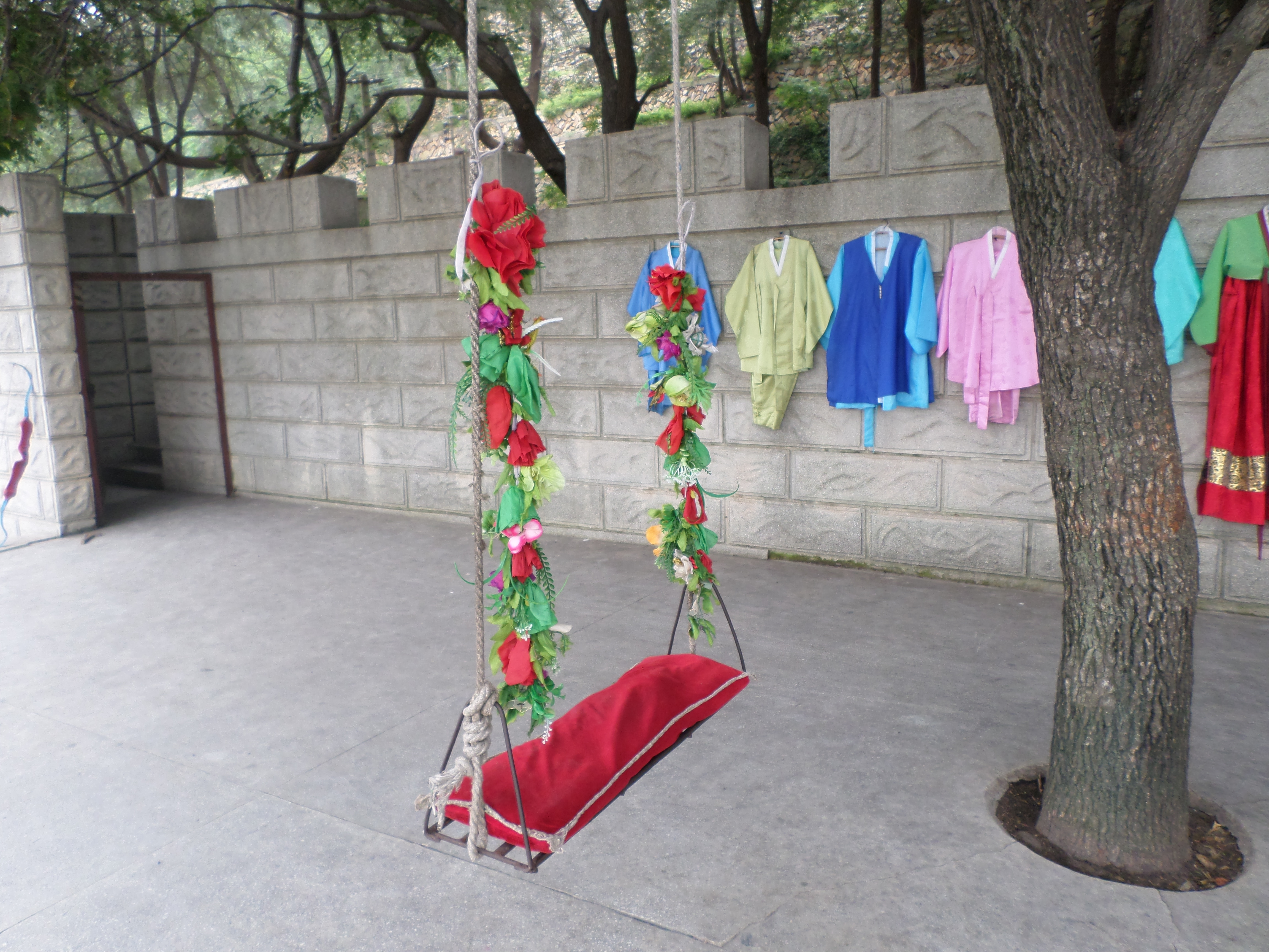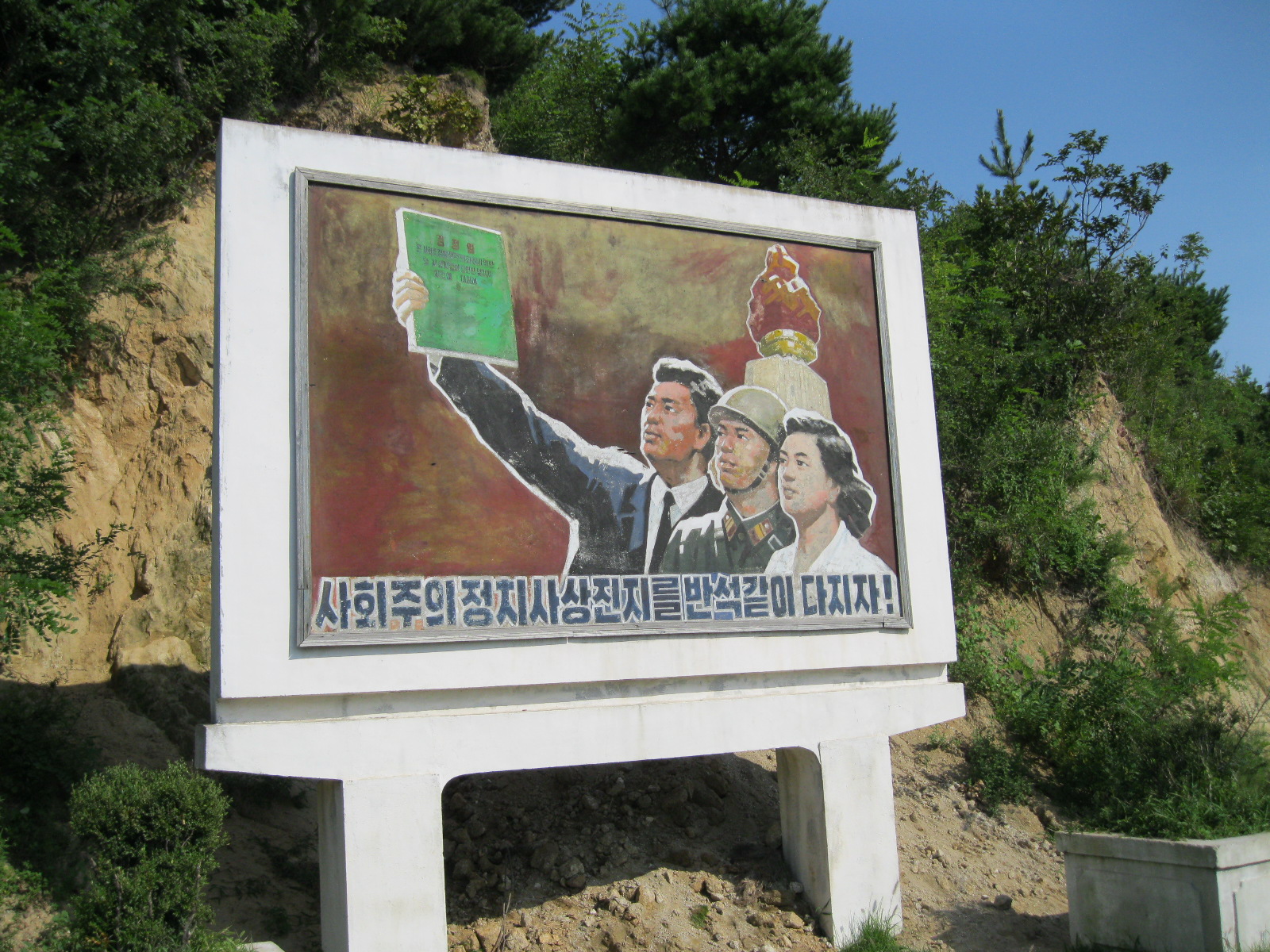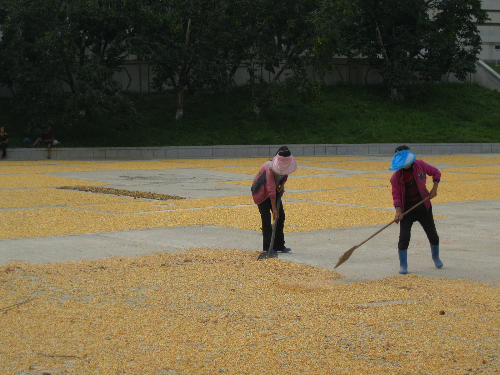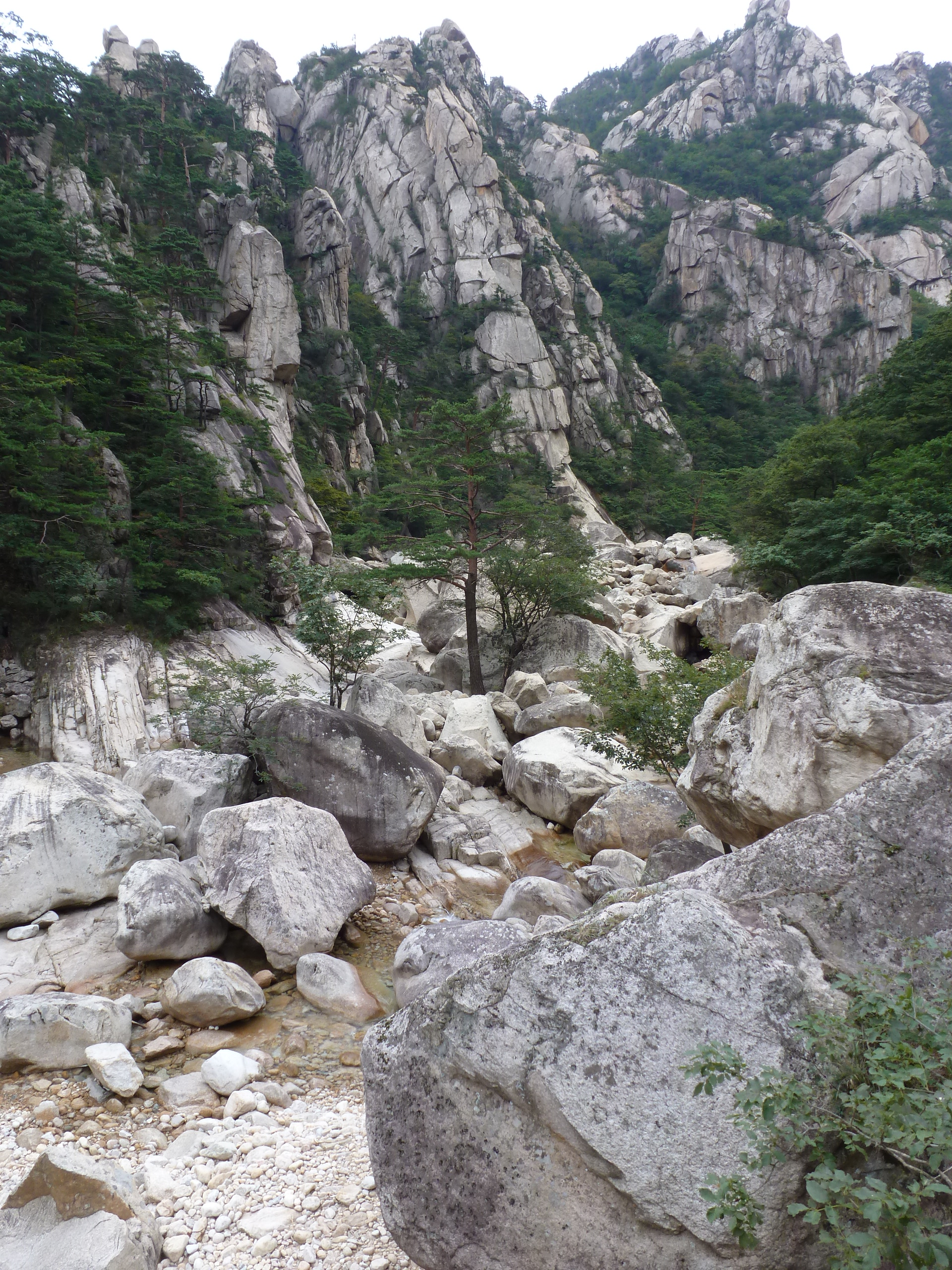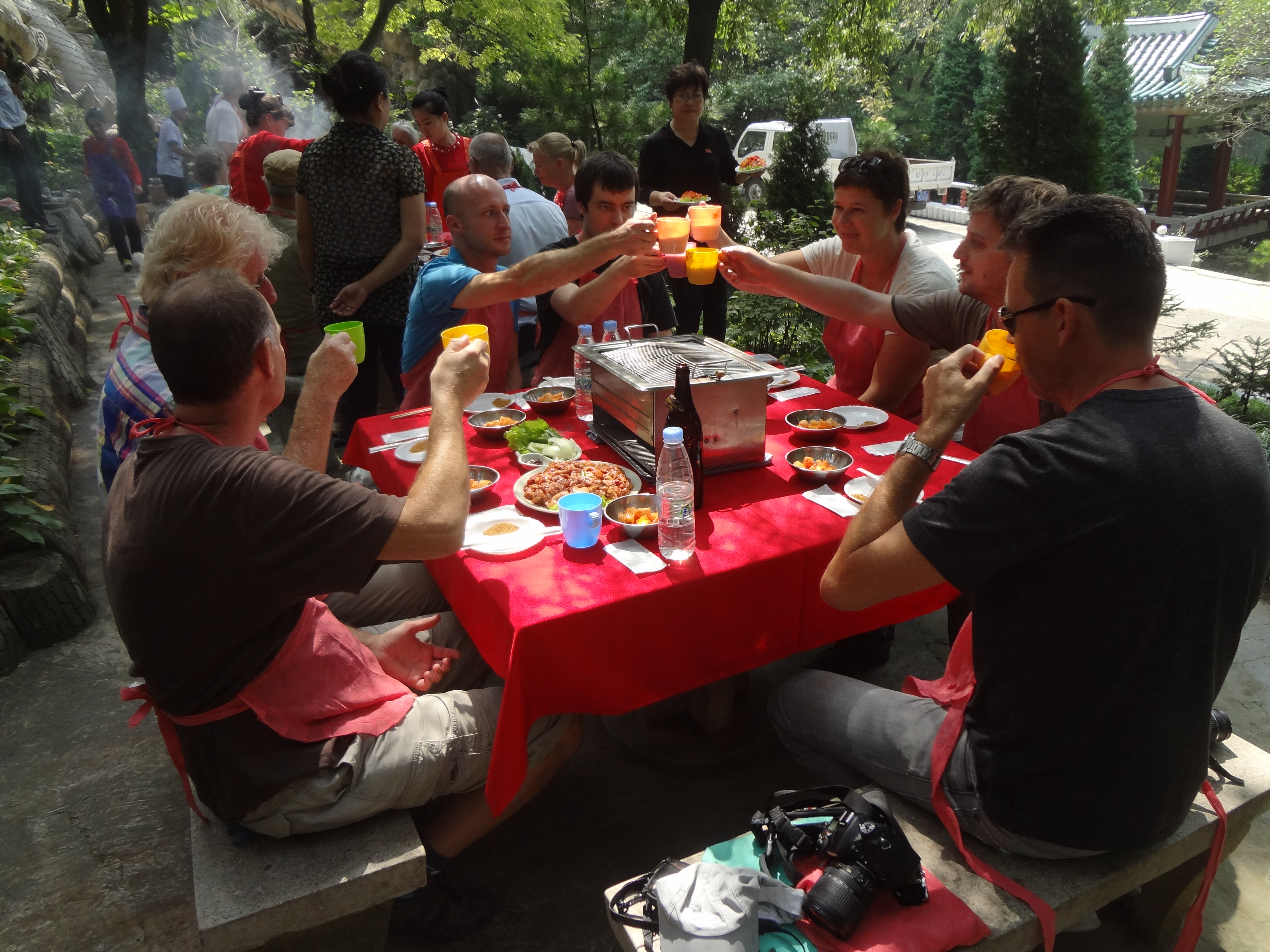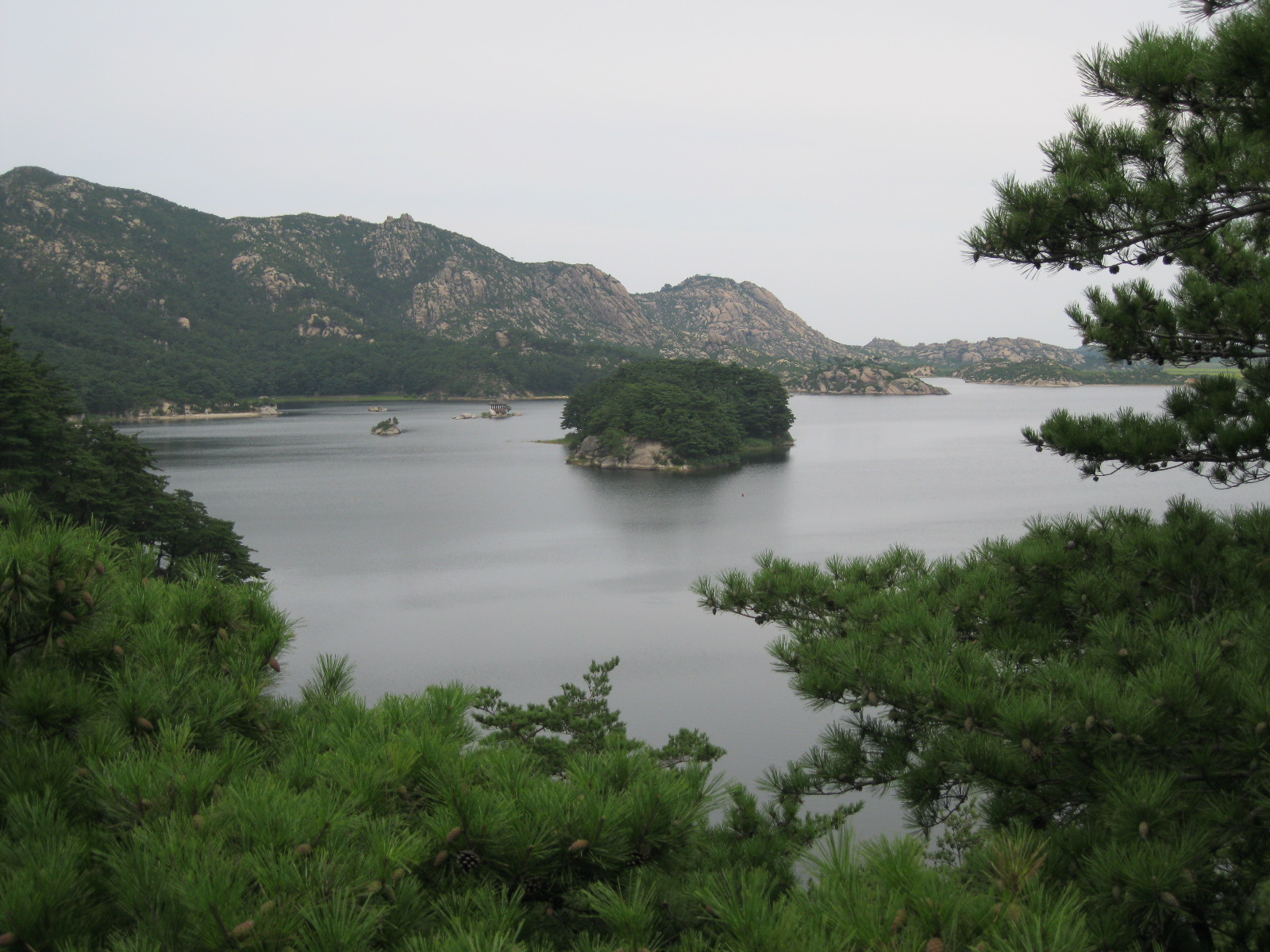 In Peking hebben we enkele uren tijd om ons voor te bereiden op de treinreis richting Noord-Korea. De trein vertrok rond 6u 's avonds. De volgende ochtend komen we aan in Dandong, een Chinese stad die grenst aan Noord-Korea.Het station van PekingDe slaapcabineHet restaurant op de trein. Een deel van het treinpersoneel was er al aan het eten. Ik besloot dan ook maar iets te eten. "Can I have a knife and fork?". "No sowwy". En de chinezen maar lachen.Op dag 3 arriveren we in Dandong, waar we een ontbijt krijgen. De rest van de treinreis wordt verdergezet op een andere trein richting de Noord-Koreaanse hoofdstad Pyongyang.Aankomst in DandongDandongIn de trein over de China-Noord-Korea Vriendschapsbrug. De Yalu rivier die we oversteken maakt een groot deel uit van de grens tussen China en Noord-Korea.Parallel loopt nog een brug, maar deze werd grotendeels vernield tijdens de Koreaanse oorlog.Links: Noord-Korea Rechts: ChinaAl snel verschijnen de portretten van de (overleden) grote leiders Kim Il Sung (links) en Kim Jong Il (rechts). Die zien we overal in Noord-Korea.Langs het platteland zien we vooral rijstvelden.Openbare werkenOnze Nederlandse reisbegeleider Jan is zeer fier op zijn Noord-Koreaanse badge. Deze badges worden door bijna alle Noord-Koreanen gedragen. Als buitenlander kan je deze badge enkel uitgereikt krijgen als je je loyaliteit bewezen hebt.In onze wagon zitten ook enkele Chinese toeristen. De meeste toeristen in Noord-Korea zijn Chinezen.Bij een tussenstop worden we gecontroleerd door Noord-Koreaanse militairen. Alle fototoestellen en telefoons worden geregistreerd, boeken en magazines worden nagekeken. Bagages worden slechts steekproefsgewijs doorgelicht. Onze paspoorten worden ook in beslag genomen. Die krijgen we pas terug op het einde van de reis.De rijstvelden zijn meestal in rechthoekige stukken ingedeeld, met bonenplanten om ze te scheiden.Tegen de avond rijden we Pyongyang binnen. Het volledige treintraject van Peking tot Pyongyang is 1371km lang en deden we ongeveer 24u over.Op dag 4 rijden we met de bus naar de industriestad Hamhung (함흥시). Hier bezoeken we oa. een fabriek van kunstmeststof.Het Yanggakdo International Hotel in Pyongyang waar we deze eerste nacht verbleven. Later keren we hier nog terug.Een tussenstop aan een meer langs het bergachtige landschap.Simon en ikDe bus waar we heel de reis mee rondtrokkenEen fotostop langs het bergachtige landschapDe gidsen vermelden dat zowat driekwart van het land bergen zijn. Omdat de Noord-Koreanen er naar streven om volledig zelfvoorzienend te zijn, wordt bijna alle vlakke grond gebruikt voor landbouw.Aan de linkerkant zie je onze Koreaanse gidsen. Meestal spreken Koreanen elkaar aan met hun volledige naam, maar gemakkelijkheidshalve mochten wij ze aanspreken als miss Kim (links) en miss Ha (rechts).Even dalen we af om een waterval te bezoeken. We picknicken hier in de buurt.De waterval zou in 2001 ontdekt zijn door Kim Jong Il, dankzij zijn fantastisch gehoor.BronwaterDit was een van de weinige maaltijden die ik volledig op kreeg. Op de bus krijgen we dan te horen dat de lunchschotels achtergelaten werden voor kinderen die de overschot zouden eten...De meeste wegen bestaan uit betonplaten.Een propagandabord langs de wegWe komen aan in Hamhung, de tweede grootste stad van Noord-Korea (~ 800.000 inwoners). We rijden hier voorbij een van de talrijke mozaïeken die we te zien zullen krijgen. Links: Kim Il Sung Midden: Kim Jong Il Rechts: Kim Jong Suk (de eerste vrouw van Kim Il Sung)Hamhung is nog maar enkele jaren "open" voor toeristen.Een fabriek van kunstmeststofBij elke bezienswaardigheid krijgen we te horen hoe vaak en wanneer juist de grote leiders die plaats bezocht hebben. Vaak zijn er mozaïeken die hun bezoek afbeelden.Binnen in de fabriekEr zijn maar weinig fabriekswerkers aanwezig, maar ze poseren wel graag voor een foto.'s avonds verblijven we in het Majon Tourist Resort aan de Oost-Koreaanse zee. Hier nemen we een frisse duik in het water.De huisjes waar we verblijven zijn vlak aan het strand.Onze zwembroeken buiten gehangen, maar echt droog werden ze niet door het vochtige klimaat.Het avondmaal. Zoals gewoonlijk werden er nog voortdurend bordjes bij gezet. Als je al vol zit krijg je dan nog een kom rijst en soep.'s middags en 's avonds was er als drank meestal plat water en bier, met de mogelijkheid om "juice" te drinken in plaats van bier. Dat was een soort appel/peren sap (niet op de foto).Onze kamerHier was geen stromend water, en diende het bad als waterreservoir. Wassen moest "op z'n Bangladesh" door een teiltje water over je gieten. In de rode emmer kon water elektrisch verwarmd worden.Op dag 5 bezoeken we nog enkele plaatsen in Hamhung, en vertrekken dan richting Mt. Kumgang. Onderweg bezoeken we oa. nog de kuststad Wonsan.Het huis van de voormalige koning Taejo van Joseon in Hamhung. Hij richtte de Koreaanse Joseondynastie op in 1392, die eindigde in 1897.Een zeer oude boomBuiten het huis stond een groep Koreaanse studenten te wachten.Een aangelegde (niet natuurlijke) heuvel met grote bronzen beelden van de leidersDe lokale gids die ons een woordje uitleg gaf. De plaatselijke gidsen spraken meestal Koreaans, dat dan naar Engels vertaald werd door onze gids miss Kim.Hamhung Grand TheatreWonsanDit verkeersbord leek met de hand geschilderd te zijn.Bezoek aan een de Chonsam coöperatieve boerderijEen persimmon boomOok de grote leiders zijn hier geweest.In het winkeltje van de boerderij kochten we enkele gedroogde persimmons.Naast de boerderij was er een kleuterschool. De kinderen zongen een liedje en wuifden ons dan uit.Iets verderop bezoeken we nog het huis van de boerin die ons begeleidde.Dit huis heeft een soort vloerverwarming die hier vaak toegepast zou worden. Op internet vond ik dit systeem terug als "Ondol".Wat voor een decoder is dat onder de TV? Telenet of Belgacom?Ten slotte bezochten we nog een boeddhistische tempel...Maar bij de tempel zelf mochten we niet komen, omdat er constructi