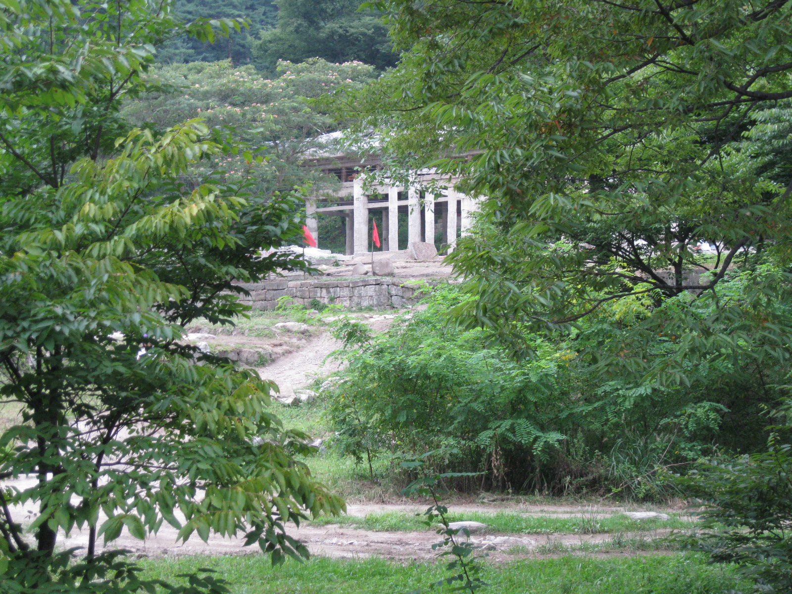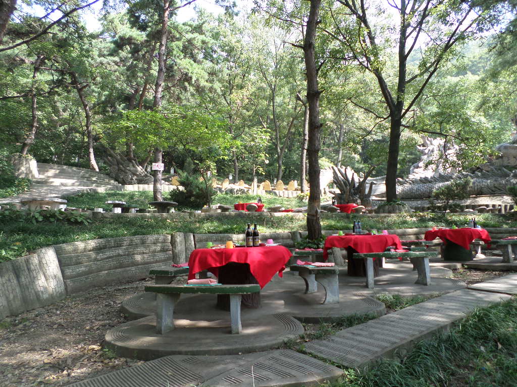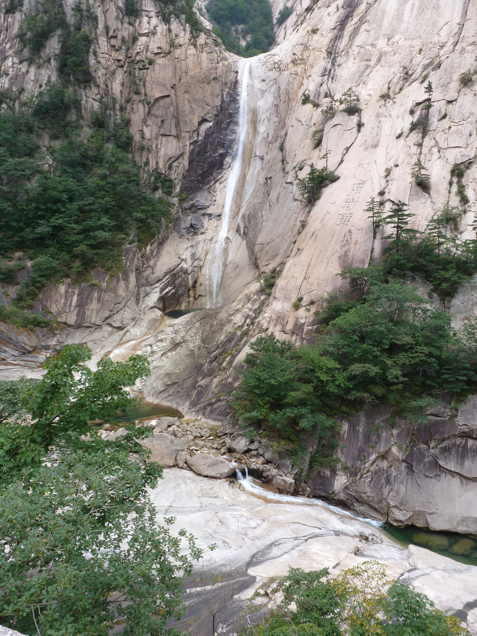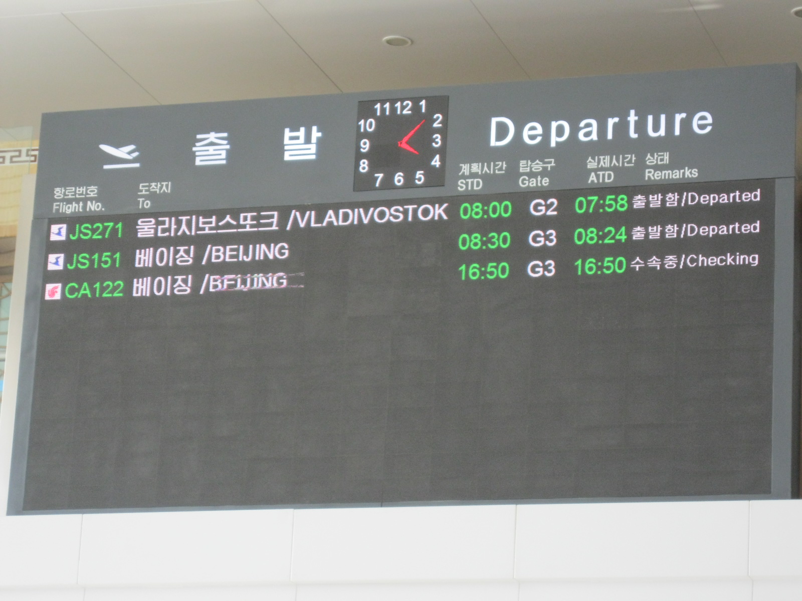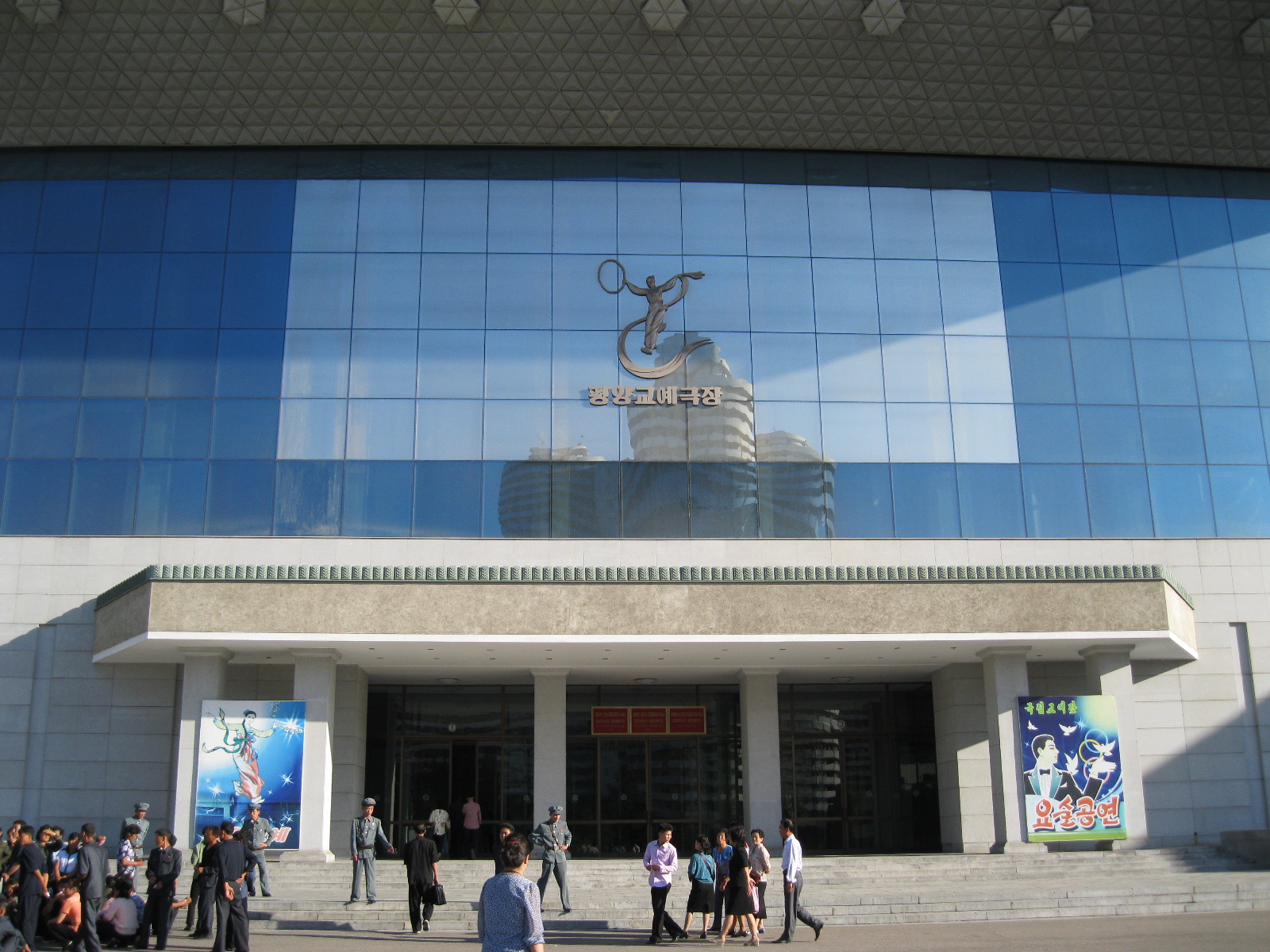 In Peking hebben we enkele uren tijd om ons voor te bereiden op de treinreis richting Noord-Korea. De trein vertrok rond 6u 's avonds. De volgende ochtend komen we aan in Dandong, een Chinese stad die grenst aan Noord-Korea.Het station van PekingDe slaapcabineHet restaurant op de trein. Een deel van het treinpersoneel was er al aan het eten. Ik besloot dan ook maar iets te eten. "Can I have a knife and fork?". "No sowwy". En de chinezen maar lachen.Op dag 3 arriveren we in Dandong, waar we een ontbijt krijgen. De rest van de treinreis wordt verdergezet op een andere trein richting de Noord-Koreaanse hoofdstad Pyongyang.Aankomst in DandongDandongIn de trein over de China-Noord-Korea Vriendschapsbrug. De Yalu rivier die we oversteken maakt een groot deel uit van de grens tussen China en Noord-Korea.Parallel loopt nog een brug, maar deze werd grotendeels vernield tijdens de Koreaanse oorlog.Links: Noord-Korea Rechts: ChinaAl snel verschijnen de portretten van de (overleden) grote leiders Kim Il Sung (links) en Kim Jong Il (rechts). Die zien we overal in Noord-Korea.Langs het platteland zien we vooral rijstvelden.Openbare werkenOnze Nederlandse reisbegeleider Jan is zeer fier op zijn Noord-Koreaanse badge. Deze badges worden door bijna alle Noord-Koreanen gedragen. Als buitenlander kan je deze badge enkel uitgereikt krijgen als je je loyaliteit bewezen hebt.In onze wagon zitten ook enkele Chinese toeristen. De meeste toeristen in Noord-Korea zijn Chinezen.Bij een tussenstop worden we gecontroleerd door Noord-Koreaanse militairen. Alle fototoestellen en telefoons worden geregistreerd, boeken en magazines worden nagekeken. Bagages worden slechts steekproefsgewijs doorgelicht. Onze paspoorten worden ook in beslag genomen. Die krijgen we pas terug op het einde van de reis.De rijstvelden zijn meestal in rechthoekige stukken ingedeeld, met bonenplanten om ze te scheiden.Tegen de avond rijden we Pyongyang binnen. Het volledige treintraject van Peking tot Pyongyang is 1371km lang en deden we ongeveer 24u over.Op dag 4 rijden we met de bus naar de industriestad Hamhung (함흥시). Hier bezoeken we oa. een fabriek van kunstmeststof.Het Yanggakdo International Hotel in Pyongyang waar we deze eerste nacht verbleven. Later keren we hier nog terug.Een tussenstop aan een meer langs het bergachtige landschap.Simon en ikDe bus waar we heel de reis mee rondtrokkenEen fotostop langs het bergachtige landschapDe gidsen vermelden dat zowat driekwart van het land bergen zijn. Omdat de Noord-Koreanen er naar streven om volledig zelfvoorzienend te zijn, wordt bijna alle vlakke grond gebruikt voor landbouw.Aan de linkerkant zie je onze Koreaanse gidsen. Meestal spreken Koreanen elkaar aan met hun volledige naam, maar gemakkelijkheidshalve mochten wij ze aanspreken als miss Kim (links) en miss Ha (rechts).Even dalen we af om een waterval te bezoeken. We picknicken hier in de buurt.De waterval zou in 2001 ontdekt zijn door Kim Jong Il, dankzij zijn fantastisch gehoor.BronwaterDit was een van de weinige maaltijden die ik volledig op kreeg. Op de bus krijgen we dan te horen dat de lunchschotels achtergelaten werden voor kinderen die de overschot zouden eten...De meeste wegen bestaan uit betonplaten.Een propagandabord langs de wegWe komen aan in Hamhung, de tweede grootste stad van Noord-Korea (~ 800.000 inwoners). We rijden hier voorbij een van de talrijke mozaïeken die we te zien zullen krijgen. Links: Kim Il Sung Midden: Kim Jong Il Rechts: Kim Jong Suk (de eerste vrouw van Kim Il Sung)Hamhung is nog maar enkele jaren "open" voor toeristen.Een fabriek van kunstmeststofBij elke bezienswaardigheid krijgen we te horen hoe vaak en wanneer juist de grote leiders die plaats bezocht hebben. Vaak zijn er mozaïeken die hun bezoek afbeelden.Binnen in de fabriekEr zijn maar weinig fabriekswerkers aanwezig, maar ze poseren wel graag voor een foto.'s avonds verblijven we in het Majon Tourist Resort aan de Oost-Koreaanse zee. Hier nemen we een frisse duik in het water.De huisjes waar we verblijven zijn vlak aan het strand.Onze zwembroeken buiten gehangen, maar echt droog werden ze niet door het vochtige klimaat.Het avondmaal. Zoals gewoonlijk werden er nog voortdurend bordjes bij gezet. Als je al vol zit krijg je dan nog een kom rijst en soep.'s middags en 's avonds was er als drank meestal plat water en bier, met de mogelijkheid om "juice" te drinken in plaats van bier. Dat was een soort appel/peren sap (niet op de foto).Onze kamerHier was geen stromend water, en diende het bad als waterreservoir. Wassen moest "op z'n Bangladesh" door een teiltje water over je gieten. In de rode emmer kon water elektrisch verwarmd worden.Op dag 5 bezoeken we nog enkele plaatsen in Hamhung, en vertrekken dan richting Mt. Kumgang. Onderweg bezoeken we oa. nog de kuststad Wonsan.Het huis van de voormalige koning Taejo van Joseon in Hamhung. Hij richtte de Koreaanse Joseondynastie op in 1392, die eindigde in 1897.Een zeer oude boomBuiten het huis stond een groep Koreaanse studenten te wachten.Een aangelegde (niet natuurlijke) heuvel met grote bronzen beelden van de leidersDe lokale gids die ons een woordje uitleg gaf. De plaatselijke gidsen spraken meestal Koreaans, dat dan naar Engels vertaald werd door onze gids miss Kim.Hamhung Grand TheatreWonsanDit verkeersbord leek met de hand geschilderd te zijn.Bezoek aan een de Chonsam coöperatieve boerderijEen persimmon boomOok de grote leiders zijn hier geweest.In het winkeltje van de boerderij kochten we enkele gedroogde persimmons.Naast de boerderij was er een kleuterschool. De kinderen zongen een liedje en wuifden ons dan uit.Iets verderop bezoeken we nog het huis van de boerin die ons begeleidde.Dit huis heeft een soort vloerverwarming die hier vaak toegepast zou worden. Op internet vond ik dit systeem terug als "Ondol".Wat voor een decoder is dat onder de TV? Telenet of Belgacom?Ten slotte bezochten we nog een boeddhistische tempel...Maar bij de tempel zelf mochten we niet komen, omdat er constructi
