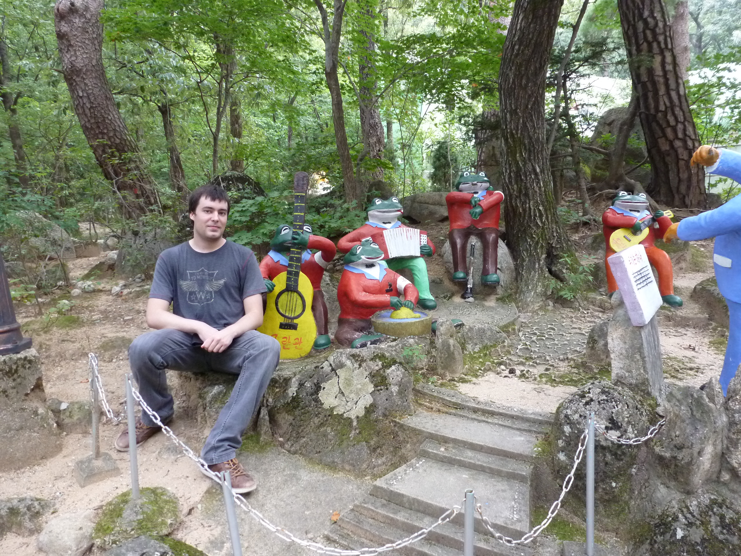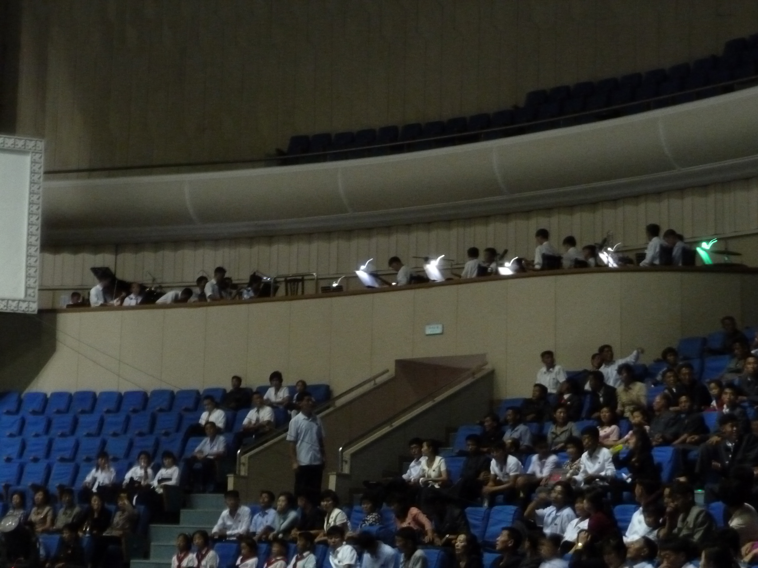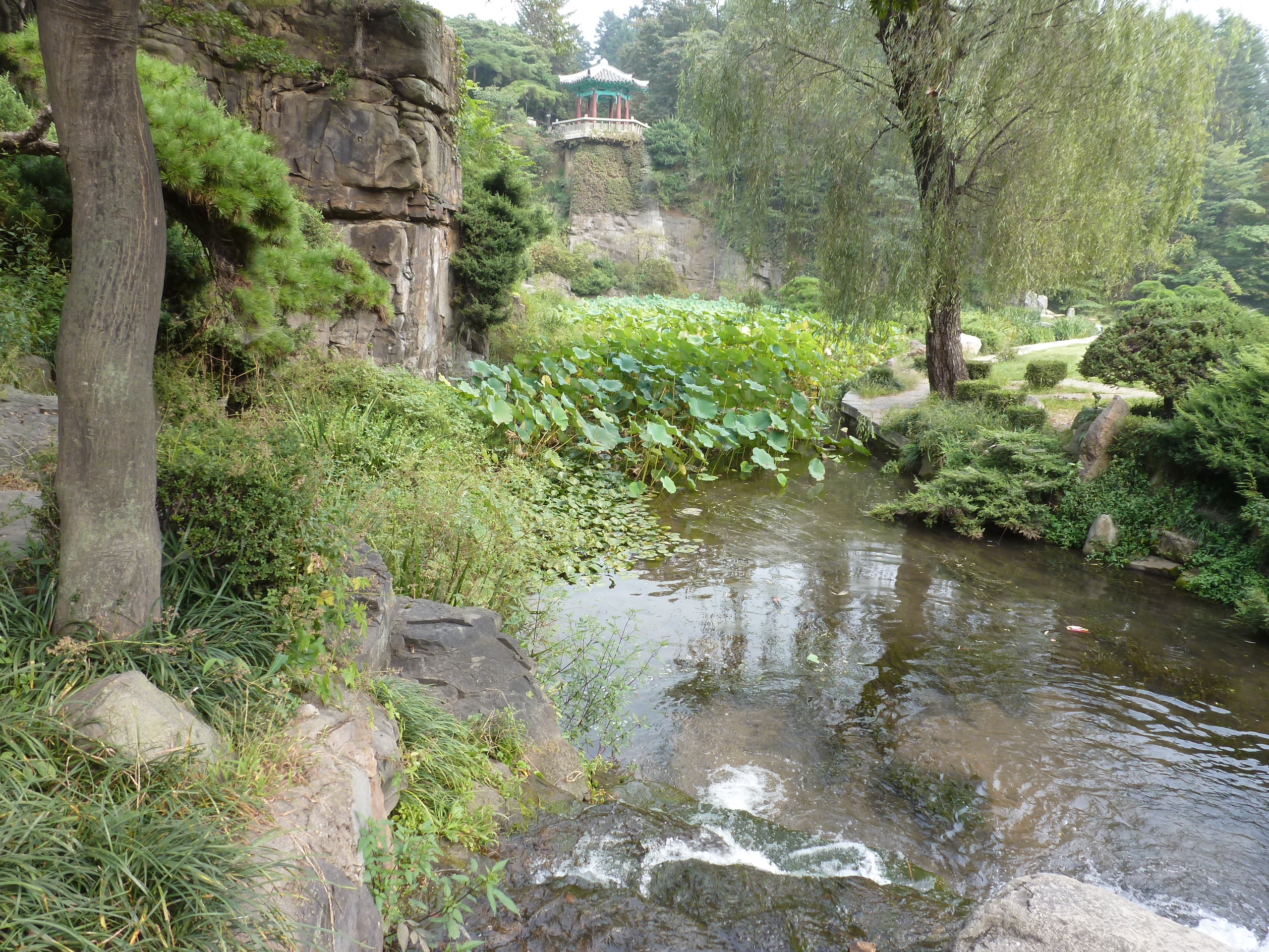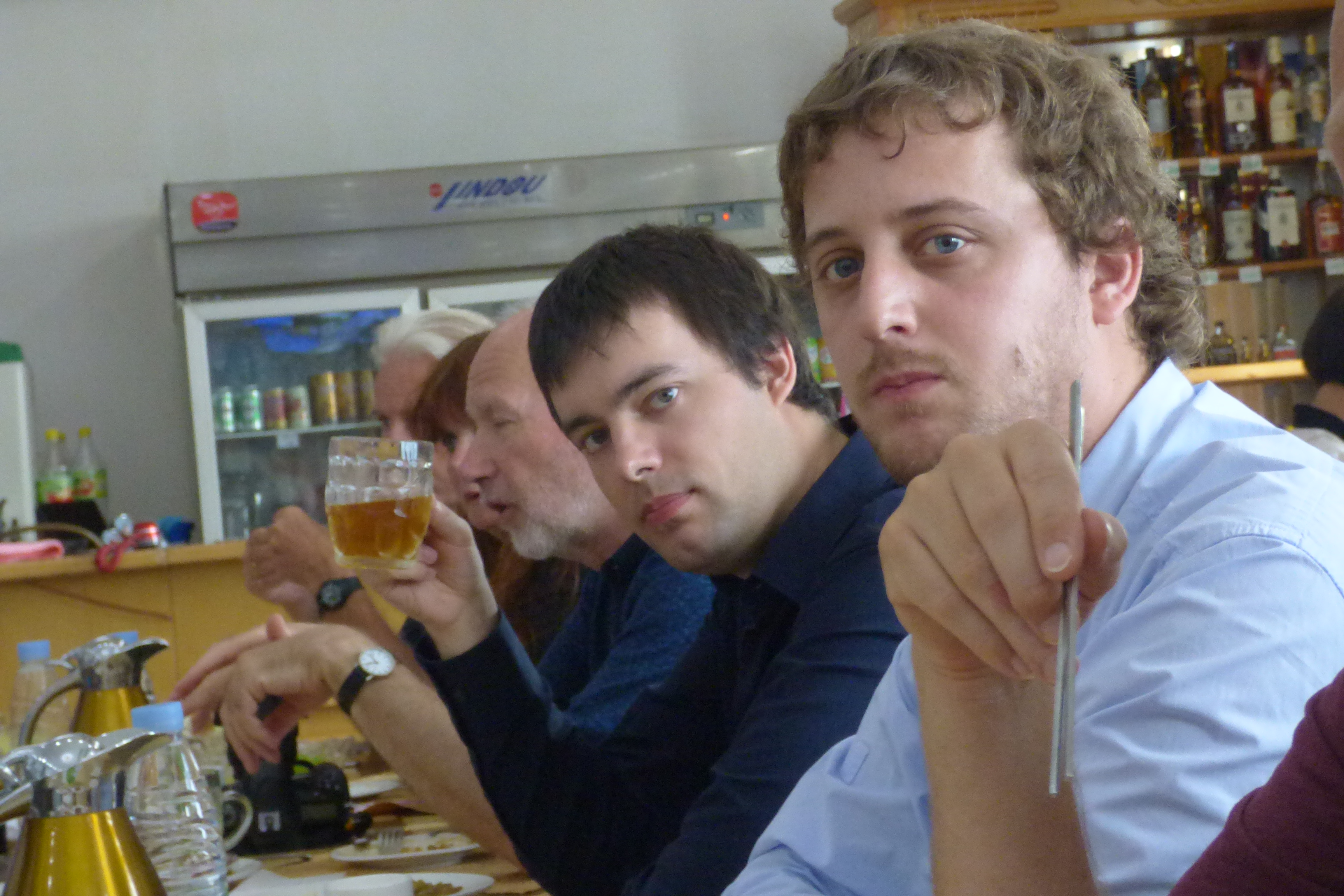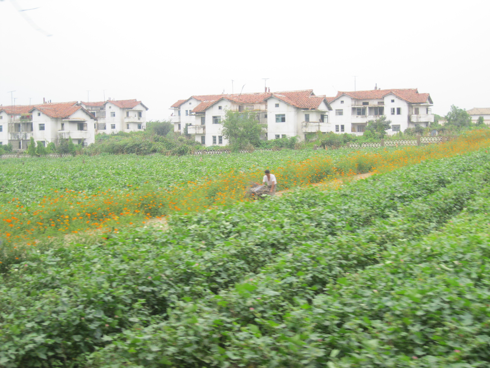 In Peking hebben we enkele uren tijd om ons voor te bereiden op de treinreis richting Noord-Korea. De trein vertrok rond 6u 's avonds. De volgende ochtend komen we aan in Dandong, een Chinese stad die grenst aan Noord-Korea.Het station van PekingDe slaapcabineHet restaurant op de trein. Een deel van het treinpersoneel was er al aan het eten. Ik besloot dan ook maar iets te eten. "Can I have a knife and fork?". "No sowwy". En de chinezen maar lachen.Op dag 3 arriveren we in Dandong, waar we een ontbijt krijgen. De rest van de treinreis wordt verdergezet op een andere trein richting de Noord-Koreaanse hoofdstad Pyongyang.Aankomst in DandongDandongIn de trein over de China-Noord-Korea Vriendschapsbrug. De Yalu rivier die we oversteken maakt een groot deel uit van de grens tussen China en Noord-Korea.Parallel loopt nog een brug, maar deze werd grotendeels vernield tijdens de Koreaanse oorlog.Links: Noord-Korea Rechts: ChinaAl snel verschijnen de portretten van de (overleden) grote leiders Kim Il Sung (links) en Kim Jong Il (rechts). Die zien we overal in Noord-Korea.Langs het platteland zien we vooral rijstvelden.Openbare werkenOnze Nederlandse reisbegeleider Jan is zeer fier op zijn Noord-Koreaanse badge. Deze badges worden door bijna alle Noord-Koreanen gedragen. Als buitenlander kan je deze badge enkel uitgereikt krijgen als je je loyaliteit bewezen hebt.In onze wagon zitten ook enkele Chinese toeristen. De meeste toeristen in Noord-Korea zijn Chinezen.Bij een tussenstop worden we gecontroleerd door Noord-Koreaanse militairen. Alle fototoestellen en telefoons worden geregistreerd, boeken en magazines worden nagekeken. Bagages worden slechts steekproefsgewijs doorgelicht. Onze paspoorten worden ook in beslag genomen. Die krijgen we pas terug op het einde van de reis.De rijstvelden zijn meestal in rechthoekige stukken ingedeeld, met bonenplanten om ze te scheiden.Tegen de avond rijden we Pyongyang binnen. Het volledige treintraject van Peking tot Pyongyang is 1371km lang en deden we ongeveer 24u over.Op dag 4 rijden we met de bus naar de industriestad Hamhung (함흥시). Hier bezoeken we oa. een fabriek van kunstmeststof.Het Yanggakdo International Hotel in Pyongyang waar we deze eerste nacht verbleven. Later keren we hier nog terug.Een tussenstop aan een meer langs het bergachtige landschap.Simon en ikDe bus waar we heel de reis mee rondtrokkenEen fotostop langs het bergachtige landschapDe gidsen vermelden dat zowat driekwart van het land bergen zijn. Omdat de Noord-Koreanen er naar streven om volledig zelfvoorzienend te zijn, wordt bijna alle vlakke grond gebruikt voor landbouw.Aan de linkerkant zie je onze Koreaanse gidsen. Meestal spreken Koreanen elkaar aan met hun volledige naam, maar gemakkelijkheidshalve mochten wij ze aanspreken als miss Kim (links) en miss Ha (rechts).Even dalen we af om een waterval te bezoeken. We picknicken hier in de buurt.De waterval zou in 2001 ontdekt zijn door Kim Jong Il, dankzij zijn fantastisch gehoor.BronwaterDit was een van de weinige maaltijden die ik volledig op kreeg. Op de bus krijgen we dan te horen dat de lunchschotels achtergelaten werden voor kinderen die de overschot zouden eten...De meeste wegen bestaan uit betonplaten.Een propagandabord langs de wegWe komen aan in Hamhung, de tweede grootste stad van Noord-Korea (~ 800.000 inwoners). We rijden hier voorbij een van de talrijke mozaïeken die we te zien zullen krijgen. Links: Kim Il Sung Midden: Kim Jong Il Rechts: Kim Jong Suk (de eerste vrouw van Kim Il Sung)Hamhung is nog maar enkele jaren "open" voor toeristen.Een fabriek van kunstmeststofBij elke bezienswaardigheid krijgen we te horen hoe vaak en wanneer juist de grote leiders die plaats bezocht hebben. Vaak zijn er mozaïeken die hun bezoek afbeelden.Binnen in de fabriekEr zijn maar weinig fabriekswerkers aanwezig, maar ze poseren wel graag voor een foto.'s avonds verblijven we in het Majon Tourist Resort aan de Oost-Koreaanse zee. Hier nemen we een frisse duik in het water.De huisjes waar we verblijven zijn vlak aan het strand.Onze zwembroeken buiten gehangen, maar echt droog werden ze niet door het vochtige klimaat.Het avondmaal. Zoals gewoonlijk werden er nog voortdurend bordjes bij gezet. Als je al vol zit krijg je dan nog een kom rijst en soep.'s middags en 's avonds was er als drank meestal plat water en bier, met de mogelijkheid om "juice" te drinken in plaats van bier. Dat was een soort appel/peren sap (niet op de foto).Onze kamerHier was geen stromend water, en diende het bad als waterreservoir. Wassen moest "op z'n Bangladesh" door een teiltje water over je gieten. In de rode emmer kon water elektrisch verwarmd worden.Op dag 5 bezoeken we nog enkele plaatsen in Hamhung, en vertrekken dan richting Mt. Kumgang. Onderweg bezoeken we oa. nog de kuststad Wonsan.Het huis van de voormalige koning Taejo van Joseon in Hamhung. Hij richtte de Koreaanse Joseondynastie op in 1392, die eindigde in 1897.Een zeer oude boomBuiten het huis stond een groep Koreaanse studenten te wachten.Een aangelegde (niet natuurlijke) heuvel met grote bronzen beelden van de leidersDe lokale gids die ons een woordje uitleg gaf. De plaatselijke gidsen spraken meestal Koreaans, dat dan naar Engels vertaald werd door onze gids miss Kim.Hamhung Grand TheatreWonsanDit verkeersbord leek met de hand geschilderd te zijn.Bezoek aan een de Chonsam coöperatieve boerderijEen persimmon boomOok de grote leiders zijn hier geweest.In het winkeltje van de boerderij kochten we enkele gedroogde persimmons.Naast de boerderij was er een kleuterschool. De kinderen zongen een liedje en wuifden ons dan uit.Iets verderop bezoeken we nog het huis van de boerin die ons begeleidde.Dit huis heeft een soort vloerverwarming die hier vaak toegepast zou worden. Op internet vond ik dit systeem terug als "Ondol".Wat voor een decoder is dat onder de TV? Telenet of Belgacom?Ten slotte bezochten we nog een boeddhistische tempel...Maar bij de tempel zelf mochten we niet komen, omdat er constructi