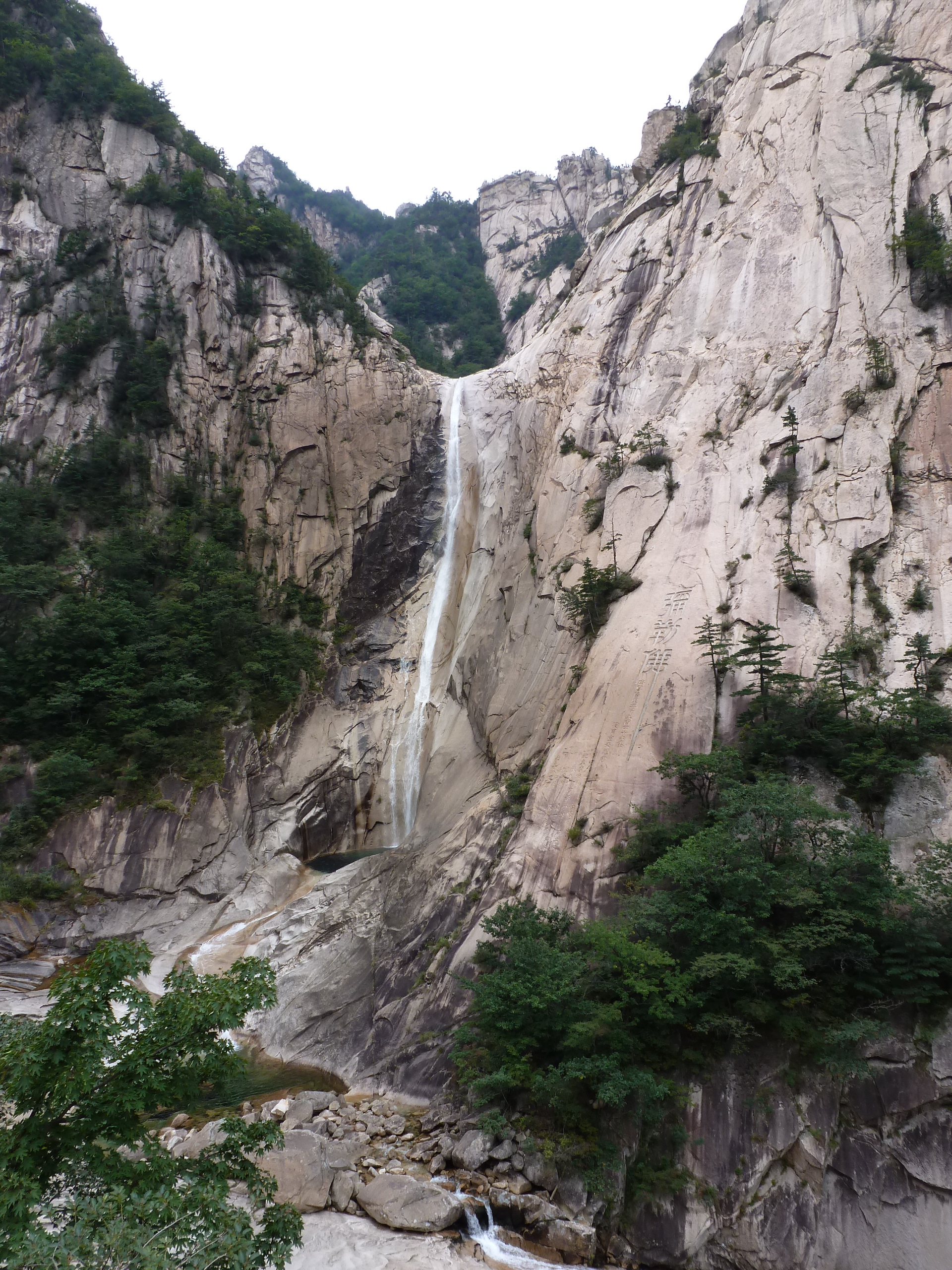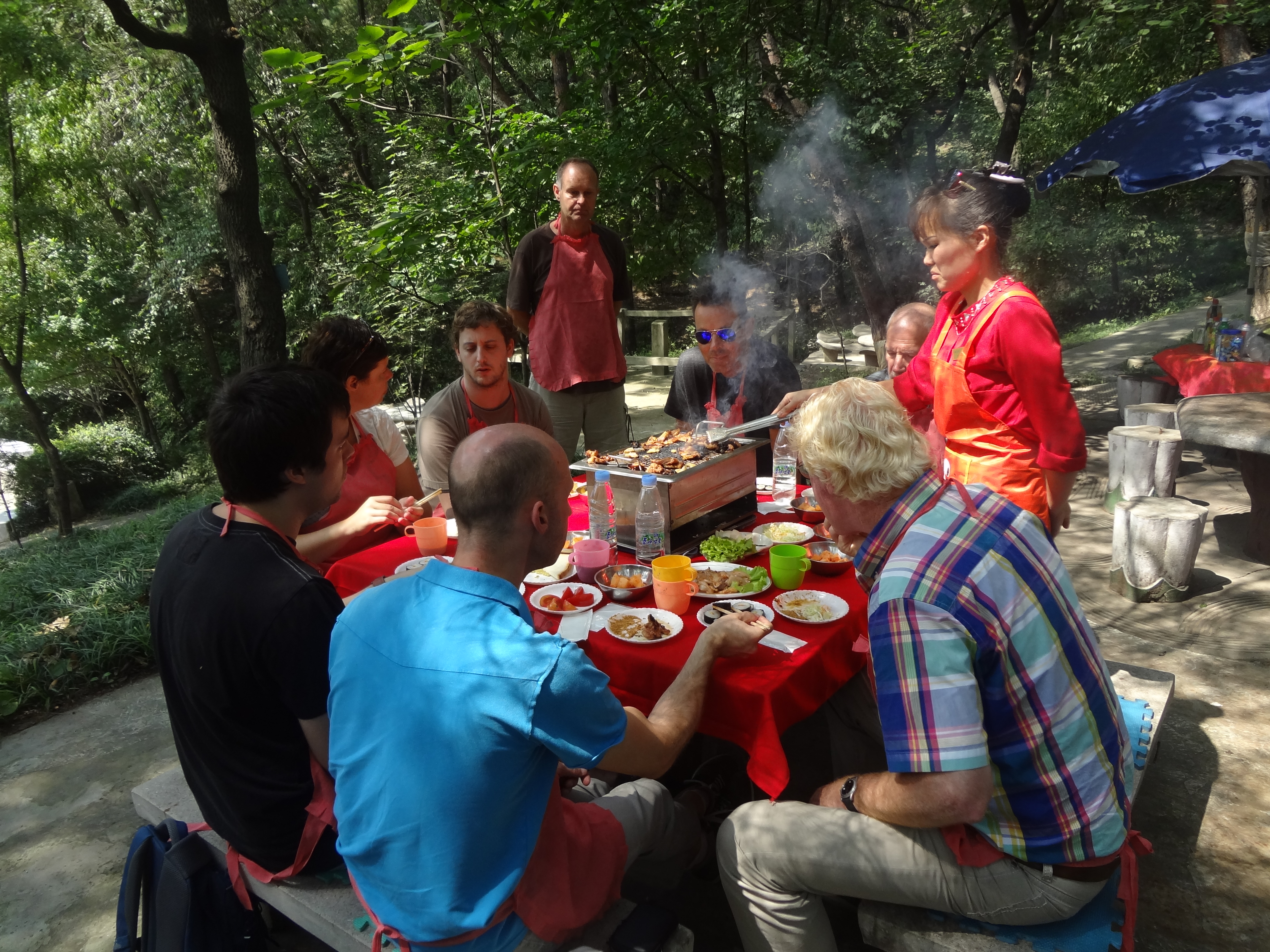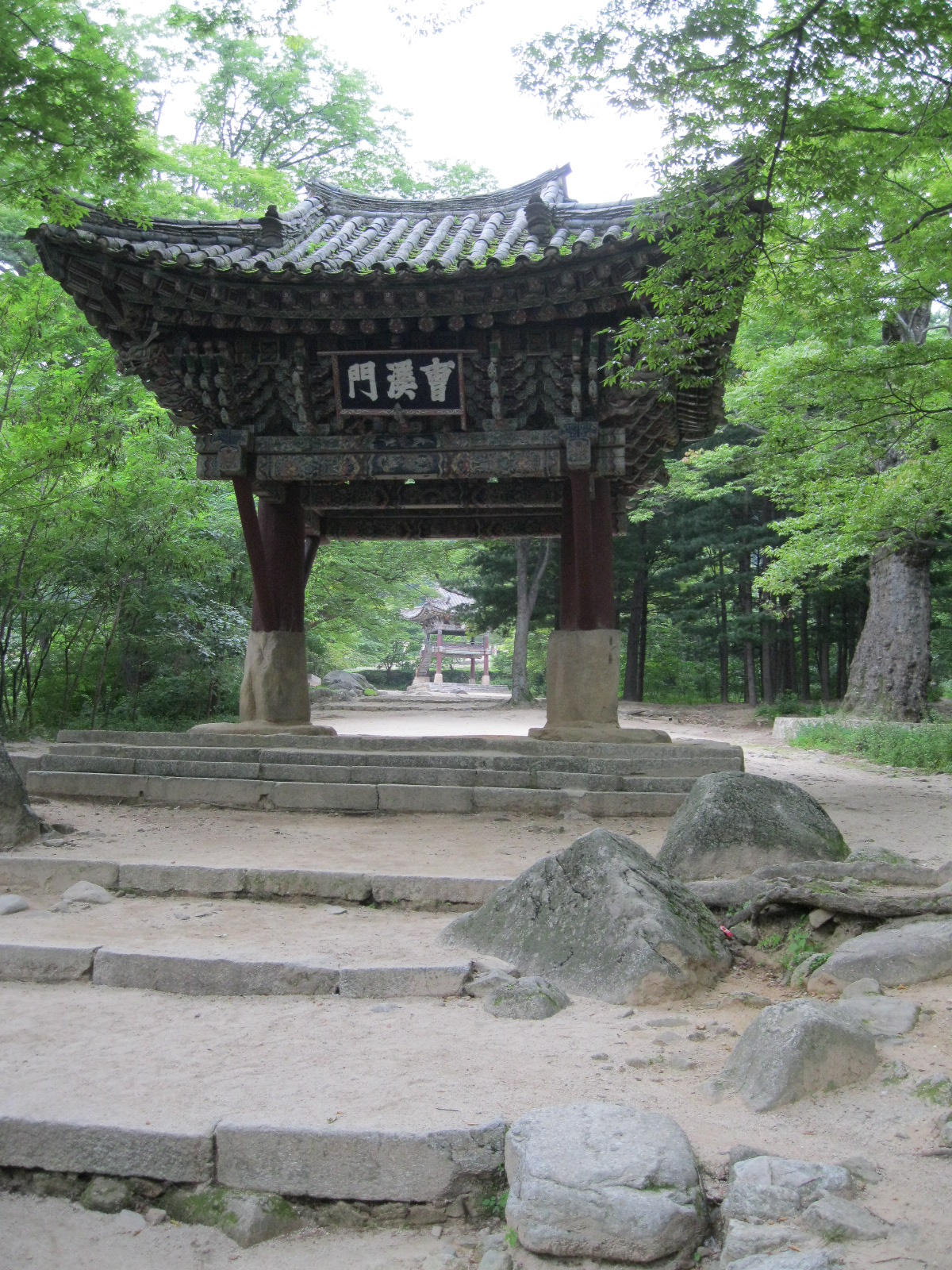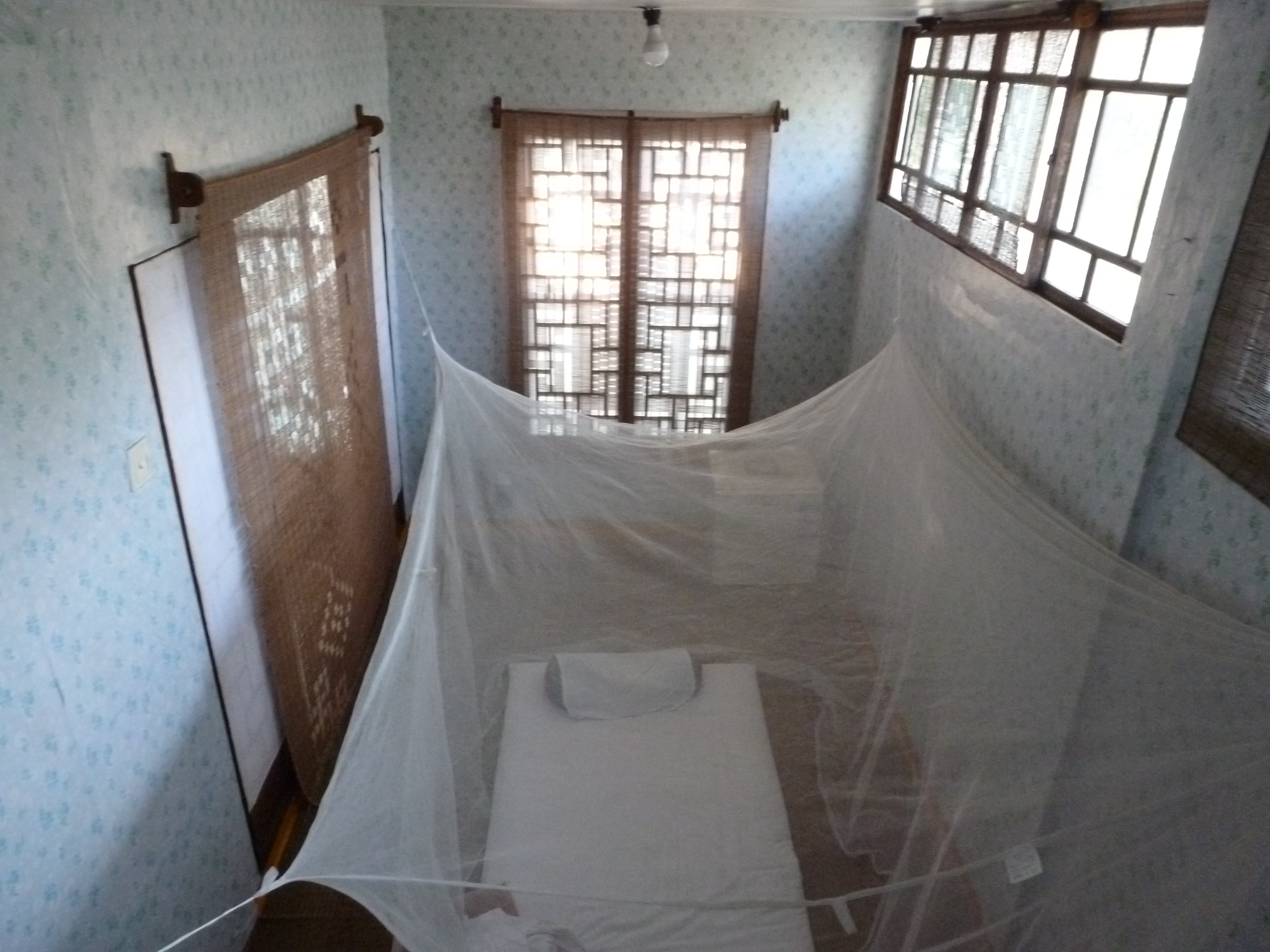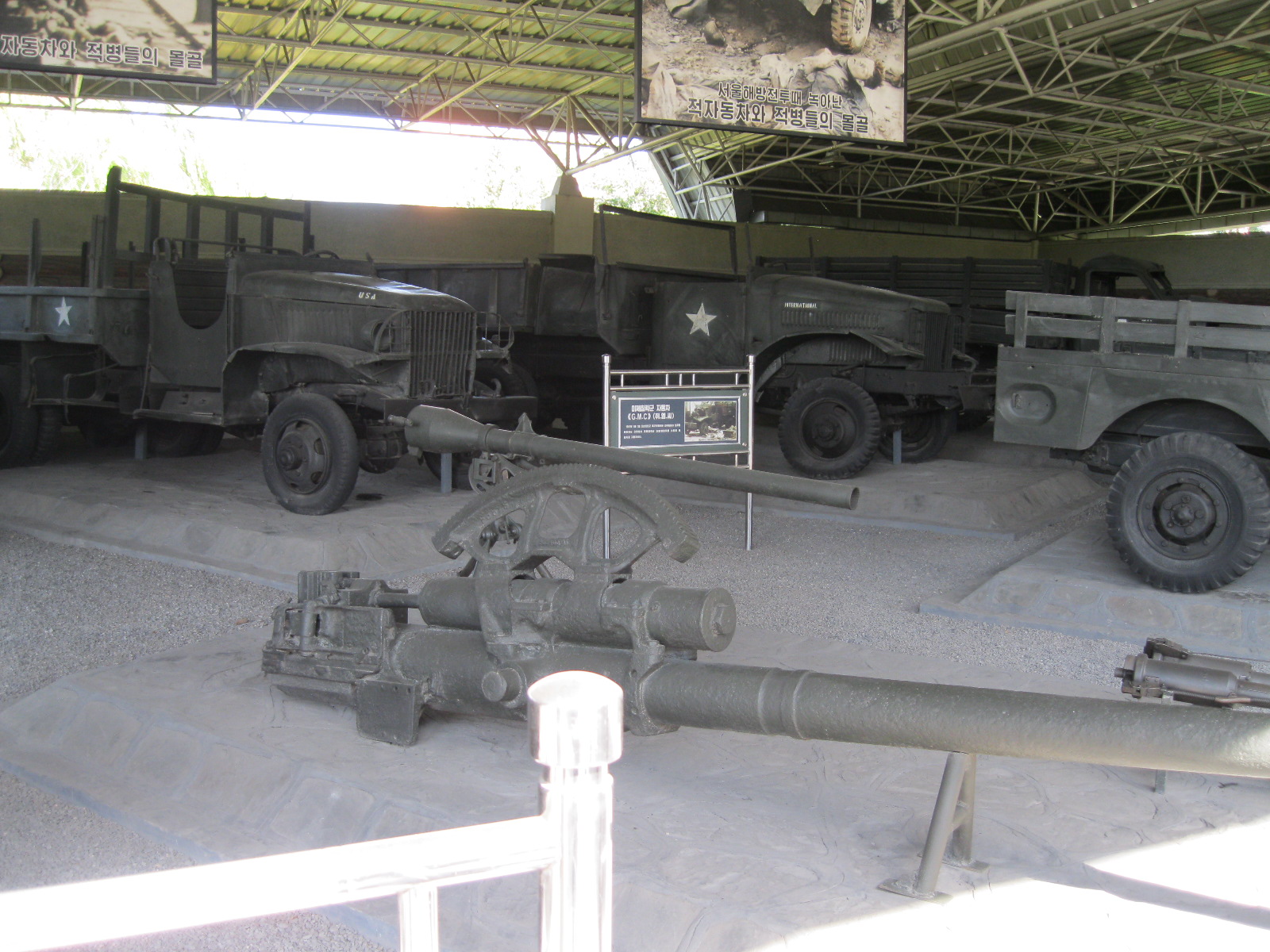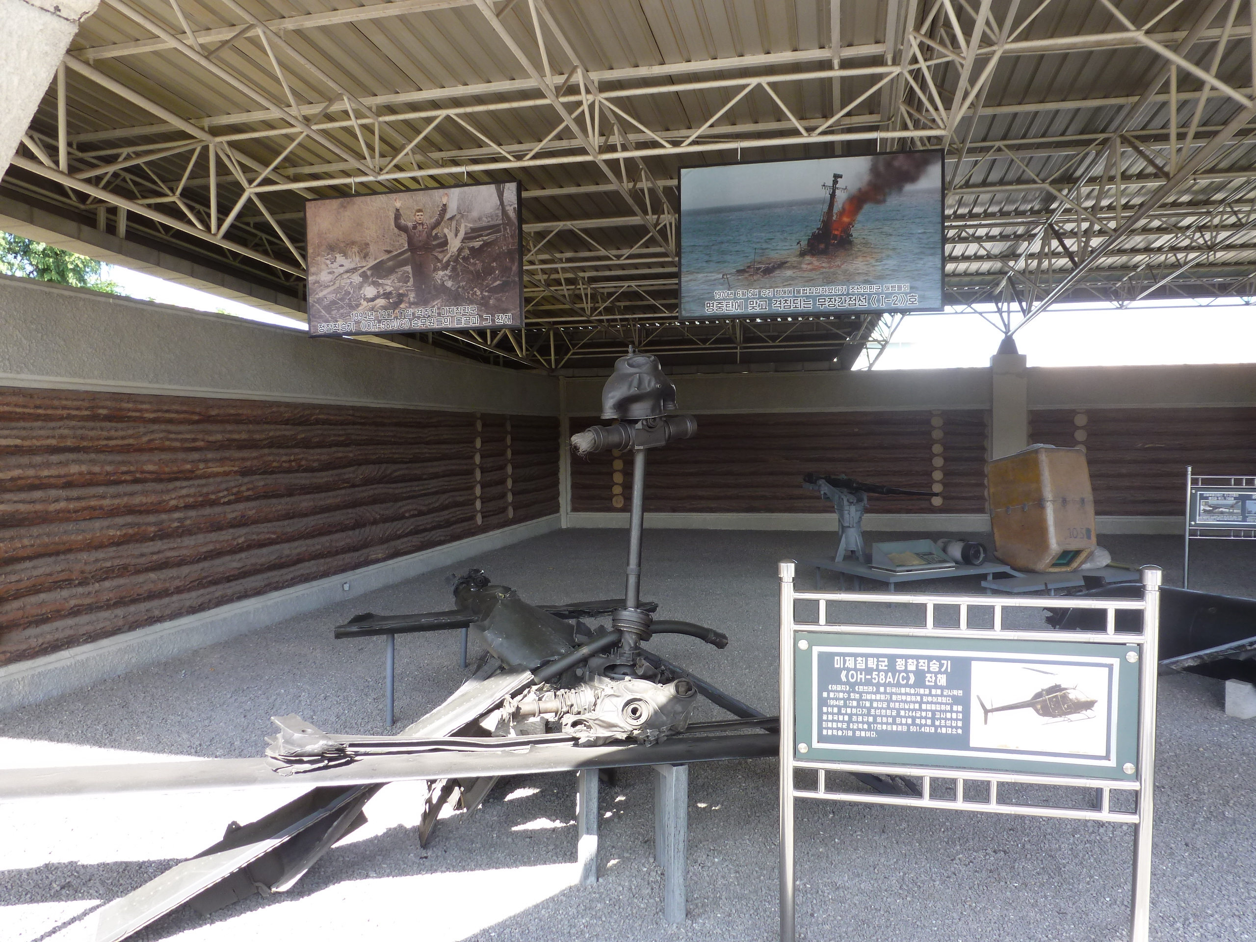 In Peking hebben we enkele uren tijd om ons voor te bereiden op de treinreis richting Noord-Korea. De trein vertrok rond 6u 's avonds. De volgende ochtend komen we aan in Dandong, een Chinese stad die grenst aan Noord-Korea.Het station van PekingDe slaapcabineHet restaurant op de trein. Een deel van het treinpersoneel was er al aan het eten. Ik besloot dan ook maar iets te eten. "Can I have a knife and fork?". "No sowwy". En de chinezen maar lachen.Op dag 3 arriveren we in Dandong, waar we een ontbijt krijgen. De rest van de treinreis wordt verdergezet op een andere trein richting de Noord-Koreaanse hoofdstad Pyongyang.Aankomst in DandongDandongIn de trein over de China-Noord-Korea Vriendschapsbrug. De Yalu rivier die we oversteken maakt een groot deel uit van de grens tussen China en Noord-Korea.Parallel loopt nog een brug, maar deze werd grotendeels vernield tijdens de Koreaanse oorlog.Links: Noord-Korea Rechts: ChinaAl snel verschijnen de portretten van de (overleden) grote leiders Kim Il Sung (links) en Kim Jong Il (rechts). Die zien we overal in Noord-Korea.Langs het platteland zien we vooral rijstvelden.Openbare werkenOnze Nederlandse reisbegeleider Jan is zeer fier op zijn Noord-Koreaanse badge. Deze badges worden door bijna alle Noord-Koreanen gedragen. Als buitenlander kan je deze badge enkel uitgereikt krijgen als je je loyaliteit bewezen hebt.In onze wagon zitten ook enkele Chinese toeristen. De meeste toeristen in Noord-Korea zijn Chinezen.Bij een tussenstop worden we gecontroleerd door Noord-Koreaanse militairen. Alle fototoestellen en telefoons worden geregistreerd, boeken en magazines worden nagekeken. Bagages worden slechts steekproefsgewijs doorgelicht. Onze paspoorten worden ook in beslag genomen. Die krijgen we pas terug op het einde van de reis.De rijstvelden zijn meestal in rechthoekige stukken ingedeeld, met bonenplanten om ze te scheiden.Tegen de avond rijden we Pyongyang binnen. Het volledige treintraject van Peking tot Pyongyang is 1371km lang en deden we ongeveer 24u over.Op dag 4 rijden we met de bus naar de industriestad Hamhung (함흥시). Hier bezoeken we oa. een fabriek van kunstmeststof.Het Yanggakdo International Hotel in Pyongyang waar we deze eerste nacht verbleven. Later keren we hier nog terug.Een tussenstop aan een meer langs het bergachtige landschap.Simon en ikDe bus waar we heel de reis mee rondtrokkenEen fotostop langs het bergachtige landschapDe gidsen vermelden dat zowat driekwart van het land bergen zijn. Omdat de Noord-Koreanen er naar streven om volledig zelfvoorzienend te zijn, wordt bijna alle vlakke grond gebruikt voor landbouw.Aan de linkerkant zie je onze Koreaanse gidsen. Meestal spreken Koreanen elkaar aan met hun volledige naam, maar gemakkelijkheidshalve mochten wij ze aanspreken als miss Kim (links) en miss Ha (rechts).Even dalen we af om een waterval te bezoeken. We picknicken hier in de buurt.De waterval zou in 2001 ontdekt zijn door Kim Jong Il, dankzij zijn fantastisch gehoor.BronwaterDit was een van de weinige maaltijden die ik volledig op kreeg. Op de bus krijgen we dan te horen dat de lunchschotels achtergelaten werden voor kinderen die de overschot zouden eten...De meeste wegen bestaan uit betonplaten.Een propagandabord langs de wegWe komen aan in Hamhung, de tweede grootste stad van Noord-Korea (~ 800.000 inwoners). We rijden hier voorbij een van de talrijke mozaïeken die we te zien zullen krijgen. Links: Kim Il Sung Midden: Kim Jong Il Rechts: Kim Jong Suk (de eerste vrouw van Kim Il Sung)Hamhung is nog maar enkele jaren "open" voor toeristen.Een fabriek van kunstmeststofBij elke bezienswaardigheid krijgen we te horen hoe vaak en wanneer juist de grote leiders die plaats bezocht hebben. Vaak zijn er mozaïeken die hun bezoek afbeelden.Binnen in de fabriekEr zijn maar weinig fabriekswerkers aanwezig, maar ze poseren wel graag voor een foto.'s avonds verblijven we in het Majon Tourist Resort aan de Oost-Koreaanse zee. Hier nemen we een frisse duik in het water.De huisjes waar we verblijven zijn vlak aan het strand.Onze zwembroeken buiten gehangen, maar echt droog werden ze niet door het vochtige klimaat.Het avondmaal. Zoals gewoonlijk werden er nog voortdurend bordjes bij gezet. Als je al vol zit krijg je dan nog een kom rijst en soep.'s middags en 's avonds was er als drank meestal plat water en bier, met de mogelijkheid om "juice" te drinken in plaats van bier. Dat was een soort appel/peren sap (niet op de foto).Onze kamerHier was geen stromend water, en diende het bad als waterreservoir. Wassen moest "op z'n Bangladesh" door een teiltje water over je gieten. In de rode emmer kon water elektrisch verwarmd worden.Op dag 5 bezoeken we nog enkele plaatsen in Hamhung, en vertrekken dan richting Mt. Kumgang. Onderweg bezoeken we oa. nog de kuststad Wonsan.Het huis van de voormalige koning Taejo van Joseon in Hamhung. Hij richtte de Koreaanse Joseondynastie op in 1392, die eindigde in 1897.Een zeer oude boomBuiten het huis stond een groep Koreaanse studenten te wachten.Een aangelegde (niet natuurlijke) heuvel met grote bronzen beelden van de leidersDe lokale gids die ons een woordje uitleg gaf. De plaatselijke gidsen spraken meestal Koreaans, dat dan naar Engels vertaald werd door onze gids miss Kim.Hamhung Grand TheatreWonsanDit verkeersbord leek met de hand geschilderd te zijn.Bezoek aan een de Chonsam coöperatieve boerderijEen persimmon boomOok de grote leiders zijn hier geweest.In het winkeltje van de boerderij kochten we enkele gedroogde persimmons.Naast de boerderij was er een kleuterschool. De kinderen zongen een liedje en wuifden ons dan uit.Iets verderop bezoeken we nog het huis van de boerin die ons begeleidde.Dit huis heeft een soort vloerverwarming die hier vaak toegepast zou worden. Op internet vond ik dit systeem terug als "Ondol".Wat voor een decoder is dat onder de TV? Telenet of Belgacom?Ten slotte bezochten we nog een boeddhistische tempel...Maar bij de tempel zelf mochten we niet komen, omdat er constructi